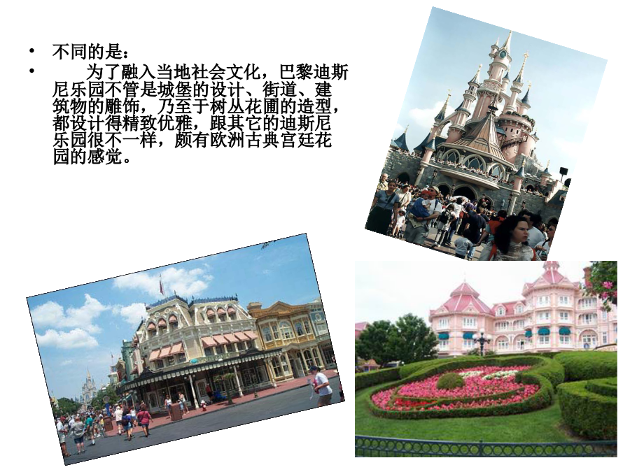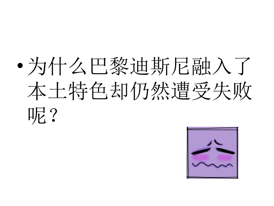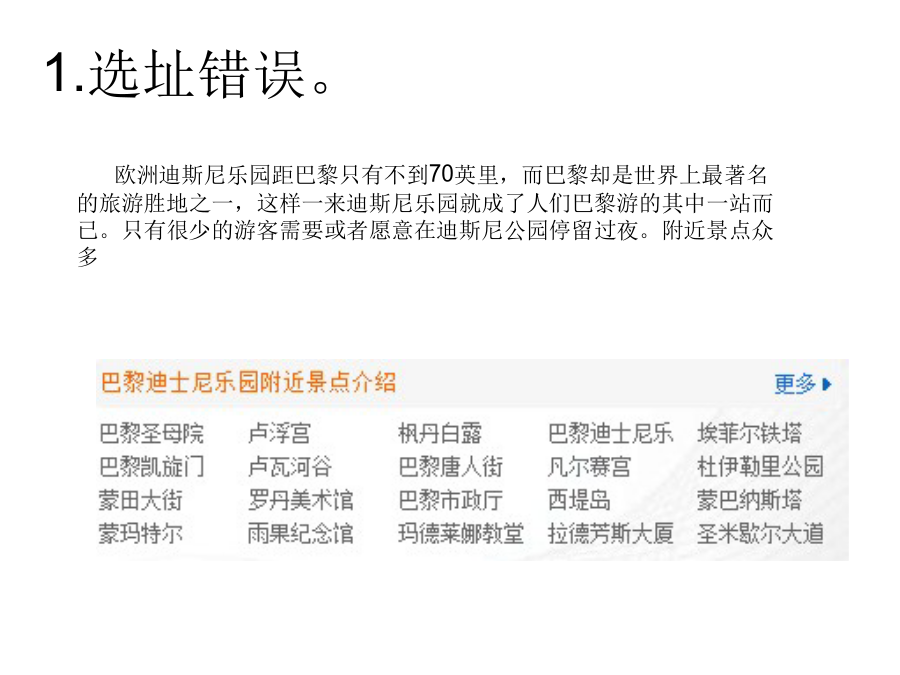 案例分析:巴黎迪斯尼乐园原名欧洲迪斯尼乐园,位于巴黎以东32公里,建于1992年,是美国之外的第二座迪斯尼乐园。和其它迪斯尼乐园一样,巴黎迪斯尼乐园也以西部小镇、大峡谷、海盗船等场景为主;不同的是:为了融入当地社会文化,巴黎迪斯尼乐园不管是城堡的设计、街道、建筑物的雕饰,乃至于树丛花圃的造型,都设计得精致优雅,跟其它的迪斯尼乐园很不一样,颇有欧洲古典宫廷花园的感觉。为什么巴黎迪斯尼融入了本土特色却仍然遭受失败呢?1.选址错误。2.文化差异二、经济方面同行业竞争力对比列表三、法律因素那么巴黎迪士尼应该如何规避风险呢?1、当地政府对此的态度;2、真正了解这个国家的风土人情、兴趣和爱好;3、对该国的经济发展水平要有正确的认识;4、迪土尼公司和当地政府的利益分配;5、进行可行性研究,是否建成后能够取得较大的经济效益营销战略调整为:“迪斯尼回家啦!”走进欧洲人内心深处。欧洲人干嘛,迪斯尼就干嘛。迅速与欧洲人融为一体!“欧洲人周末聚会喝酒看足球,米老鼠也是的哦!”“去巴黎迪斯尼跟米老鼠一家聚会吧!”迪斯尼与足球融合香港迪士尼乐园介绍参考中国风水理念在园区设计上,加入不少中国元素增设香港独有节目。供应亚洲特色美食,出售专有珠宝。员工本地化