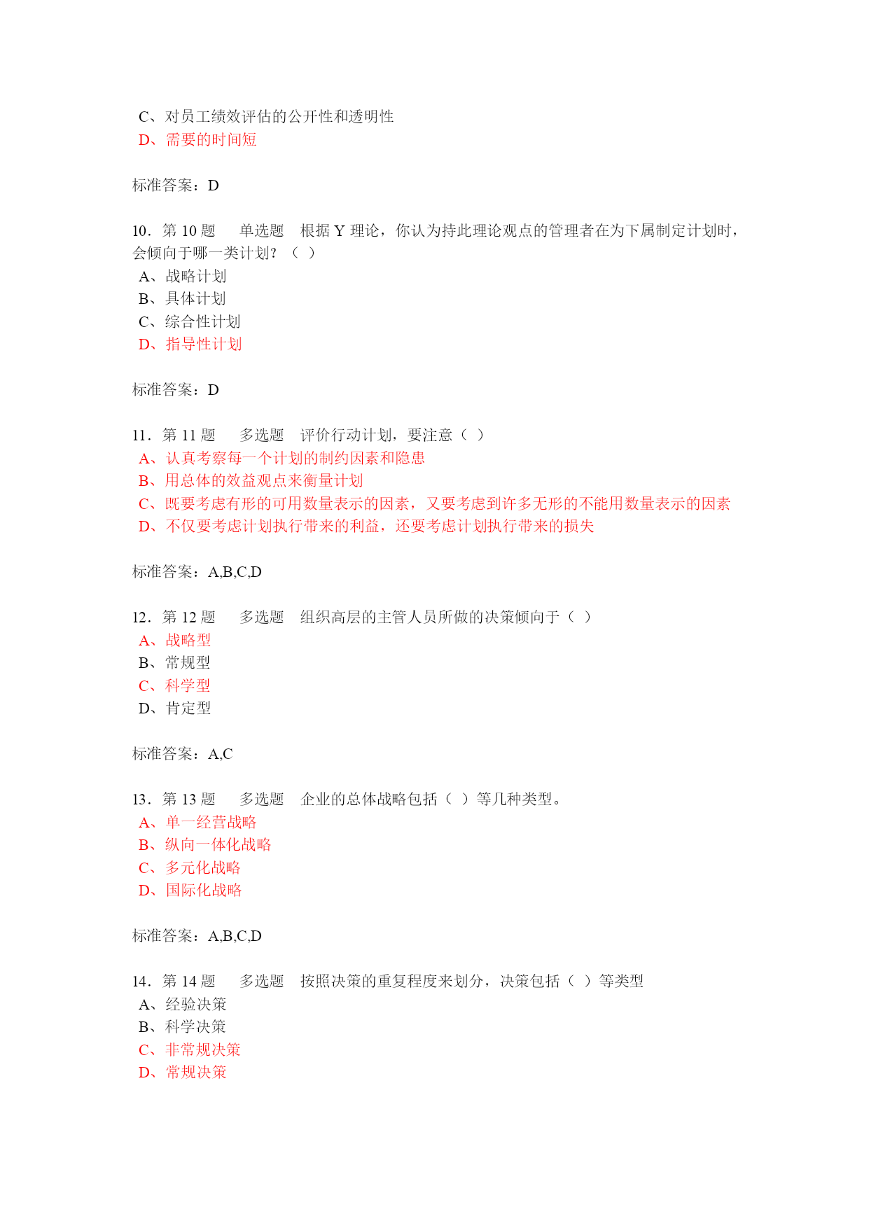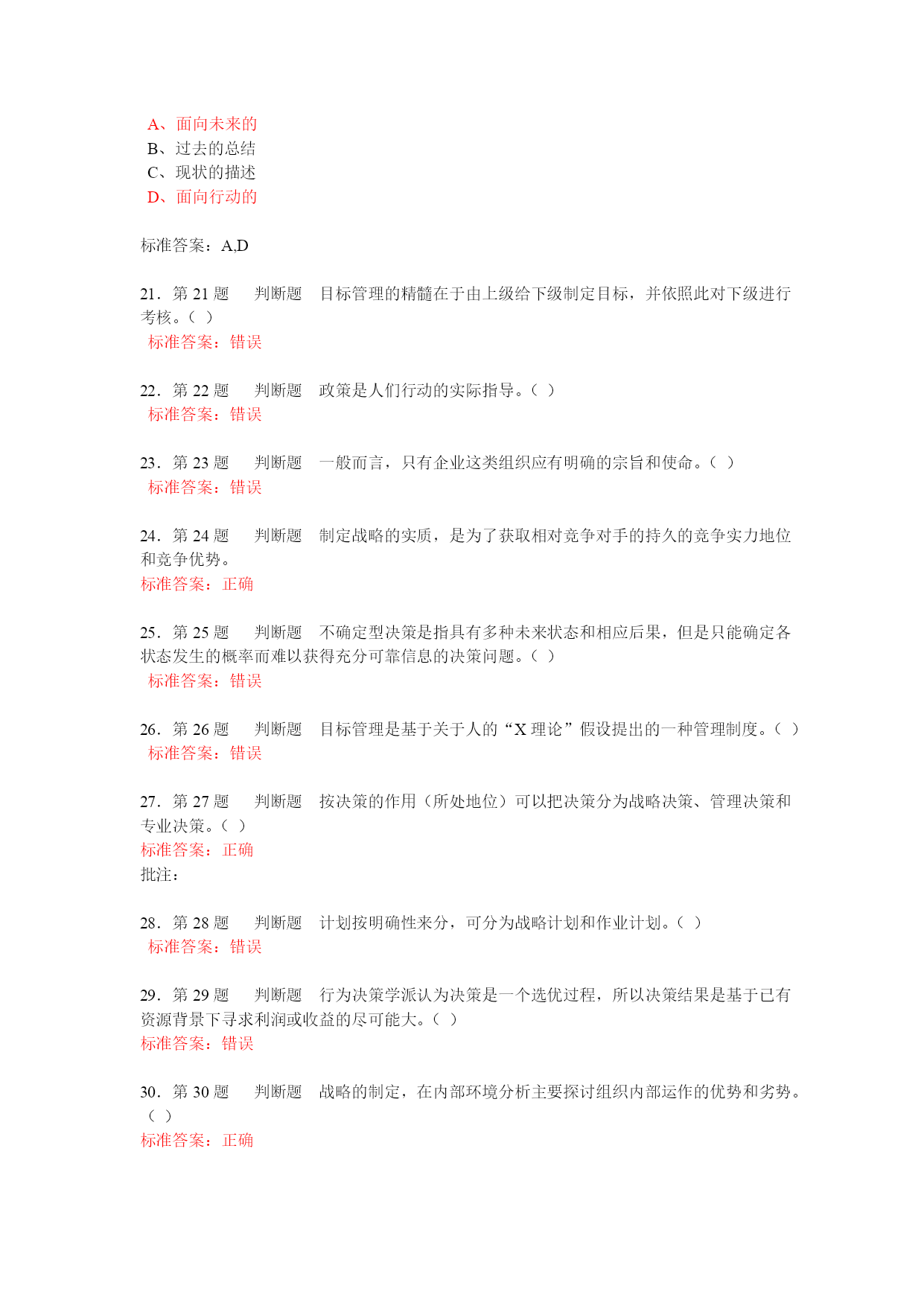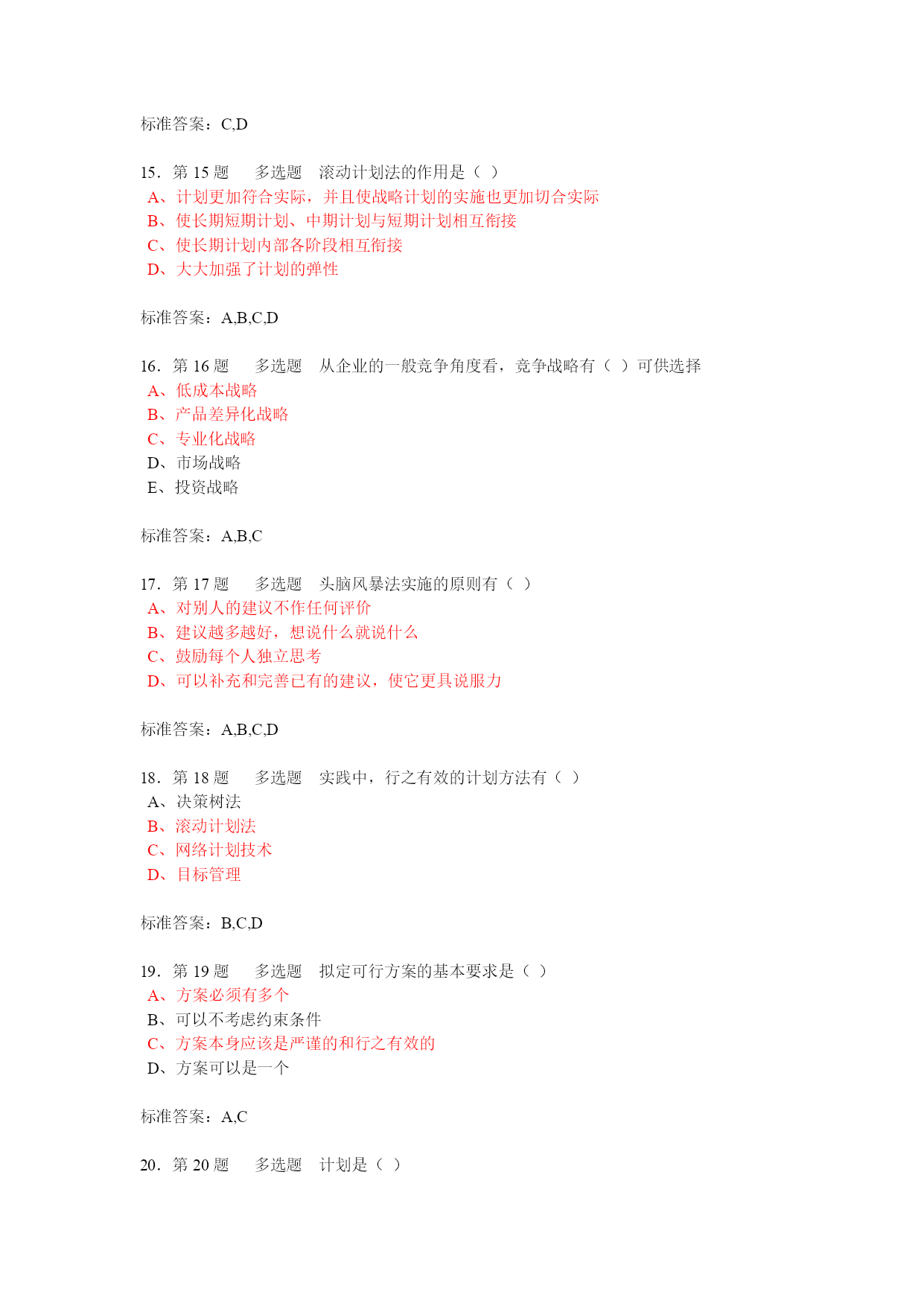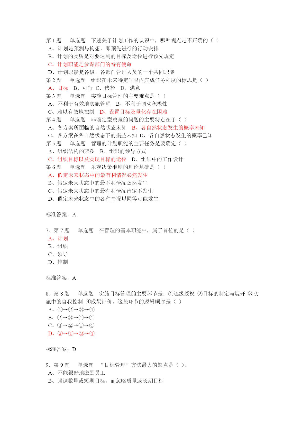 第1题单选题下述关于计划工作的认识中,哪种观点是不正确的()A、计划是预测与构想,即预先进行的行动安排B、计划的实质是对要达到的目标及途径进行预先规定C、计划职能是参谋部门的特有使命D、计划职能是各级、各部门管理人员的一个共同职能第2题单选题组织在未来特定时限内完成任务程度的标志是()A、目标B、可行C、选择D、满意第3题单选题实施目标管理的主要难点是()A、不利于有效地实施管理B、不利于调动积极性C、难以有效地控制D、设置目标及量化存在困难第4题单选题非确定型决策的问题的主要特点在于()A、各方案所面临的自然状态未知B、各自然状态发生的概率未知C、各方案在各自然状态下的损益未知D、各自然状态发生的概率已知第5题单选题管理的计划职能的主要任务是要确定()A、组织结构的蓝图B、组织的领导方式C、组织目标以及实现目标的途径D、组织中的工作设计第6题单选题乐观决策准则的理论基础是()A、假定未来状态中的最有利情况必然发生B、假定未来状态中的最不利情况必然发生C、假定未来状态中的最有利情况肯定不发生D、假定未来状态中的各种情况以同等可能发生标准答案:A7.第7题单选题在管理的基本职能中,属于首位的是()A、计划B、组织C、领导D、控制标准答案:A8.第8题单选题实施目标管理的主要环节是:①逐级授权②目标的制定与展开③实施中的自我控制④成果评价,这些环节的逻辑顺序是()A、①→②→③→④B、②→③→①→④C、③→②→①→④D、②→①→③→④标准答案:D9.第9题单选题“目标管理”方法最大的缺点是()。A、不能很好地激励员工B、强调数量或短期目标,而忽略质量或长期目标C、对员工绩效评估的公开性和透明性D、需要的时间短标准答案:D10.第10题单选题根据Y理论,你认为持此理论观点的管理者在为下属制定计划时,会倾向于哪一类计划?()A、战略计划B、具体计划C、综合性计划D、指导性计划标准答案:D11.第11题多选题评价行动计划,要注意()A、认真考察每一个计划的制约因素和隐患B、用总体的效益观点来衡量计划C、既要考虑有形的可用数量表示的因素,又要考虑到许多无形的不能用数量表示的因素D、不仅要考虑计划执行带来的利益,还要考虑计划执行带来的损失标准答案:A,B,C,D12.第12题多选题组织高层的主管人员所做的决策倾向于()A、战略型B、常规型C、科学型D、肯定型标准答案:A,C13.第13题多选题企业的总体战略包括()等几种类型。A、单一经营战略B、纵向一体化战略C、多元化战略D、国际化战略标准答案:A,B,C,D14.第14题多选题按照决策的重复程度来划分,决策包括()等类型A、经验决策B、科学决策C、非常规决策D、常规决策标准答案:C,D15.第15题多选题滚动计划法的作用是()A、计划更加符合实际,并且使战略计划的实施也更加切合实际B、使长期短期计划、中期计划与短期计划相互衔接C、使长期计划内部各阶段相互衔接D、大大加强了计划的弹性标准答案:A,B,C,D16.第16题多选题从企业的一般竞争角度看,竞争战略有()可供选择A、低成本战略B、产品差异化战略C、专业化战略D、市场战略E、投资战略标准答案:A,B,C17.第17题多选题头脑风暴法实施的原则有()A、对别人的建议不作任何评价B、建议越多越好,想说什么就说什么C、鼓励每个人独立思考D、可以补充和完善已有的建议,使它更具说服力标准答案:A,B,C,D18.第18题多选题实践中,行之有效的计划方法有()A、决策树法B、滚动计划法C、网络计划技术D、目标管理标准答案:B,C,D19.第19题多选题拟定可行方案的基本要求是()A、方案必须有多个B、可以不考虑约束条件C、方案本身应该是严谨的和行之有效的D、方案可以是一个标准答案:A,C20.第20题多选题计划是()A、面向未来的B、过去的总结C、现状的描述D、面向行动的标准答案:A,D21.第21题判断题目标管理的精髓在于由上级给下级制定目标,并依照此对下级进行考核。()标准答案:错误22.第22题判断题政策是人们行动的实际指导。()标准答案:错误23.第23题判断题一般而言,只有企业这类组织应有明确的宗旨和使命。()标准答案:错误24.第24题判断题制定战略的实质,是为了获取相对竞争对手的持久的竞争实力地位和竞争优势。标准答案:正确25.第25题判断题不确定型决策是指具有多种未来状态和相应后果,但是只能确定各状态发生的概率而难以获得充分可靠信息的决策问题。()标准答案:错误26.第26题判断题目标管理是基于关于人的“X理论”假设提出的一种管理制度。()标准答案:错误27.第27题判断题按决策的作用(所处地位)可以把决策分为战略决策、管理决策和专业决策。()标准答案:正确批注:28.第28题判断题计划按明确性来分,可分为战略计划和作业计划。(