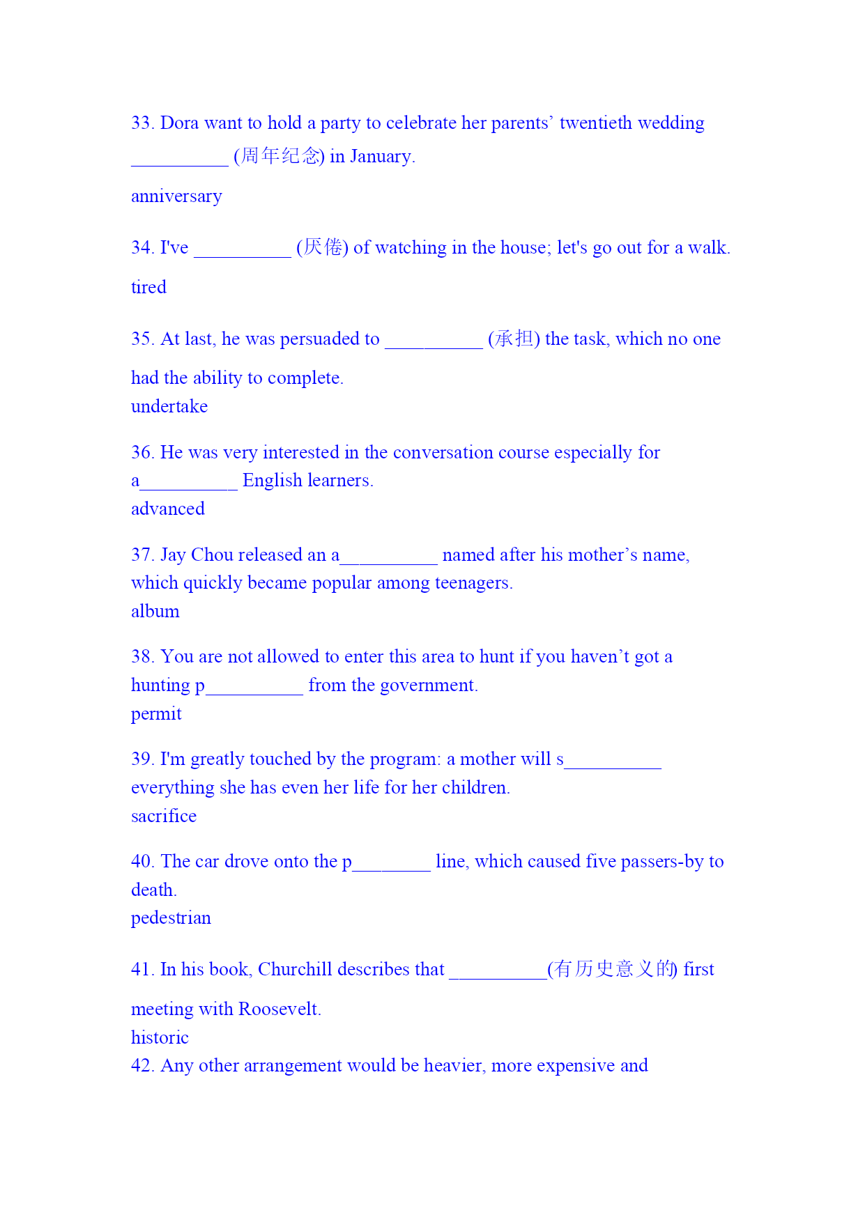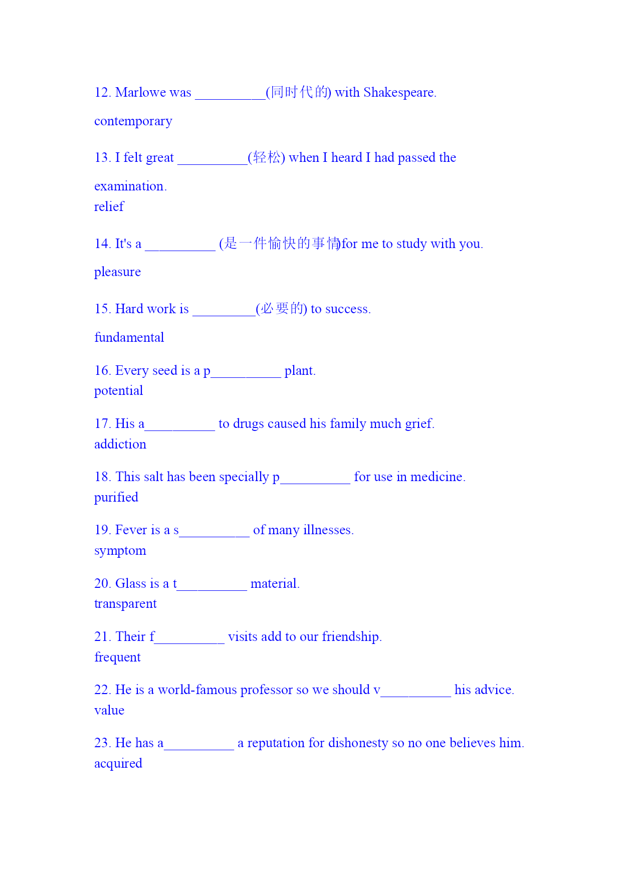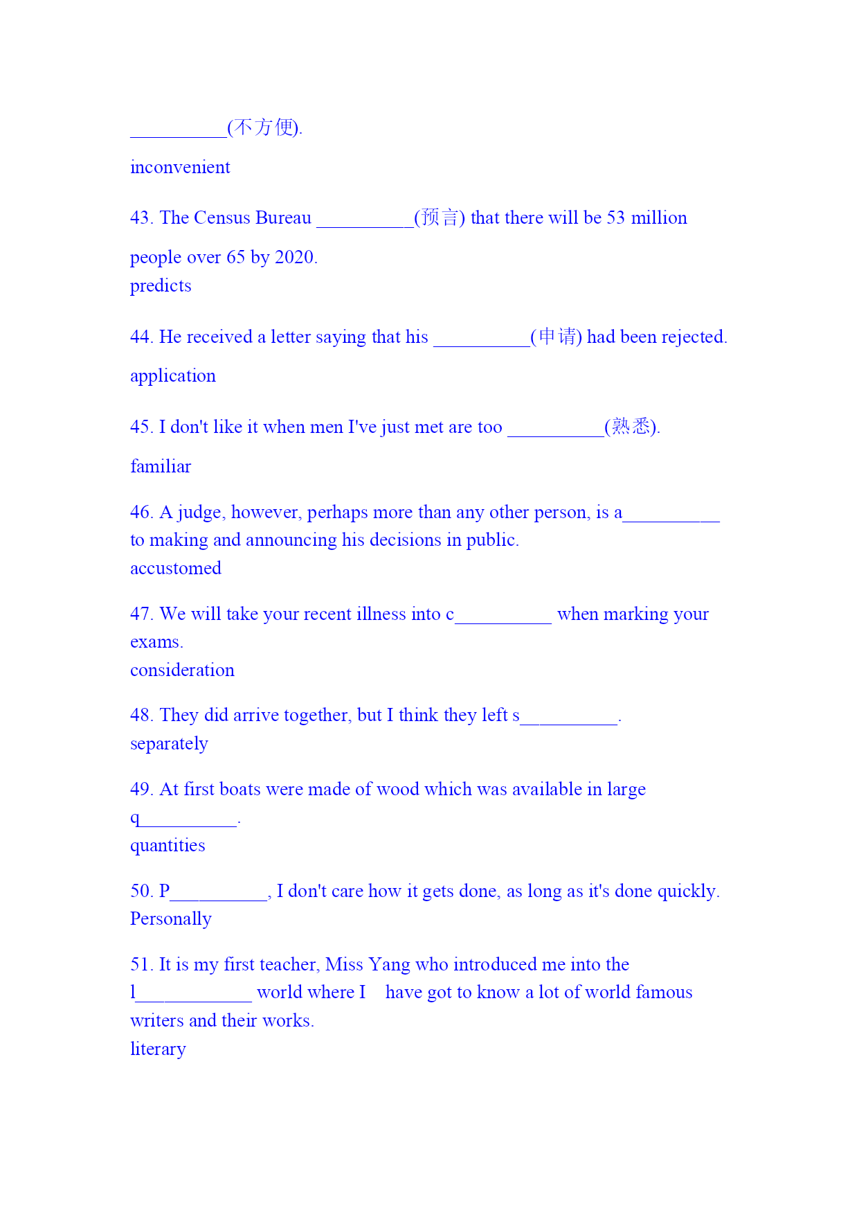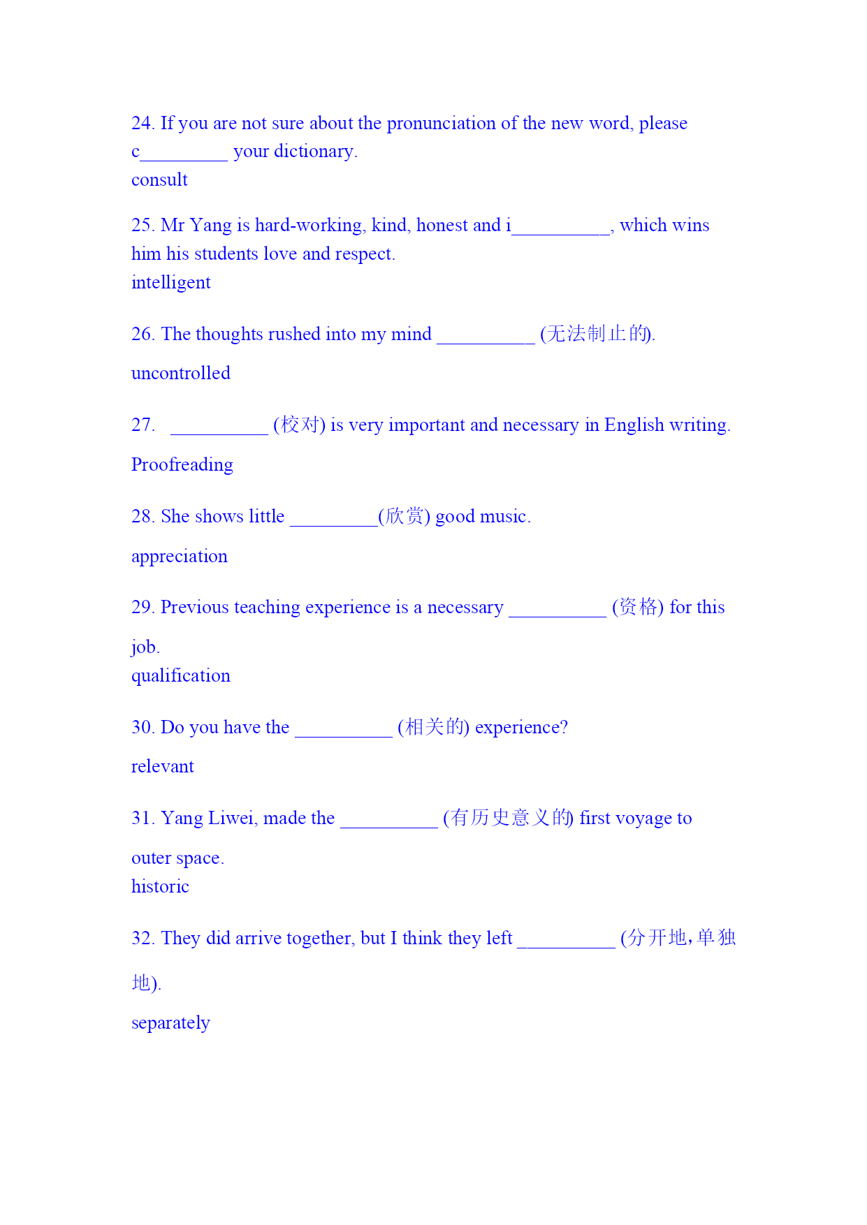 1.Hescannedtheaudience,searchingfora__________(熟悉的)face.familiar2.Thesemealscanbepreparedinadvance,andservedatyour__________(方便).convenience3.Themanagingdirectorwrote__________(亲自地)tothankme.personally4.There'sanoldfashioned__________(便携的)CDplayerinthekitchen.portable5.Heappliedfora__________(专利)foranewmethodofremovingpaint.patent6.InChinanowadays,millionsofpeopleinruralareasaremovingfromthecountrysidetobigcitiesinsearchofcareera__________.advancement7.Blueskiesarenotalwaysag__________offineweather.guarantee8.It'snotm__________amatterofcost,butwhethershe'soldenoughtogoonholidayalone.merely9.Thehouseisnotreallys__________foralargefamily.suitable10.Forav__________ofreasons,ourteamwillnotbeparticipating.variety11.Ihavehadmyselfcarefullyexaminedby__________(内科医生).physicians12.Marlowewas__________(同时代的)withShakespeare.contemporary13.Ifeltgreat__________(轻松)whenIheardIhadpassedtheexamination.relief14.It'sa__________(是一件愉快的事情)formetostudywithyou.pleasure15.Hardworkis_________(必要的)tosuccess.fundamental16.Everyseedisap__________plant.potential17.Hisa__________todrugscausedhisfamilymuchgrief.addiction18.Thissalthasbeenspeciallyp__________foruseinmedicine.purified19.Feverisas__________ofmanyillnesses.symptom20.Glassisat__________material.transparent21.Theirf__________visitsaddtoourfriendship.frequent22.Heisaworld-famousprofessorsoweshouldv__________hisadvice.value23.Hehasa__________areputationfordishonestysonoonebelieveshim.acquired24.Ifyouarenotsureaboutthepronunciationofthenewword,pleasec_________yourdictionary.consult25.MrYangishard-working,kind,honestandi__________,whichwinshimhisstudentsloveandrespect.intelligent26.Thethoughtsrushedintomymind__________(无法制止的).uncontrolled27.__________(校对)isveryimportantandnecessaryinEnglishwriting.Proofreading28.Sheshowslittle_________(欣赏)goodmusic.appreciation29.Previousteachingexperienceisanecessary__________(资格)forthisjob.qualification30.Doyouhavethe__________(相关的)experience?relevant31.YangLiwei,madethe__________(有历史意义的)firstvoyagetoou
