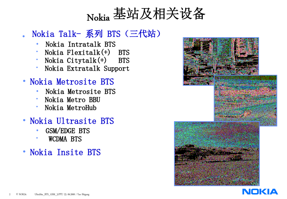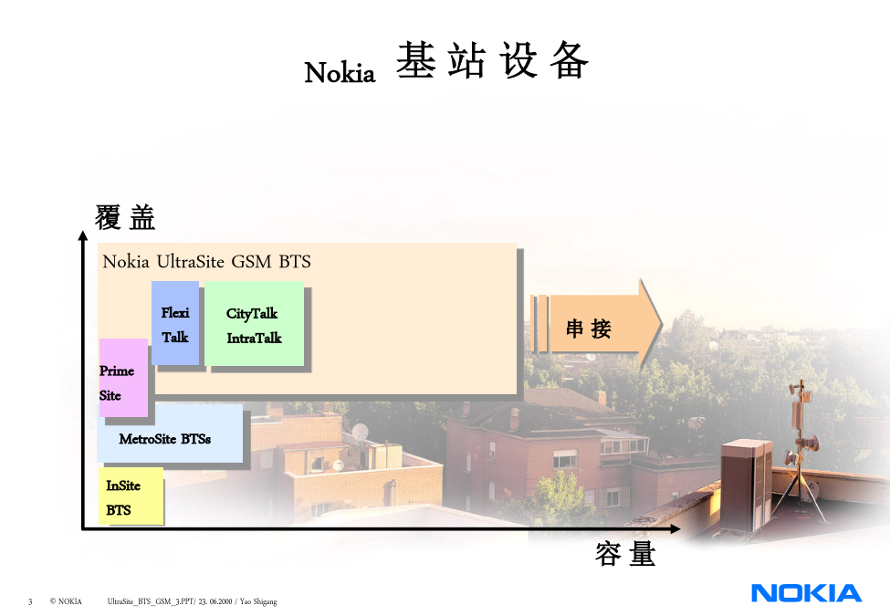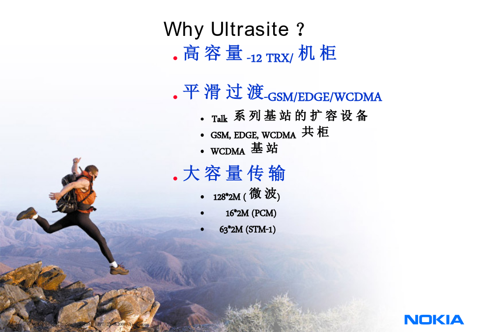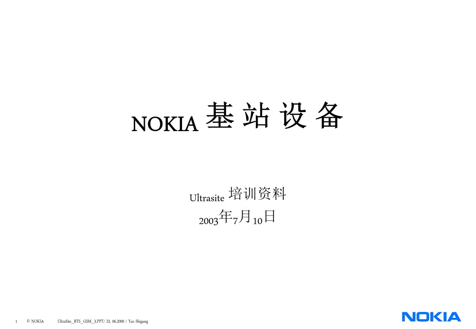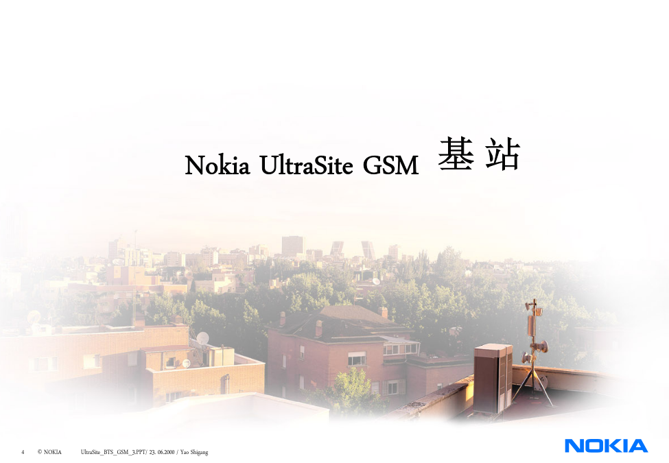 NOKIA基站设备Nokia基站及相关设备Nokia基站设备NokiaUltraSiteGSM基站WhyUltrasite?GSM全频段GSM900GSM1800GSM1900双频共机柜GSM900/GSM1800EDGEEnhancedDataratesforGSMEvolution(BSS10支持)GSM900GSM1800GSM1900WCDMA(2001)UltraSiteGSM基站加入WCDMA载频UltraSiteWCDMA基站UltraSiteGSM基站类型NokiaUltraSiteWCDMA基站类型UltrasiteGSM基站结构基本操作接口单元(BOIx)电源单元(PSWx)-1电源单元(PSWx)-2TRX基带单元(BB2x)TRX射频单元(TSxx)接收分路单元(M2xx和M6xx)宽带合路器(WCxx)远程调谐合路器单元(RTxx)对偶变量增益双工滤波器单元(DVxx)传输单元FXCE1FXCE1DVxx/RTxx电缆安装到RFU背板NokiaUltraSiteGSM室内基站参数NOTE!EDGE的功率小2-3dB.接收分路单元合路旁路单元连线二路宽带合路二路宽带合路单元连线四路宽带合路RTC窄带合路消耗功率:(GSM)传输接口