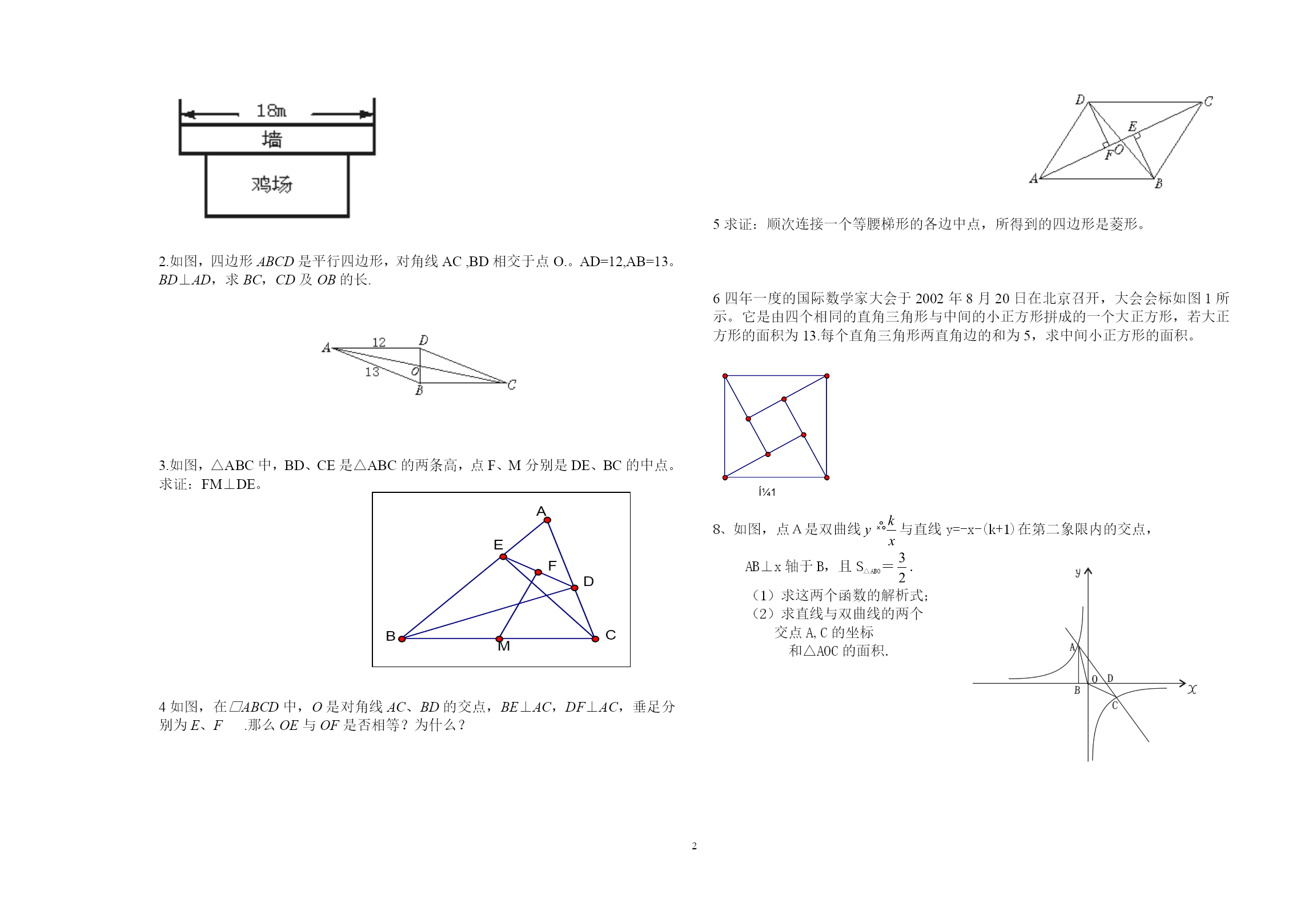 九年级数学试卷4一、选择题1.平行四边形的两条对角线把它分成全等三角形的对数是()A.2B.4C.6D.82.在Rt△ABC中,如左图所示,∠C=90°,∠CAB=60°,AD平分∠CAB,点D到AB的距离DE=3.8cm,则BC等于A.3.8cmB.7.6cmC.11.4cmD.11.2cm3.如右上图,在△ABC中,∠B=∠C=40°D,E是BC上两点,且∠ADE=∠AED=80°,则图中共有等腰三角形()A.6个B.5个C.4个D.3个4、若点A(-1,y1),B(2,y2),C(3,y3)都在反比例函数的图象上,则下列关系式正确的是()A、y1<y2<y3B、y2<y1<y3C、y1<y3<y2D、y3<y2<y15.一项工程,甲队做完需要m天,乙队做完需要n天,若甲乙两队合做,完成这项工程需要天数为()A.m+nB.(m+n)C.D.5、已知反比例函数的图象经过点(1,2),则它的图象也一定经过()A、(-1,-2)B、(-1,2)C、(1,-2)D、(-2,1)6、函数图象y=ax2+(a-3)x+1与x轴只有一个交点则a的值为()A、0,1B、0,9C、1,9D、0,1,97.平行四边形的两邻边分别为3、4,那么其对角线必()A.大于1B.小于7C.大于1且小于7D.小于7或大于18.从菱形的钝角顶点,向对角的两边条垂线,垂足恰好在该边的中点,则菱形的内角中钝角的度数是()A.B.C.D.9.等边三角形的高为2,则它的面积是()A.B.4C.2D.410.如图,正方形ABCD的对角线AC是菱形AEFC的一边,则∠FAB等于()A.135°B.45°C.22.5°D.30°二.填空题1俯视图为圆的几何体有,。(填两种即可)2太阳光线形成的投影是_________,灯光形成的投影是_________.3、如果反比例函数的图象过点(2,-3),那么=.4.如果-3是方程3x2+kx-6=0的一个根,那么k的值为__________,另一个根是。5、若函数是反比例函数,则m的值是.6.如下左图,把两个大小完全相同的矩形拼成“L”型图案,则,(填度数)第6题第7题第8题7如上中图,是由12个边长相等的正三角形镶嵌而成的平面图形。则图中的平行四边形共有个8如上右图,在□ABCD中,BD为对角线,E,F分别是AD,BD的中点。连接EF,若EF=3cm。则CD的长为三、解答题1.如图,有一面积为150m2的长方形鸡场,鸡场的一边靠墙(墙长18m),另三边用竹篱笆围成,如果竹篱笆的长为35m,求鸡场与墙平行的边长为多少米?2.如图,四边形ABCD是平行四边形,对角线AC,BD相交于点O.。AD=12,AB=13。BD⊥AD,求BC,CD及OB的长.3.如图,△ABC中,BD、CE是△ABC的两条高,点F、M分别是DE、BC的中点。求证:FM⊥DE。4如图,在□ABCD中,O是对角线AC、BD的交点,BE⊥AC,DF⊥AC,垂足分别为E、F.那么OE与OF是否相等?为什么?5求证:顺次连接一个等腰梯形的各边中点,所得到的四边形是菱形。6四年一度的国际数学家大会于2002年8月20日在北京召开,大会会标如图1所示。它是由四个相同的直角三角形与中间的小正方形拼成的一个大正方形,若大正方形的面积为13.每个直角三角形两直角边的和为5,求中间小正方形的面积。8、如图,点A是双曲线与直线y=-x-(k+1)在第二象限内的交点,AB⊥x轴于B,且S△ABO=.(1)求这两个函数的解析式;(2)求直线与双曲线的两个交点A,C的坐标和△AOC的面积.