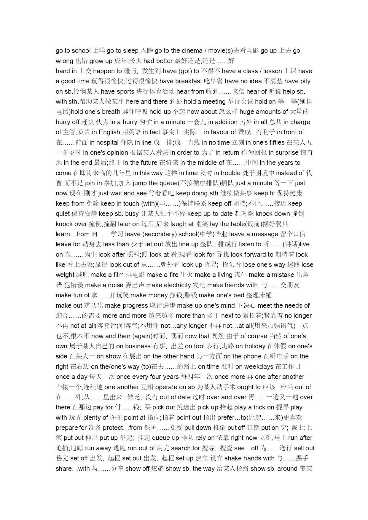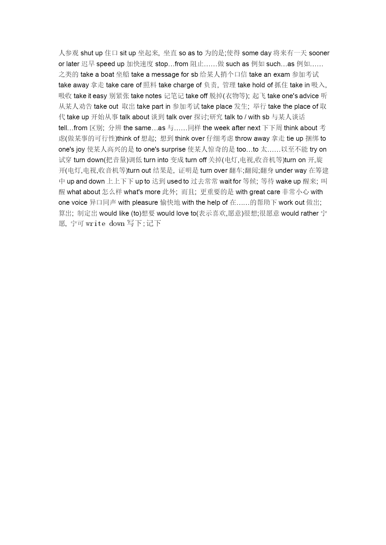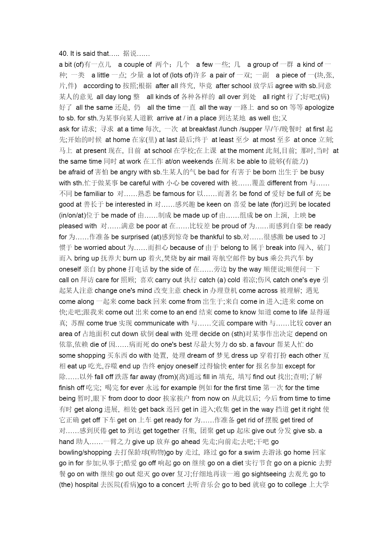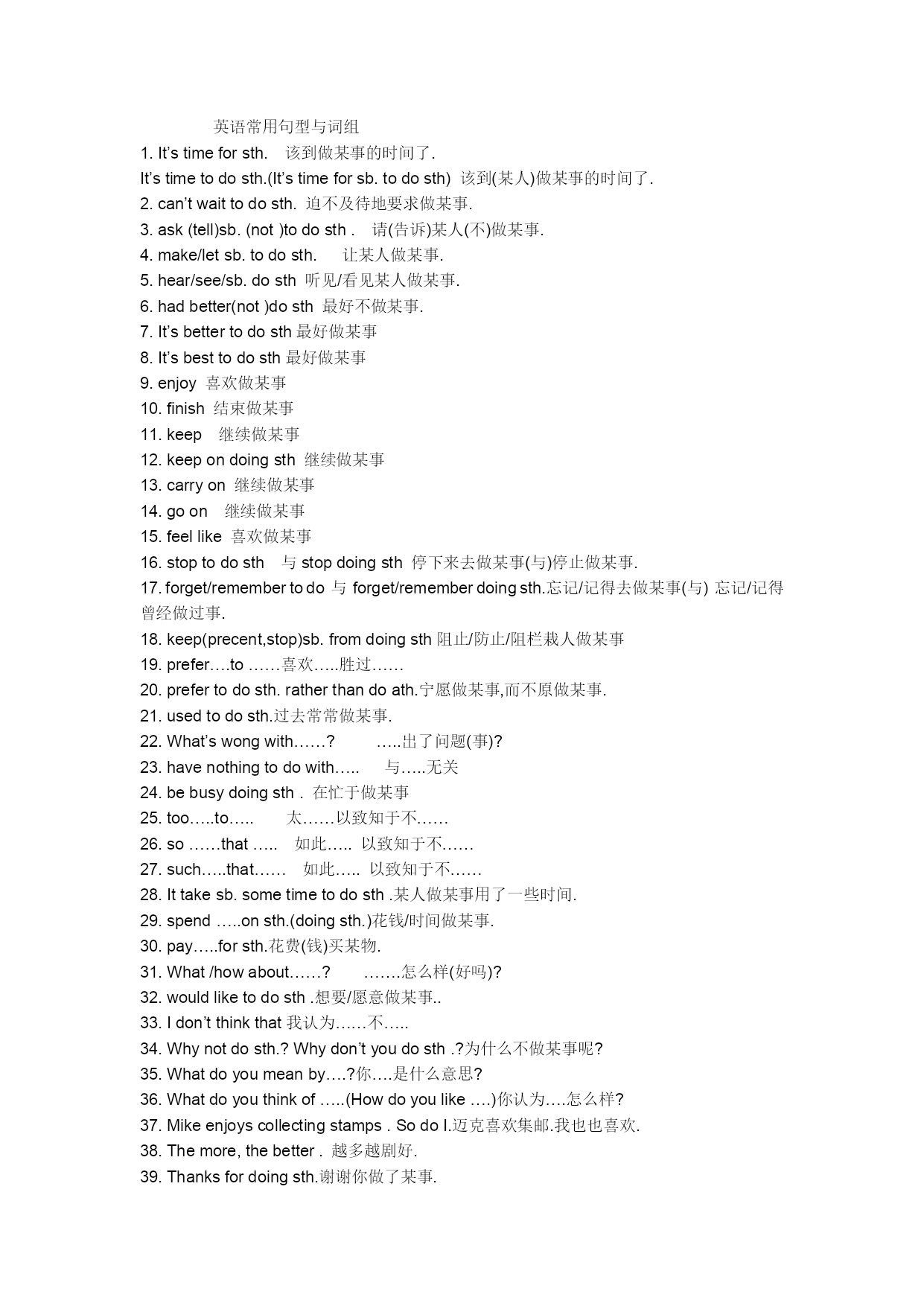 英语常用句型与词组1.It’stimeforsth.该到做某事的时间了.It’stimetodosth.(It’stimeforsb.todosth)该到(某人)做某事的时间了.2.can’twaittodosth.迫不及待地要求做某事.3.ask(tell)sb.(not)todosth.请(告诉)某人(不)做某事.4.make/letsb.todosth.让某人做某事.5.hear/see/sb.dosth听见/看见某人做某事.6.hadbetter(not)dosth最好不做某事.7.It’sbettertodosth最好做某事8.It’sbesttodosth最好做某事9.enjoy喜欢做某事10.finish结束做某事11.keep继续做某事12.keepondoingsth继续做某事13.carryon继续做某事14.goon继续做某事15.feellike喜欢做某事16.stoptodosth与stopdoingsth停下来去做某事(与)停止做某事.17.forget/remembertodo与forget/rememberdoingsth.忘记/记得去做某事(与)忘记/记得曾经做过事.18.keep(precent,stop)sb.fromdoingsth阻止/防止/阻栏栽人做某事19.prefer….to……喜欢…..胜过……20.prefertodosth.ratherthandoath.宁愿做某事,而不原做某事.21.usedtodosth.过去常常做某事.22.What’swongwith……?…..出了问题(事)?23.havenothingtodowith…..与…..无关24.bebusydoingsth.在忙于做某事25.too…..to…..太……以致知于不……26.so……that…..如此…..以致知于不……27.such…..that……如此…..以致知于不……28.Ittakesb.sometimetodosth.某人做某事用了一些时间.29.spend…..onsth.(doingsth.)花钱/时间做某事.30.pay…..forsth.花费(钱)买某物.31.What/howabout……?…….怎么样(好吗)?32.wouldliketodosth.想要/愿意做某事..33.Idon’tthinkthat我认为……不…..34.Whynotdosth.?Whydon’tyoudosth.?为什么不做某事呢?35.Whatdoyoumeanby….?你….是什么意思?36.Whatdoyouthinkof…..(Howdoyoulike….)你认为….怎么样?37.Mikeenjoyscollectingstamps.SodoI.迈克喜欢集邮.我也也喜欢.38.Themore,thebetter.越多越剧好.39.Thanksfordoingsth.谢谢你做了某事.40.Itissaidthat…..据说……abit(of)有一点儿acoupleof两个;几个afew一些;几agroupof一群akindof一种;一类alittle一点;少量alotof(lotsof)许多apairof一双;一副apieceof一(块,张,片,件)accordingto按照;根据afterall终究,毕竟afterschool放学后agreewithsb.同意某人的意见alldaylong整allkindsof各种各样的allover到处allright行了;好吧;(病)好了allthesame还是,仍allthetime一直alltheway一路上andsoon等等apologizetosb.forsth.为某事向某人道歉arriveat/inaplace到达某地aswell也;又askfor请求;寻求atatime每次,一次atbreakfast/lunch/supper早/午/晚餐时atfirst起先;开始的时候athome在家(里)atlast最后;终于atleast至少atmost至多atonce立刻;马上atpresent现在,目前atschool在学校;在上课atthemoment此刻,目前;那时,当时atthesametime同时atwork在工作at/onweekends在周末beableto能够(有能力)beafraidof害怕beangrywithsb.生某人的气bebadfor有害于beborn出生于bebusywithsth.忙于做某事becarefulwith小心becoveredwith被……覆盖differentfrom与……不同befamiliarto对……熟悉befamousfor以……而著名befondof爱好befullof充begoodat善长于bein