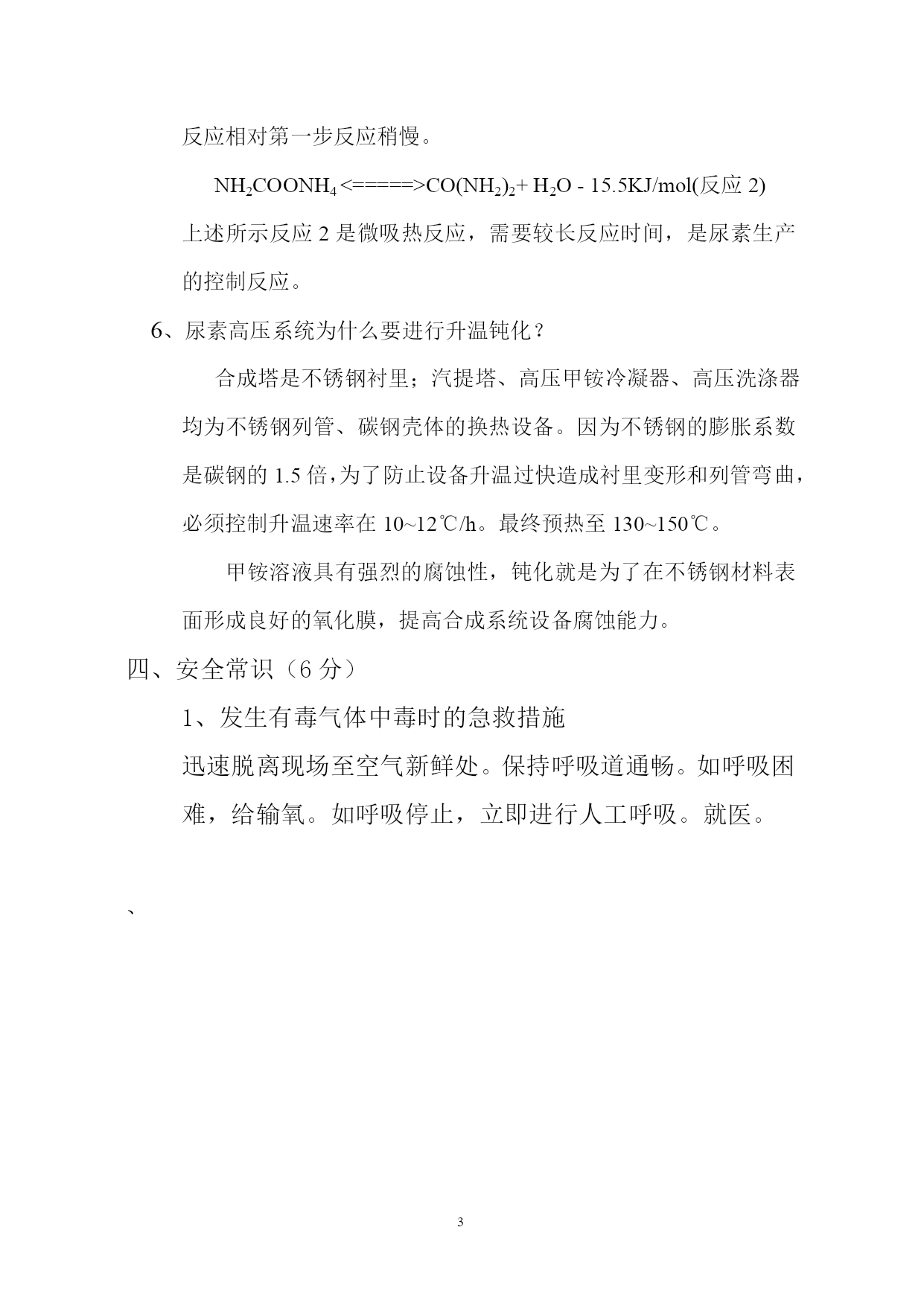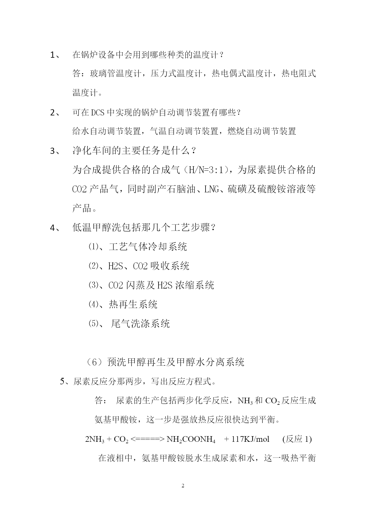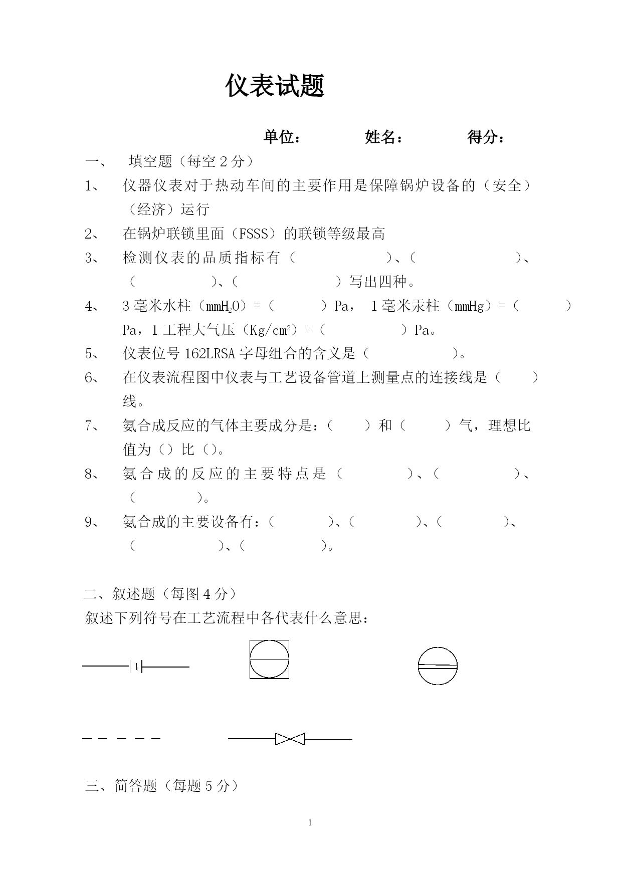 仪表试题单位:姓名:得分:填空题(每空2分)仪器仪表对于热动车间的主要作用是保障锅炉设备的(安全)(经济)运行在锅炉联锁里面(FSSS)的联锁等级最高检测仪表的品质指标有()、()、()、()写出四种。3毫米水柱(mmH2O)=()Pa,1毫米汞柱(mmHg)=()Pa,1工程大气压(Kg/cm2)=()Pa。仪表位号162LRSA字母组合的含义是()。在仪表流程图中仪表与工艺设备管道上测量点的连接线是()线。氨合成反应的气体主要成分是:()和()气,理想比值为()比()。氨合成的反应的主要特点是()、()、()。氨合成的主要设备有:()、()、()、()、()。二、叙述题(每图4分)叙述下列符号在工艺流程中各代表什么意思:三、简答题(每题5分)在锅炉设备中会用到哪些种类的温度计?答:玻璃管温度计,压力式温度计,热电偶式温度计,热电阻式温度计。可在DCS中实现的锅炉自动调节装置有哪些?给水自动调节装置,气温自动调节装置,燃烧自动调节装置净化车间的主要任务是什么?为合成提供合格的合成气(H/N=3:1),为尿素提供合格的CO2产品气,同时副产石脑油、LNG、硫磺及硫酸铵溶液等产品。低温甲醇洗包括那几个工艺步骤?⑴、工艺气体冷却系统⑵、H2S、CO2吸收系统⑶、CO2闪蒸及H2S浓缩系统⑷、热再生系统尾气洗涤系统(6)预洗甲醇再生及甲醇水分离系统5、尿素反应分那两步,写出反应方程式。答:尿素的生产包括两步化学反应,NH3和CO2反应生成氨基甲酸铵,这一步是强放热反应很快达到平衡。2NH3+CO2<=====>NH2COONH4+117KJ/mol(反应1)在液相中,氨基甲酸铵脱水生成尿素和水,这一吸热平衡反应相对第一步反应稍慢。NH2COONH4<=====>CO(NH2)2+H2O-15.5KJ/mol(反应2)上述所示反应2是微吸热反应,需要较长反应时间,是尿素生产的控制反应。6、尿素高压系统为什么要进行升温钝化?合成塔是不锈钢衬里;汽提塔、高压甲铵冷凝器、高压洗涤器均为不锈钢列管、碳钢壳体的换热设备。因为不锈钢的膨胀系数是碳钢的1.5倍,为了防止设备升温过快造成衬里变形和列管弯曲,必须控制升温速率在10~12℃/h。最终预热至130~150℃。甲铵溶液具有强烈的腐蚀性,钝化就是为了在不锈钢材料表面形成良好的氧化膜,提高合成系统设备腐蚀能力。四、安全常识(6分)1、发生有毒气体中毒时的急救措施迅速脱离现场至空气新鲜处。保持呼吸道通畅。如呼吸困难,给输氧。如呼吸停止,立即进行人工呼吸。就医。、