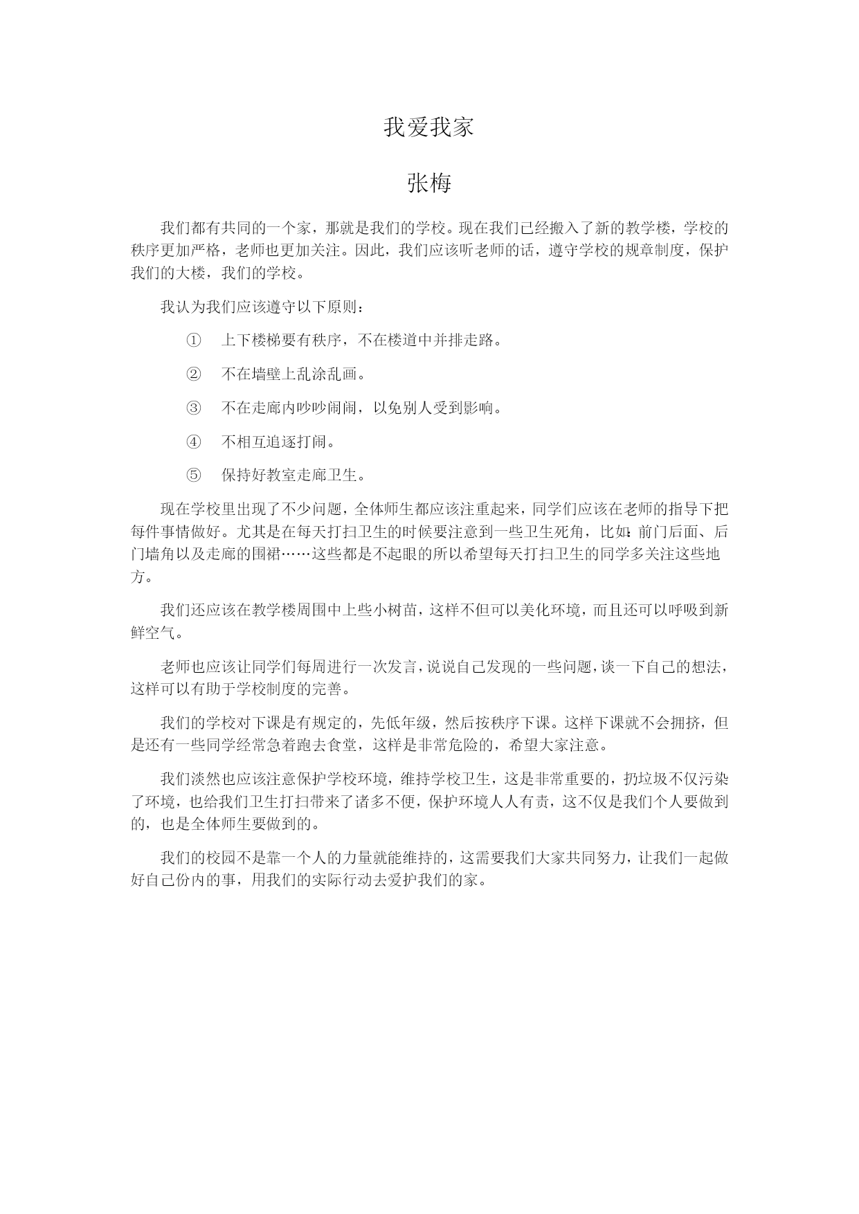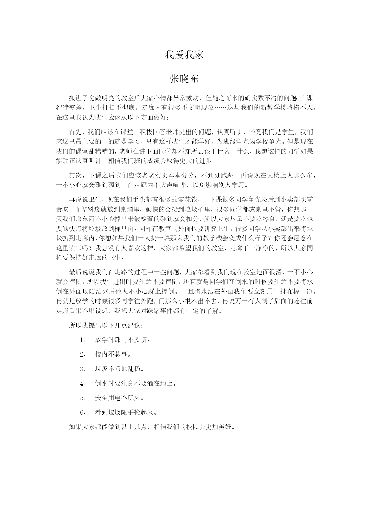 “我爱我家”演讲比赛初一四班比赛选手:张晓东张梅等(附演讲材料)参加人员:初一四班全体同学及班主任主持人:郝金凤比赛过程:主持人发言:尊敬的老师,亲爱的同学们下午好!回想一个月前,我们坐在那简陋的教室中,一切都都是那样的破旧——残缺的窗帘,坑洼的地面,连黑板也是那样的破旧不堪,破旧的让人往往会会忘记时间的流逝,就这样我们在那里度过了3个月的时光。今天,我们坐在崭新的教室——明亮的玻璃,干净的地面……每天我们都感受到大楼的温馨和关怀,这一切是多么的来之不易,然而,最近却发生了很多与新教学楼不相衬的现象:有的同学在楼道内大声喧哗,刚吃完饭的手指在墙上乱摸、甚至自习课的纪律也大不如从前。看到这些我不禁有些担忧,我们正在一点一点地摧残着我们的家。因此我们今天下午举行“我爱我家”的演讲比赛增强大家的爱家意识,下面请参赛选手张晓东发言。选手演讲:(见附件)总结:通过刚才三位选手的发言,我们深刻认识到我爱我家的重要性,在这里我希望大家能做到以下几点:不在教学楼被追逐打闹,吃饭时不挤不枪。上下楼梯靠右走,不在楼梯上做危险动作。参加学校的集会活动时要自觉排好队伍,听从老师指挥。一旦发生拥挤现象不要慌张,统一服从安排。注意保护教室的墙壁,不用手脚去碰墙壁,一旦弄脏要迅速清理。不乱扔垃圾,不随地吐痰。值日生每天彻底清理卫生死角,保护好大楼卫生。只要我们做到以上几点,我们的大楼,我们的学校一定会更加美好,我们的学习也会更上一层楼,谢谢大家!我爱我家张晓东搬进了宽敞明亮的教室后大家心情都异常激动,但随之而来的确实数不清的问题:上课纪律变差,卫生打扫不彻底,走廊内有很多不文明现象……这与我们的新教学楼格格不入。在这里我认为我们应该从以下方面做好:首先,我们应该在课堂上积极回答老师提出的问题,认真听讲,毕竟我们是学生,我们来这里最主要的目的就是学习,只有这样我们才能学好,为班级争光为学校争光。但是现在我们的课堂乱糟糟的,老师在讲下面同学却不知所云该干什么干什么,我想这样的同学如果能改正认真听讲,相信我们班的成绩会取得更大的进步。其次,下课之后我们应该老老实实本本分分,不到处跑跳,再说现在大楼上人那么多,一不小心就会碰到磕到。在走廊内不大声喧哗,以免影响别人学习。再说说卫生,现在我们手头都有很多的零花钱,一下课很多同学争先恐后到小卖部买零食吃,而塑料袋就放到桌洞里,勤快的会扔到垃圾桶里,很多同学都放桌里不管,你想那一天我们那东西不小心掉出来被检查的碰到就会扣分,所以大家尽量不要吃零食,就是要吃也要勤快点将垃圾放到桶里面。同样在教室的外面也要讲究卫生,很多同学从小卖部出来将垃圾扔到走廊内,你想如果我们一人扔一块那么我们的教学楼会变成什么样子?你还会愿意在这里读书吗?我想没有人喜欢这样。大家都希望我们的教室、走廊干干净净的,所以大家同样要保持好走廊的卫生。最后说说我们在走路的过程中一些问题,大家都看到我们现在教室地面很滑,一不小心就会摔倒,所以我们进出时要注意不要摔倒,还有就是同学们在倒水的时候要注意不要将水倒在外面以防结冰后他人不小心踩上摔倒。一旦将水洒在外面我们要立刻用干抹布擦干净,再就是放学的时候很多同学往外跑,门那么小根本出不去,再说万一有人到了后面的还往前走那后果不堪设想,我想大家对踩踏事件都有一定的了解。所以我提出以下几点建议:放学时部门不要挤。校内不惹事。垃圾不随地乱扔。倒水时要注意不要洒在地上。安全用电不玩火。看到垃圾随手捡起来。如果大家都能做到以上几点,相信我们的校园会更加美好。我爱我家张梅我们都有共同的一个家,那就是我们的学校。现在我们已经搬入了新的教学楼,学校的秩序更加严格,老师也更加关注。因此,我们应该听老师的话,遵守学校的规章制度,保护我们的大楼,我们的学校。我认为我们应该遵守以下原则:上下楼梯要有秩序,不在楼道中并排走路。不在墙壁上乱涂乱画。不在走廊内吵吵闹闹,以免别人受到影响。不相互追逐打闹。保持好教室走廊卫生。现在学校里出现了不少问题,全体师生都应该注重起来,同学们应该在老师的指导下把每件事情做好。尤其是在每天打扫卫生的时候要注意到一些卫生死角,比如:前门后面、后门墙角以及走廊的围裙……这些都是不起眼的所以希望每天打扫卫生的同学多关注这些地方。我们还应该在教学楼周围中上些小树苗,这样不但可以美化环境,而且还可以呼吸到新鲜空气。老师也应该让同学们每周进行一次发言,说说自己发现的一些问题,谈一下自己的想法,这样可以有助于学校制度的完善。我们的学校对下课是有规定的,先低年级,然后按秩序下课。这样下课就不会拥挤,但是还有一些同学经常急着跑去食堂,这样是非常危险的,希望大家注意。我们淡然也应该注意保护学校环境,维持学校卫生,这是非常重要的,扔垃圾不仅污染了环境,也给我们卫生打扫带来了诸多不便,保护环境人人有责,这不仅是我们个人要做到的,也是