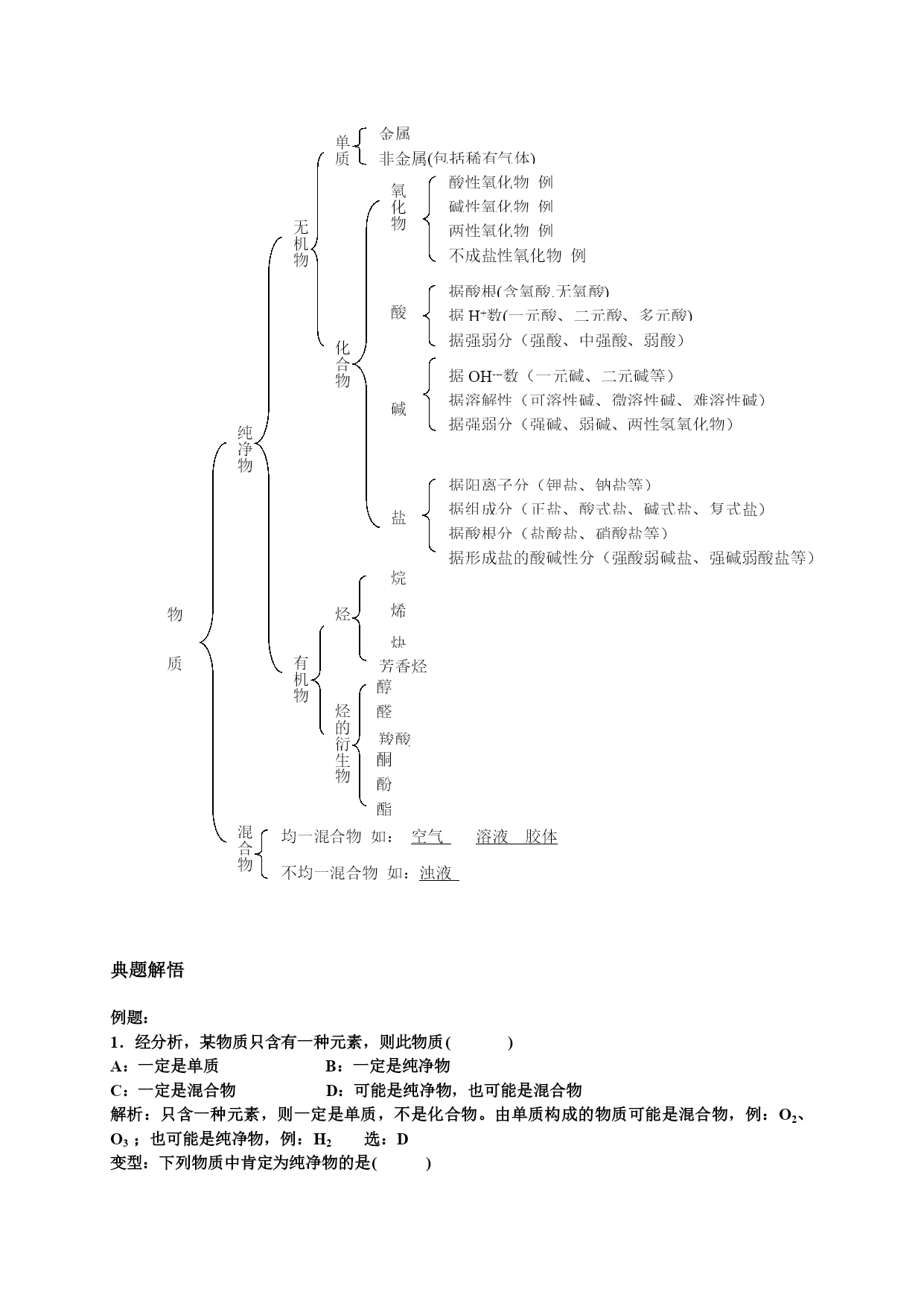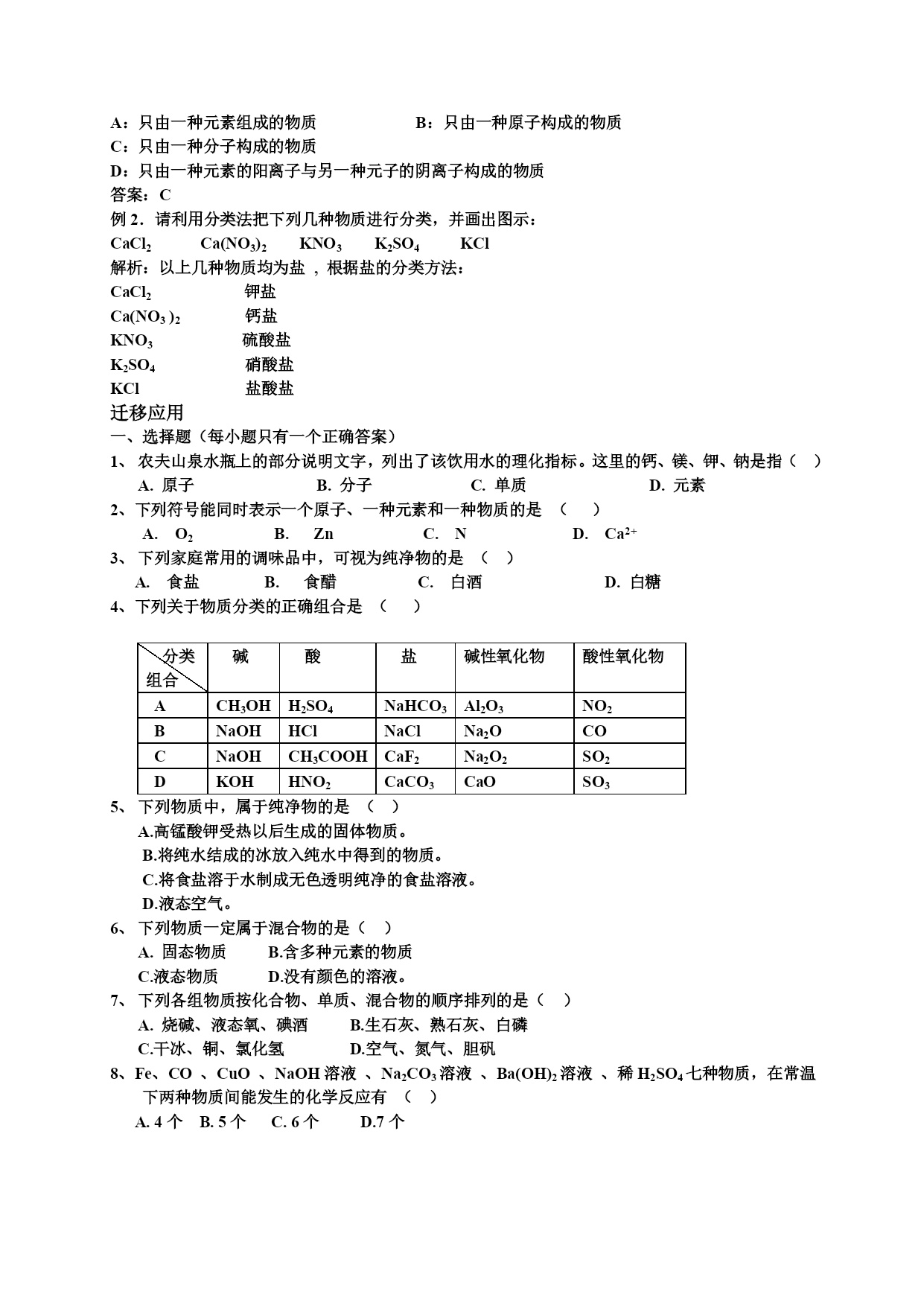 良好的习惯是成功的一多半请同学们认真预习认真书写认真答题第2章元素与物质世界第1节元素与物质的分类学习目标1、了解元素与物质的关系。2、了解物质分类的方法,学会以元素为核心认识物质,能从多角度、依据不同标准对物质分类,体验分类的重要意义。3.学会对单质、氧化物、酸、碱、盐之间关系的探究。问题导学1、元素与物质的关系:是物质的基本组成成分,物质都是由组成的.2、110多种元素为什么组成上千万种不同的物质:①每一种元素都能自身组成物质------,且一些单质又有,例:;②一种元素可以与其它元素组成物质--------;③相同的元素可以组成不同的化合物,例:;④分子组成完全相同的化合物,也可形成不同的物质,例:。3.纯净物与混合物的区别:纯净物混合物组成和结构固定不固定熔沸点一定不定性质保持一种物质的性质保持原有物质的性质4.物质分类的方法:可以根据研究需要从多种角度进行分类:①根据有无固定组成分为;②根据元素组成分为;③根据在水溶液或熔化状态能否导电分为;④根据分散物质颗粒大小,将混合物分为;⑤根据是否含碳元素,将化合物分为;⑥根据化学键类型,将化合物分为;⑦根据在氧化还原反应中的表现,将反应物分为。5.用箭头表示单质、氧化物、酸碱盐之间的相互关系:盐酸性氧化物金属非金属碱性氧化物碱酸6.物质的分类:物质纯净物混合物无机物单质化合物有机物烃烃的衍生物金属非金属(包括稀有气体)均一混合物如:空气溶液胶体不均一混合物如:浊液烷烯炔芳香烃醇醛羧酸酮酚酯酸性氧化物例碱性氧化物例两性氧化物例不成盐性氧化物例据酸根(含氧酸.无氧酸)据H+数(一元酸、二元酸、多元酸)据强弱分(强酸、中强酸、弱酸)据OH---数(一元碱、二元碱等)据溶解性(可溶性碱、微溶性碱、难溶性碱)据强弱分(强碱、弱碱、两性氢氧化物)氧化物酸碱盐据阳离子分(钾盐、钠盐等)据组成分(正盐、酸式盐、碱式盐、复式盐)据酸根分(盐酸盐、硝酸盐等)据形成盐的酸碱性分(强酸弱碱盐、强碱弱酸盐等)典题解悟例题:1.经分析,某物质只含有一种元素,则此物质()A:一定是单质B:一定是纯净物C:一定是混合物D:可能是纯净物,也可能是混合物解析:只含一种元素,则一定是单质,不是化合物。由单质构成的物质可能是混合物,例:O2、O3;也可能是纯净物,例:H2选:D变型:下列物质中肯定为纯净物的是()A:只由一种元素组成的物质B:只由一种原子构成的物质C:只由一种分子构成的物质D:只由一种元素的阳离子与另一种元子的阴离子构成的物质答案:C例2.请利用分类法把下列几种物质进行分类,并画出图示:CaCl2Ca(NO3)2KNO3K2SO4KCl解析:以上几种物质均为盐,根据盐的分类方法:CaCl2钾盐Ca(NO3)2钙盐KNO3硫酸盐K2SO4硝酸盐KCl盐酸盐迁移应用一、选择题(每小题只有一个正确答案)农夫山泉水瓶上的部分说明文字,列出了该饮用水的理化指标。这里的钙、镁、钾、钠是指()A.原子B.分子C.单质D.元素2、下列符号能同时表示一个原子、一种元素和一种物质的是()A.O2B.ZnC.ND.Ca2+下列家庭常用的调味品中,可视为纯净物的是()A.食盐B.食醋C.白酒D.白糖4、下列关于物质分类的正确组合是()分类组合碱酸盐碱性氧化物酸性氧化物ACH3OHH2SO4NaHCO3Al2O3NO2BNaOHHClNaClNa2OCOCNaOHCH3COOHCaF2Na2O2SO2DKOHHNO2CaCO3CaOSO3下列物质中,属于纯净物的是()A.高锰酸钾受热以后生成的固体物质。B.将纯水结成的冰放入纯水中得到的物质。C.将食盐溶于水制成无色透明纯净的食盐溶液。D.液态空气。下列物质一定属于混合物的是()A.固态物质B.含多种元素的物质C.液态物质D.没有颜色的溶液。下列各组物质按化合物、单质、混合物的顺序排列的是()A.烧碱、液态氧、碘酒B.生石灰、熟石灰、白磷C.干冰、铜、氯化氢D.空气、氮气、胆矾8、Fe、CO、CuO、NaOH溶液、Na2CO3溶液、Ba(OH)2溶液、稀H2SO4七种物质,在常温下两种物质间能发生的化学反应有()A.4个B.5个C.6个D.7个