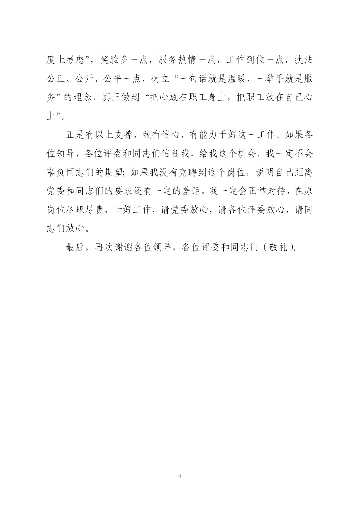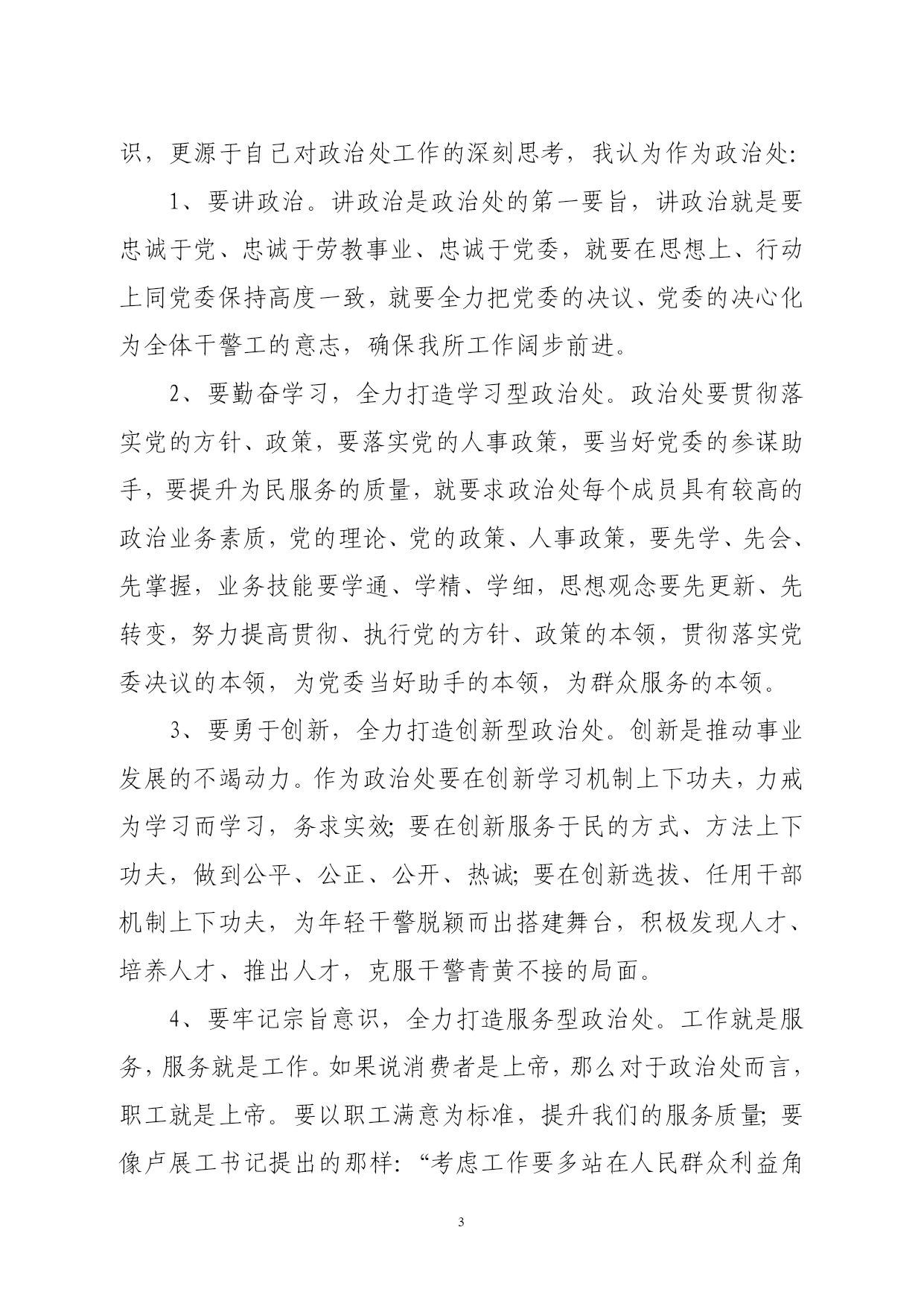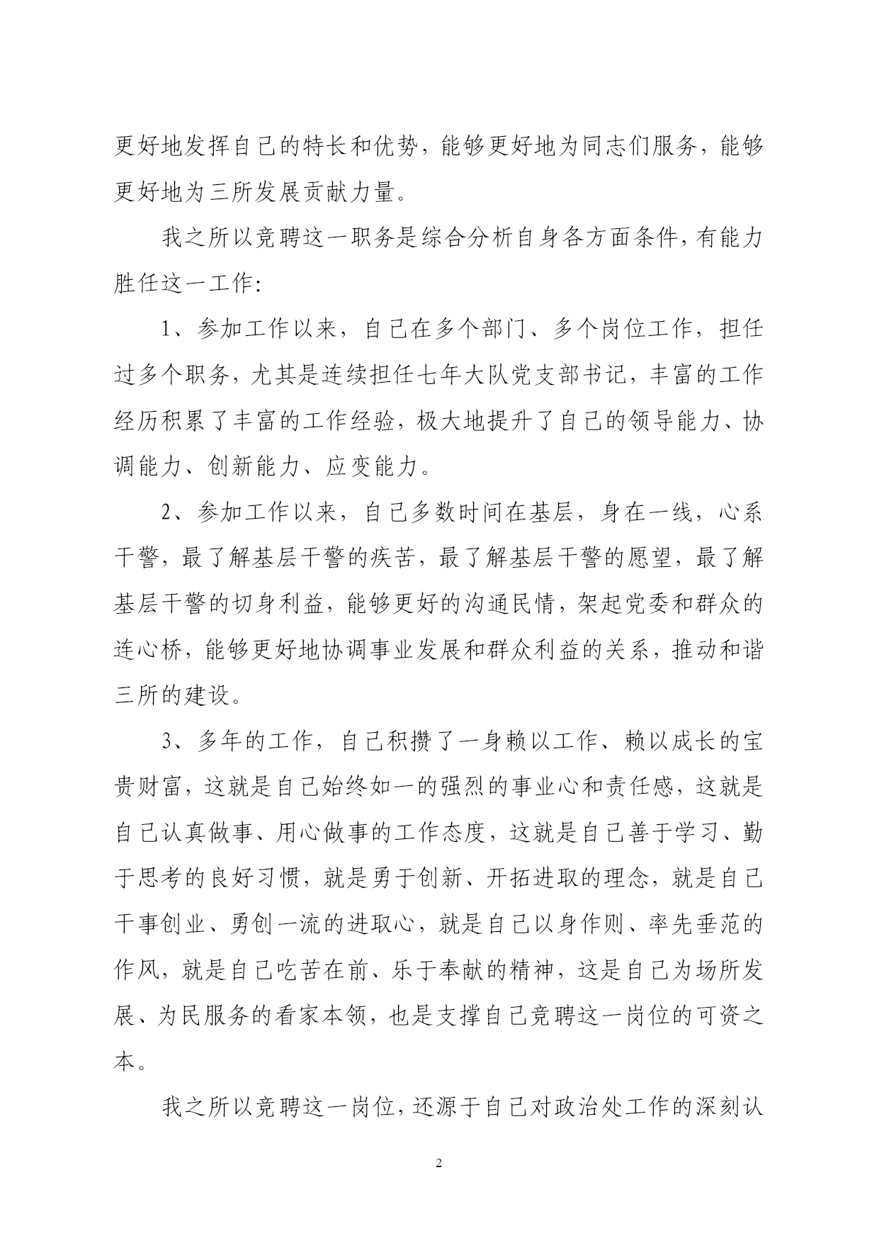 政治处主任竞聘演讲稿——河南省第三劳教所师宝龙尊敬的各位领导、各位评委和同志们:大家好!首先感谢党委和同志们给我这次展示自我的机会和舞台,我竞聘的岗位是政治处主任。我叫——,1987年从豫南农专毕业后分配到我所工作,历任______,现任______。多年来,在所党委的正确领导和同志们的大力支持下,自己努力学习,勤于思考,勇于创新,开拓进取,团结同志们一道奋发努力,勇创一流,在不同的岗位上做出了一定成绩_______。这些成绩的取得归功于所党委的正确领导,归功于科室、大队干警的辛勤努力,归功于全所干警工的大力支持和帮助,自己的付出微不足道,但党委和同志们却给与了我莫大荣誉,在此对多年来一直支持、关心和帮助我的党委,曾经并肩作战过的战友和同志们表示诚挚的感谢(敬礼)。政治处是党委的政治机关,肩负着贯彻执行党的政策,贯彻执行党委决议,贯彻落实人事政策,强化基层组织建设、队伍建设,当好党委的参谋助手,凝聚人心、发展三所的重任,作用发挥好坏直接关系到基层组织建设、队伍建设能否保持正确的政治方向,党的路线、方针、政策和党委的决议能否在全所得到有效贯彻,全所能否保持高度统一和中心任务的圆满完成。我竞聘这一岗位深感压力。我之所以竞聘这一岗位,我认为这一岗位能够更好地发挥自己的特长和优势,能够更好地为同志们服务,能够更好地为三所发展贡献力量。我之所以竞聘这一职务是综合分析自身各方面条件,有能力胜任这一工作:1、参加工作以来,自己在多个部门、多个岗位工作,担任过多个职务,尤其是连续担任七年大队党支部书记,丰富的工作经历积累了丰富的工作经验,极大地提升了自己的领导能力、协调能力、创新能力、应变能力。2、参加工作以来,自己多数时间在基层,身在一线,心系干警,最了解基层干警的疾苦,最了解基层干警的愿望,最了解基层干警的切身利益,能够更好的沟通民情,架起党委和群众的连心桥,能够更好地协调事业发展和群众利益的关系,推动和谐三所的建设。3、多年的工作,自己积攒了一身赖以工作、赖以成长的宝贵财富,这就是自己始终如一的强烈的事业心和责任感,这就是自己认真做事、用心做事的工作态度,这就是自己善于学习、勤于思考的良好习惯,就是勇于创新、开拓进取的理念,就是自己干事创业、勇创一流的进取心,就是自己以身作则、率先垂范的作风,就是自己吃苦在前、乐于奉献的精神,这是自己为场所发展、为民服务的看家本领,也是支撑自己竞聘这一岗位的可资之本。我之所以竞聘这一岗位,还源于自己对政治处工作的深刻认识,更源于自己对政治处工作的深刻思考,我认为作为政治处:1、要讲政治。讲政治是政治处的第一要旨,讲政治就是要忠诚于党、忠诚于劳教事业、忠诚于党委,就要在思想上、行动上同党委保持高度一致,就要全力把党委的决议、党委的决心化为全体干警工的意志,确保我所工作阔步前进。2、要勤奋学习,全力打造学习型政治处。政治处要贯彻落实党的方针、政策,要落实党的人事政策,要当好党委的参谋助手,要提升为民服务的质量,就要求政治处每个成员具有较高的政治业务素质,党的理论、党的政策、人事政策,要先学、先会、先掌握,业务技能要学通、学精、学细,思想观念要先更新、先转变,努力提高贯彻、执行党的方针、政策的本领,贯彻落实党委决议的本领,为党委当好助手的本领,为群众服务的本领。3、要勇于创新,全力打造创新型政治处。创新是推动事业发展的不竭动力。作为政治处要在创新学习机制上下功夫,力戒为学习而学习,务求实效;要在创新服务于民的方式、方法上下功夫,做到公平、公正、公开、热诚;要在创新选拔、任用干部机制上下功夫,为年轻干警脱颖而出搭建舞台,积极发现人才、培养人才、推出人才,克服干警青黄不接的局面。4、要牢记宗旨意识,全力打造服务型政治处。工作就是服务,服务就是工作。如果说消费者是上帝,那么对于政治处而言,职工就是上帝。要以职工满意为标准,提升我们的服务质量;要像卢展工书记提出的那样:“考虑工作要多站在人民群众利益角度上考虑”,笑脸多一点,服务热情一点,工作到位一点,执法公正、公开、公平一点,树立“一句话就是温暖,一举手就是服务”的理念,真正做到“把心放在职工身上,把职工放在自己心上”。正是有以上支撑,我有信心,有能力干好这一工作。如果各位领导、各位评委和同志们信任我,给我这个机会,我一定不会辜负同志们的期望;如果我没有竞聘到这个岗位,说明自己距离党委和同志们的要求还有一定的差距,我一定会正常对待,在原岗位尽职尽责,干好工作,请党委放心,请各位评委放心,请同志们放心。最后,再次谢谢各位领导,各位评委和同志们(敬礼)。