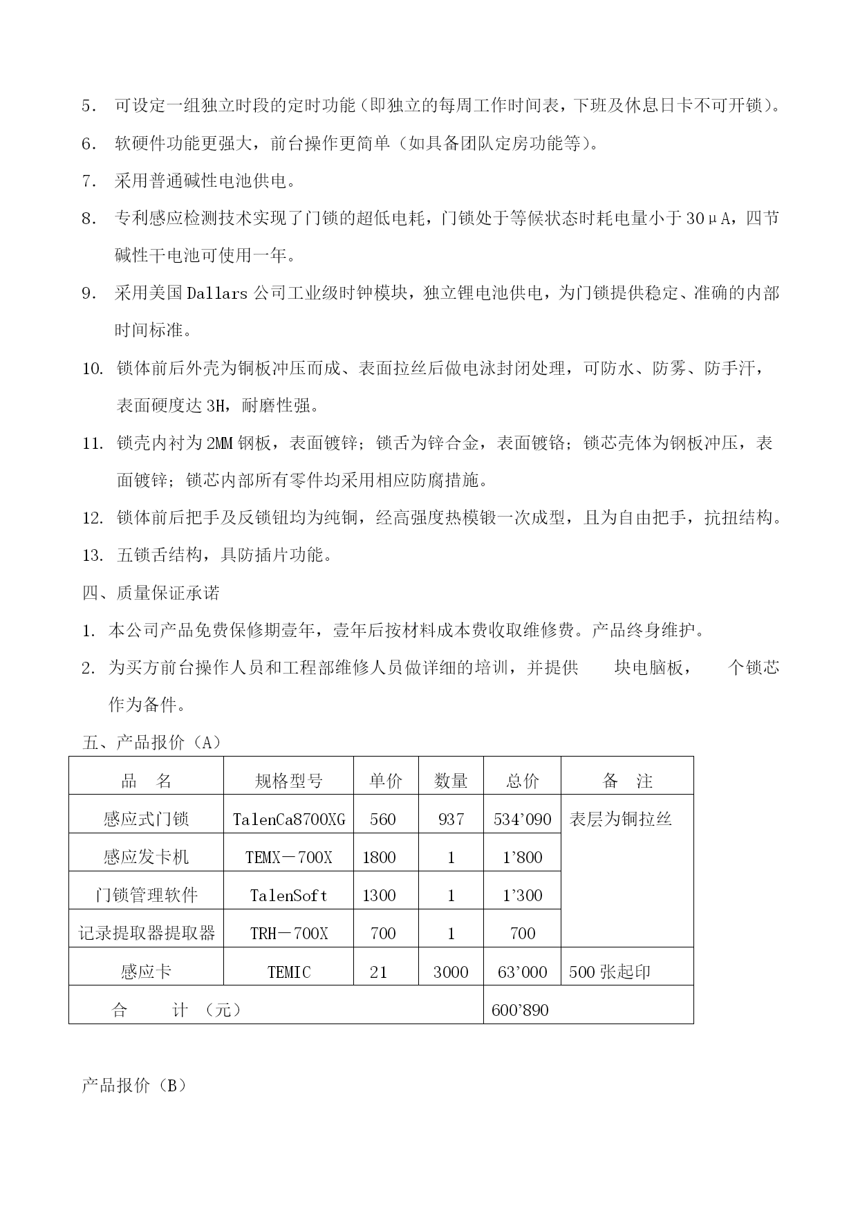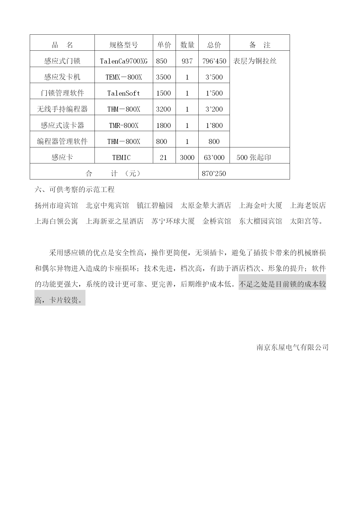 项目方案(感应锁)一、产品名称泰伦牌感应式IC卡电脑门锁、发卡机、发卡机软件、无线手持编程器、无线手持编程器管理软件、感应IC卡。产品功能完善的钥匙卡分级和分组管理能力,全面满足酒店管理的需要。宾客钥匙卡可打开任意设定的1-8间客房门锁;服务员钥匙卡可打开任意设定的1-8个楼层的客房门锁;紧急卡可开启所有客房门锁。具有开锁记录功能,可记录最近的224次开锁记录,包括卡片的持有人(号)、插卡日期及时间、制卡人、卡片类型等。锁内附有高精度石英计时钟和大容量记忆体,开锁记录可在电脑终端上显示并打印出来。当电池电压太低时,靠近有效的卡片,绿灯闪动报警。首次报警后仍可有300次以上开锁机会,以便客户有足够的时间更换电池。采用专利电机驱动离合器结构,在门锁关闭时,门外把手与锁芯分离。具有完全独立的机械应急开锁机构,其应急开锁机构与电子开锁机构采用了两套完全独立的传动装置。钥匙卡具有消费记帐功能,可记录币种、存款总额、累计消费总额以及不同部门的消费总额,并具有个人身份识别码,可防止卡片被盗用,从而实现一卡通功能。开放式接口,便于与其它酒店管理系统软件的联接。三、主要技术特点采用德国TEMIC专利技术制造,技术先进,性能优异,可靠性高。采用先进的感应式(无线射频)技术,门锁外部无插卡孔槽,卡片靠近至1-3厘米内即可开锁(或轻触按钮后靠近卡片即可开锁)。32位高安全存取密码,确保门锁系统具有高度的安全性。32级任意分组的钥匙卡管理体系,每张卡可同时管理3-6组门锁。可设定一组独立时段的定时功能(即独立的每周工作时间表,下班及休息日卡不可开锁)。软硬件功能更强大,前台操作更简单(如具备团队定房功能等)。采用普通碱性电池供电。专利感应检测技术实现了门锁的超低电耗,门锁处于等候状态时耗电量小于30μA,四节碱性干电池可使用一年。采用美国Dallars公司工业级时钟模块,独立锂电池供电,为门锁提供稳定、准确的内部时间标准。10.锁体前后外壳为铜板冲压而成、表面拉丝后做电泳封闭处理,可防水、防雾、防手汗,表面硬度达3H,耐磨性强。锁壳内衬为2MM钢板,表面镀锌;锁舌为锌合金,表面镀铬;锁芯壳体为钢板冲压,表面镀锌;锁芯内部所有零件均采用相应防腐措施。锁体前后把手及反锁钮均为纯铜,经高强度热模锻一次成型,且为自由把手,抗扭结构。五锁舌结构,具防插片功能。四、质量保证承诺本公司产品免费保修期壹年,壹年后按材料成本费收取维修费。产品终身维护。为买方前台操作人员和工程部维修人员做详细的培训,并提供块电脑板,个锁芯作为备件。五、产品报价(A)品名规格型号单价数量总价备注感应式门锁TalenCa8700XG560937534’090表层为铜拉丝感应发卡机TEMX-700X180011’800门锁管理软件TalenSoft130011’300记录提取器提取器TRH-700X7001700感应卡TEMIC21300063’000500张起印合计(元)600’890产品报价(B)品名规格型号单价数量总价备注感应式门锁TalenCa9700XG850937796’450表层为铜拉丝感应发卡机TEMX-800X350013’500门锁管理软件TalenSoft150011’500无线手持编程器THM-800X320013’200感应式读卡器TMR-800X180011’800编程器管理软件THM-800X8001800感应卡TEMIC21300063’000500张起印合计(元)870’250六、可供考察的示范工程扬州市迎宾馆北京中苑宾馆镇江碧榆园太原金辇大酒店上海金叶大厦上海老饭店上海白领公寓上海新亚之星酒店苏宁环球大厦金桥宾馆东大榴园宾馆太阳宫等。采用感应锁的优点是安全性高,操作更简便,无须插卡,避免了插拔卡带来的机械磨损和偶尔异物进入造成的卡座损坏;技术先进,档次高,有助于酒店档次、形象的提升;软件的功能更强大,系统的设计更可靠、更完善,后期维护成本低。不足之处是目前锁的成本较高,卡片较贵。eq\o\ad(南京东屋电气有限公司,)