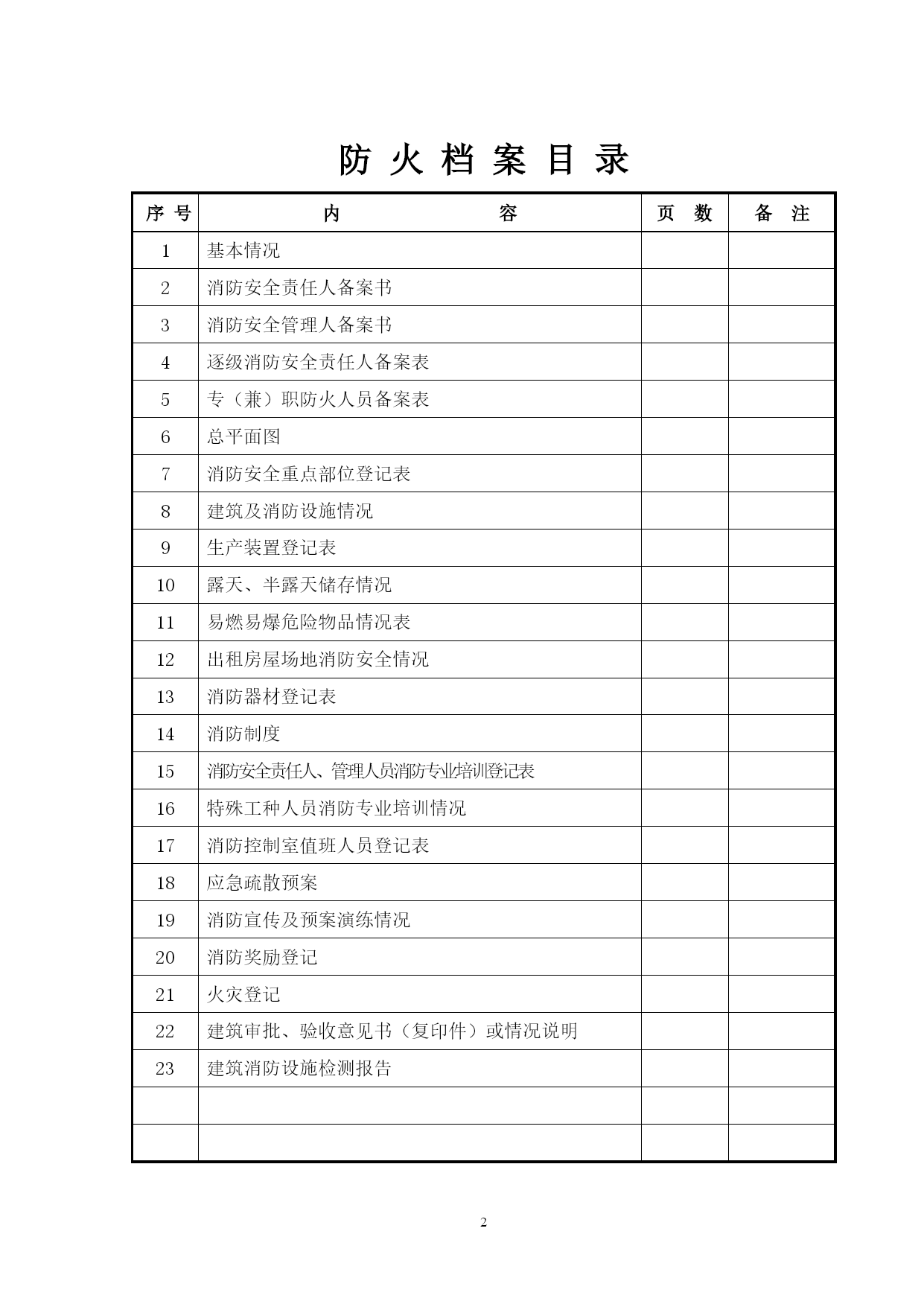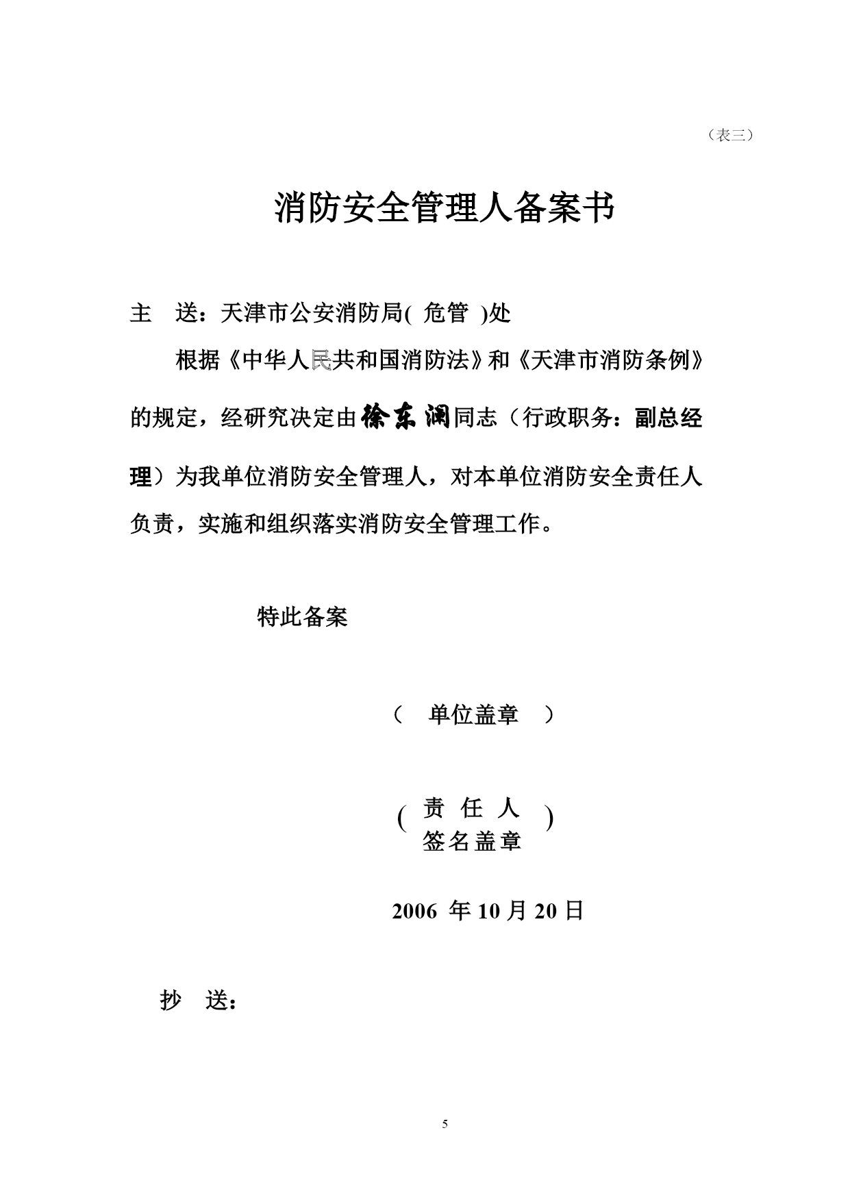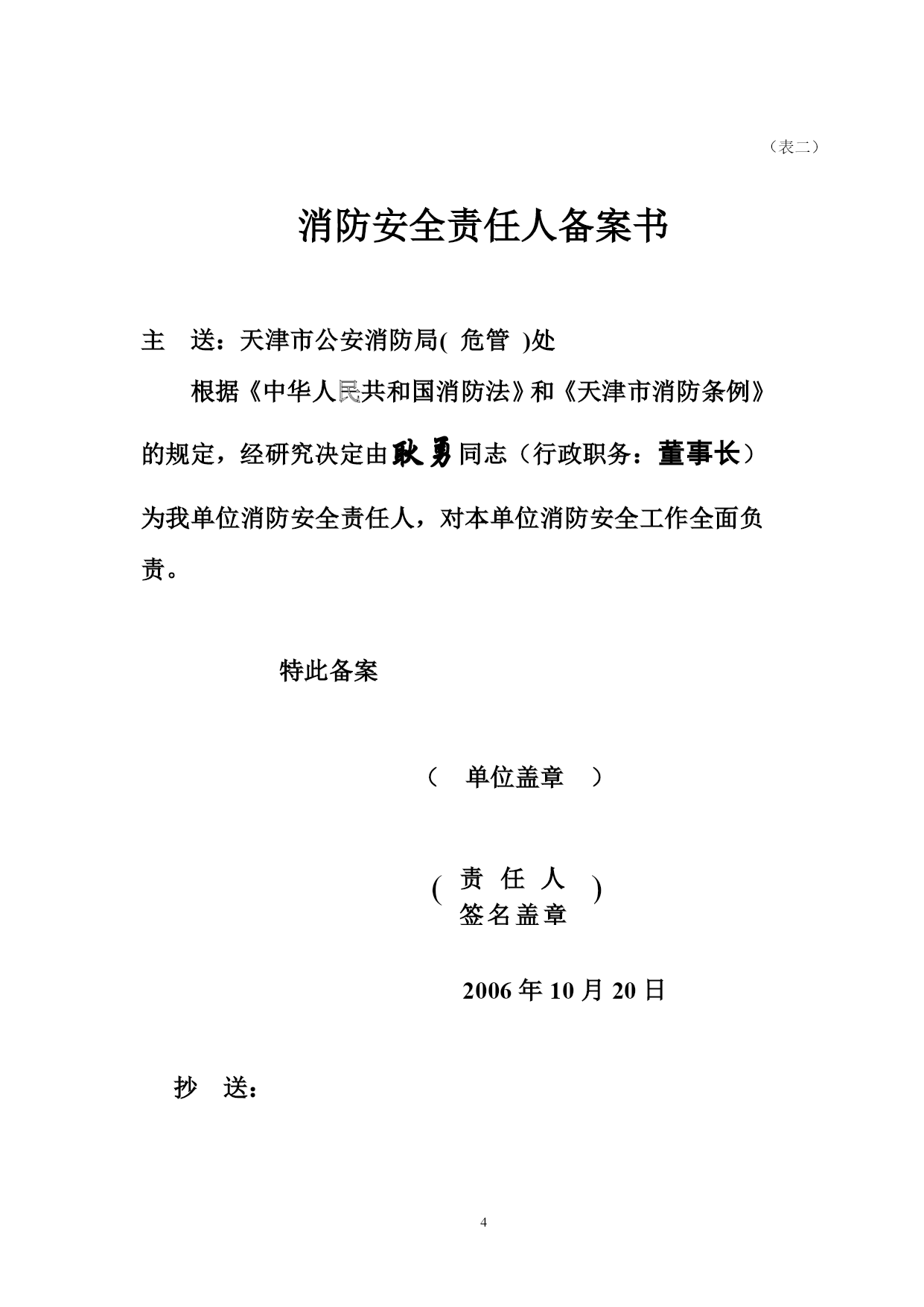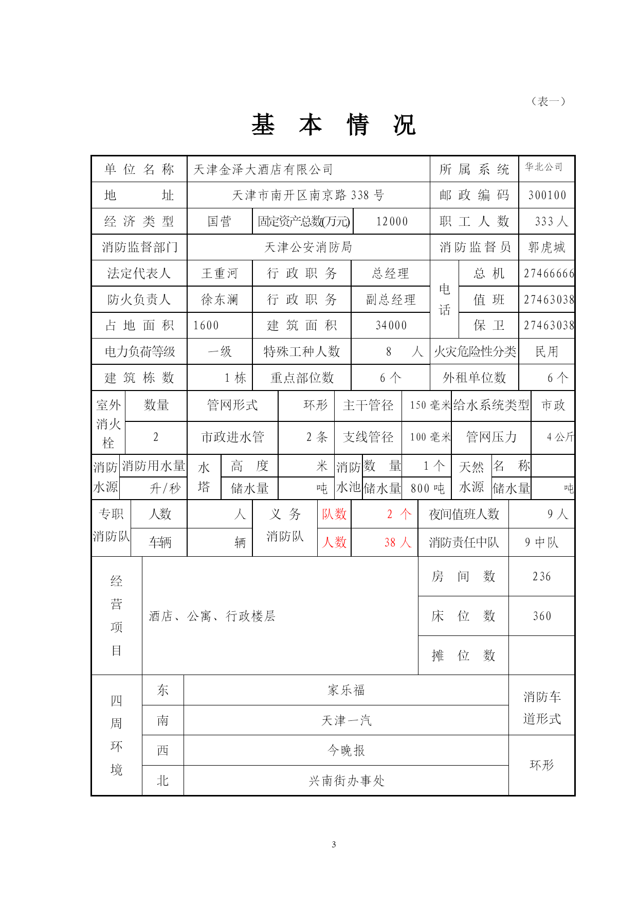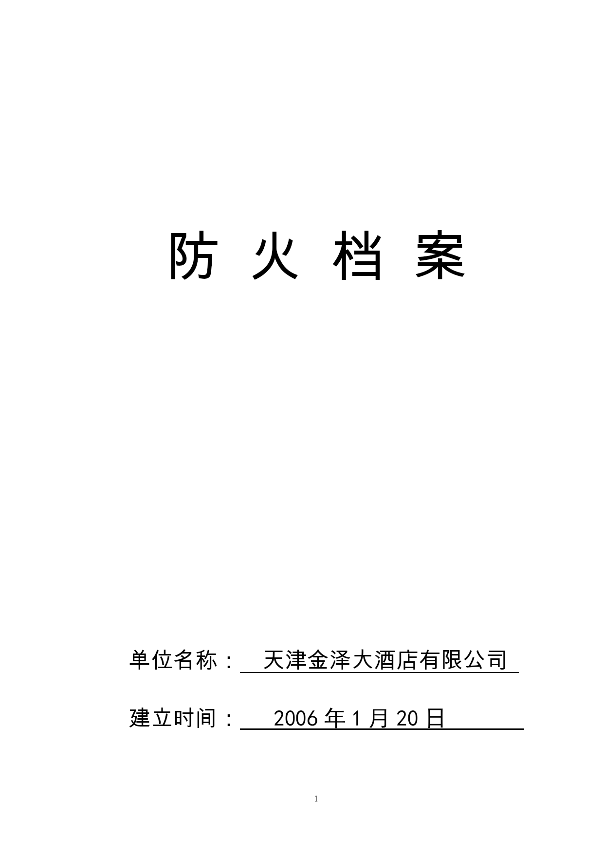 防火档案单位名称:天津金泽大酒店有限公司建立时间:2006年1月20日防火档案目录序号内容页数备注1基本情况2消防安全责任人备案书3消防安全管理人备案书4逐级消防安全责任人备案表5专(兼)职防火人员备案表6总平面图7消防安全重点部位登记表8建筑及消防设施情况9生产装置登记表10露天、半露天储存情况11易燃易爆危险物品情况表12出租房屋场地消防安全情况13消防器材登记表14消防制度15消防安全责任人、管理人员消防专业培训登记表16特殊工种人员消防专业培训情况17消防控制室值班人员登记表18应急疏散预案19消防宣传及预案演练情况20消防奖励登记21火灾登记22建筑审批、验收意见书(复印件)或情况说明23建筑消防设施检测报告(表一)基本情况单位名称天津金泽大酒店有限公司所属系统华北公司地址天津市南开区南京路338号邮政编码300100经济类型国营固定资产总数(万元)12000职工人数333人消防监督部门天津公安消防局消防监督员郭虎城法定代表人王重河行政职务总经理电话总机27466666防火负责人徐东澜行政职务副总经理值班27463038占地面积1600建筑面积34000保卫27463038电力负荷等级一级特殊工种人数8人火灾危险性分类民用建筑栋数1栋重点部位数6个外租单位数6个室外消火栓数量管网形式环形主干管径150毫米给水系统类型市政2市政进水管2条支线管径100毫米管网压力4公斤消防水源消防用水量水塔高度米消防水池数量1个天然水源名称升/秒储水量吨储水量800吨储水量吨专职消防队人数人义务消防队队数2个夜间值班人数9人车辆辆人数38人消防责任中队9中队经营项目酒店、公寓、行政楼层房间数236床位数360摊位数四周环境东家乐福消防车道形式南天津一汽西今晚报环形北兴南街办事处(表二)消防安全责任人备案书主送:天津市公安消防局(危管)处根据《中华人民共和国消防法》和《天津市消防条例》的规定,经研究决定由耿勇同志(行政职务:董事长)为我单位消防安全责任人,对本单位消防安全工作全面负责。特此备案(单位盖章)责任人签名盖章()2006年10月20日抄送:(表三)消防安全管理人备案书主送:天津市公安消防局(危管)处根据《中华人民共和国消防法》和《天津市消防条例》的规定,经研究决定由徐东澜同志(行政职务:副总经理)为我单位消防安全管理人,对本单位消防安全责任人负责,实施和组织落实消防安全管理工作。特此备案(单位盖章)责任人签名盖章()2006年10月20日抄送:(表四)逐级消防安全责任人备案表单位盖章:姓名责任部门(岗位)行政职务本人签名王重河总经理李延灵执行总经理徐东澜副总经理严志岚副总经理于国伟安保部经理杨丛昆工程部经理魏强客房部经理李晓东餐饮部总监李维彬人力资源部总监陈向伟办公室主任严志岚财务部经理王喜更采购部经理洪铁汉销售部经理林格峰中餐(金稻香餐饮有限公司)总监(表五)专(兼)职防火人员备案表2006年10月20日姓名刘新颖性别男年龄30民族汉行政职务主管本人签字刘新颖电话13642130092工作经历从事消防1993年至2005年北京南口61975部队、2002年参加干果金维和部队,担任三级士官。2006至今天津金泽大酒店有限公司安保部主管。消防训练受过何种参加过专业消防培训,2007年3月19日取得消防技能操作合格证。何种专业考核何时何地经过证件号备考单位(章)总平面图(表六)注:1、可用单位平面图代替;2、图中要标明消防水源、道路情况。(表七)消防安全重点部位部位名称锅炉房职工人数9耐火等级一级建筑(占地)面积100m2消防审批时间2006年6月19日消防验收时间2007年2月13日建筑使用情况一级建筑良好生产工艺流程或储存情况1台双良无压燃气热水器。确定依据供客房、公寓及行政楼层热水。火灾危险性锅炉内一旦缺水或燃气泄漏极易发生重大事故消防设施情况锅炉房内设有烟洛尽全充满灭火系统,燃气泄漏报警系统及干粉灭火机人员防护要求灭火方法及操作人员应随时观察锅炉额定的水位和工作压力。关注燃气管道、阀门的密闭情况,发现有泄漏时立即关闭总阀门,如在管道、阀门发生小的火苗时可用干粉灭火机进行灭火备注注:每个重点部位一表。(表八)建筑及消防设施情况建筑名称天津金泽大酒店有限公司危险分类占地面积1600建筑面积34000耐火等级一级建筑用途酒店建筑层数30层建筑高度94米电力负荷等级一级消防车道形式环形消防审批时间2006-6-19消防验收时间2007-2-13室内消火栓数量设置建筑数1栋消防水箱数量3个消防加压泵台数10台竖管管径毫米储水量30吨扬程155米水泵台最不利点压力公斤形式火灾自动报警系统系统形式设置部位酒店各区域安装时间2006年设备生产厂家施工单位区域报警集中报警控制中心区域报警控制器台感烟探测