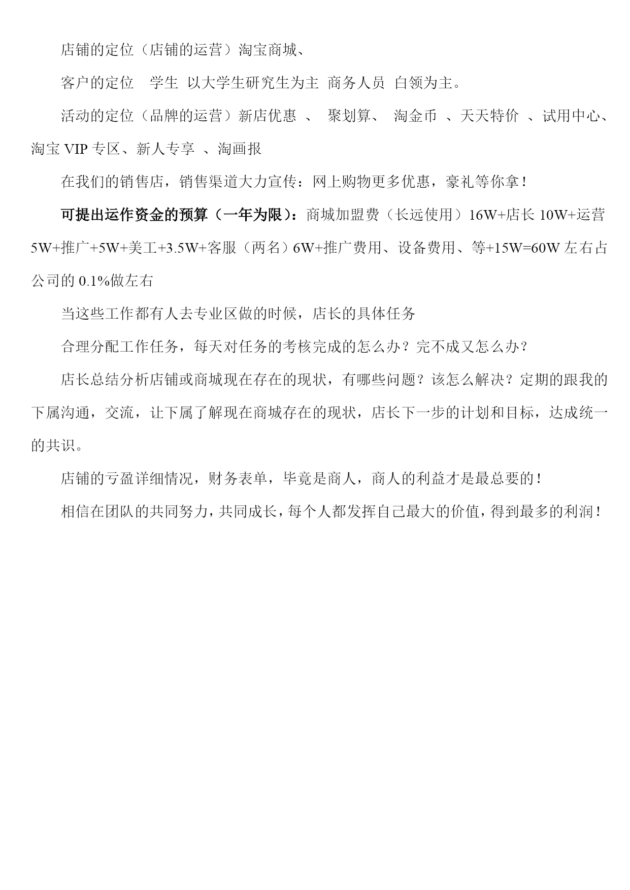店长分析店长不明思议就是一家网店或者商城的最高执行官,就像企业的CEO一样的。说到分析,分析就是将研究对象的整体分为各个部分、方面、因素和层次,并分别地加以考察的认识活动。分析的意义在于细致的寻找能够解决问题的主线,并以此解决问题。作为店长不仅要考虑自己网店或商城内部的发展,还要看到电商的总体的发展趋势。结合自己网店或商城实际的运营情况来确定未来的路线,目标。对网点和商城未来发展战略部署和长期的规划,总的来说店长是一个确定方向、明确目标、宏观掌控、是一个掌舵的角色。5人组建团队运营策划、推广营销、美工、售前客服、售后客服售前客服:客服的重要性,他代表一家店铺或者商城形象和产品专家的形象。回答顾客问题,要了解客户的需求,能够引导话题,推荐产品促成订单,熟练了解订单流程,审单、和打单!售后客服:退换货查单,订单跟进,中差评价处理。回访开始请专业的摄影师拍照美工:产品形象包装,店铺的设计,宝贝图片的处理,宝贝描述页面处理,配合设计人员制作宣传页,当然会拍照也是必不可少的推广:线上推广SEO优化,直通车、淘宝客、超级卖霸、钻石展位、硬广的投放,博客、微博、论坛、SNS社区化营销、广告联盟、网络炒作等等、、、我们只要做好其中的2~3项,其他的要懂作为辅助推广!线下推广(媒体宣传):在网店开业用新闻媒体造势宣传!DM直接邮件广告,电话广告、电视广告、灯箱广告等等、、、引进更多的流量,促进消费者购买!运营:产品的定位(产品的运营)我们是做平板电脑商务为主店铺的定位(店铺的运营)淘宝商城、客户的定位学生以大学生研究生为主商务人员白领为主。活动的定位(品牌的运营)新店优惠、聚划算、淘金币、天天特价、试用中心、淘宝VIP专区、新人专享、淘画报在我们的销售店,销售渠道大力宣传:网上购物更多优惠,豪礼等你拿!可提出运作资金的预算(一年为限):商城加盟费(长远使用)16W+店长10W+运营5W+推广+5W+美工+3.5W+客服(两名)6W+推广费用、设备费用、等+15W=60W左右占公司的0.1%做左右当这些工作都有人去专业区做的时候,店长的具体任务合理分配工作任务,每天对任务的考核完成的怎么办?完不成又怎么办?店长总结分析店铺或商城现在存在的现状,有哪些问题?该怎么解决?定期的跟我的下属沟通,交流,让下属了解现在商城存在的现状,店长下一步的计划和目标,达成统一的共识。店铺的亏盈详细情况,财务表单,毕竟是商人,商人的利益才是最总要的!相信在团队的共同努力,共同成长,每个人都发挥自己最大的价值,得到最多的利润!