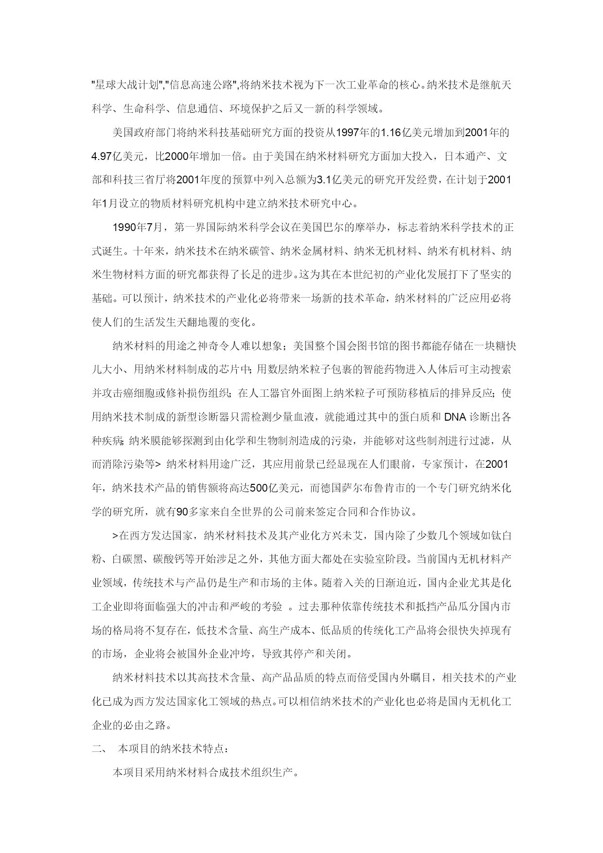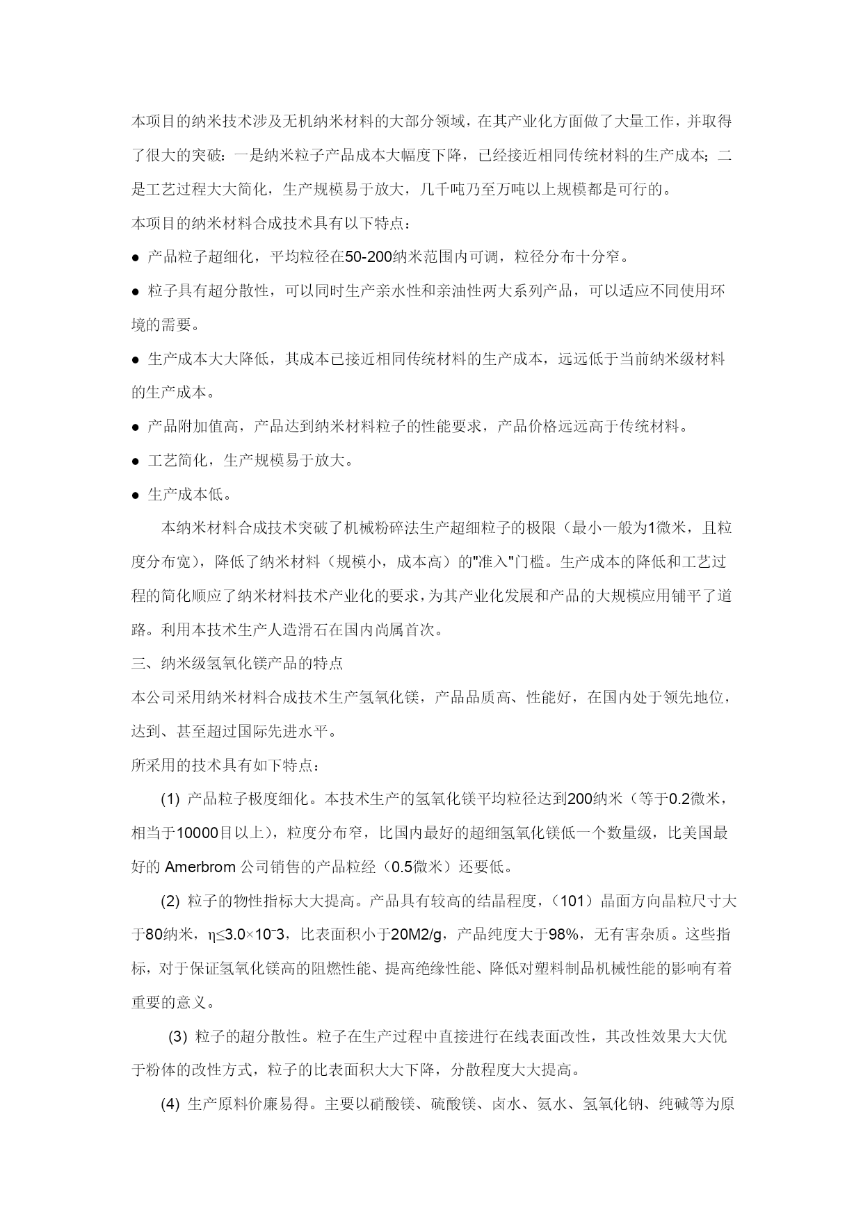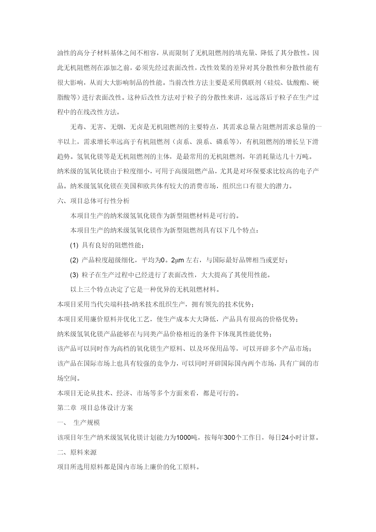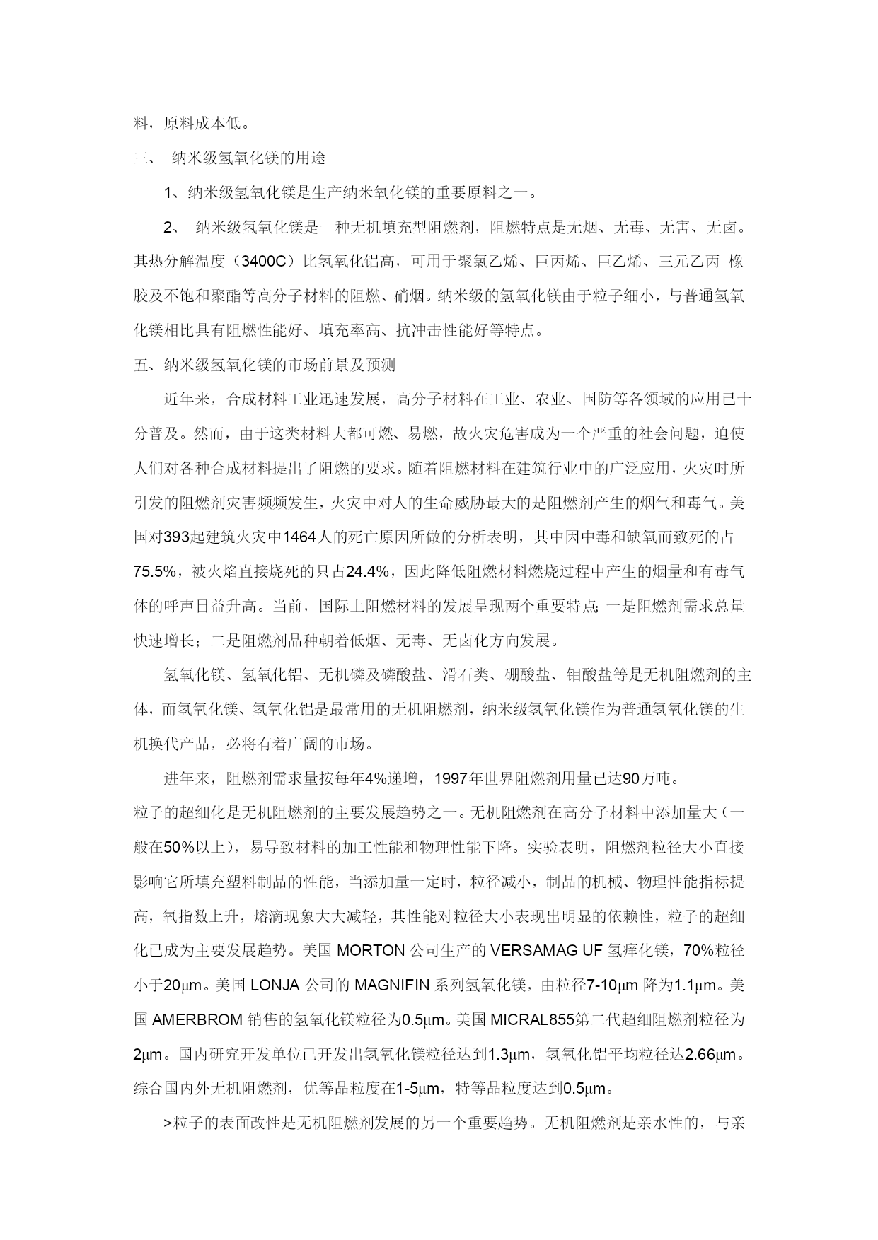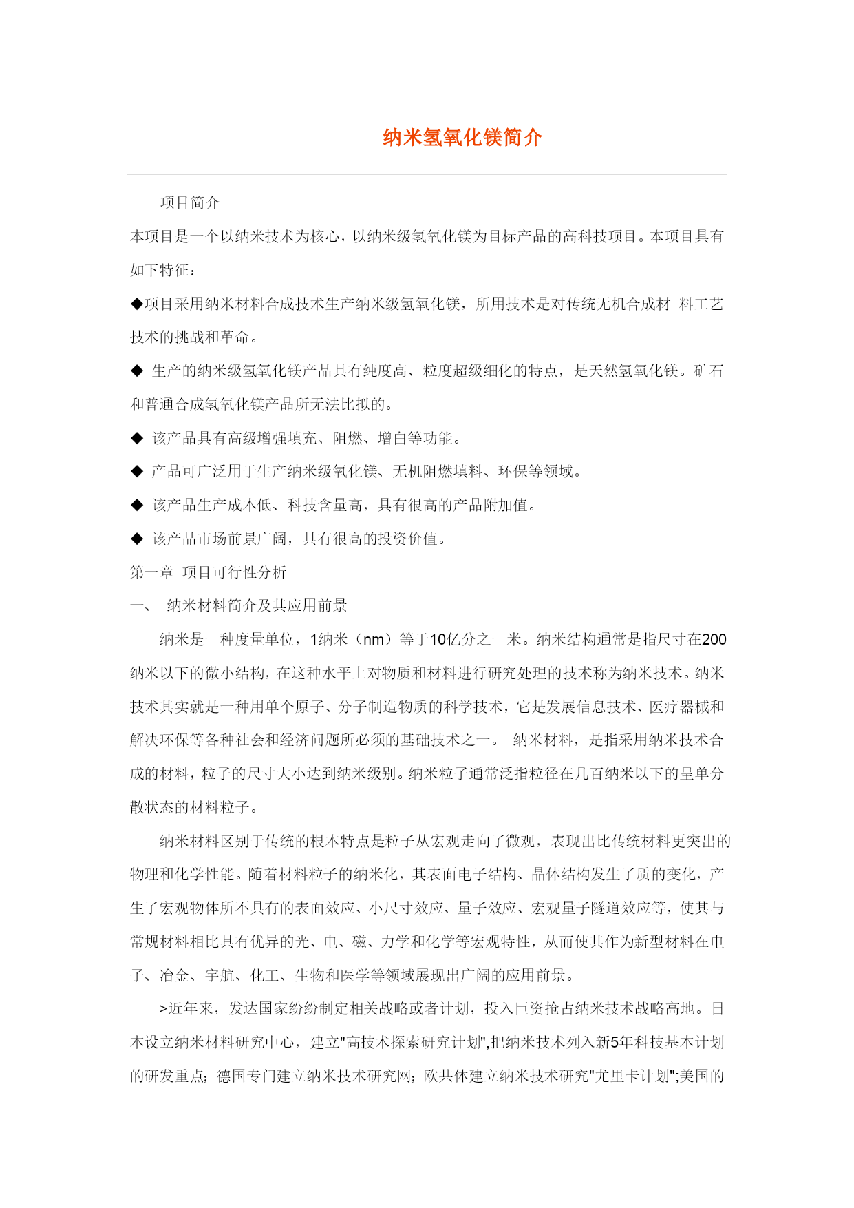 纳米氢氧化镁简介项目简介本项目是一个以纳米技术为核心,以纳米级氢氧化镁为目标产品的高科技项目。本项目具有如下特征:◆项目采用纳米材料合成技术生产纳米级氢氧化镁,所用技术是对传统无机合成材料工艺技术的挑战和革命。◆生产的纳米级氢氧化镁产品具有纯度高、粒度超级细化的特点,是天然氢氧化镁。矿石和普通合成氢氧化镁产品所无法比拟的。◆该产品具有高级增强填充、阻燃、增白等功能。◆产品可广泛用于生产纳米级氧化镁、无机阻燃填料、环保等领域。◆该产品生产成本低、科技含量高,具有很高的产品附加值。◆该产品市场前景广阔,具有很高的投资价值。第一章项目可行性分析一、纳米材料简介及其应用前景纳米是一种度量单位,1纳米(nm)等于10亿分之一米。纳米结构通常是指尺寸在200纳米以下的微小结构,在这种水平上对物质和材料进行研究处理的技术称为纳米技术。纳米技术其实就是一种用单个原子、分子制造物质的科学技术,它是发展信息技术、医疗器械和解决环保等各种社会和经济问题所必须的基础技术之一。纳米材料,是指采用纳米技术合成的材料,粒子的尺寸大小达到纳米级别。纳米粒子通常泛指粒径在几百纳米以下的呈单分散状态的材料粒子。纳米材料区别于传统的根本特点是粒子从宏观走向了微观,表现出比传统材料更突出的物理和化学性能。随着材料粒子的纳米化,其表面电子结构、晶体结构发生了质的变化,产生了宏观物体所不具有的表面效应、小尺寸效应、量子效应、宏观量子隧道效应等,使其与常规材料相比具有优异的光、电、磁、力学和化学等宏观特性,从而使其作为新型材料在电子、冶金、宇航、化工、生物和医学等领域展现出广阔的应用前景。>近年来,发达国家纷纷制定相关战略或者计划,投入巨资抢占纳米技术战略高地。日本设立纳米材料研究中心,建立"高技术探索研究计划",把纳米技术列入新5年科技基本计划的研发重点;德国专门建立纳米技术研究网;欧共体建立纳米技术研究"尤里卡计划";美国的"星球大战计划","信息高速公路",将纳米技术视为下一次工业革命的核心。纳米技术是继航天科学、生命科学、信息通信、环境保护之后又一新的科学领域。美国政府部门将纳米科技基础研究方面的投资从1997年的1.16亿美元增加到2001年的4.97亿美元,比2000年增加一倍。由于美国在纳米材料研究方面加大投入,日本通产、文部和科技三省厅将2001年度的预算中列入总额为3.1亿美元的研究开发经费,在计划于2001年1月设立的物质材料研究机构中建立纳米技术研究中心。1990年7月,第一界国际纳米科学会议在美国巴尔的摩举办,标志着纳米科学技术的正式诞生。十年来,纳米技术在纳米碳管、纳米金属材料、纳米无机材料、纳米有机材料、纳米生物材料方面的研究都获得了长足的进步。这为其在本世纪初的产业化发展打下了坚实的基础。可以预计,纳米技术的产业化必将带来一场新的技术革命,纳米材料的广泛应用必将使人们的生活发生天翻地覆的变化。纳米材料的用途之神奇令人难以想象;美国整个国会图书馆的图书都能存储在一块糖快儿大小、用纳米材料制成的芯片中;用数层纳米粒子包裹的智能药物进入人体后可主动搜索并攻击癌细胞或修补损伤组织;在人工器官外面图上纳米粒子可预防移植后的排异反应;使用纳米技术制成的新型诊断器只需检测少量血液,就能通过其中的蛋白质和DNA诊断出各种疾病;纳米膜能够探测到由化学和生物制剂造成的污染,并能够对这些制剂进行过滤,从而消除污染等>纳米材料用途广泛,其应用前景已经显现在人们眼前,专家预计,在2001年,纳米技术产品的销售额将高达500亿美元,而德国萨尔布鲁肯市的一个专门研究纳米化学的研究所,就有90多家来自全世界的公司前来签定合同和合作协议。>在西方发达国家,纳米材料技术及其产业化方兴未艾,国内除了少数几个领域如钛白粉、白碳黑、碳酸钙等开始涉足之外,其他方面大都处在实验室阶段。当前国内无机材料产业领域,传统技术与产品仍是生产和市场的主体。随着入关的日渐迫近,国内企业尤其是化工企业即将面临强大的冲击和严峻的考验。过去那种依靠传统技术和抵挡产品瓜分国内市场的格局将不复存在,低技术含量、高生产成本、低品质的传统化工产品将会很快失掉现有的市场,企业将会被国外企业冲垮,导致其停产和关闭。纳米材料技术以其高技术含量、高产品品质的特点而倍受国内外瞩目,相关技术的产业化已成为西方发达国家化工领域的热点。可以相信纳米技术的产业化也必将是国内无机化工企业的必由之路。二、本项目的纳米技术特点:本项目采用纳米材料合成技术组织生产。本项目的纳米技术涉及无机纳米材料的大部分领域,在其产业化方面做了大量工作,并取得了很大的突破:一是纳米粒子产品成本大幅度下降,已经接近相同传统材料的生产成本;二是工艺过程大大简化,生产规模易于放大,几千吨乃至万吨以上规模都是可行的。本项目的纳米材料合成技术具有以下特点:●产品粒