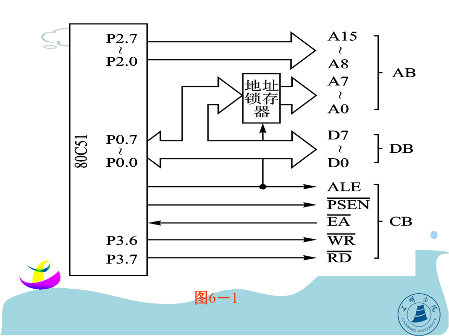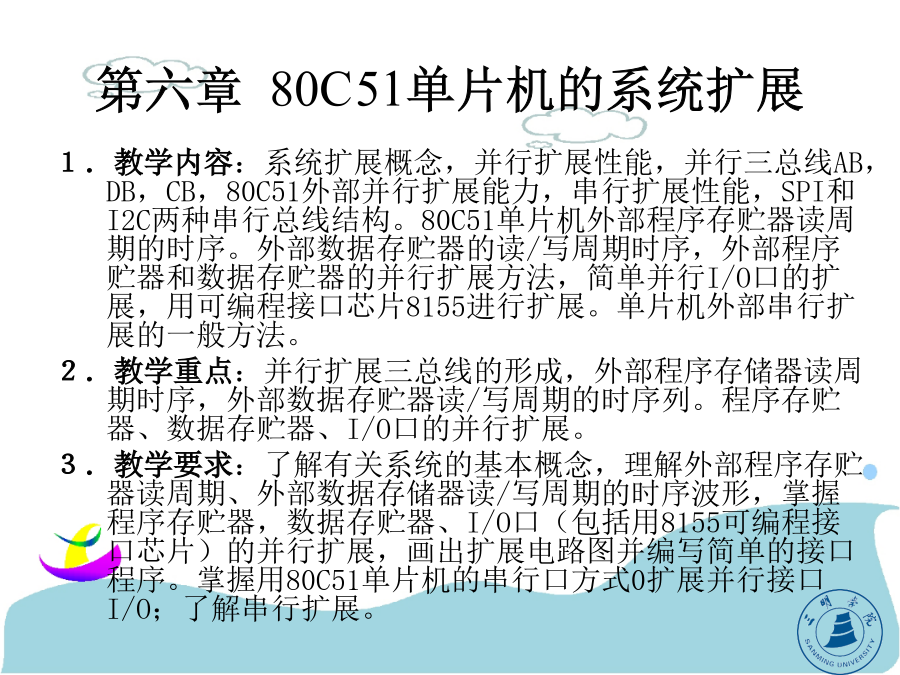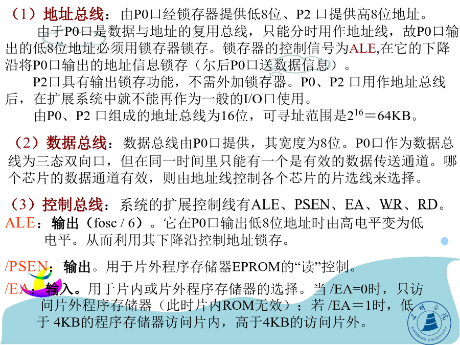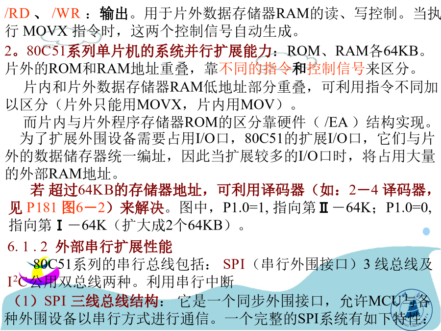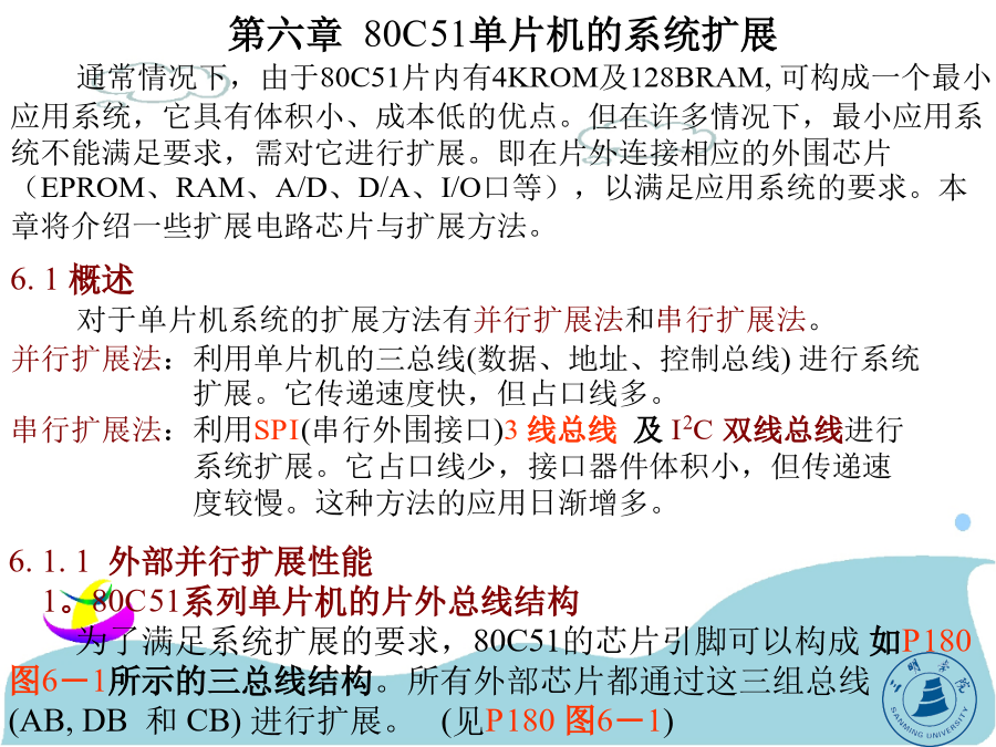 第六章80C51单片机的系统扩展第六章80C51单片机的系统扩展通常情况下,由于80C51片内有4KROM及128BRAM,可构成一个最小应用系统,它具有体积小、成本低的优点。但在许多情况下,最小应用系统不能满足要求,需对它进行扩展。即在片外连接相应的外围芯片(EPROM、RAM、A/D、D/A、I/O口等),以满足应用系统的要求。本章将介绍一些扩展电路芯片与扩展方法。(1)地址总线:由P0口经锁存器提供低8位、P2口提供高8位地址。由于P0口是数据与地址的复用总线,只能分时用作地址线,故P0口输出的低8位地址必须用锁存器锁存。锁存器的控制信号为ALE,在它的下降沿将P0口输出的地址信息锁存(尔后P0口送数据信息)。P2口具有输出锁存功能,不需外加锁存器。P0、P2口用作地址总线后,在扩展系统中就不能再作为一般的I/O口使用。由P0、P2口组成的地址总线为16位,可寻址范围是216=64KB。/RD、/WR:输出。用于片外数据存储器RAM的读、写控制。当执行MOVX指令时,这两个控制信号自动生成。—全双工、三线同步传送;—主、从机工作方式;—可程控的主机位传送频率、时钟极性和相位;—发送完成中断标志;—写冲突保护标志。通过SPI可以扩展各种I/O功能,如A/D、D/A、实时时钟、RAM、E2PROM及并行I/O接口等。在把SPI与一片或几片串行扩展芯片相连时,只需按要求连接SCLK、MOSI、MISO三根线即可。对于某些I/O扩展芯片,它们有/CS端,这些芯片应该用一根I/O口线来控制它们的片选端/CS。I2C总线上的器件,SDA和SCL引脚都是一个漏极开路端,因此在I2C总线上的所有器件的SDA端引脚需连接在一起,并通过电阻与电源连接;SCL引脚也要连在一起,并通过电阻与电源连接(P183图6-4)。④数据有效(D)如P185图6-6所示。在开始条件以后,串行时钟线保持高电平(SCL=1)的周期期间,当串行数据线(SDA)稳定时,串行数据线的状态表示数据线是有效的。而在串行时钟线保持低电平(SCL=0)的周期期间,串行数据线上的数据应该改变。每位数据需要一个时钟脉冲。(详见P185图6-6)综上所述,I2C总线的主要功能有:(P186)6.2单片机的外部并行扩展常用芯片介绍(补充)型号:6264前两位数62,表示SRAM后两位64÷8=8k字节容量62128有128÷8=16k字节容量62256有256÷8=32k字节容量地址锁存器芯片地址译码器:74LS1386.2单片机的外部并行扩展6.2.1程序存储器的扩展(2)扩展两片8K×8位片外程序存储器的电路,如P190图6-12。因是8031,无片内ROM,/EA接地。片外2764EPROM用A0~A12共13根地址线(各8K),利用P2.5接片选/CE,当P2.5=0时,选通左边的2764,地址范围是0000H~1FFFH;当P2.5=1时,选通右边的2764,地址范围是2000H~3FFFH。共16K程序存储器。不同芯片用线选法。P2.7P2.6P2.5P2.4P2.3P2.2P2.1P2.0A7A6A5A4A3A2A1A0Ⅰ:1100000000000000=C000H~1101111111111111~DFFFHⅡ:1010000000000000=A000H~1011111111111111~BFFFHⅢ:0110000000000000~0111111111111111=6000H~7FFFH6.2.2片外数据存储器的扩展1。片外数据存储器扩展时的总线功能和读、写操作时序片外数据存储器的读写操作的指令有两组4条。其中(1)MOVXA,@DPTR和MOVX@DPTR,A的操作时序见P191图6-13。注意:P2口的时序与内容(PCH、DPH,此时不能作I/O口用)。图6--13“MOVXA,@DPTR”和“MOVX@DPTR,A”的操作时序2。扩展片外数据存储器的硬件电路如P192图6-15所示。注意:单片机的/RD和/WR的接法。书中P192图6-16、P194图6-17分别介绍了扩展2K×8位、16K×8位的片外数据存储器的方法,除了它们是利用/RD和/WR来选通外,其它扩展方法与EPROM类似,请注意比较(自学)。6.2.3同时扩展片外程序存储器和片外数据存储器1。分别扩展片外程序存储器和片外数据存储器(P195图6-18)在此电路中,EPROM和RAM的地址都由P2口提供高8位,P0口提供低8位,两者共处于同一地址空间,即地址重复,但两者的选通方法不同(EPROM是/PSEN;RAM是RD/WR),访问时不会发生总线冲突。6.2.4通过并行总线扩展I/O口实现I/O口功能的扩展,可以利用简单的TTL或CMOS电路,也可以利用结构较为复杂的可编程芯片(如815
