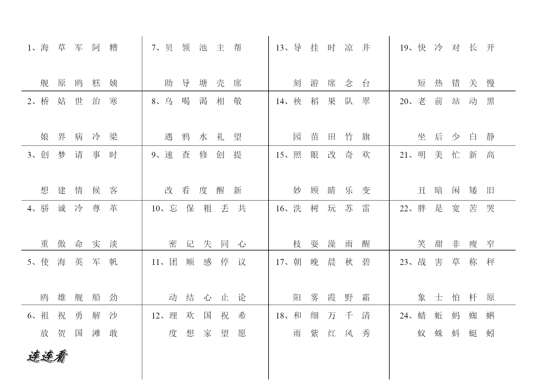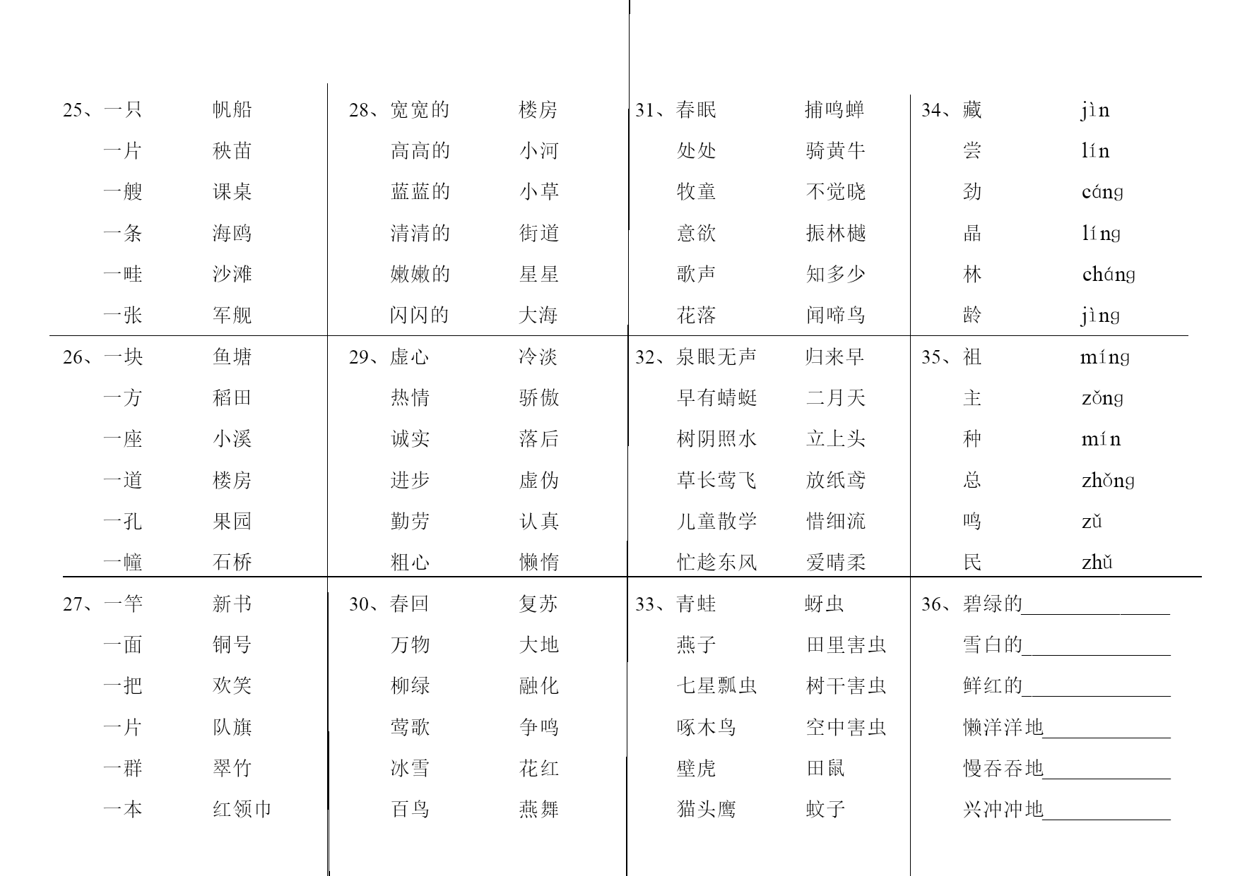 1、海草军阿糟舰原鸥糕姨2、桥姑世治寒娘界病冷梁3、创梦请事时想建情候客4、骄诚冷尊革重傲命实淡5、使海英军帆鸥雄舰船劲6、祖祝勇解沙放贺国滩敢7、贝领池主帮助导塘壳席8、乌喝渴相敬遇鸦水礼望9、速查修创提改看度醒新10、忘保粗丢共密记失同心11、团顺感停议动结心止论12、理欢国祝希度想家望愿13、导挂时凉井刻游席念台14、秧稻果队翠园苗田竹旗15、照眼改奇欢妙顾睛乐变16、洗树玩苏雷枝耍澡雨醒17、朝晚晨秋碧阳雾霞野霜18、和细万千清雨紫红风秀19、快冷对长开短热错关慢20、老前站动黑坐后少白静21、明美忙新高丑暗闲矮旧22、胖是宽苦哭笑甜非瘦窄23、战害草称秤象士怕杆原24、蜻蚯蚂蜘蝌蚁蛛蚪蜓蚓25、一只帆船一片秧苗一艘课桌一条海鸥一畦沙滩一张军舰26、一块鱼塘一方稻田一座小溪一道楼房一孔果园一幢石桥27、一竿新书一面铜号一把欢笑一片队旗一群翠竹一本红领巾28、宽宽的楼房高高的小河蓝蓝的小草清清的街道嫩嫩的星星闪闪的大海29、虚心冷淡热情骄傲诚实落后进步虚伪勤劳认真粗心懒惰30、春回复苏万物大地柳绿融化莺歌争鸣冰雪花红百鸟燕舞31、春眠捕鸣蝉处处骑黄牛牧童不觉晓意欲振林樾歌声知多少花落闻啼鸟32、泉眼无声归来早早有蜻蜓二月天树阴照水立上头草长莺飞放纸鸢儿童散学惜细流忙趁东风爱晴柔33、青蛙蚜虫燕子田里害虫七星瓢虫树干害虫啄木鸟空中害虫壁虎田鼠猫头鹰蚊子34、藏jìn尝lín劲cánɡ晶línɡ林chánɡ龄jìnɡ35、祖mínɡ主zǒnɡ种mín总zhǒnɡ鸣zǔ民zhǔ36、碧绿的_______________雪白的_______________鲜红的_______________懒洋洋地_____________慢吞吞地_____________兴冲冲地_____________