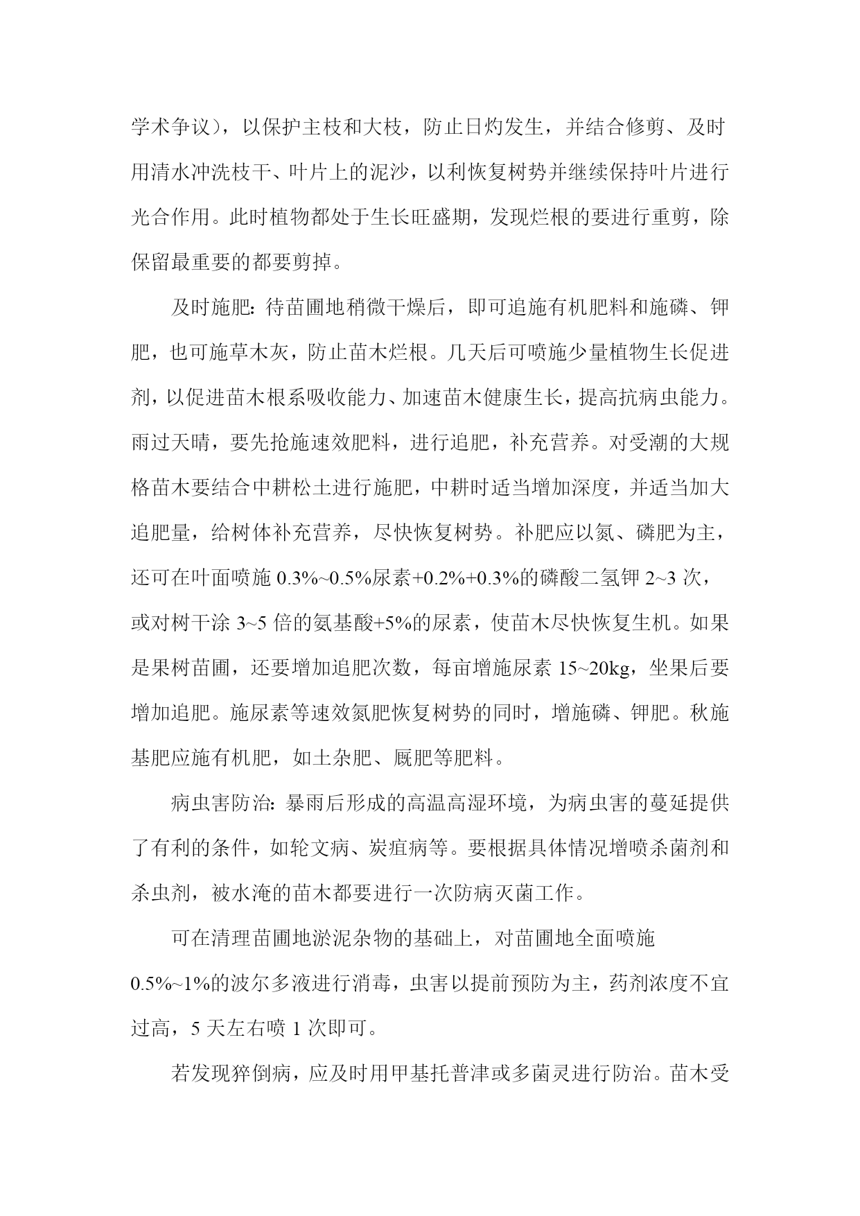 暴雨后苗木抢救近期全国大到暴雨的地区较多,不少苗圃被淹,大水过后,受洪涝灾害的苗木应尽快抢救,以减少损失,受涝的补救措施总体概括为四点:排水清淤、扶苗修剪、及时追肥、病虫害防治。排水清淤:土壤因给水而缺氧,使苗木根系不能进行正常的呼吸。因此要及时疏通沟渠,排除积水和清除淤泥杂物,整理苗圃地,平整苗床。结合深翻园地挖排水沟,合适的沟深为30cm以上,引水出园,或配合机械抢排,做到明水直流、暗水直落,以此降低土壤和园内空气湿度。不同植物的抗涝性也不相同,因此抢救受涝苗木也应考虑这个因素,应首先对抗涝性差的苗木采取技术措施加以抢救。扶苗修剪:水退后及时扶正苗木,洗净苗木的淤泥杂物。待苗木恢复生机后再进行松土、除草,以促进苗木根系的生长发育。排水数日后要及时扶正倒伏、倾斜的苗木,并加以固定,否则土壤干结根系固定再难扶正,易伤树根。对受潮而烂根较严重的苗木,应松土散墒,将根颈周围的土扒开晾根,增加蒸发量,提高土壤通气性,促进根系尽快恢复吸收功能。同时清除已腐烂的树根,撒施草木灰或干火土灰,并在土壤干爽后换新土,尽快使根系恢复生长。扶正苗木后的1~2天即可因树修剪,对死枝多的树要待新芽萌发后剪去残缺无用的枝条,削平伤口,伤口涂上波尔多液浆。落叶枯枝少的树及时带绿修剪,新芽萌发成丛的树抹除多余的芽梢,以节约养分,促发新梢。修剪较重的树要刷白(对于苗木刷白是否有效尚存在学术争议),以保护主枝和大枝,防止日灼发生,并结合修剪、及时用清水冲洗枝干、叶片上的泥沙,以利恢复树势并继续保持叶片进行光合作用。此时植物都处于生长旺盛期,发现烂根的要进行重剪,除保留最重要的都要剪掉。及时施肥:待苗圃地稍微干燥后,即可追施有机肥料和施磷、钾肥,也可施草木灰,防止苗木烂根。几天后可喷施少量植物生长促进剂,以促进苗木根系吸收能力、加速苗木健康生长,提高抗病虫能力。雨过天晴,要先抢施速效肥料,进行追肥,补充营养。对受潮的大规格苗木要结合中耕松土进行施肥,中耕时适当增加深度,并适当加大追肥量,给树体补充营养,尽快恢复树势。补肥应以氮、磷肥为主,还可在叶面喷施0.3%~0.5%尿素+0.2%+0.3%的磷酸二氢钾2~3次,或对树干涂3~5倍的氨基酸+5%的尿素,使苗木尽快恢复生机。如果是果树苗圃,还要增加追肥次数,每亩增施尿素15~20kg,坐果后要增加追肥。施尿素等速效氮肥恢复树势的同时,增施磷、钾肥。秋施基肥应施有机肥,如土杂肥、厩肥等肥料。病虫害防治:暴雨后形成的高温高湿环境,为病虫害的蔓延提供了有利的条件,如轮文病、炭疽病等。要根据具体情况增喷杀菌剂和杀虫剂,被水淹的苗木都要进行一次防病灭菌工作。可在清理苗圃地淤泥杂物的基础上,对苗圃地全面喷施0.5%~1%的波尔多液进行消毒,虫害以提前预防为主,药剂浓度不宜过高,5天左右喷1次即可。若发现猝倒病,应及时用甲基托普津或多菌灵进行防治。苗木受浸后易感染炭疽病,柑橘柚类苗木则易感染褐斑疫病,可喷施500倍液疫霜灵或500倍液眼氯化铜等含铜农药,喷施在树冠內膛1.3m以下树冠和地面即可。此外,涝害也会引起根部病害,要对整条烂根从基部锯除,带出园外烧毁还可用药剂灌根,采用挖4条放射沟,树冠达2m的可灌入20~30kg50%退菌特可湿性粉剂300倍液和200倍液硫酸铜药液,加强病虫害防治。-------------------------------------------------河北望都屯河园林苗圃