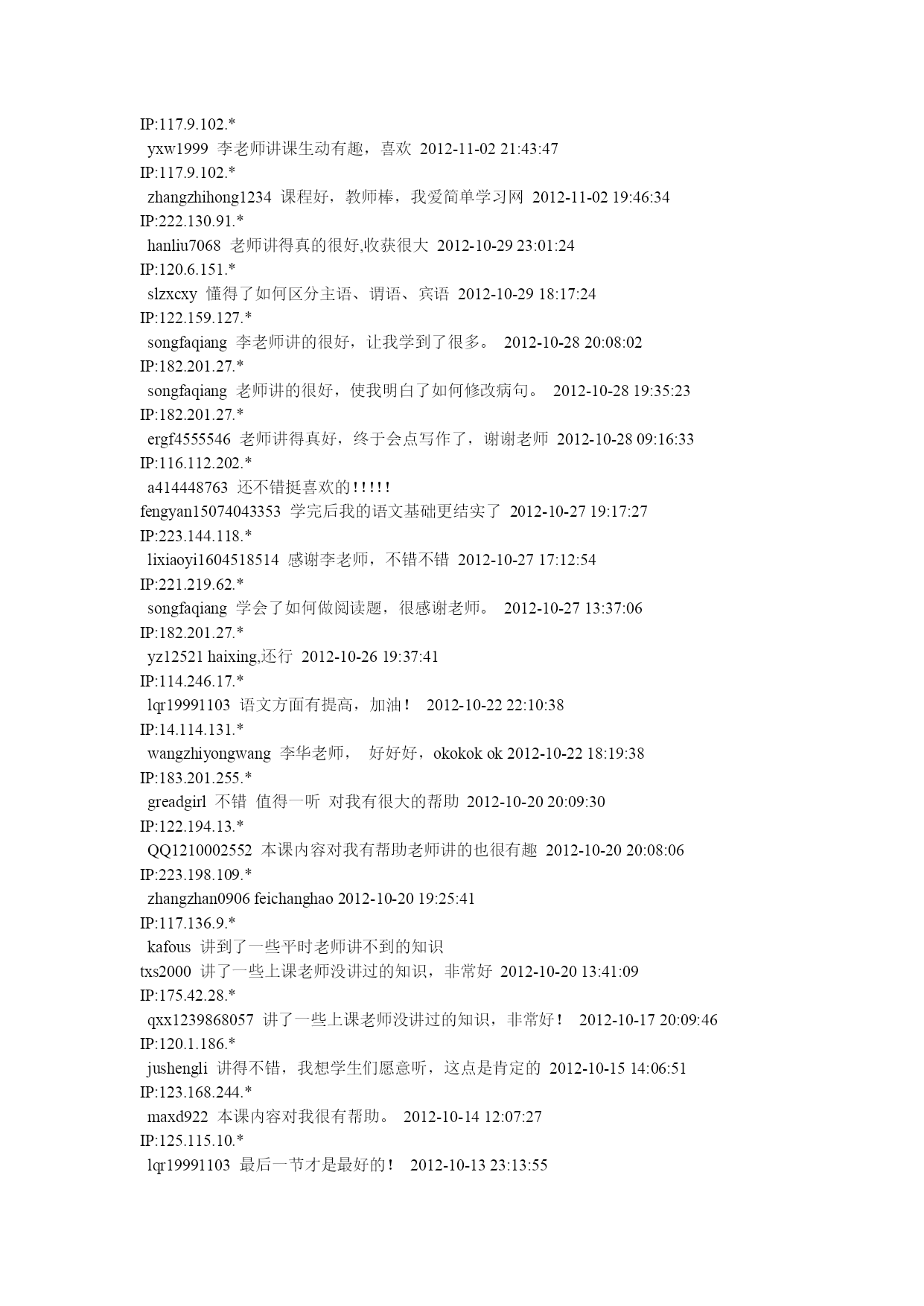 初一语文同步复习课yt1256347585能把学过的知识在复习一遍,让自己记得更深刻,老师讲的可真verygood2012-11-1921:55:37IP:118.77.78.*zhaocongrui读文章要抓住线锁索。2012-11-1820:04:30IP:114.244.254.*lhszdcx好好好好好好好好好好好2012-11-1815:51:56IP:222.60.202.*liweiyong老师讲得太快了,有些跟不上。。。。。。所以只好听两遍了.......2012-11-1815:12:43IP:113.0.31.*YY3163777老师讲的很细,很令人受益2012-11-1811:23:46IP:119.116.11.*zlpwsq168老师的讲解清晰,让我明白了该怎样判断六要素,还让我明白了六要素并不是一定要面面俱到的。2012-11-1721:38:56IP:123.147.249.*chenzhaolun老师讲风得趣,但有些还没听懂。2012-11-1714:29:44IP:124.231.191.*AOMIZ老师讲的很透彻,有很大收获。2012-11-1620:56:51IP:123.183.223.*ma975443684真好,我很喜欢,还想再听2012-11-1013:08:40IP:117.72.143.*swhwtwgoodgoodgoosgoosnanchenyan听懂了病句该怎样修改2012-11-0908:53:44IP:110.98.149.*judy20000518学到了做阅读的技巧,老师的课能把我吸引住2012-11-0722:50:16IP:111.192.12.*wyz2256对,我也认为讲课本上的就更好了,老师讲得很不错2012-11-0711:37:52IP:42.228.5.*liuyuhan01很好,但要是讲课本就更好了。2012-11-0522:26:46IP:110.7.13.*Allex0103老师讲得挺好,我顶。2012-11-0420:13:50IP:122.70.201.*ljw2002学到了学校老师没讲到的知识,课本知识与课外知相结合且清晰2012-11-0420:06:02IP:120.84.15.*jiandan220老师讲得很好,但是多讲一些课本上的一些就更好了,这就是美中不足之处2012-11-0413:54:55IP:114.241.19.*qj60421140课程好,教师棒,我爱简单学习网2012-11-0317:27:19IP:1.203.41.*W1197817037有所提高啊啊啊peterhu非常满意,老师非常好2012-11-0312:51:28IP:125.39.117.*yxw1999老师讲得真的很好,收获很大2012-11-0222:40:41IP:117.9.102.*yxw1999李老师讲课生动有趣,喜欢2012-11-0221:43:47IP:117.9.102.*zhangzhihong1234课程好,教师棒,我爱简单学习网2012-11-0219:46:34IP:222.130.91.*hanliu7068老师讲得真的很好,收获很大2012-10-2923:01:24IP:120.6.151.*slzxcxy懂得了如何区分主语、谓语、宾语2012-10-2918:17:24IP:122.159.127.*songfaqiang李老师讲的很好,让我学到了很多。2012-10-2820:08:02IP:182.201.27.*songfaqiang老师讲的很好,使我明白了如何修改病句。2012-10-2819:35:23IP:182.201.27.*ergf4555546老师讲得真好,终于会点写作了,谢谢老师2012-10-2809:16:33IP:116.112.202.*a414448763还不错挺喜欢的!!!!!fengyan15074043353学完后我的语文基础更结实了2012-10-2719:17:27IP:223.144.118.*lixiaoyi1604518514感谢李老师,不错不错2012-10-2717:12:54IP:221.219.62.*songfaqiang学会了如何做阅读题,很感谢老师。2012-10-2713:37:06IP:182.201.27.*yz12521haixing,还行2012-10-2619:37:41IP:114.246.17.*lqr19991103语文方面有提高,加油!2012-10-2222:10:38IP:14.114.131.*wangzhiyongwang李华老师,好好好,okokokok2012-10-2218:19:38IP:183.201.255.*gre