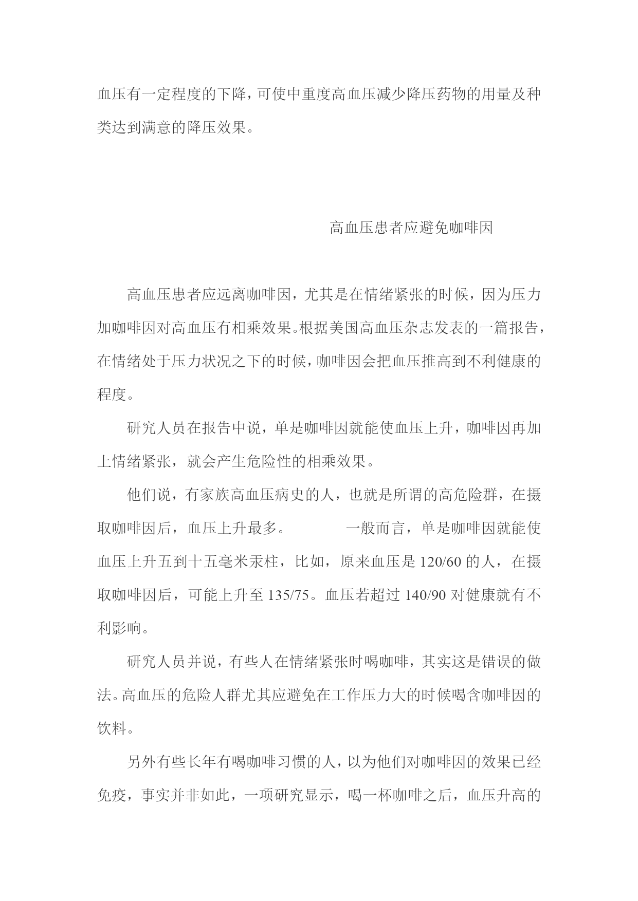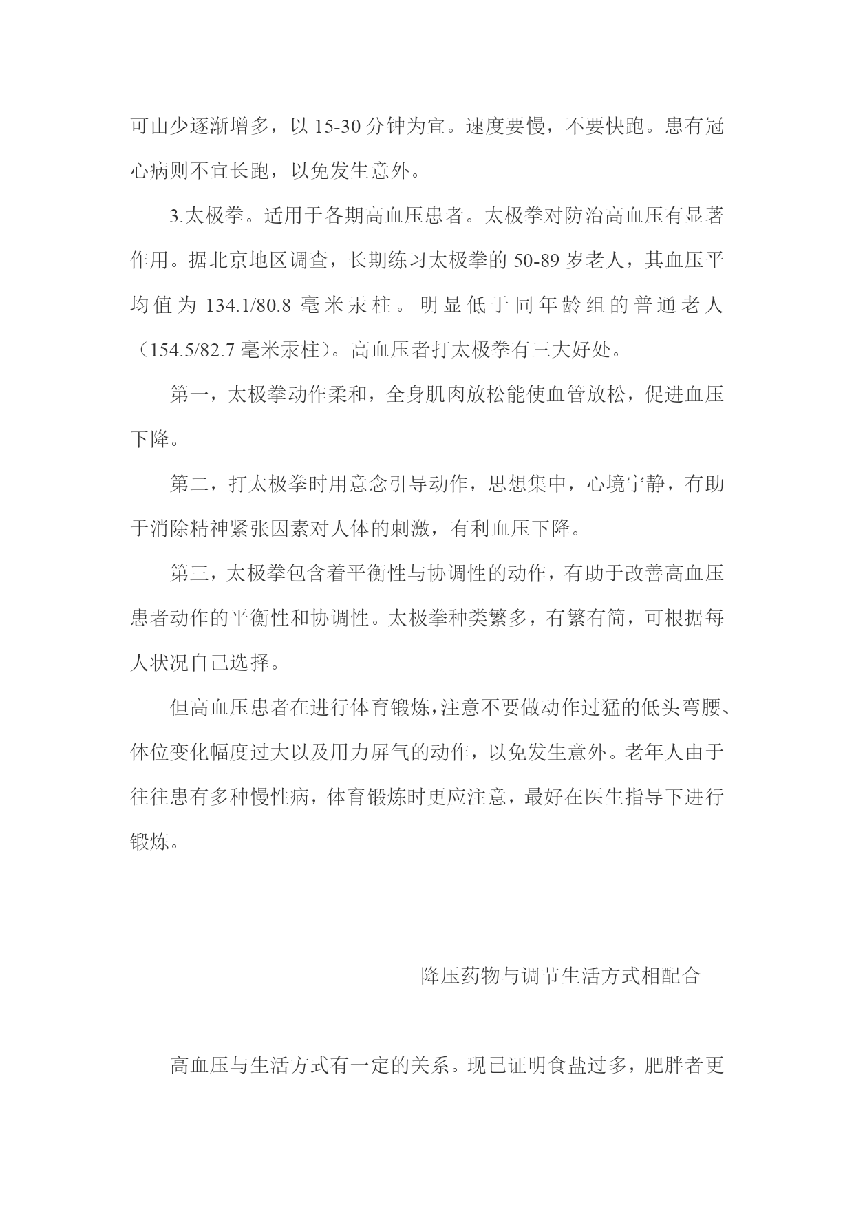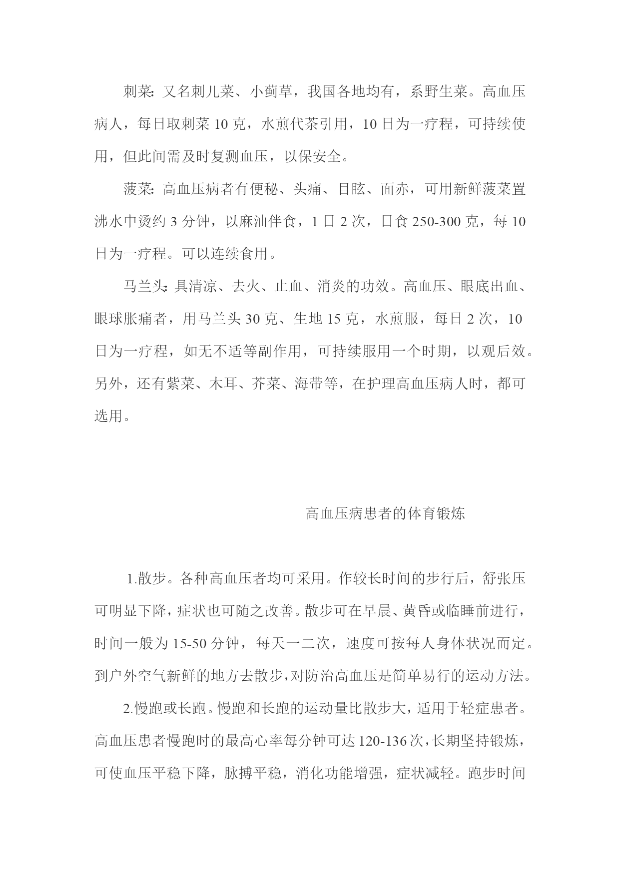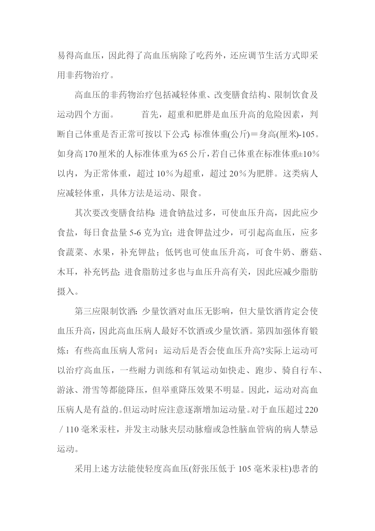 其实在高血压的早期,只要通过饮食调节和运动是可以预防疾病的继续发展的,这样就不一定要通过药物治疗了。高血压病的食物选择要点1.控制热能,控制主食及脂肪摄入量,尽量少吃或不吃糖果点心、甜饮料、油炸食品等高热能食品。2.减少烹调用盐量,尽量少吃酱菜等盐腌类食品。3.少吃肥肉及各种动物性油脂,控制动物脑子、鱼籽等高胆固醇食物。食用油尽量选用豆油、花生油、葵花子油等植物油。4.多吃一些蔬菜、水果,尤其是深色蔬菜。5.适当增加海产品摄入,如海带、紫菜、海产鱼类等。哪些蔬菜有利于降压荠菜:初春采其幼苗作菜食用,清香可口。凡高血压、眼底出血的病人,用蕺菜花15克、旱墨莲12克,水煎服,1日3次,连服15日为一疗程。请医生复测血压,如未降可继续服一个疗程;若血压已有明显下降,可酌情减服,每日2次,每次量略减少。莼菜:以江苏太湖、杭州西湖所产为佳。在动物实验中,其粘液质部分有抗癌和降血压的作用。患高血压者,每日取新鲜莼菜50克,加冰糖食粮炖服,10日为一疗程,可连续服用。刺菜:又名刺儿菜、小蓟草,我国各地均有,系野生菜。高血压病人,每日取刺菜10克,水煎代茶引用,10日为一疗程,可持续使用,但此间需及时复测血压,以保安全。菠菜:高血压病者有便秘、头痛、目眩、面赤,可用新鲜菠菜置沸水中烫约3分钟,以麻油伴食,1日2次,日食250-300克,每10日为一疗程。可以连续食用。马兰头:具清凉、去火、止血、消炎的功效。高血压、眼底出血、眼球胀痛者,用马兰头30克、生地15克,水煎服,每日2次,10日为一疗程,如无不适等副作用,可持续服用一个时期,以观后效。另外,还有紫菜、木耳、芥菜、海带等,在护理高血压病人时,都可选用。高血压病患者的体育锻炼1.散步。各种高血压者均可采用。作较长时间的步行后,舒张压可明显下降,症状也可随之改善。散步可在早晨、黄昏或临睡前进行,时间一般为15-50分钟,每天一二次,速度可按每人身体状况而定。到户外空气新鲜的地方去散步,对防治高血压是简单易行的运动方法。2.慢跑或长跑。慢跑和长跑的运动量比散步大,适用于轻症患者。高血压患者慢跑时的最高心率每分钟可达120-136次,长期坚持锻炼,可使血压平稳下降,脉搏平稳,消化功能增强,症状减轻。跑步时间可由少逐渐增多,以15-30分钟为宜。速度要慢,不要快跑。患有冠心病则不宜长跑,以免发生意外。3.太极拳。适用于各期高血压患者。太极拳对防治高血压有显著作用。据北京地区调查,长期练习太极拳的50-89岁老人,其血压平均值为134.1/80.8毫米汞柱。明显低于同年龄组的普通老人(154.5/82.7毫米汞柱)。高血压者打太极拳有三大好处。第一,太极拳动作柔和,全身肌肉放松能使血管放松,促进血压下降。第二,打太极拳时用意念引导动作,思想集中,心境宁静,有助于消除精神紧张因素对人体的刺激,有利血压下降。第三,太极拳包含着平衡性与协调性的动作,有助于改善高血压患者动作的平衡性和协调性。太极拳种类繁多,有繁有简,可根据每人状况自己选择。但高血压患者在进行体育锻炼,注意不要做动作过猛的低头弯腰、体位变化幅度过大以及用力屏气的动作,以免发生意外。老年人由于往往患有多种慢性病,体育锻炼时更应注意,最好在医生指导下进行锻炼。降压药物与调节生活方式相配合高血压与生活方式有一定的关系。现已证明食盐过多,肥胖者更易得高血压,因此得了高血压病除了吃药外,还应调节生活方式即采用非药物治疗。高血压的非药物治疗包括减轻体重、改变膳食结构、限制饮食及运动四个方面。首先,超重和肥胖是血压升高的危险因素,判断自己体重是否正常可按以下公式:标准体重(公斤)=身高(厘米)-105。如身高170厘米的人标准体重为65公斤,若自己体重在标准体重±10%以内,为正常体重,超过10%为超重,超过20%为肥胖。这类病人应减轻体重,具体方法是运动、限食。其次要改变膳食结构:进食钠盐过多,可使血压升高,因此应少食盐,每日食盐量5-6克为宜;进食钾盐过少,可引起高血压,应多食蔬菜、水果,补充钾盐;低钙也可使血压升高,可食牛奶、蘑菇、木耳,补充钙盐;进食脂肪过多也与血压升高有关,因此应减少脂肪摄入。第三应限制饮酒:少量饮酒对血压无影响,但大量饮酒肯定会使血压升高,因此高血压病人最好不饮酒或少量饮酒。第四加强体育锻炼:有些高血压病人常问:运动后是否会使血压升高?实际上运动可以治疗高血压,一些耐力训练和有氧运动如快走、跑步、骑自行车、游泳、滑雪等都能降压,但举重降压效果不明显。因此,运动对高血压病人是有益的。但运动时应注意逐渐增加运动量。对于血压超过220/110毫米汞柱,并发主动脉夹层动脉瘤或急性脑血管病的病人禁忌运动。采用上述方法能使轻度高血压(舒张压低于105毫米汞柱)患者的血压有一定程度的下降,可使中重度高血压减少降压药物的用量及种类达到满意的