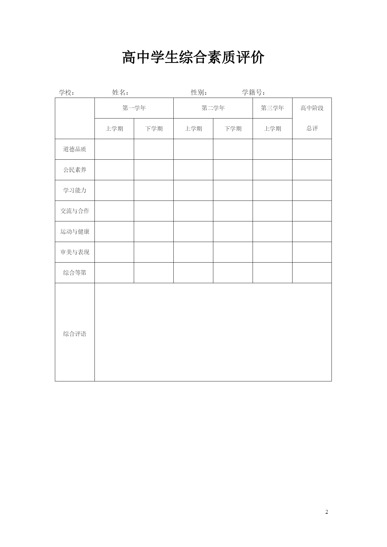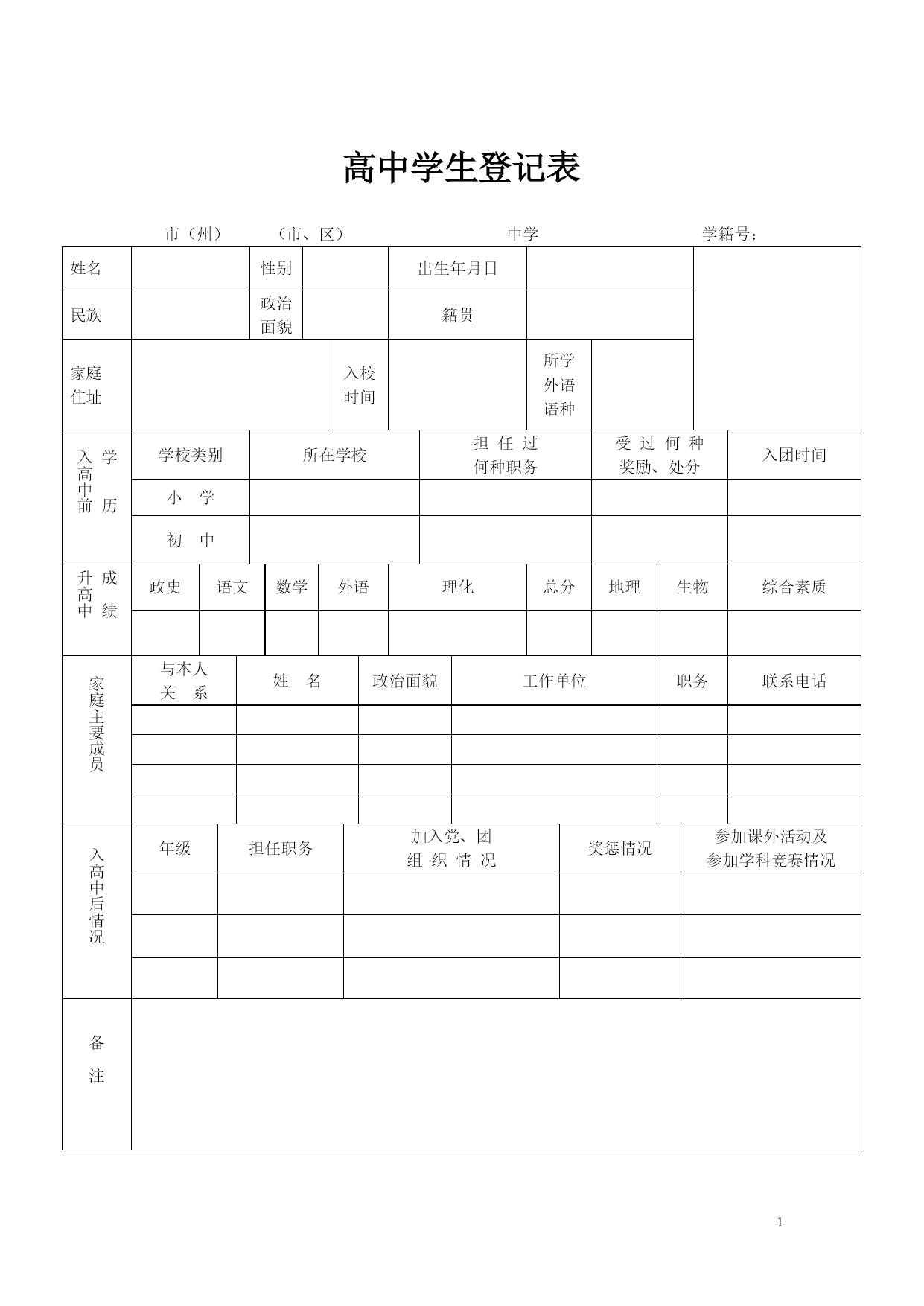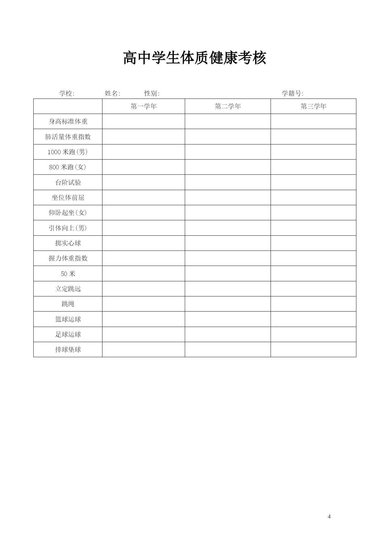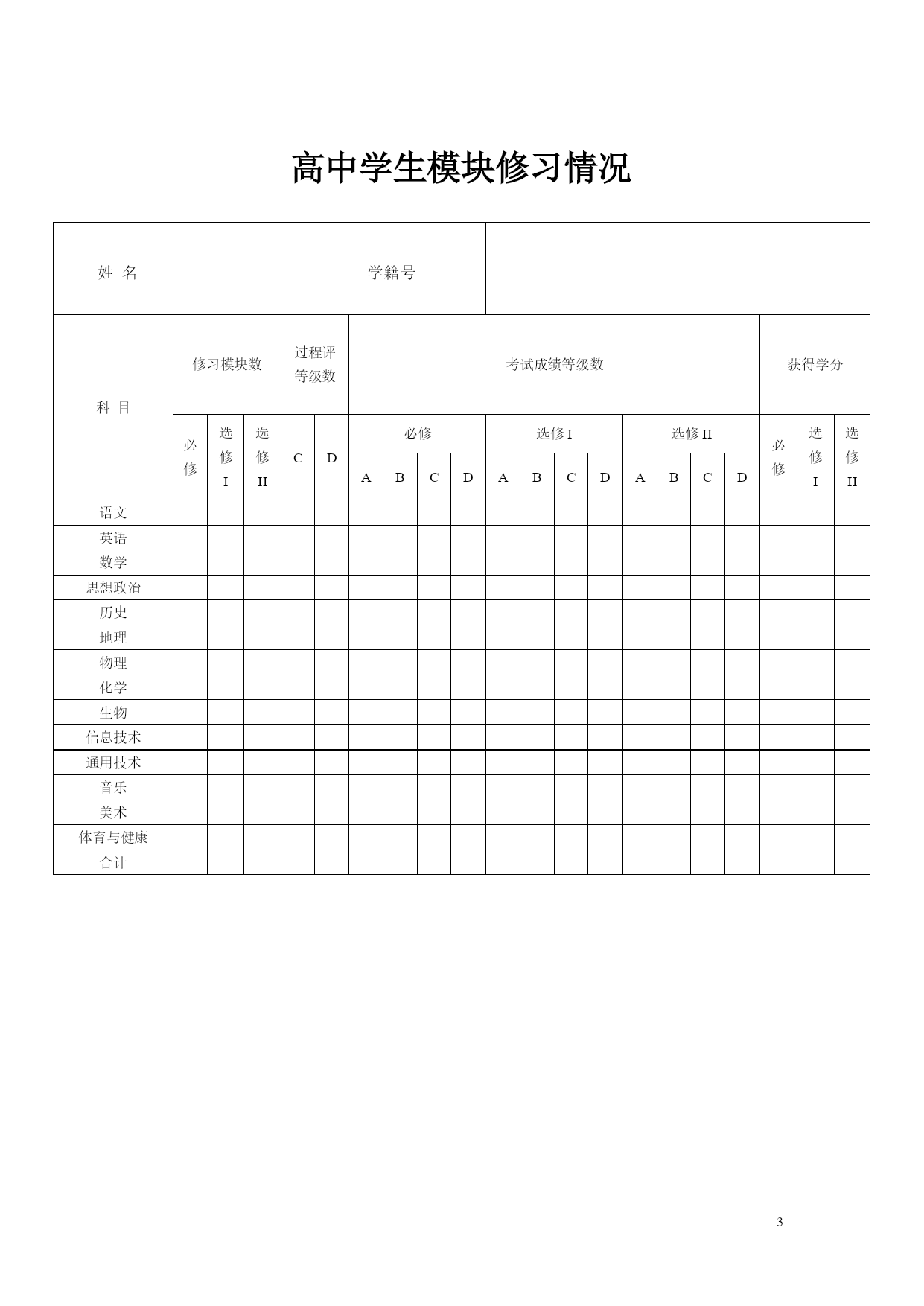 高中学生登记表市(州)(市、区)中学学籍号:姓名性别出生年月日民族政治面貌籍贯家庭住址入校时间所学外语语种学历入高中前学校类别所在学校担任过何种职务受过何种奖励、处分入团时间小学初中成绩升高中政史语文数学外语理化总分地理生物综合素质家庭主要成员与本人关系姓名政治面貌工作单位职务联系电话入高中后情况年级担任职务加入党、团组织情况奖惩情况参加课外活动及参加学科竞赛情况备注高中学生综合素质评价学校:姓名:性别:学籍号:第一学年第二学年第三学年高中阶段总评上学期下学期上学期下学期上学期道德品质公民素养学习能力交流与合作运动与健康审美与表现综合等第综合评语高中学生模块修习情况姓名学籍号科目修习模块数过程评等级数考试成绩等级数获得学分必修选修=1\*ROMANI选修=2\*ROMANIICD必修选修=1\*ROMANI选修=2\*ROMANII必修选修=1\*ROMANI选修=2\*ROMANIIABCDABCDABCD语文英语数学思想政治历史地理物理化学生物信息技术通用技术音乐美术体育与健康合计高中学生体质健康考核学校:姓名:性别:学籍号:第一学年第二学年第三学年身高标准体重肺活量体重指数1000米跑(男)800米跑(女)台阶试验坐位体前屈仰卧起坐(女)引体向上(男)掷实心球握力体重指数50米立定跳远跳绳篮球运球足球运球排球垫球