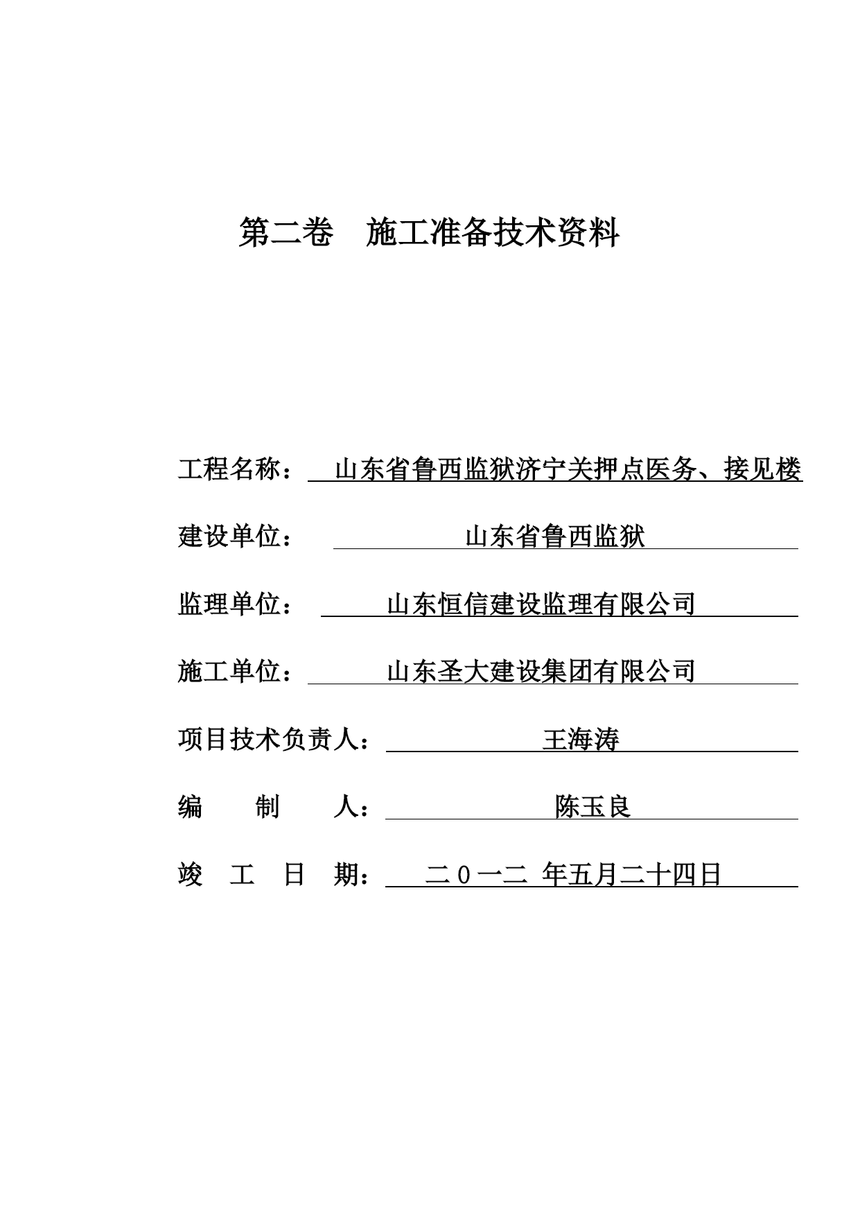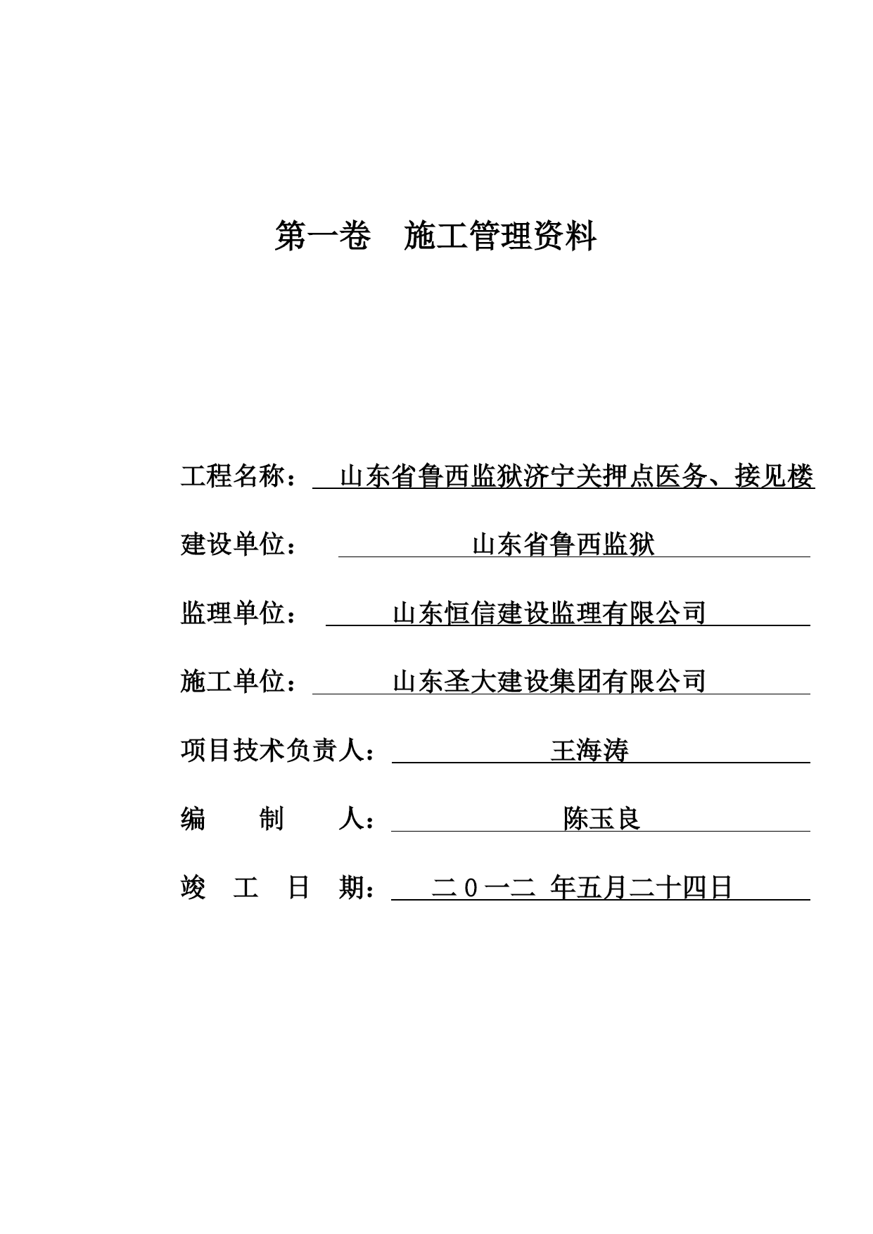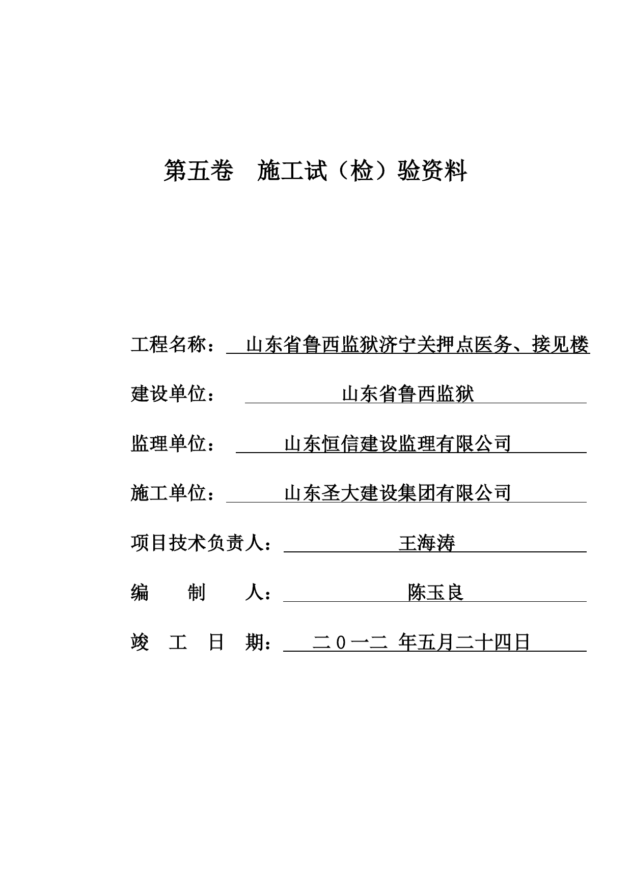 第一卷施工管理资料工程名称:山东省鲁西监狱济宁关押点医务、接见楼建设单位:山东省鲁西监狱监理单位:山东恒信建设监理有限公司施工单位:山东圣大建设集团有限公司项目技术负责人:王海涛编制人:陈玉良竣工日期:二0一二年五月二十四日第二卷施工准备技术资料工程名称:山东省鲁西监狱济宁关押点医务、接见楼建设单位:山东省鲁西监狱监理单位:山东恒信建设监理有限公司施工单位:山东圣大建设集团有限公司项目技术负责人:王海涛编制人:陈玉良竣工日期:二0一二年五月二十四日第三卷施工测量记录工程名称:山东省鲁西监狱济宁关押点医务、接见楼建设单位:山东省鲁西监狱监理单位:山东恒信建设监理有限公司施工单位:山东圣大建设集团有限公司项目技术负责人:王海涛编制人:陈玉良竣工日期:二0一二年五月二十四日第四卷施工物资资料工程名称:山东省鲁西监狱济宁关押点医务、接见楼建设单位:山东省鲁西监狱监理单位:山东恒信建设监理有限公司施工单位:山东圣大建设集团有限公司项目技术负责人:王海涛编制人:陈玉良竣工日期:二0一二年五月二十四日第五卷施工试(检)验资料工程名称:山东省鲁西监狱济宁关押点医务、接见楼建设单位:山东省鲁西监狱监理单位:山东恒信建设监理有限公司施工单位:山东圣大建设集团有限公司项目技术负责人:王海涛编制人:陈玉良竣工日期:二0一二年五月二十四日第六卷施工过程记录工程名称:山东省鲁西监狱济宁关押点医务、接见楼建设单位:山东省鲁西监狱监理单位:山东恒信建设监理有限公司施工单位:山东圣大建设集团有限公司项目技术负责人:王海涛编制人:陈玉良竣工日期:二0一二年五月二十四日第七卷地基与基础分部工程质量验收资料工程名称:山东省鲁西监狱济宁关押点医务、接见楼建设单位:山东省鲁西监狱监理单位:山东恒信建设监理有限公司施工单位:山东圣大建设集团有限公司项目技术负责人:王海涛编制人:陈玉良竣工日期:二0一二年五月二十四日第八卷主体结构工程质量验收资料工程名称:山东省鲁西监狱济宁关押点医务、接见楼建设单位:山东省鲁西监狱监理单位:山东恒信建设监理有限公司施工单位:山东圣大建设集团有限公司项目技术负责人:王海涛编制人:陈玉良竣工日期:二0一二年五月二十四日第九卷装饰装修工程质量验收资料工程名称:山东省鲁西监狱济宁关押点医务、接见楼建设单位:山东省鲁西监狱监理单位:山东恒信建设监理有限公司施工单位:山东圣大建设集团有限公司项目技术负责人:王海涛编制人:陈玉良竣工日期:二0一二年五月二十四日第十卷屋面工程工程质量验收资料工程名称:山东省鲁西监狱济宁关押点医务、接见楼建设单位:山东省鲁西监狱监理单位:山东恒信建设监理有限公司施工单位:山东圣大建设集团有限公司项目技术负责人:王海涛编制人:陈玉良竣工日期:二0一二年五月二十四日第十七卷建筑给排水及采暖工程施工技术资料工程名称:山东省鲁西监狱济宁关押点医务、接见楼建设单位:山东省鲁西监狱监理单位:山东恒信建设监理有限公司施工单位:山东圣大建设集团有限公司项目技术负责人:王海涛编制人:陈玉良竣工日期:二0一二年五月二十四日第十八卷建筑给排水及采暖工程施工质量验收资料工程名称:山东省鲁西监狱济宁关押点医务、接见楼建设单位:山东省鲁西监狱监理单位:山东恒信建设监理有限公司施工单位:山东圣大建设集团有限公司项目技术负责人:王海涛编制人:陈玉良竣工日期:二0一二年五月二十四日第十九卷建筑电气工程施工技术资料工程名称:山东省鲁西监狱济宁关押点医务、接见楼建设单位:山东省鲁西监狱监理单位:山东恒信建设监理有限公司施工单位:山东圣大建设集团有限公司项目技术负责人:王海涛编制人:陈玉良竣工日期:二0一二年五月二十四日第二十卷建筑电气工程施工质量验收资料工程名称:山东省鲁西监狱济宁关押点医务、接见楼建设单位:山东省鲁西监狱监理单位:山东恒信建设监理有限公司施工单位:山东圣大建设集团有限公司项目技术负责人:王海涛编制人:陈玉良竣工日期:二0一二年五月二十四日