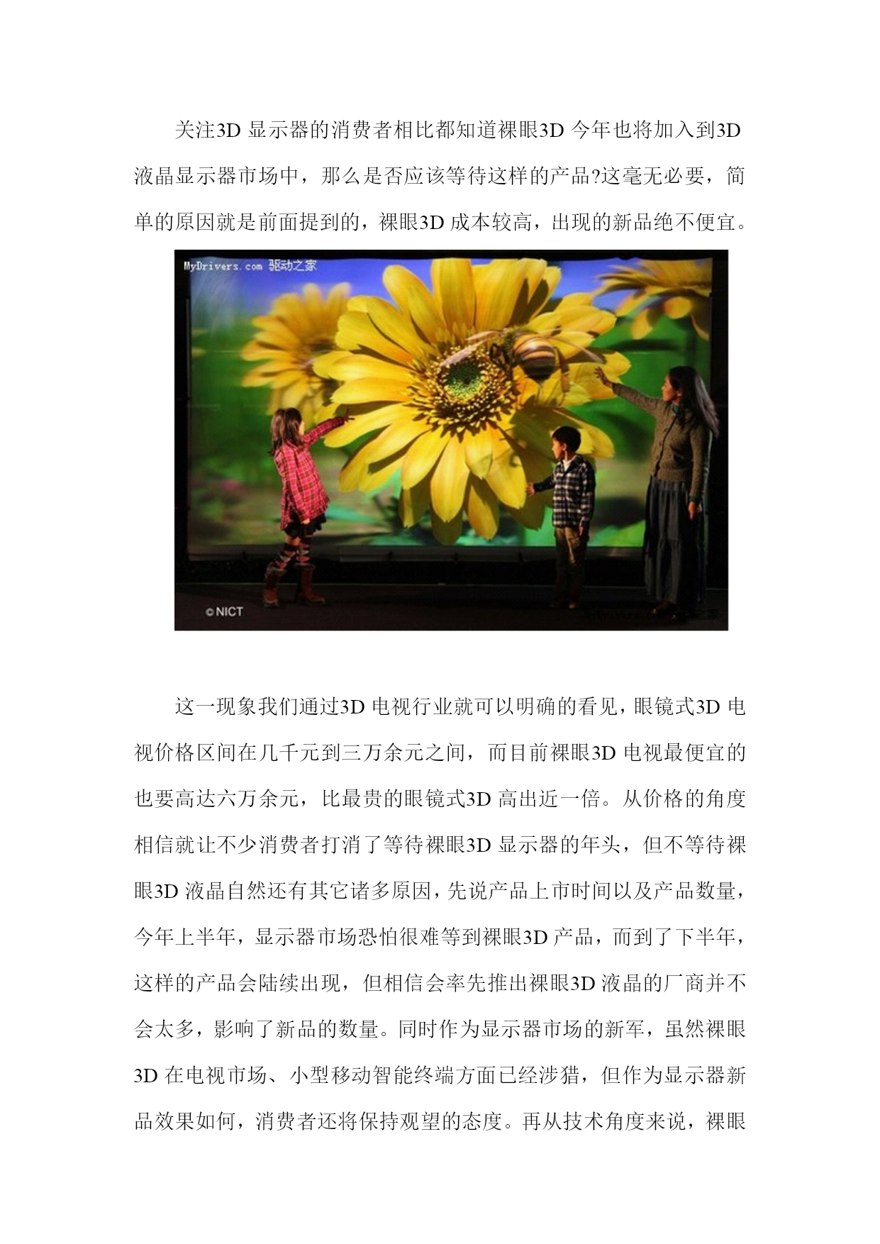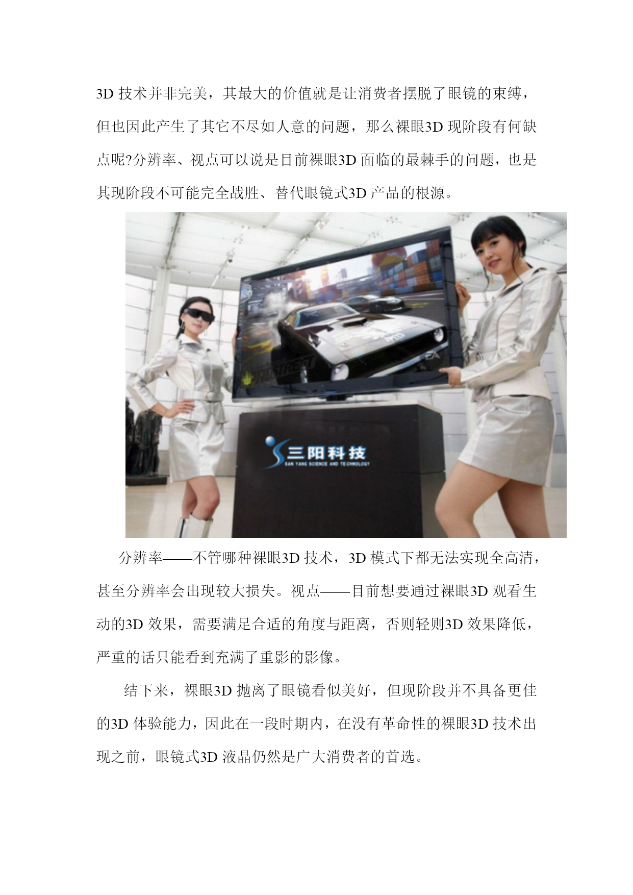 3D显示器市场环境分析导读:对于IT市场,通常在三、四月份就会有一批新品面市,同时在节后,经销商面临着货源囤积以及新品推出的压力,因此近期显示器产品肯定会有一个不错的价位。据悉,3D显示技术相比以往并不会有一个质的飞跃,并且新品上市对于IT市场,通常在三、四月份就会有一批新品面市,同时在节后,经销商面临着货源囤积以及新品推出的压力,因此近期显示器产品肯定会有一个不错的价位。据悉,3D显示技术相比以往并不会有一个质的飞跃,并且新品上市价格也较为虚高,因此消费者要现在购买3D液晶显示器并不会吃亏,还能早买早享受。关注3D显示器的消费者相比都知道裸眼3D今年也将加入到3D液晶显示器市场中,那么是否应该等待这样的产品?这毫无必要,简单的原因就是前面提到的,裸眼3D成本较高,出现的新品绝不便宜。这一现象我们通过3D电视行业就可以明确的看见,眼镜式3D电视价格区间在几千元到三万余元之间,而目前裸眼3D电视最便宜的也要高达六万余元,比最贵的眼镜式3D高出近一倍。从价格的角度相信就让不少消费者打消了等待裸眼3D显示器的年头,但不等待裸眼3D液晶自然还有其它诸多原因,先说产品上市时间以及产品数量,今年上半年,显示器市场恐怕很难等到裸眼3D产品,而到了下半年,这样的产品会陆续出现,但相信会率先推出裸眼3D液晶的厂商并不会太多,影响了新品的数量。同时作为显示器市场的新军,虽然裸眼3D在电视市场、小型移动智能终端方面已经涉猎,但作为显示器新品效果如何,消费者还将保持观望的态度。再从技术角度来说,裸眼3D技术并非完美,其最大的价值就是让消费者摆脱了眼镜的束缚,但也因此产生了其它不尽如人意的问题,那么裸眼3D现阶段有何缺点呢?分辨率、视点可以说是目前裸眼3D面临的最棘手的问题,也是其现阶段不可能完全战胜、替代眼镜式3D产品的根源。分辨率——不管哪种裸眼3D技术,3D模式下都无法实现全高清,甚至分辨率会出现较大损失。视点——目前想要通过裸眼3D观看生动的3D效果,需要满足合适的角度与距离,否则轻则3D效果降低,严重的话只能看到充满了重影的影像。结下来,裸眼3D抛离了眼镜看似美好,但现阶段并不具备更佳的3D体验能力,因此在一段时期内,在没有革命性的裸眼3D技术出现之前,眼镜式3D液晶仍然是广大消费者的首选。河南三阳光电有限公司QQ:893123050电话:0392-3213100传真:0392-3213123手机:15517899006邮箱:HYPERLINK"mailto:893123050@qq.com"893123050@qq.com网址:www.sanyangkeji.com