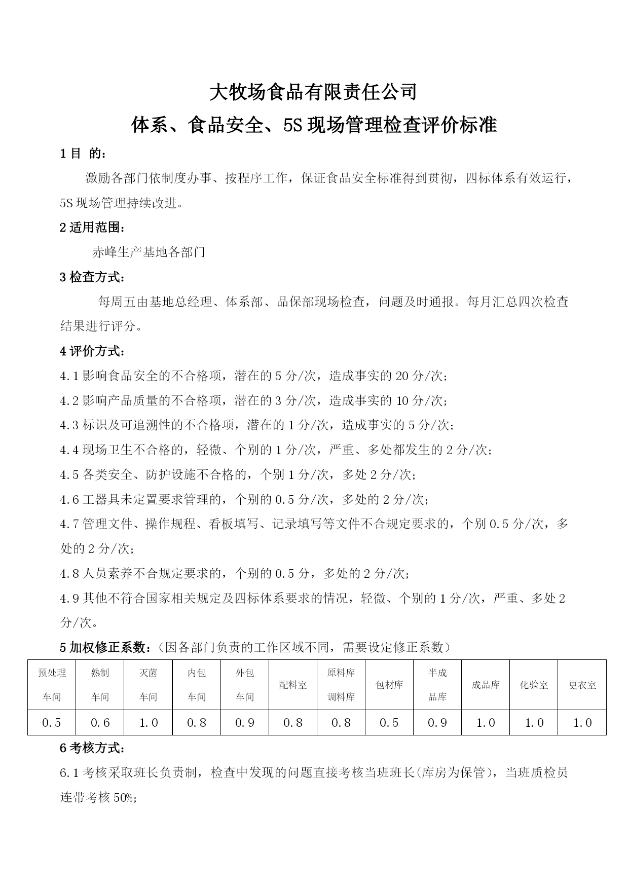 大牧场食品有限责任公司体系、食品安全、5S现场管理检查评价标准1目的:激励各部门依制度办事、按程序工作,保证食品安全标准得到贯彻,四标体系有效运行,5S现场管理持续改进。2适用范围:赤峰生产基地各部门3检查方式:每周五由基地总经理、体系部、品保部现场检查,问题及时通报。每月汇总四次检查结果进行评分。4评价方式:4.1影响食品安全的不合格项,潜在的5分/次,造成事实的20分/次;4.2影响产品质量的不合格项,潜在的3分/次,造成事实的10分/次;4.3标识及可追溯性的不合格项,潜在的1分/次,造成事实的5分/次;4.4现场卫生不合格的,轻微、个别的1分/次,严重、多处都发生的2分/次;4.5各类安全、防护设施不合格的,个别1分/次,多处2分/次;4.6工器具未定置要求管理的,个别的0.5分/次,多处的2分/次;4.7管理文件、操作规程、看板填写、记录填写等文件不合规定要求的,个别0.5分/次,多处的2分/次;4.8人员素养不合规定要求的,个别的0.5分,多处的2分/次;4.9其他不符合国家相关规定及四标体系要求的情况,轻微、个别的1分/次,严重、多处2分/次。5加权修正系数:(因各部门负责的工作区域不同,需要设定修正系数)预处理车间熟制车间灭菌车间内包车间外包车间配料室原料库调料库包材库半成品库成品库化验室更衣室0.50.61.00.80.90.80.80.50.91.01.01.06考核方式:6.1考核采取班长负责制,检查中发现的问题直接考核当班班长(库房为保管),当班质检员连带考核50%;6.2每周检查一次,检查结果每周汇总后公布结果;6.3每月月底汇总本月4周检查发现的问题,进行评分;6.4每月第一次检查发现的问题,第二次检查仍未整改的翻倍考核,第三次在第二次的基础上再翻倍,以此类推;6.5每扣1分,考核5元钱,在当月工资中兑现。品控管理中心二O一二年六月二十日