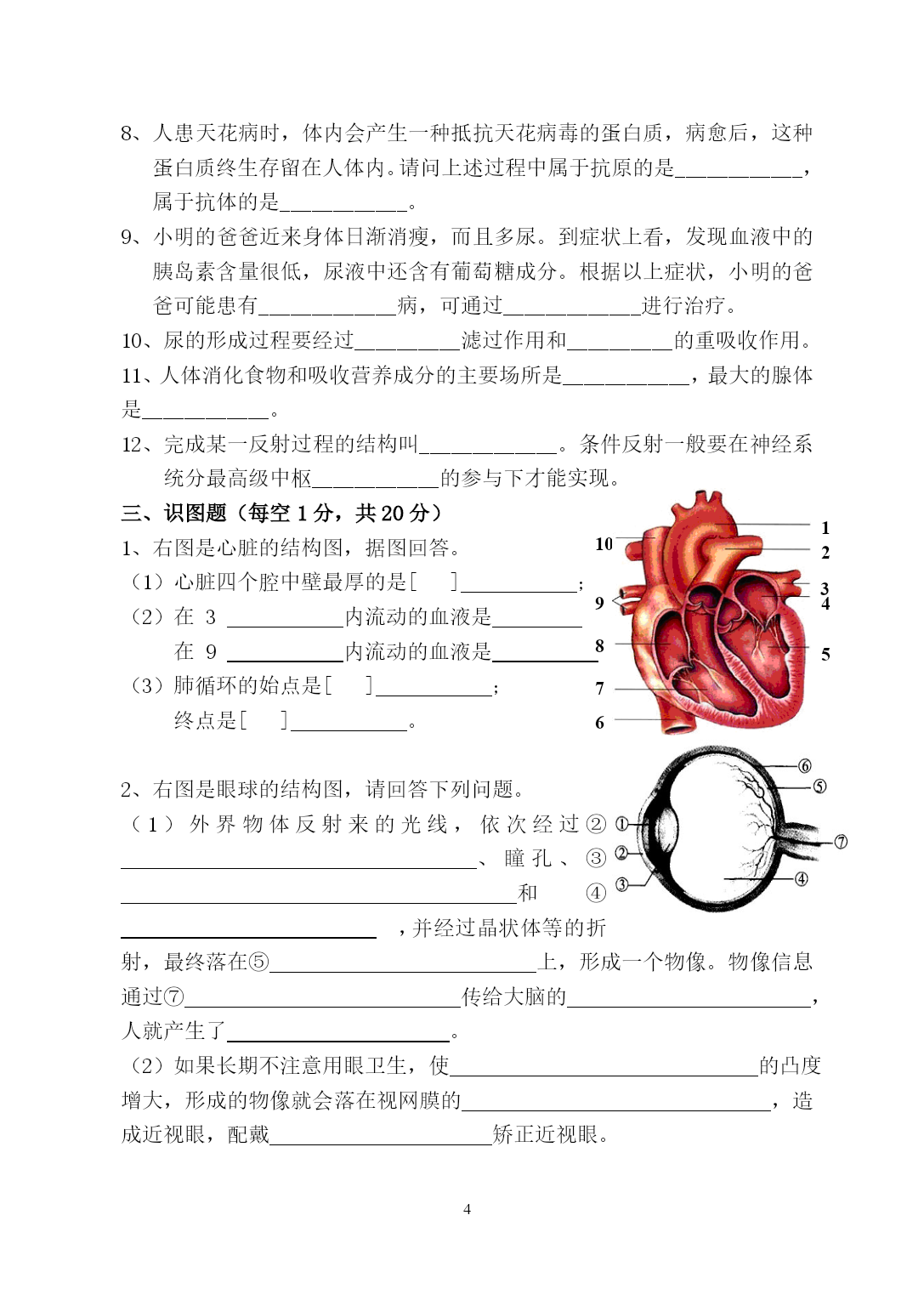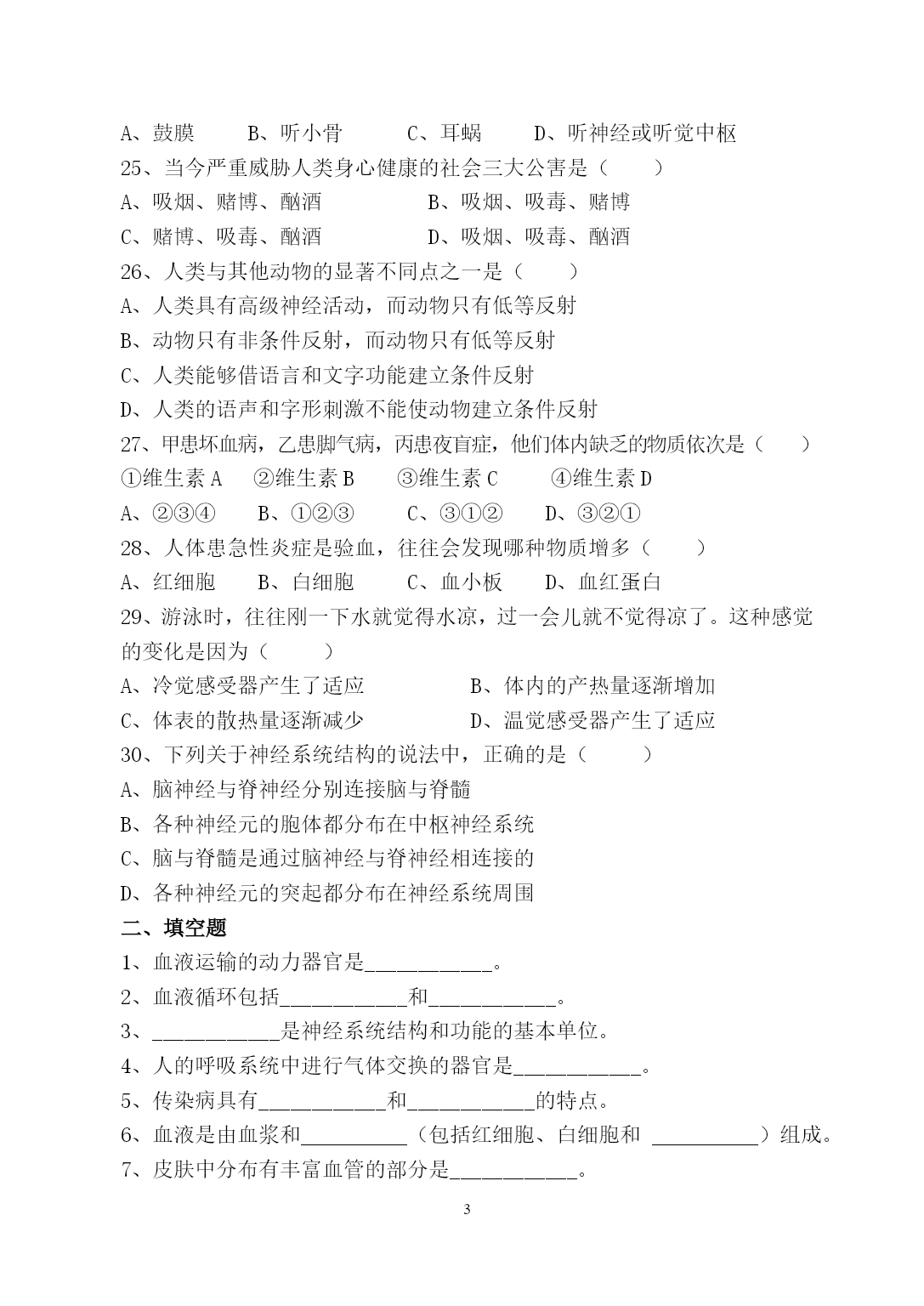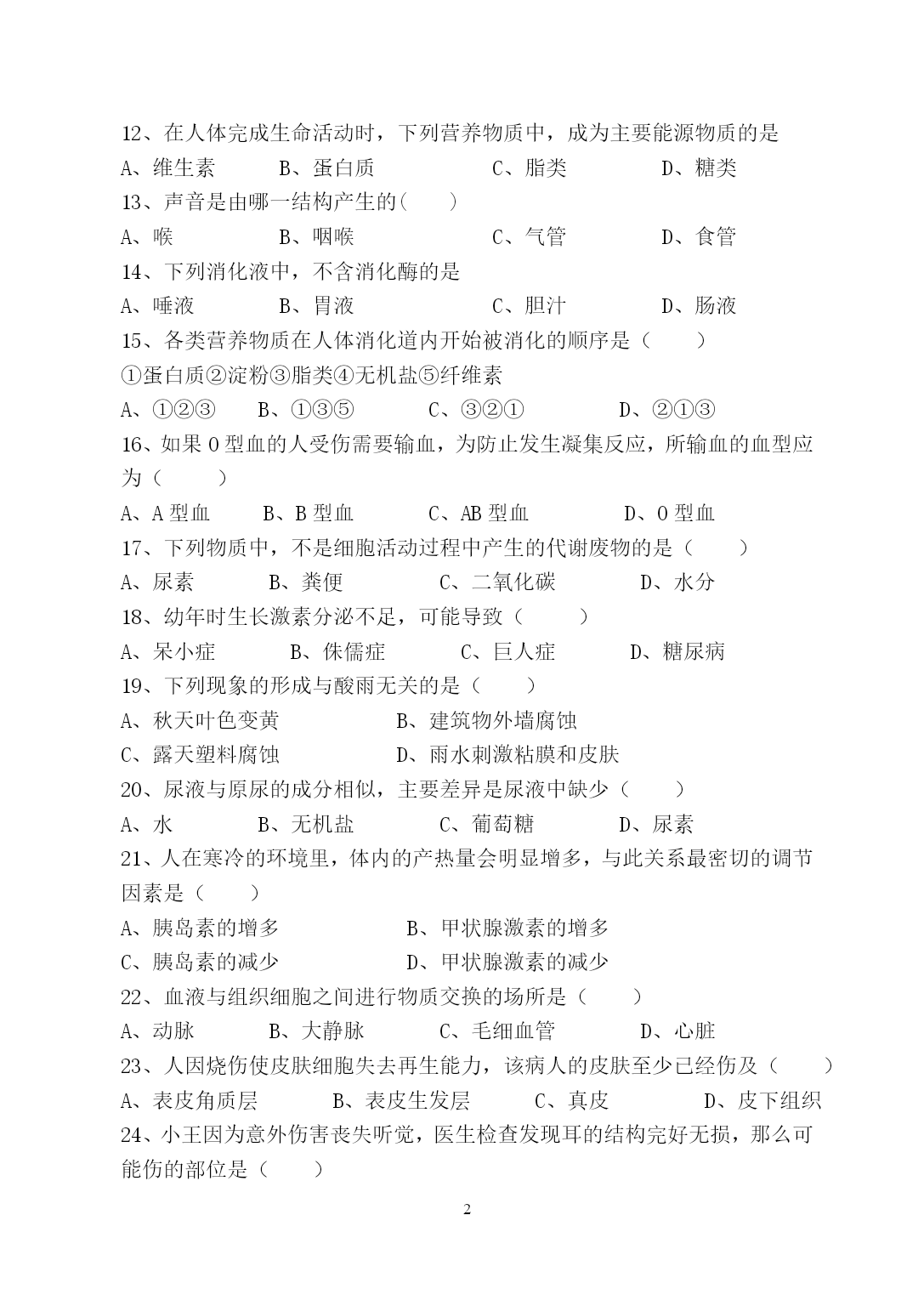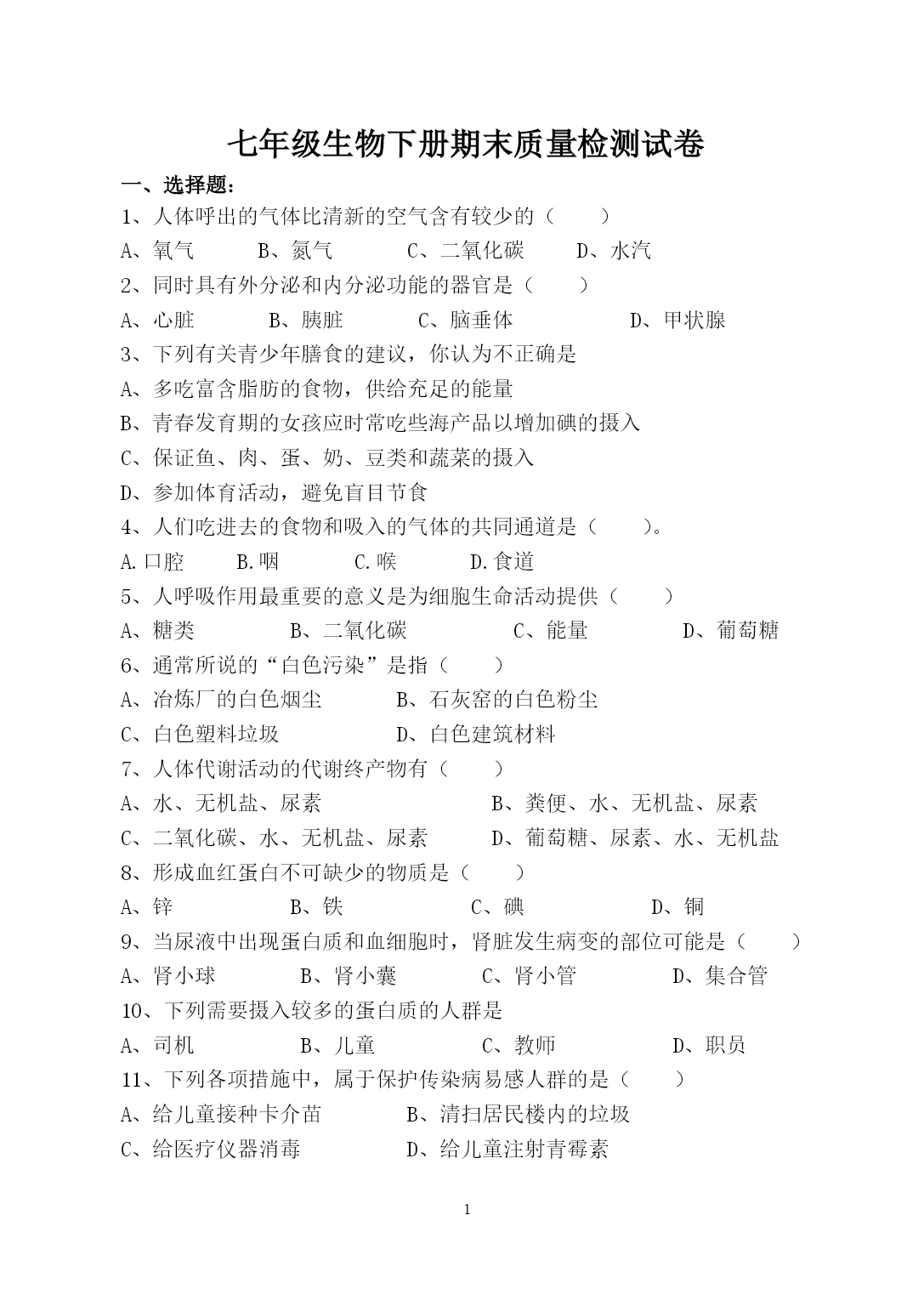 七年级生物下册期末质量检测试卷一、选择题:1、人体呼出的气体比清新的空气含有较少的()A、氧气B、氮气C、二氧化碳D、水汽2、同时具有外分泌和内分泌功能的器官是()A、心脏B、胰脏C、脑垂体D、甲状腺3、下列有关青少年膳食的建议,你认为不正确是A、多吃富含脂肪的食物,供给充足的能量B、青春发育期的女孩应时常吃些海产品以增加碘的摄入C、保证鱼、肉、蛋、奶、豆类和蔬菜的摄入D、参加体育活动,避免盲目节食4、人们吃进去的食物和吸入的气体的共同通道是()。A.口腔B.咽C.喉D.食道5、人呼吸作用最重要的意义是为细胞生命活动提供()A、糖类B、二氧化碳C、能量D、葡萄糖6、通常所说的“白色污染”是指()A、冶炼厂的白色烟尘B、石灰窑的白色粉尘C、白色塑料垃圾D、白色建筑材料7、人体代谢活动的代谢终产物有()A、水、无机盐、尿素B、粪便、水、无机盐、尿素C、二氧化碳、水、无机盐、尿素D、葡萄糖、尿素、水、无机盐8、形成血红蛋白不可缺少的物质是()A、锌B、铁C、碘D、铜9、当尿液中出现蛋白质和血细胞时,肾脏发生病变的部位可能是()A、肾小球B、肾小囊C、肾小管D、集合管10、下列需要摄入较多的蛋白质的人群是A、司机B、儿童C、教师D、职员11、下列各项措施中,属于保护传染病易感人群的是()A、给儿童接种卡介苗B、清扫居民楼内的垃圾C、给医疗仪器消毒D、给儿童注射青霉素12、在人体完成生命活动时,下列营养物质中,成为主要能源物质的是A、维生素B、蛋白质C、脂类D、糖类13、声音是由哪一结构产生的()A、喉B、咽喉C、气管D、食管14、下列消化液中,不含消化酶的是A、唾液B、胃液C、胆汁D、肠液15、各类营养物质在人体消化道内开始被消化的顺序是()①蛋白质②淀粉③脂类④无机盐⑤纤维素A、①②③B、①③⑤C、③②①D、②①③16、如果O型血的人受伤需要输血,为防止发生凝集反应,所输血的血型应为()A、A型血B、B型血C、AB型血D、O型血17、下列物质中,不是细胞活动过程中产生的代谢废物的是()A、尿素B、粪便C、二氧化碳D、水分18、幼年时生长激素分泌不足,可能导致()A、呆小症B、侏儒症C、巨人症D、糖尿病19、下列现象的形成与酸雨无关的是()A、秋天叶色变黄B、建筑物外墙腐蚀C、露天塑料腐蚀D、雨水刺激粘膜和皮肤20、尿液与原尿的成分相似,主要差异是尿液中缺少()A、水B、无机盐C、葡萄糖D、尿素21、人在寒冷的环境里,体内的产热量会明显增多,与此关系最密切的调节因素是()A、胰岛素的增多B、甲状腺激素的增多C、胰岛素的减少D、甲状腺激素的减少22、血液与组织细胞之间进行物质交换的场所是()A、动脉B、大静脉C、毛细血管D、心脏23、人因烧伤使皮肤细胞失去再生能力,该病人的皮肤至少已经伤及()A、表皮角质层B、表皮生发层C、真皮D、皮下组织24、小王因为意外伤害丧失听觉,医生检查发现耳的结构完好无损,那么可能伤的部位是()A、鼓膜B、听小骨C、耳蜗D、听神经或听觉中枢25、当今严重威胁人类身心健康的社会三大公害是()A、吸烟、赌博、酗酒B、吸烟、吸毒、赌博C、赌博、吸毒、酗酒D、吸烟、吸毒、酗酒26、人类与其他动物的显著不同点之一是()A、人类具有高级神经活动,而动物只有低等反射B、动物只有非条件反射,而动物只有低等反射C、人类能够借语言和文字功能建立条件反射D、人类的语声和字形刺激不能使动物建立条件反射27、甲患坏血病,乙患脚气病,丙患夜盲症,他们体内缺乏的物质依次是()①维生素A②维生素B③维生素C④维生素DA、②③④B、①②③C、③①②D、③②①28、人体患急性炎症是验血,往往会发现哪种物质增多()A、红细胞B、白细胞C、血小板D、血红蛋白29、游泳时,往往刚一下水就觉得水凉,过一会儿就不觉得凉了。这种感觉的变化是因为()A、冷觉感受器产生了适应B、体内的产热量逐渐增加C、体表的散热量逐渐减少D、温觉感受器产生了适应30、下列关于神经系统结构的说法中,正确的是()A、脑神经与脊神经分别连接脑与脊髓B、各种神经元的胞体都分布在中枢神经系统C、脑与脊髓是通过脑神经与脊神经相连接的D、各种神经元的突起都分布在神经系统周围二、填空题1、血液运输的动力器官是____________。2、血液循环包括____________和____________。3、____________是神经系统结构和功能的基本单位。4、人的呼吸系统中进行气体交换的器官是____________。5、传染病具有____________和____________的特点。6、血液是由血浆和(包括红细胞、白细胞和)组成。7、皮肤中分布有丰富血管的部分是____________。8、人患天花病时,体内会产生一种抵抗天花病毒的蛋白质,病愈后,这种蛋白质终生存留