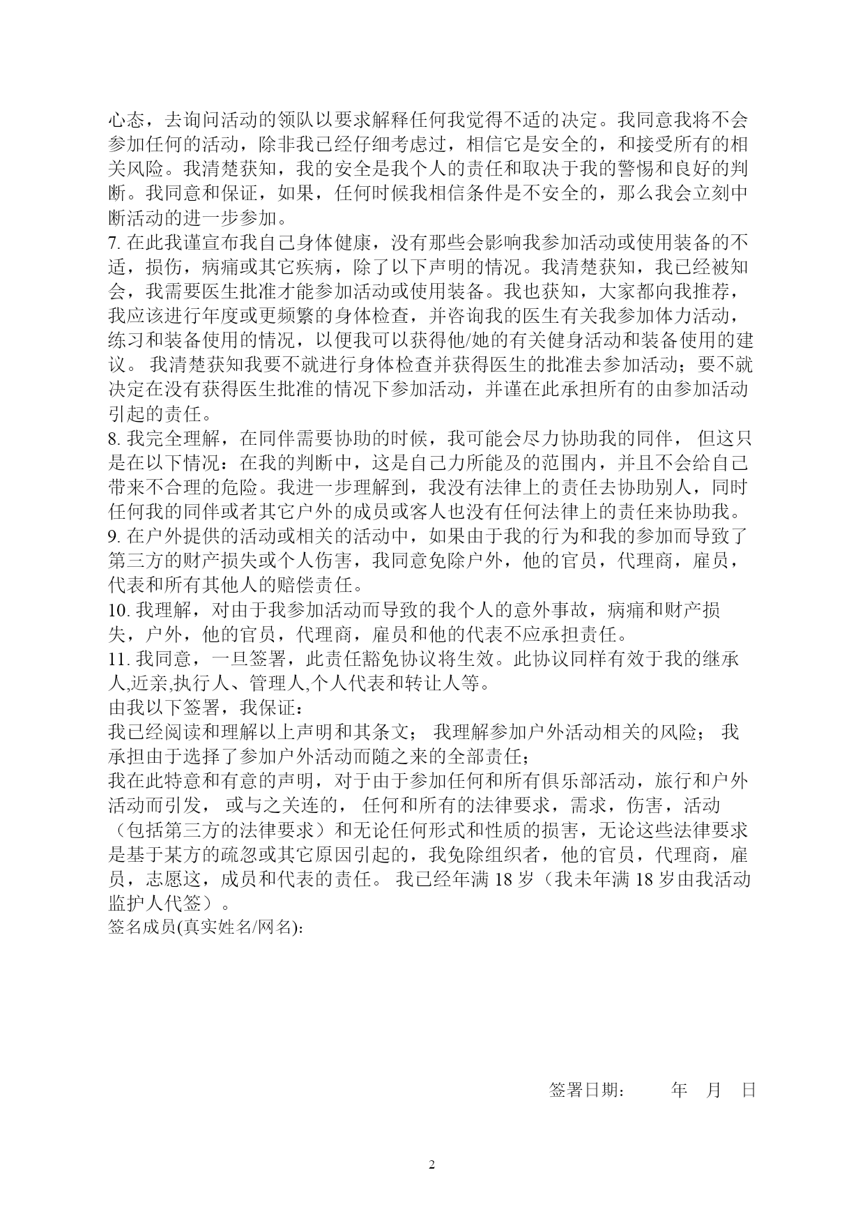 野骆驼户外活动免责协议书有关责任的豁免,权利的放弃,风险的承担和赔偿的协议。通过填写此文件,我已经完全获知和理解以下的条款和内容。我放弃了某些的法律权力量,包括向户外和其代表或成员提起诉讼的权利。我已经仔细阅读此合约。我自愿参加活动。我理解我必须同意和签署此有关责任豁免,权利放弃和风险承担的协议,户外才接受我参加活动。我知道户外的成员只是活动的协调者,并不是职业的领队,向导或有许可证的急救人员。我知道他们可能并没有参加过户外领队的课程,或急救(包括野外)的培训和经验。我知道他们并不对我和我在活动中所带的儿童的安全负责。关于豁免责任,放弃权利和赔偿的协议:1.为了参加户外的所有活动,包括但不限于:徒步,滑冰,山地自行车,划船,飘流,浮潜,探洞,露营,背包远行,攀冰,滑雪,自驾等,在此我同意,如果因为参加户外的任何活动和在活动中使用装备而受到伤害的话,我放弃追究和要求赔偿的权利,同时免除户外和他的官员,代理商,雇员,代表和所有其它成员的法律责任。2.我理解户外的户外活动可能对身体和精神方面都有严酷的要求,可能包括在崎岖地带和恶劣天气中进行活动,可能远离救助和医疗服务。我理解可能要24小时后才能获得救援,所有救援和医疗的费用将由我自己承担。我理解当参加户外的活动时,我有可能面对真实的风险而受到伤害,甚至死亡。这些风险包括跌坠,落石,冰崩,雪崩,闪电,过河,失温,霜冻,冻伤,咬伤,刺伤,犬咬,野兽袭击和各种意外。我理解装备可能会缺陷,而这些缺陷可能会导致我受伤甚至死亡。我清楚获知领队无法预见户外活动中所有的风险和不利。我理解以上所列的风险并不含括了户外活动中的所有可能的风险,并且同意免责和放弃权利的协议并不仅限于以上所列的风险中。3.我理解并清楚知道身体活动和装备的使用是有潜在危害的。我也理解健身和休闲的活动也包含有导致受伤,心脏病和甚至死亡的风险,我知道有可能涉及危险,我自愿参加这些活动和使用活动的装备。因此,我同意承担和接受任何和所有的伤害的风险,甚至死亡的风险,并且,我永远免除户外的法律责任。4.我同意承担所有的个人受到伤害的风险,包括瘫痪和死亡等。这些风险是可能发生在往返参加活动的途中,或者是在参加户外活动的时候,不管是否在户外官员,代理商,雇员或代表的陪同和直接管理下。我清楚获知我已经被提供了自由选择的权利,可以选择往返活动地点的交通方式。我同意承担由于我选择了自己的交通方式往返活动地点而引起的相关的风险和责任。5.我清楚获知户外是一个自愿性组织,其并不承担法律责任,意外保险和健康保险等。我理解户外强烈推荐我购买相关保险以防任何的伤害。6.我理解我能够通过以下措施来减少我的风险:更加注意环境,注意我的身体和精神状况,注意所有安全相关的衣物和装备的适用状况,和只参加哪些自己精神和身体能力之内的活动。我清楚获知我已经被鼓励发展一种好问和怀疑的心态,去询问活动的领队以要求解释任何我觉得不适的决定。我同意我将不会参加任何的活动,除非我已经仔细考虑过,相信它是安全的,和接受所有的相关风险。我清楚获知,我的安全是我个人的责任和取决于我的警惕和良好的判断。我同意和保证,如果,任何时候我相信条件是不安全的,那么我会立刻中断活动的进一步参加。7.在此我谨宣布我自己身体健康,没有那些会影响我参加活动或使用装备的不适,损伤,病痛或其它疾病,除了以下声明的情况。我清楚获知,我已经被知会,我需要医生批准才能参加活动或使用装备。我也获知,大家都向我推荐,我应该进行年度或更频繁的身体检查,并咨询我的医生有关我参加体力活动,练习和装备使用的情况,以便我可以获得他/她的有关健身活动和装备使用的建议。我清楚获知我要不就进行身体检查并获得医生的批准去参加活动;要不就决定在没有获得医生批准的情况下参加活动,并谨在此承担所有的由参加活动引起的责任。8.我完全理解,在同伴需要协助的时候,我可能会尽力协助我的同伴,但这只是在以下情况:在我的判断中,这是自己力所能及的范围内,并且不会给自己带来不合理的危险。我进一步理解到,我没有法律上的责任去协助别人,同时任何我的同伴或者其它户外的成员或客人也没有任何法律上的责任来协助我。9.在户外提供的活动或相关的活动中,如果由于我的行为和我的参加而导致了第三方的财产损失或个人伤害,我同意免除户外,他的官员,代理商,雇员,代表和所有其他人的赔偿责任。10.我理解,对由于我参加活动而导致的我个人的意外事故,病痛和财产损失,户外,他的官员,代理商,雇员和他的代表不应承担责任。11.我同意,一旦签署,此责任豁免协议将生效。此协议同样有效于我的继承人,近亲,执行人、管理人,个人代表和转让人等。由我以下签署,我保证:我已经阅读和理解以上声明和其条文;我理解参加户外活动相关的风险;我承担由于选择了参加户外活动而随之来的