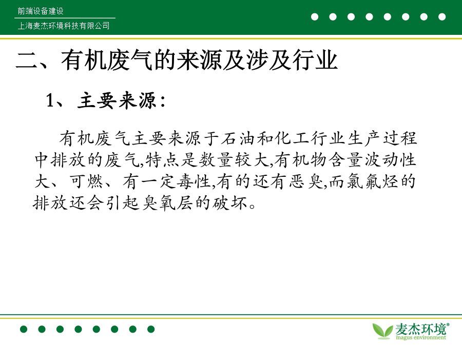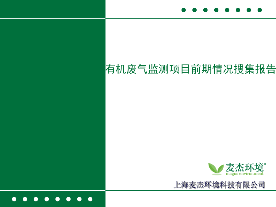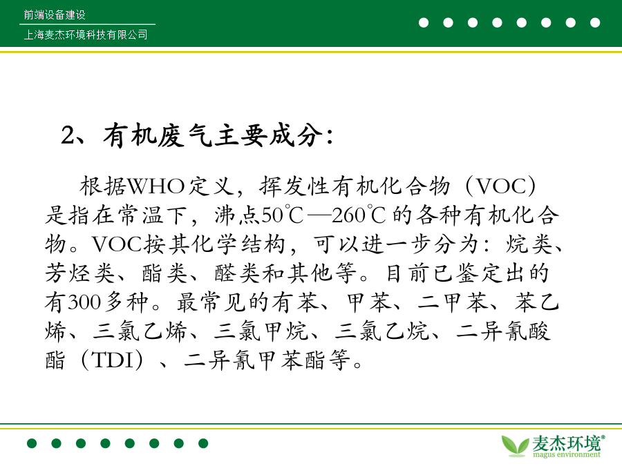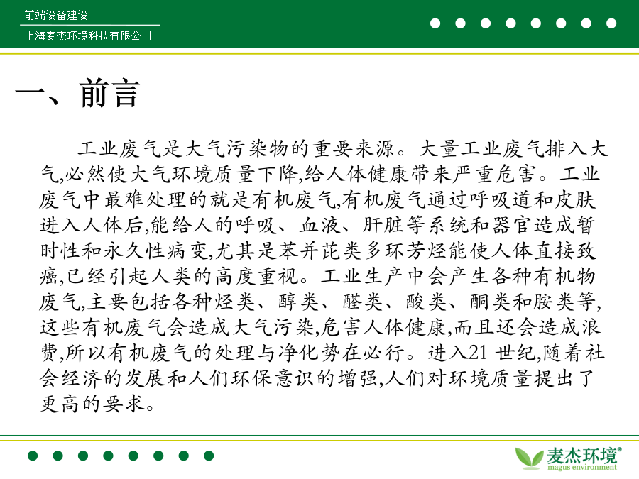 有机废气监测项目前期情况搜集报告前言一、前言二、有机废气的来源及涉及行业2、有机废气主要成分:根据WHO定义,挥发性有机化合物(VOC)是指在常温下,沸点50℃—260℃的各种有机化合物。VOC按其化学结构,可以进一步分为:烷类、芳烃类、酯类、醛类和其他等。目前已鉴定出的有300多种。最常见的有苯、甲苯、二甲苯、苯乙烯、三氯乙烯、三氯甲烷、三氯乙烷、二异氰酸酯(TDI)、二异氰甲苯酯等。3、涉及行业:炼油与石油化工业三、有机废气的处理工艺2、吸附法吸附法工艺流程图废气→油烟过滤器→高效喷淋塔→活性炭吸附床→排风机→排烟囱新型吸附-催化燃烧法工艺流程图3冷凝法:生物净化实质上是一种氧化分解过程:生物法工艺图:废气净化流程脉冲电晕法基本原理是通过前沿陡峭、脉宽窄(纳秒级)的高压脉冲电晕放电,能在常温、常压下获得非平衡等离子体,即产生大量高能电子和O、H0等活性粒子,与有害分子进行氧化降解反应,使污染物最终转化为无害物。1988年以来,美国就开展了电晕法降解低浓度的挥发性有机物的研究。研究表明在环境通常温度和压力下,该法能达到较好的效率。工艺图如下:膜分离法的基本原理是基于气体中各组分透过膜的速度不同,每种组分透过膜的速度与该气体的性质、膜的特性与膜两边的气体分压有关。膜分离法净化有机废气是根据有机蒸气和空气透过膜的能力不同,而将二者分开的。常用膜分离工艺有:蒸气渗透、气体膜分离和膜基吸收法。膜分离技术用于气体净化上的优点是投资费用低、分离因子大、分离效果好(即净化效果好),而且膜法净化操作简单、控制方便、操作弹性大。工艺图如下:四、废气监测Ⅱ、监测内容有害物质排放浓度(标)有害物质排放量。废气排放量。系统阻力。漏风系统。Ⅲ、监测方法上海麦杰环境科技有限公司地址:上海市田林路487号宝石园20号楼23层邮编:200233电话:021-33674360传真:021-33674361