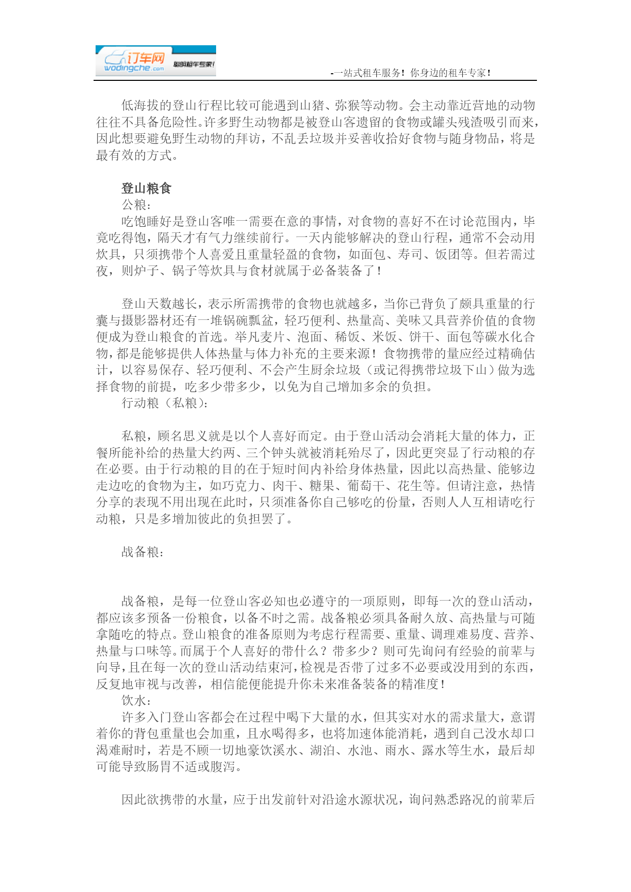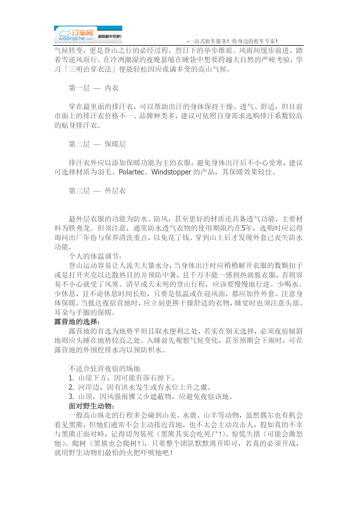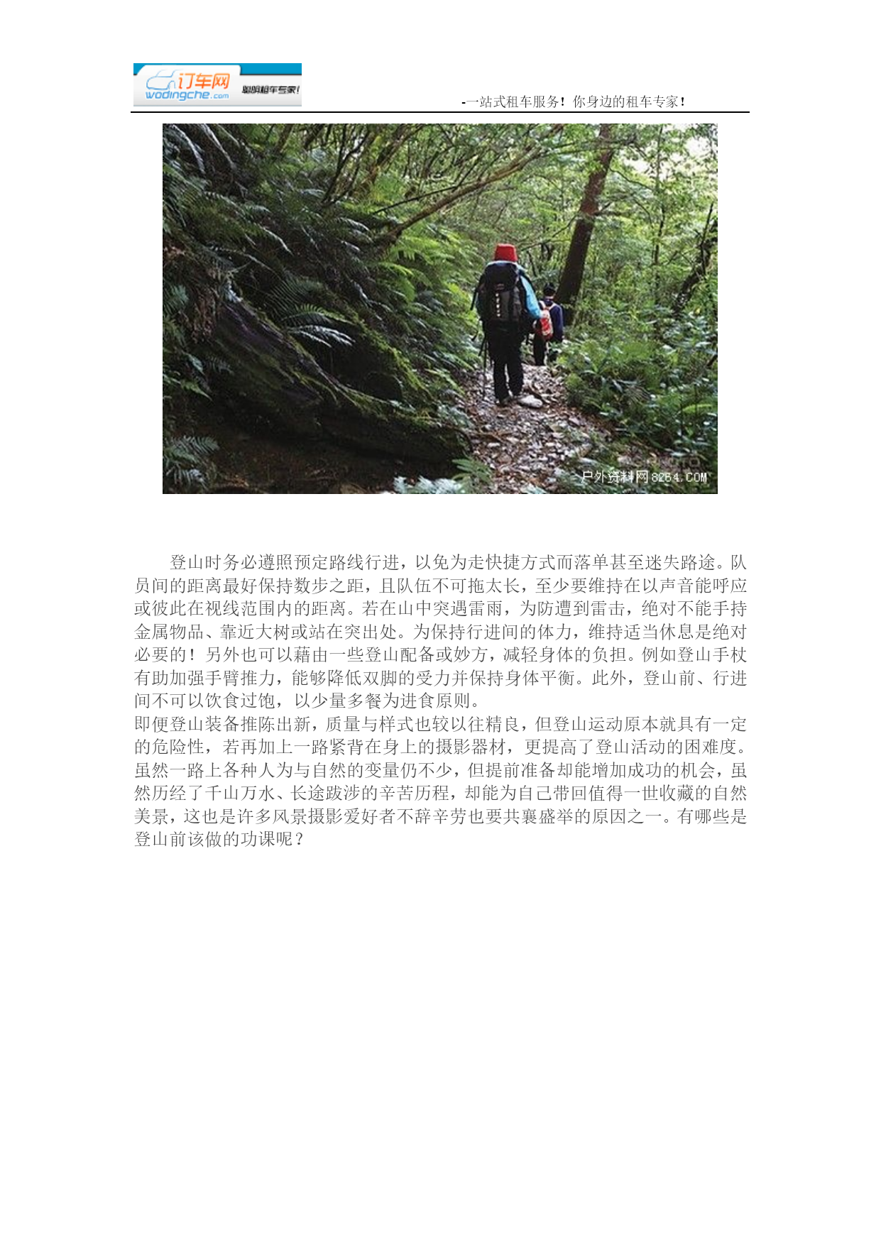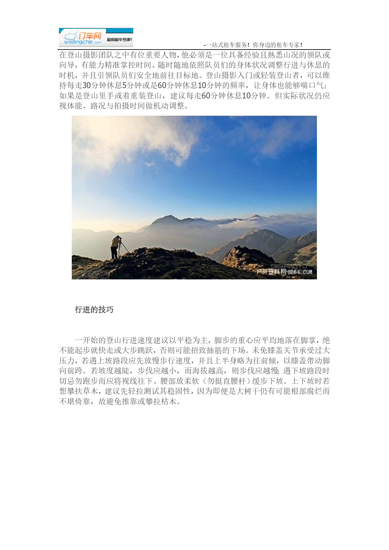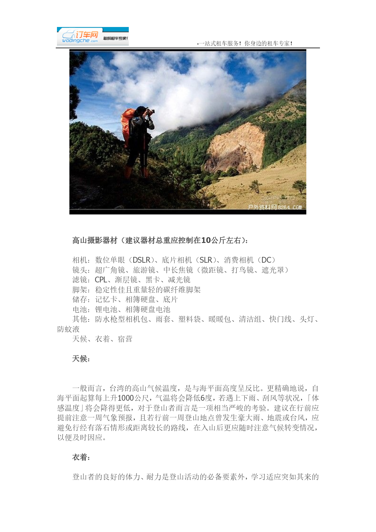 -一站式租车服务!你身边的租车专家!在HYPERLINK"http://www.8264.com/list/224"登山摄影团队之中有位重要人物,他必须是一位具备经验且熟悉山况的领队或向导,有能力精准掌控时间、随时随地依照队员们的身体状况调整行进与休息的时机,并且引领队员们安全地前往目标地。登山摄影入门或轻装登山者,可以维持每走30分钟休息5分钟或是60分钟休息10分钟的频率,让身体也能够喘口气;如果是登山HYPERLINK"http://bbs.8264.com/thread-988093-1-1.html"里手或着重装登山,建议每走60分钟休息10分钟。但实际状况仍应视体能、路况与拍摄时间做机动调整。行进的技巧一开始的登山行进速度建议以平稳为主,脚步的重心应平均地落在脚掌,绝不能起步就快走或大步跳跃,否则可能招致抽筋的下场。未免膝盖关节承受过大压力,若遇上坡路段应先放慢步行速度,并且上半身略为往前倾,以膝盖带动脚向前跨。若坡度越陡,步伐应越小,而海拔越高,则步伐应越慢;遇下坡路段时切忌勿跑步而应将视线往下、腰部放柔软(勿挺直腰杆)缓步下坡。上下坡时若想攀扶草木,建议先轻拉测试其稳固性,因为即便是大树干仍有可能根部腐烂而不堪倚靠,故避免推靠或攀拉枯木。登山时务必遵照预定路线行进,以免为走快捷方式而落单甚至迷失路途。队员间的距离最好保持数步之距,且队伍不可拖太长,至少要维持在以声音能呼应或彼此在视线范围内的距离。若在山中突遇雷雨,为防遭到雷击,绝对不能手持金属物品、靠近大树或站在突出处。为保持行进间的体力,维持适当休息是绝对必要的!另外也可以藉由一些登山配备或妙方,减轻身体的负担。例如登山手杖有助加强手臂推力,能够降低双脚的受力并保持身体平衡。此外,登山前、行进间不可以饮食过饱,以少量多餐为进食原则。即便HYPERLINK"http://www.8264.com/list/224"登山装备推陈出新,质量与样式也较以往精良,但登山运动原本就具有一定的危险性,若再加上一路紧背在身上的摄影器材,更提高了登山活动的困难度。虽然一路上各种人为与自然的变量仍不少,但提前准备却能增加成功的机会,虽然历经了千山万水、长途跋涉的辛苦历程,却能为自己带回值得一世收藏的自然美景,这也是许多风景摄影爱好者不辞辛劳也要共襄盛举的原因之一。有哪些是登山前该做的功课呢?高山摄影器材(建议器材总重应控制在10公斤左右):相机:数位单眼(DSLR)、底片相机(SLR)、消费相机(DC)镜头:超广角镜、HYPERLINK"http://bbs.8264.com"旅游镜、中长焦镜(微距镜、打鸟镜、遮光罩)滤镜:CPL、渐层镜、黑卡、减光镜脚架:稳定性佳且重量轻的碳纤维脚架储存:记忆卡、相簿硬盘、底片电池:锂电池、相簿硬盘电池其他:防水枪型相机包、雨套、塑料袋、暖暖包、清洁组、快门线、HYPERLINK"http://www.8264.com/list/218"头灯、防蚊液天候、衣着、宿营天候:一般而言,HYPERLINK"http://bbs.8264.com/thread-892147-1-1.html"台湾的高山气候温度,是与海平面高度呈反比。更精确地说,自海平面起算每上升1000公尺,气温将会降低6度,若遇上下雨、刮风等状况,「体感温度」将会降得更低,对于登山者而言是一项相当严峻的考验。建议在行前应提前注意一周气象预报,且若行前一周登山地点曾发生豪大雨、地震或台风,应避免行经有落石情形或距离较长的路线,在入山后更应随时注意气候转变情况,以便及时因应。衣着:登山者的良好的体力、耐力是登山活动的必备要素外,学习适应突如其来的气候转变,更是登HYPERLINK"http://bbs.8264.com/thread-1017593-1-1.html"山之行的必经过程。烈日下的举步维艰、风雨间缓步前进、踏着雪逆风而行、在冷冽潮湿的夜晚瑟缩在HYPERLINK"http://www.8264.com/list/212"睡袋中想要跨越大自然的严峻考验,学习「HYPERLINK"http://sanming.8264.com"三明治穿衣法」便能轻松因应诡谲多变的高山气候。第一层—内衣穿在最里面的排汗衣,可以帮助出汗的身体保持干燥、透气、舒适,但目前市面上的排汗衣价格不一、品牌种类多,建议可依照自身需求选购排汗系数较高的贴身排汗衣。第二层—保暖层排汗衣外应以添加保暖功能为主的衣服,避免身体出汗后不小心受寒,建议可选择材质为羽毛、Polartec、Windstopper的产品,其保暖效果较佳。第三层—外层衣最外层衣服的功能为防水、防风,甚至更好的材质还具备透气功能,主要材料为铁弗龙。但须注意,通常防水透气衣物的使用期限约在5