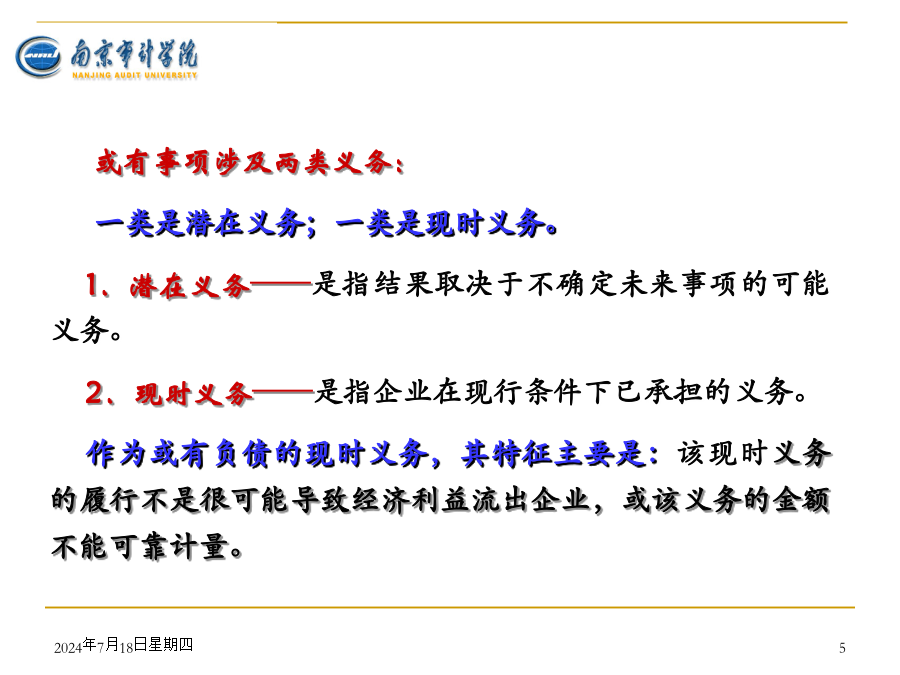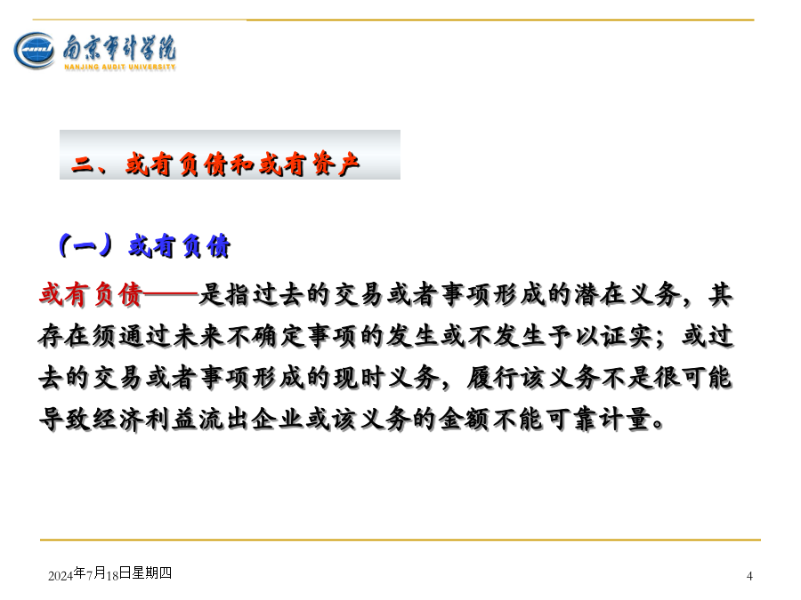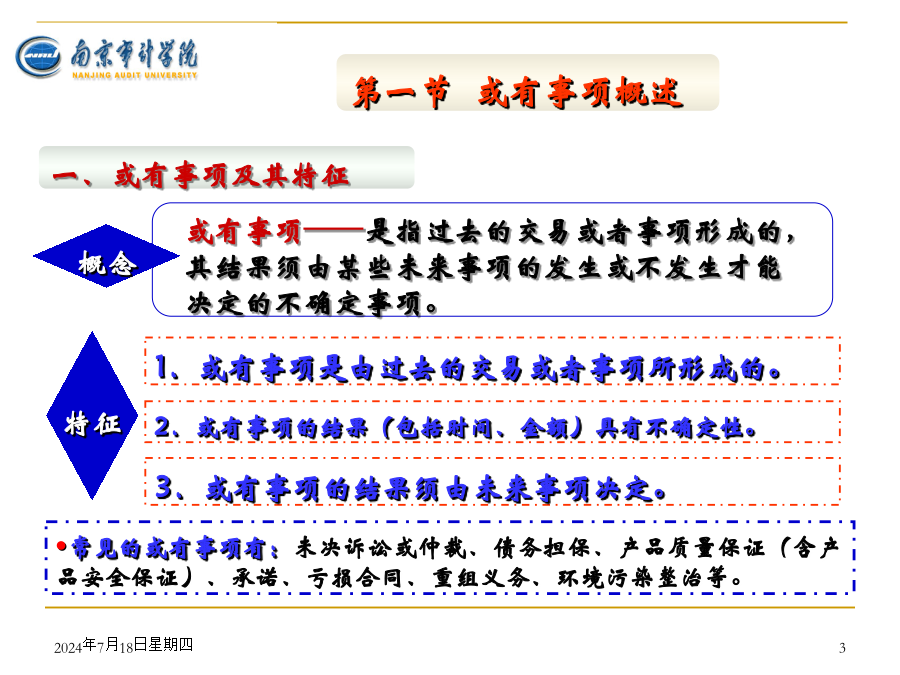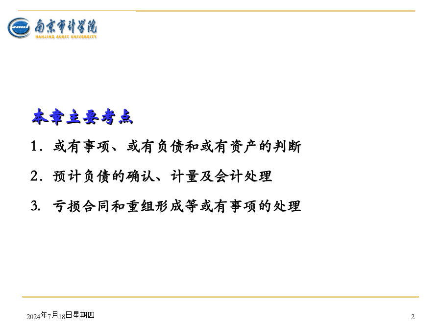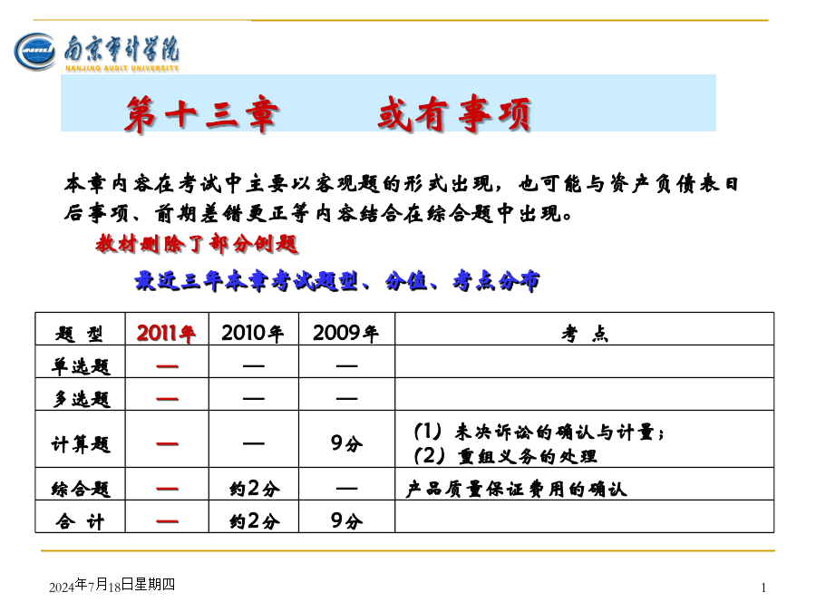 最近三年本章考试题型、分值、考点分布本章主要考点1.或有事项、或有负债和或有资产的判断2.预计负债的确认、计量及会计处理3.亏损合同和重组形成等或有事项的处理第一节或有事项概述(一)或有负债或有负债——是指过去的交易或者事项形成的潜在义务,其存在须通过未来不确定事项的发生或不发生予以证实;或过去的交易或者事项形成的现时义务,履行该义务不是很可能导致经济利益流出企业或该义务的金额不能可靠计量。或有事项涉及两类义务:一类是潜在义务;一类是现时义务。1.潜在义务——是指结果取决于不确定未来事项的可能义务。2.现时义务——是指企业在现行条件下已承担的义务。作为或有负债的现时义务,其特征主要是:该现时义务的履行不是很可能导致经济利益流出企业,或该义务的金额不能可靠计量。不是很可能导致经济利益流出企业——是指该项义务导致经济利益流出企业的可能性≤50%。经济利益流出可能性的判断:结果的可能性对应的概率区间(1)极小可能发生的概率>0,但≤5%(2)可能发生的概率>5%,但≤50%(3)很可能发生的概率>50%,但≤95%(4)基本确定发生的概率>95%,但<100%金额不能可靠计量——是指该现时义务导致经济利益流出企业的金额难以合理预计,现时义务履行的结果具有较大的不确定性。注意:或有负债无论是潜在义务,还是现时义务均不符合负债的确认条件,因而不能在会计报表内予确认,但应按相关规定在附注中披露。(二)或有资产或有资产——是指过去的交易或者事项形成的潜在资产,其存在须通过未来不确定事项的发生或不发生予以证实。或有资产作为一种潜在资产,其结果具有较大的不确定性,只有随着经济情况的变化,通过某些未来不确定事项的发生或不发生才能证实其是否会形成企业真正的资产。【例题1·单选题】根据企业会计准则规定,下列有关或有事项的表述中,正确的是()。A.或有负债与或有事项相联系,有或有事项就有或有负债B.对于或有事项既要确认或有负债,也要确认或有资产C.由于担保引起的或有事项随着被担保人债务的全部清偿而消失D.只有对本单位产生不利影响的事项,才能作为或有事项【答案】C(1)该义务是企业承担的现时义务1、该义务是企业承担的现时义务——是指企业在当前条件下已承担的义务,企业没有其他现实的选择,只能履行该义务,如法律要求企业必须履行、有关各方合理预期企业应当履行等。现时义务——包括法定义务和推定义务。法定义务——是指因合同、法规或其他司法解释等产生的义务,通常是企业在经济管理和经济协调中,依照经济法律、法规的规定必须履行的责任。如企业与其他企业担保合同产生的义务。推定义务——是指因企业的特定行为而产生的义务。“企业的特定行为”泛指企业以往的习惯做法、已公开的承诺或已公开宣布的经营政策。(如产品质量保证的承诺)2、履行该义务很可能导致经济利益流出企业——是指履行与或有事项相关的现时义务时,导致经济利益流出企业的可能性超过50%但尚未达到基本确定的程度。3、该义务的金额能够可靠地计量——是指与或有事项相关的现时义务的金额能够合理地估计。1、最佳估计数的确定(1)所需支出存在一个连续范围,且该范围内各种结果发生的可能性相同——最佳估计数应当按照该范围内的中间值确定,即按该范围的上、下限金额的平均数确定。【例题2】2011年9月10日,甲公司起诉乙公司侵犯其软件专利权,要求乙公司赔偿400万元。至12月31日,法院尚未判决,乙公司估计败诉的可能性为60%,如败诉估计需要赔偿的金额可能是200~300万元之间的某一金额,而且这个区间内每个金额发生的可能性都大致相同,另外还需支付诉讼费10万元。要求:(1)计算甲公司应确认的预计负债的金额。(2)编制乙公司的有关会计分录。【例题3·单选题】2010年9月10日,甲公司起诉乙公司侵犯其软件专利权,要求乙公司赔偿400万元。至12月31日,法院尚未决,乙公司估计败诉的可能性为60%,如败诉估计需要赔偿200万元的可能性为70%,需要赔偿300万元的可能性为30%,另外还需支付诉讼费10万元。乙公司应确认的预计负债的金额为()万元。A.400B.300C.200D.210【答案】D【例题4】甲公司2011年度销售A产品10000件,销售额1000万元,甲公司承诺对售出的A产品质量保证条款规定:产品售出后一年内,如发生正常质量问题,甲企业将免费负责修理。根据以往的经验估计,85%的产品不会发生质量问题;有10%的产品会发生较小质量问题;有5%的产品会发生较大质量问题。如发生较小质量问题,修理费用为销售额的3%~5%;如发生较大质量问题,修理费用为销售额的8%。企业会计准则规定,如果清偿因或有事项而确认的负债所需要的支出全部或部分预期由第三方或其他方补偿,那么补偿金额只能在基本确定能够收到时,作为资产单独确认,而且确认的补偿金额不应当超