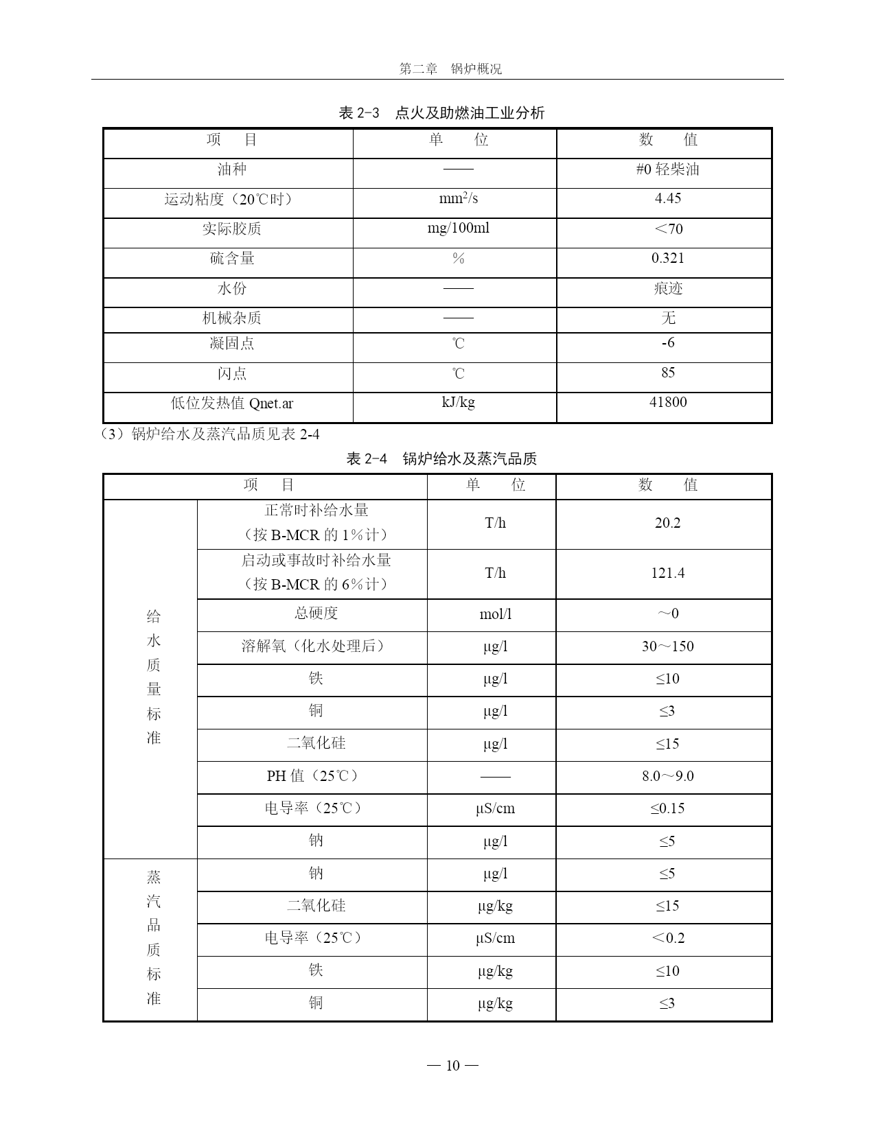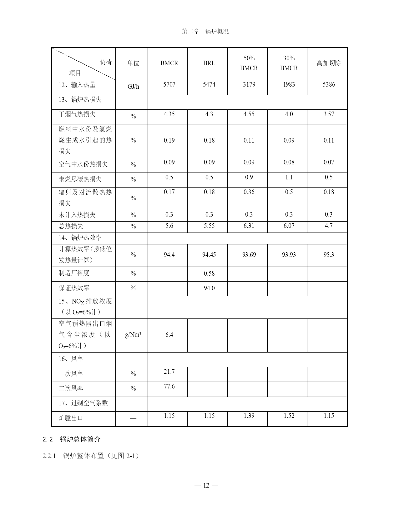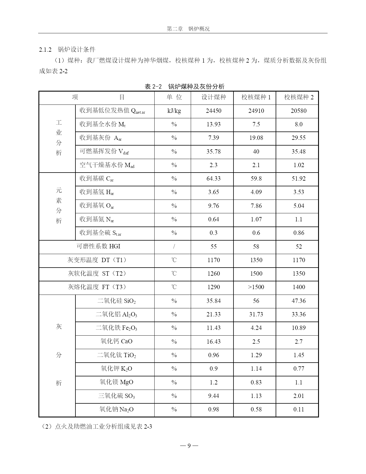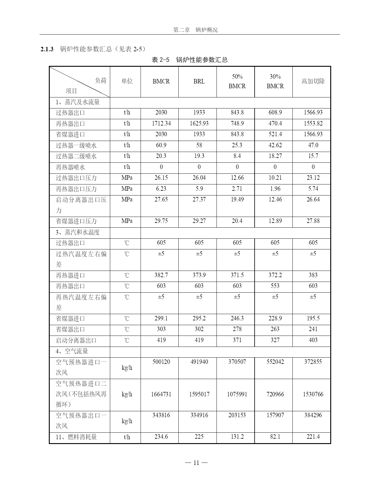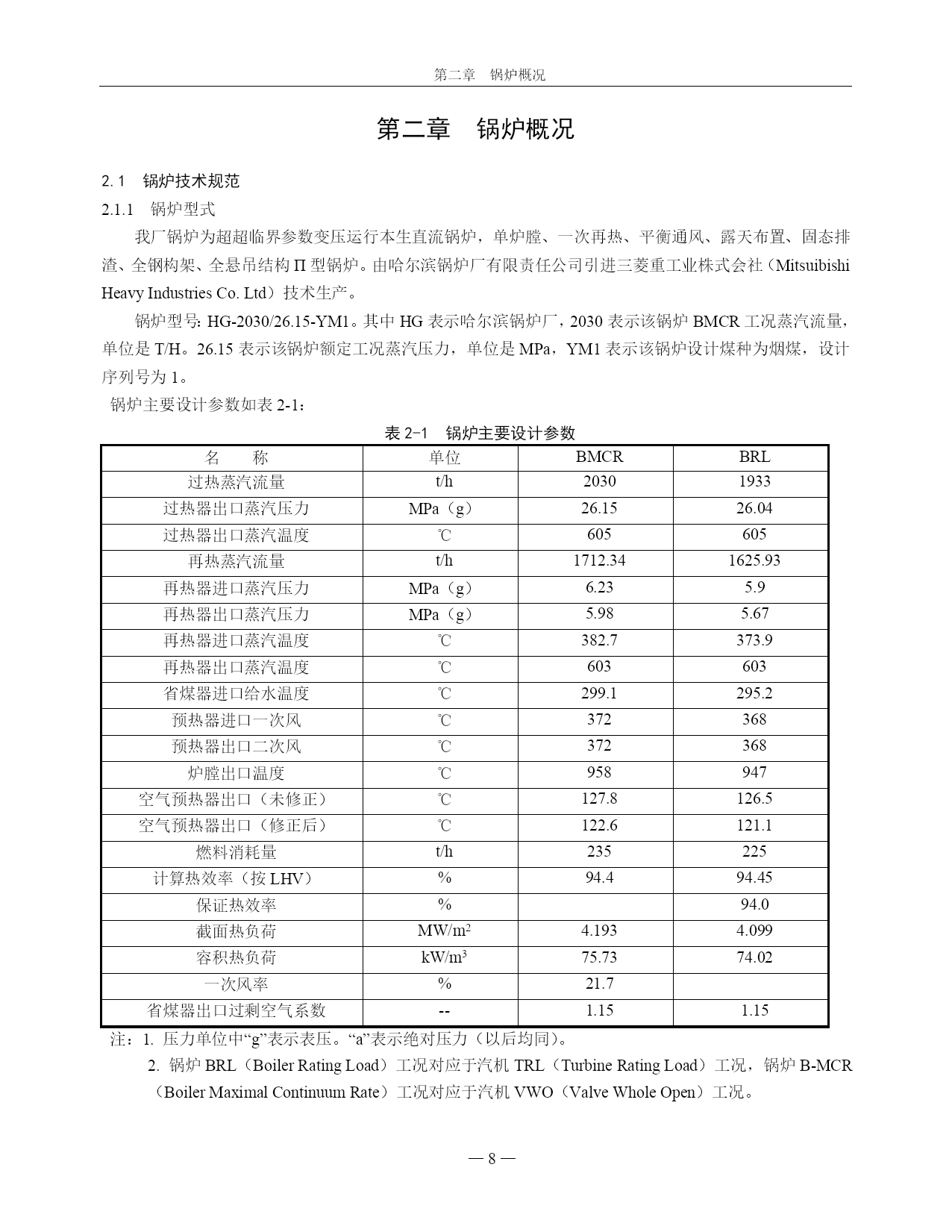 第二章锅炉概况——第二章锅炉概况2.1锅炉技术规范2.1.1锅炉型式我厂锅炉为超超临界参数变压运行本生直流锅炉,单炉膛、一次再热、平衡通风、露天布置、固态排渣、全钢构架、全悬吊结构Π型锅炉。由哈尔滨锅炉厂有限责任公司引进三菱重工业株式会社(MitsuibishiHeavyIndustriesCo.Ltd)技术生产。锅炉型号:HG-2030/26.15-YM1。其中HG表示哈尔滨锅炉厂,2030表示该锅炉BMCR工况蒸汽流量,单位是T/H。26.15表示该锅炉额定工况蒸汽压力,单位是MPa,YM1表示该锅炉设计煤种为烟煤,设计序列号为1。锅炉主要设计参数如表2-1:表2-1锅炉主要设计参数名称单位BMCRBRL过热蒸汽流量t/h20301933过热器出口蒸汽压力MPa(g)26.1526.04过热器出口蒸汽温度℃605605再热蒸汽流量t/h1712.341625.93再热器进口蒸汽压力MPa(g)6.235.9再热器出口蒸汽压力MPa(g)5.985.67再热器进口蒸汽温度℃382.7373.9再热器出口蒸汽温度℃603603省煤器进口给水温度℃299.1295.2预热器进口一次风℃372368预热器出口二次风℃372368炉膛出口温度℃958947空气预热器出口(未修正)℃127.8126.5空气预热器出口(修正后)℃122.6121.1燃料消耗量t/h235225计算热效率(按LHV)%94.494.45保证热效率%94.0截面热负荷MW/m24.1934.099容积热负荷kW/m375.7374.02一次风率%21.7省煤器出口过剩空气系数--1.151.15注:1.压力单位中“g”表示表压。“a”表示绝对压力(以后均同)。2.锅炉BRL(BoilerRatingLoad)工况对应于汽机TRL(TurbineRatingLoad)工况,锅炉B-MCR(BoilerMaximalContinuumRate)工况对应于汽机VWO(ValveWholeOpen)工况。2.1.2锅炉设计条件(1)煤种:我厂燃煤设计煤种为神华烟煤,校核煤种1为,校核煤种2为,煤质分析数据及灰份组成如表2-2表2-2锅炉煤种及灰份分析项目单位设计煤种校核煤种1校核煤种2工业分析收到基低位发热值Qnet.arkJ/kg244502491020580收到基全水份Mt%13.937.58.0收到基灰份Aar%7.3919.0829.55可燃基挥发份Vdaf%35.784035.48空气干燥基水份Mad%2.32.11.02元素分析收到基碳Car%64.3359.851.92收到基氢Har%3.654.093.53收到基氧Oar%9.767.865.04收到基氮Nar%0.641.071.1收到基全硫St.ar%0.30.60.86可磨性系数HGI/555852灰变形温度DT(T1)℃117013501170灰软化温度ST(T2)℃126015001350灰熔化温度FT(T3)℃1290>15001400灰分析二氧化硅SiO2%35.845647.36二氧化铝Al2O3%21.3331.7333.36二氧化铁Fe2O3%11.434.2410.89氧化钙CaO%16.432.52.7二氧化钛TiO2%0.961.291.45氧化钾K2O%0.91.140.77氧化镁MgO%1.20.831.1三氧化硫SO3%9.441.132.01氧化钠Na2O%0.980.580.11(2)点火及助燃油工业分析组成见表2-3表2-3点火及助燃油工业分析项目单位数值油种——#0轻柴油运动粘度(20℃时)mm2/s4.45实际胶质mg/100ml<70硫含量%0.321水份——痕迹机械杂质——无凝固点℃-6闪点℃85低位发热值Qnet.arkJ/kg41800(3)锅炉给水及蒸汽品质见表2-4表2-4锅炉给水及蒸汽品质项目单位数值给水质量标准正常时补给水量(按B-MCR的1%计)T/h20.2启动或事故时补给水量(按B-MCR的6%计)T/h121.4总硬度mol/l~0溶解氧(化水处理后)μg/l30~150铁μg/l≤10铜μg/l≤3二氧化硅μg/l≤15PH值(25℃)——8.0~9.0电导率(25℃)μS/cm≤0.15钠μg/l≤5蒸汽品质标准钠μg/l≤5二氧化硅μg/kg≤15电导率(25℃)μS/cm<0.2铁μg/kg≤10铜μg/kg≤3锅炉性能参数汇总(见表2-5)表2-5锅炉性能参数汇总负荷项目单位BMCRBRL50%BMCR30%BMCR高加切除1、蒸汽及水流量过热器出口t/h20301933843.8608.91566.93再热器出口t/h1712.341625.93748.9470.41553.82省煤器进口t
