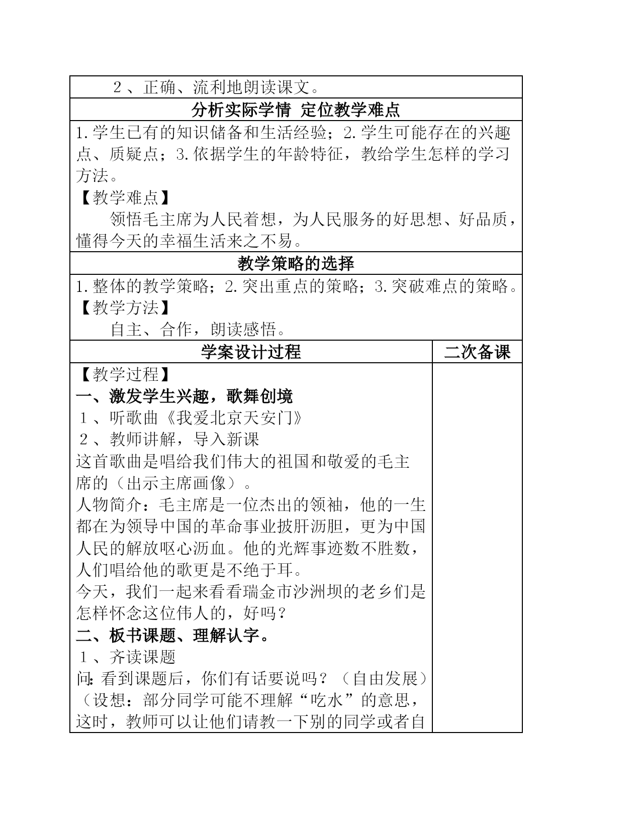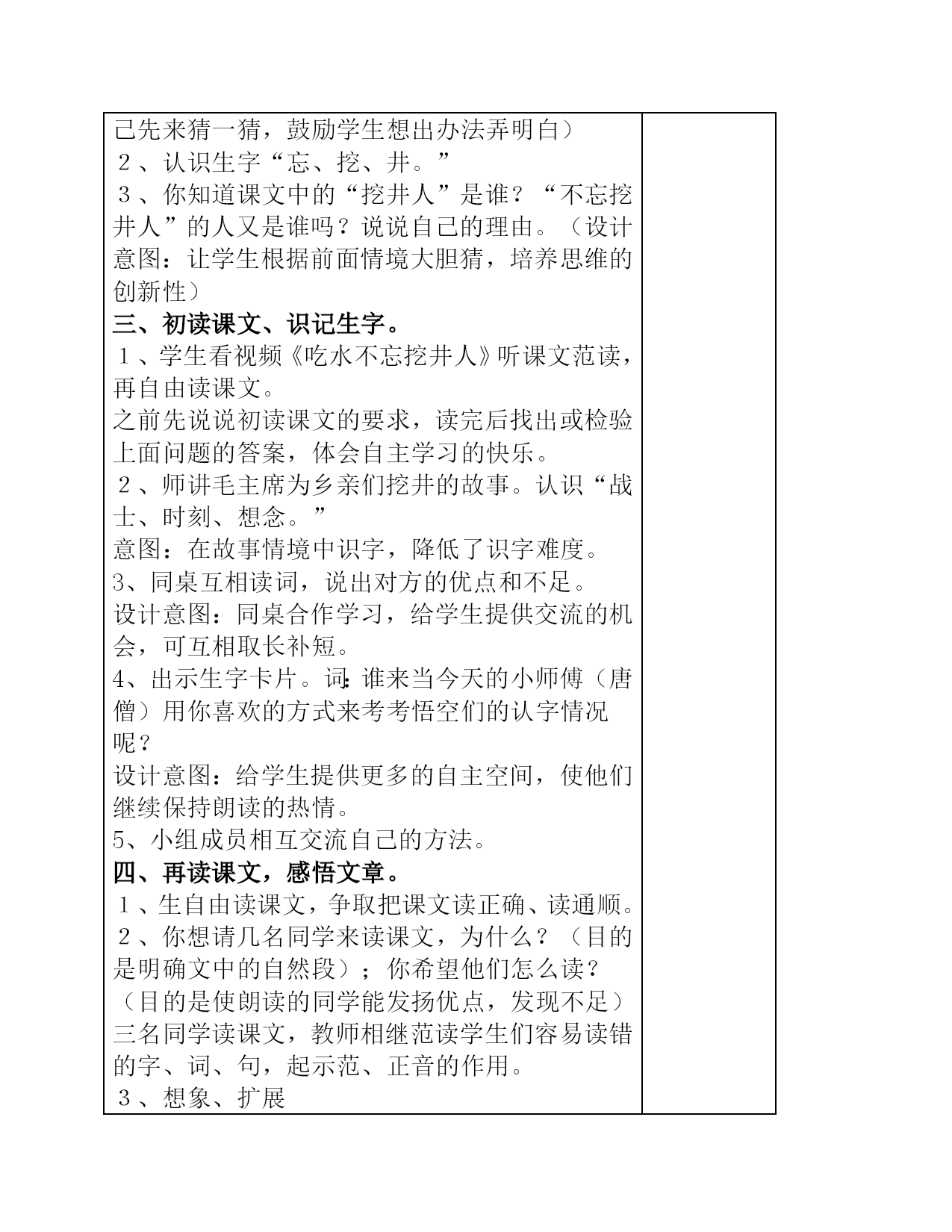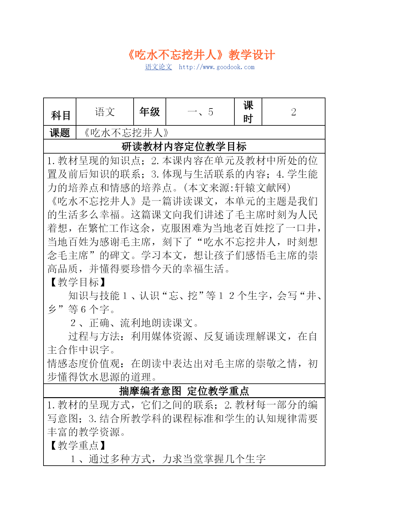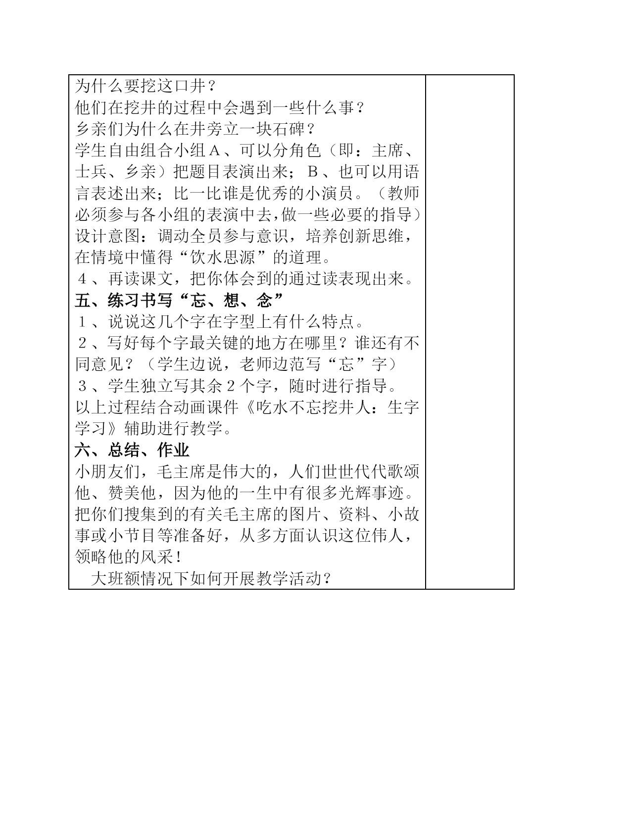 《吃水不忘挖井人》教学设计HYPERLINK"http://www.goodook.com"语文论文http://www.goodook.com科目语文年级一、5课时2课题《吃水不忘挖井人》研读教材内容定位教学目标1.教材呈现的知识点;2.本课内容在单元及教材中所处的位置及前后知识的联系;3.体现与生活联系的内容;4.学生能力的培养点和情感的培养点。(本文来源:轩辕文献网)《吃水不忘挖井人》是一篇讲读课文,本单元的主题是我们的生活多么幸福。这篇课文向我们讲述了毛主席时刻为人民着想,在繁忙工作这余,克服困难为当地老百姓挖了一口井,当地百姓为感谢毛主席,刻下了“吃水不忘挖井人,时刻想念毛主席”的碑文。学习本文,想让孩子们感悟毛主席的崇高品质,并懂得要珍惜今天的幸福生活。【教学目标】知识与技能1、认识“忘、挖”等12个生字,会写“井、乡”等6个字。2、正确、流利地朗读课文。过程与方法:利用媒体资源、反复诵读理解课文,在自主合作中识字。情感态度价值观:在朗读中表达出对毛主席的崇敬之情,初步懂得饮水思源的道理。揣摩编者意图定位教学重点1.教材的呈现方式,它们之间的联系;2.教材每一部分的编写意图;3.结合所教学科的课程标准和学生的认知规律需要丰富的教学资源。【教学重点】1、通过多种方式,力求当堂掌握几个生字2、正确、流利地朗读课文。分析实际学情定位教学难点1.学生已有的知识储备和生活经验;2.学生可能存在的兴趣点、质疑点;3.依据学生的年龄特征,教给学生怎样的学习方法。【教学难点】领悟毛主席为人民着想,为人民服务的好思想、好品质,懂得今天的幸福生活来之不易。教学策略的选择1.整体的教学策略;2.突出重点的策略;3.突破难点的策略。【教学方法】自主、合作,朗读感悟。学案设计过程二次备课【教学过程】一、激发学生兴趣,歌舞创境1、听歌曲《我爱北京天安门》2、教师讲解,导入新课这首歌曲是唱给我们伟大的祖国和敬爱的毛主席的(出示主席画像)。人物简介:毛主席是一位杰出的领袖,他的一生都在为领导中国的革命事业披肝沥胆,更为中国人民的解放呕心沥血。他的光辉事迹数不胜数,人们唱给他的歌更是不绝于耳。今天,我们一起来看看瑞金市沙洲坝的老乡们是怎样怀念这位伟人的,好吗?二、板书课题、理解认字。1、齐读课题问:看到课题后,你们有话要说吗?(自由发展)(设想:部分同学可能不理解“吃水”的意思,这时,教师可以让他们请教一下别的同学或者自己先来猜一猜,鼓励学生想出办法弄明白)2、认识生字“忘、挖、井。”3、你知道课文中的“挖井人”是谁?“不忘挖井人”的人又是谁吗?说说自己的理由。(设计意图:让学生根据前面情境大胆猜,培养思维的创新性)三、初读课文、识记生字。1、学生看视频《吃水不忘挖井人》听课文范读,再自由读课文。之前先说说初读课文的要求,读完后找出或检验上面问题的答案,体会自主学习的快乐。2、师讲毛主席为乡亲们挖井的故事。认识“战士、时刻、想念。”意图:在故事情境中识字,降低了识字难度。3、同桌互相读词,说出对方的优点和不足。设计意图:同桌合作学习,给学生提供交流的机会,可互相取长补短。4、出示生字卡片。词:谁来当今天的小师傅(唐僧)用你喜欢的方式来考考悟空们的认字情况呢?设计意图:给学生提供更多的自主空间,使他们继续保持朗读的热情。5、小组成员相互交流自己的方法。四、再读课文,感悟文章。1、生自由读课文,争取把课文读正确、读通顺。2、你想请几名同学来读课文,为什么?(目的是明确文中的自然段);你希望他们怎么读?(目的是使朗读的同学能发扬优点,发现不足)三名同学读课文,教师相继范读学生们容易读错的字、词、句,起示范、正音的作用。3、想象、扩展为什么要挖这口井?他们在挖井的过程中会遇到一些什么事?乡亲们为什么在井旁立一块石碑?学生自由组合小组A、可以分角色(即:主席、士兵、乡亲)把题目表演出来;B、也可以用语言表述出来;比一比谁是优秀的小演员。(教师必须参与各小组的表演中去,做一些必要的指导)设计意图:调动全员参与意识,培养创新思维,在情境中懂得“饮水思源”的道理。4、再读课文,把你体会到的通过读表现出来。五、练习书写“忘、想、念”1、说说这几个字在字型上有什么特点。2、写好每个字最关键的地方在哪里?谁还有不同意见?(学生边说,老师边范写“忘”字)3、学生独立写其余2个字,随时进行指导。以上过程结合动画课件《吃水不忘挖井人:生字学习》辅助进行教学。六、总结、作业小朋友们,毛主席是伟大的,人们世世代代歌颂他、赞美他,因为他的一生中有很多光辉事迹。把你们搜集到的有关毛主席的图片、资料、小故事或小节目等准备好,从多方面认识这位伟人,领略他的风采!大班额情况下如何开展教学活动?