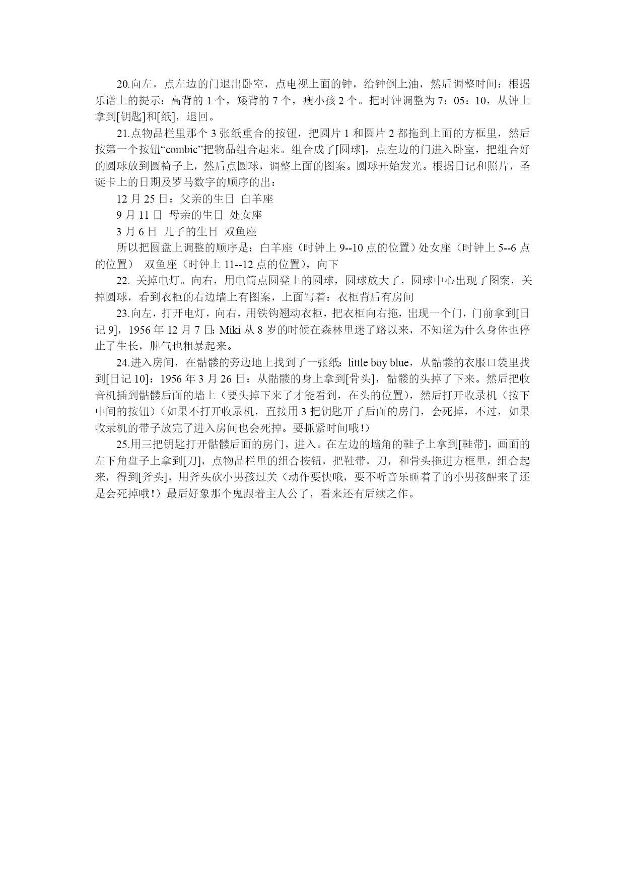 1.点门,发现屋子里太黑,而且没有电。在门的右下角找到[2根插头],向下。2.向左,看到一个绿色的配电箱。点箱子左边向上的箭头,看到箱子左边有六个灯座,记住他们的颜色。看到第2个和第5个是黑的。向右,点绿色配电箱上的六个按钮,根据刚才看到的灯座,把第2个和第5个打开,发现下面的灯变成橘色。然后把插头1插到下面的插座上。3.向右2次,点门。点门右上的插座,把插头2插上,然后点旁边的开关,打开电灯。出现个小男孩!(这个地方吓我一跳)4.进了屋子,点桌子,从桌子上拿到[日记1]看到日记上写着1955年12月8日。今天是监禁他的第二天,他什么都不想吃。给他MotherGoose的书才能安定下来。5.点桌子左边的照片,看到照片上他母亲过30岁的生日,看到照片像框上写着9月11日,并且看到一个罗马数字2。向下。6.点右边箱子和书柜的夹角,拿到[电池1],然后用手帕搽掉后面墙上的灰,看到墙上出现数字:381976。点字提示什么东西遗失掉了。发现245没有了。点右上退出。7.点书架的下层,拿到[铁钩],在书架中间层拿到[圣诞卡],看圣诞卡,发现12月25日是父亲的生日。点书架上中间层会动的书:MotherGoose打开来看看。8.把椅子拖到书架前放好。位置放对了以后椅子不能再移动了。然后点书架顶上,拿到[圆盘]9.用铁钩把桌子向左边拖动。桌子移开了。露出了保险箱。根据刚才墙上的提示,按下245的按钮(右上,左下。右下)保险箱打开了,拿到[日记2],1956年3月6日:今天是他的生日,我准备了可以让他高兴的礼物,但是他却很生气的从他房间里冲了出来。看到日记右下角有个罗马数字3。并且拿到[钥匙]。向上退出。10.向右2次,在右边的扫帚后面找到[电筒],然后用钥匙打开门进入卧室。又一次看到那个男孩。11.点床上被子里,拿到[日记3],1956年2月12日:miki还没有从母亲的死里解脱出来,但是还不能解除监禁,真不明白他为什么杀了他母亲。12.点床旁边墙上挂着的镜子,打开镜子后面的柜子,拿到[电池2]和[日记4]。日记4上写着:1956年3月20日。13.向左2次,进右边的门,来到卫生间里。点马桶,在马桶左边的垃圾桶里找到[星座的纸条],向上,点马桶上的水箱,在水箱里找到[钥匙],向左退出14.点洗脸池,在洗脸池里拿到[油]和[螺丝刀]15.点浴缸,在浴缸的左边角落里找到[日记5]:1956年4月2日。用螺丝刀取下浴缸里右上角的4个螺钉,拿到[日记6]:1956年4月4日:Miki喜欢弹琴,但是我不明白他为什么只弹同样的曲子。向右,向下退出卫生间。16.向左,在右边小柜子上衣服的右边拿到[日记7]:1956年3月1日:17.点墙上的日历,看到日历上的数字:1.5.10.11.14.16.27点床上的电子琴,把2个电池放进去。打开电子琴的开关,根据日历上和日记上的提示按下琴键:左边第5个黑键,左边第3个白键,右边第2个白键,左边第6个黑键,左边第1个白键,左边第7个黑键,左边第6个白键。拿到[钥匙]。在床枕头的右边拿到[收音机]18.向左2次,打开衣柜,在衣柜第二层的右边格里拿到[乐谱]--baa,baa,blacksheep.看到高背的1个,矮背的7个,瘦小孩2个。19.点柜子里左下角的盒子,看到盒子上面的字母排列从上到下是abcdefg...,根据箱子上padlock的文字,找到对应的按钮按下(从左边开始第1列按下134,第3列按下125,第4列按下1),拿到[日记8]:Miki好象经常能从房间里出来,但是但是我还是经常锁着房间的。还拿到[圆片2]20.向左,点左边的门退出卧室,点电视上面的钟,给钟倒上油,然后调整时间:根据乐谱上的提示:高背的1个,矮背的7个,瘦小孩2个。把时钟调整为7:05:10,从钟上拿到[钥匙]和[纸],退回。21.点物品栏里那个3张纸重合的按钮,把圆片1和圆片2都拖到上面的方框里,然后按第一个按钮“combic”把物品组合起来。组合成了[圆球],点左边的门进入卧室,把组合好的圆球放到圆椅子上,然后点圆球,调整上面的图案。圆球开始发光。根据日记和照片,圣诞卡上的日期及罗马数字的顺序的出:12月25日:父亲的生日白羊座9月11日母亲的生日处女座3月6日儿子的生日双鱼座所以把圆盘上调整的顺序是:白羊座(时钟上9--10点的位置)处女座(时钟上5--6点的位置)双鱼座(时钟上11--12点的位置),向下22.关掉电灯。向右,用电筒点圆凳上的圆球,圆球放大了,圆球中心出现了图案,关掉圆球,看到衣柜的右边墙上有图案,上面写着:衣柜背后有房间23.向左,打开电灯,向右,用铁钩翘动衣柜,把衣柜向右拖,出现一个门,门前拿到[日记9],1956年12月7日:Miki从8岁的时候在森林里迷了路以来,不知道为什么身体也停止了生长,脾气也粗暴起来