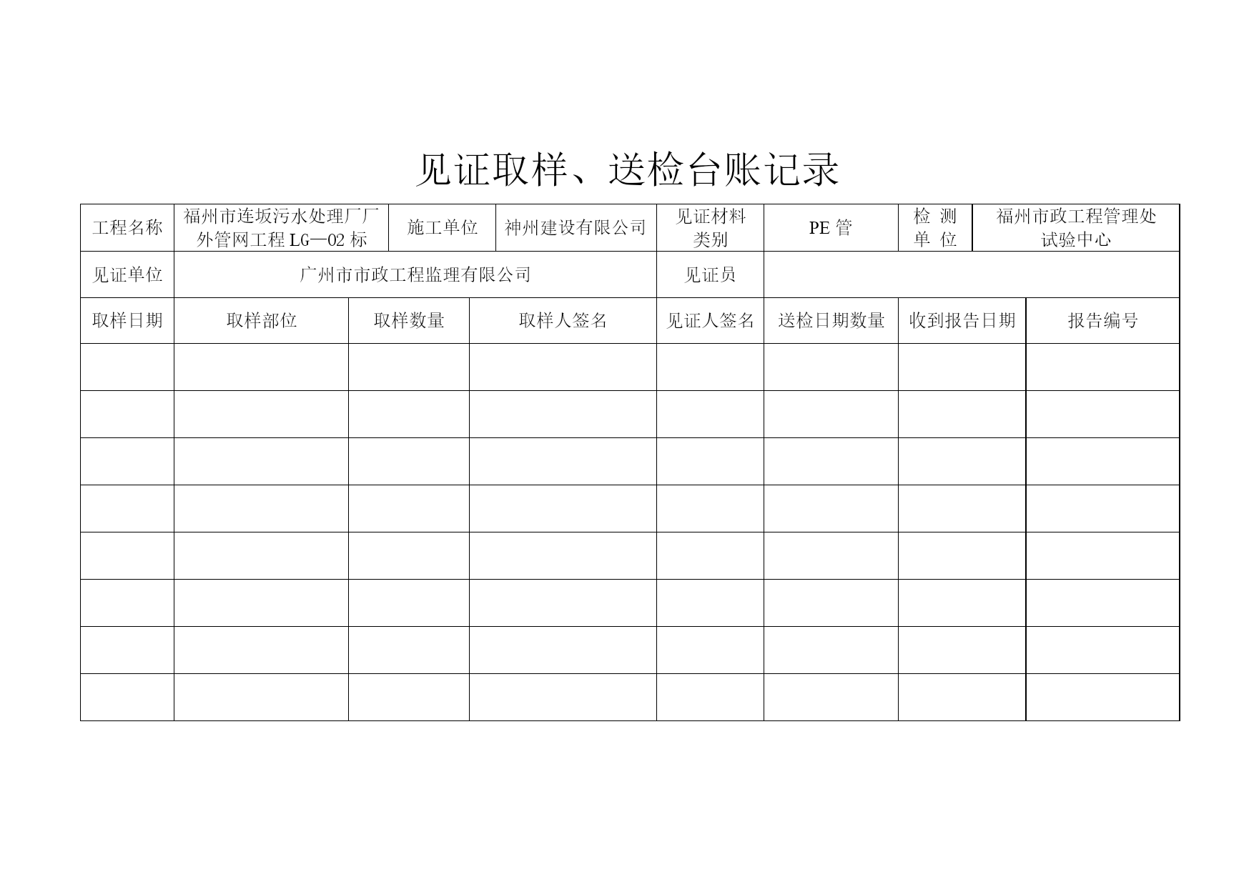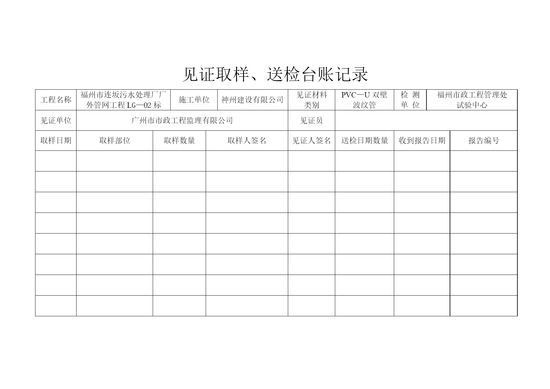 见证取样、送检台账记录工程名称施工单位见证材料类别检测单位见证单位见证员取样日期取样部位取样数量取样人签名见证人签名送检日期数量收到报告日期报告编号见证取样、送检台账记录工程名称福州市连坂污水处理厂厂外管网工程LG—02标施工单位神州建设有限公司见证材料类别钢筋检测单位福州市政工程管理处试验中心见证单位广州市市政工程监理有限公司见证员取样日期取样部位取样数量取样人签名见证人签名送检日期数量收到报告日期报告编号见证取样、送检台账记录工程名称福州市连坂污水处理厂厂外管网工程LG—02标施工单位神州建设有限公司见证材料类别PE管检测单位福州市政工程管理处试验中心见证单位广州市市政工程监理有限公司见证员取样日期取样部位取样数量取样人签名见证人签名送检日期数量收到报告日期报告编号见证取样、送检台账记录工程名称福州市连坂污水处理厂厂外管网工程LG—02标施工单位神州建设有限公司见证材料类别PVC—U双壁波纹管检测单位福州市政工程管理处试验中心见证单位广州市市政工程监理有限公司见证员取样日期取样部位取样数量取样人签名见证人签名送检日期数量收到报告日期报告编号