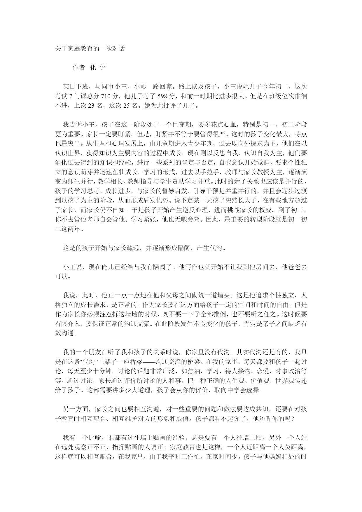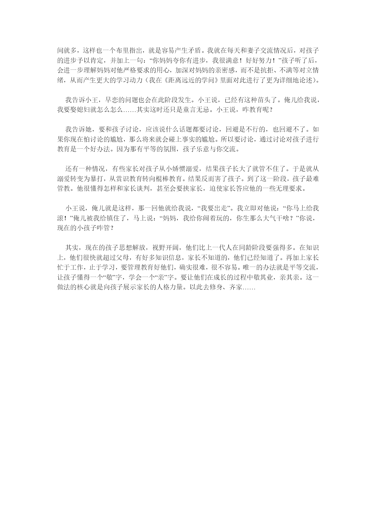 关于家庭教育的一次对话作者化俨某日下班,与同事小王、小影一路回家。路上谈及孩子,小王说她儿子今年初一,这次考试7门课总分710分,他儿子考了598分,和前一时期比进步很大。但是在班级位次徘徊不进,上次23名,这次25名。她为此批评了儿子。我告诉小王,孩子在这一阶段处于一个巨变期,要多花点心血,特别是初一、初二阶段更为重要。家长一定要盯紧。但是,盯紧并不等于要管得很严。这时的孩子变化最大,特点也最突出。从生理和心理发展上,由儿童期进入青少年期,过去以向外探求为主,他们在以认识世界、获得知识为主要内容的过程中成长。现在则以反思自我、认识自我为主,他们要消化过去得到的知识和经验,进行一些系列的肯定与否定,自我意识开始觉醒,要求个性独立的意识萌芽并迅速茁壮成长。学习的形式,过去以手拉手、教师与家长教授为主,逐渐演变为师生并行,教学相长,教师指导与学生资助学习并重。此时的亲子关系也应该是并行的,孩子的学习思考、成长进步,与家长的督导启发、引导干预是并重并行的,并且会逐步过渡到以孩子为主的阶段,从而形成后发优势。说不定某一天孩子突然长大了,在有些地方超过了家长,而家长仍不自知。于是孩子开始产生逆反心理,进而挑战家长的权威。到了初三,你不去管他老师自会管他。学习紧张,他也无暇旁骛。因此,最重要的转型阶段就是初一初二这两年。这是的孩子开始与家长疏远,并逐渐形成隔阂,产生代沟。小王说,现在俺儿已经给与我有隔阂了。他写作也就开始不让我到他房间去,他爸爸去可以。我说,此时,他正一点一点地在他和父母之间砌筑一道墙头。这是他追求个性独立、人格独立的成长需求,是正常的。作为家长要在这方面给孩子一定的空间和时间的自由。但是作为家长你必须注意拆这堵墙的时候,既不要一下子全部推倒,也不要听之任之。这时候要有限介入,要保证正常的沟通交流。在此阶段发生不良变化的孩子,肯定是亲子之间缺乏有效沟通。我的一个朋友在听了我和孩子的关系时说,你家里没有代沟。其实代沟还是有的,我只是在这条“代沟”上架了一座桥梁——沟通交流的桥梁。在我的家里,每天都要和孩子一起讨论,每天至少十分钟。讨论的话题非常广泛,如焦油、学习、待人接物、恋爱、时事政治等等。通过讨论,家长通过评价所讨论的人和事,把一种正确的人生观、价值观、世界观传递给了孩子。这部需要讲多少大道理,孩子会从你的评价、取向中学会选择。另一方面,家长之间也要相互沟通,对一些重要的问题和做法要达成共识,还要在对孩子教育时相互配合、相互维护对方的形象和威信。孩子都看不起你了,他还听你的吗?我有一个比喻,谁都有过往墙上贴画的经验,总是要有一个人往墙上贴,另外一个人站在远处观察正不正,指挥贴画的人调正。家庭教育也是这样,一个人近距离一个人员距离,这样就可以相互配合。在我家里,由于我平时工作忙,在家时间少。孩子与他妈妈相处的时间就多,这样也一个布里指出,就是容易产生矛盾。我就在每天和妻子交流情况后,对孩子的进步予以肯定,并加上一句:“你妈妈夸你有进步,我很满意!好好努力!”孩子听了后,会进一步理解妈妈对他严格要求的用心,加深对妈妈的亲密感,而不是抗拒、不满等对立情绪,从而产生更大的学习动力(我在《距离远近的学问》里面对此进行了更为详细地论述)。我告诉小王,早恋的问题也会在此阶段发生。小王说,已经有这种苗头了。俺儿给我说,我要娶媳妇就怎么怎么……其实这时还只是童言无忌。小王说,咋教育呢?我告诉她,要和孩子讨论,应该说什么话题都要讨论,回避是不行的,也回避不了。如果你现在怕讨论的尴尬,那么将来就会碰上事实的尴尬。所以要讨论,通过讨论对孩子进行教育是一个好办法。因为那有平等的氛围,孩子乐意与你交流。还有一种情况,有些家长对孩子从小娇惯溺爱,结果孩子长大了就管不住了。于是就从溺爱转变为暴打,从赏识教育转向棍棒教育。结果反而害了孩子。到了这一阶段,孩子最难管教。他很懂得怎样和家长谈判,甚至会要挟家长,迫使家长答应他的一些无理要求。小王说,俺儿就是这样,那一回他就给我说,“我要出走”。我立即对他说:“你马上给我滚!”俺儿被我给镇住了,马上说:“妈妈,我给你闹着玩的,你生那么大气干啥?”你说,现在的小孩子咋管?其实,现在的孩子思想解放,视野开阔,他们比上一代人在同龄阶段要强得多。在知识上,他们很快就超过父母,有好多知识信息,家长不知道的,他们已经知道了。再加上家长忙于工作,止于学习,要管理教育好他们,确实很难,很不容易。唯一的办法就是平等交流,让孩子懂得一个“敬”字,学会一个“亲”字。要让他们在成长的过程中敬其业,亲其亲。这一做法的核心就是向孩子展示家长的人格力量。以此去修身、齐家……