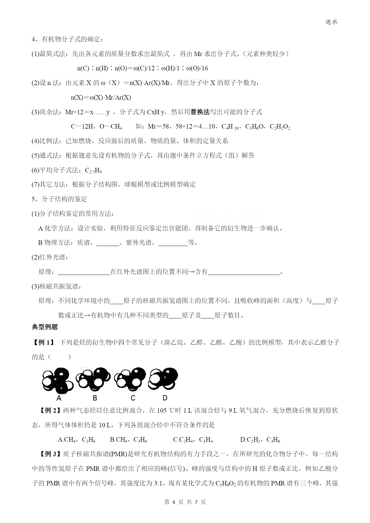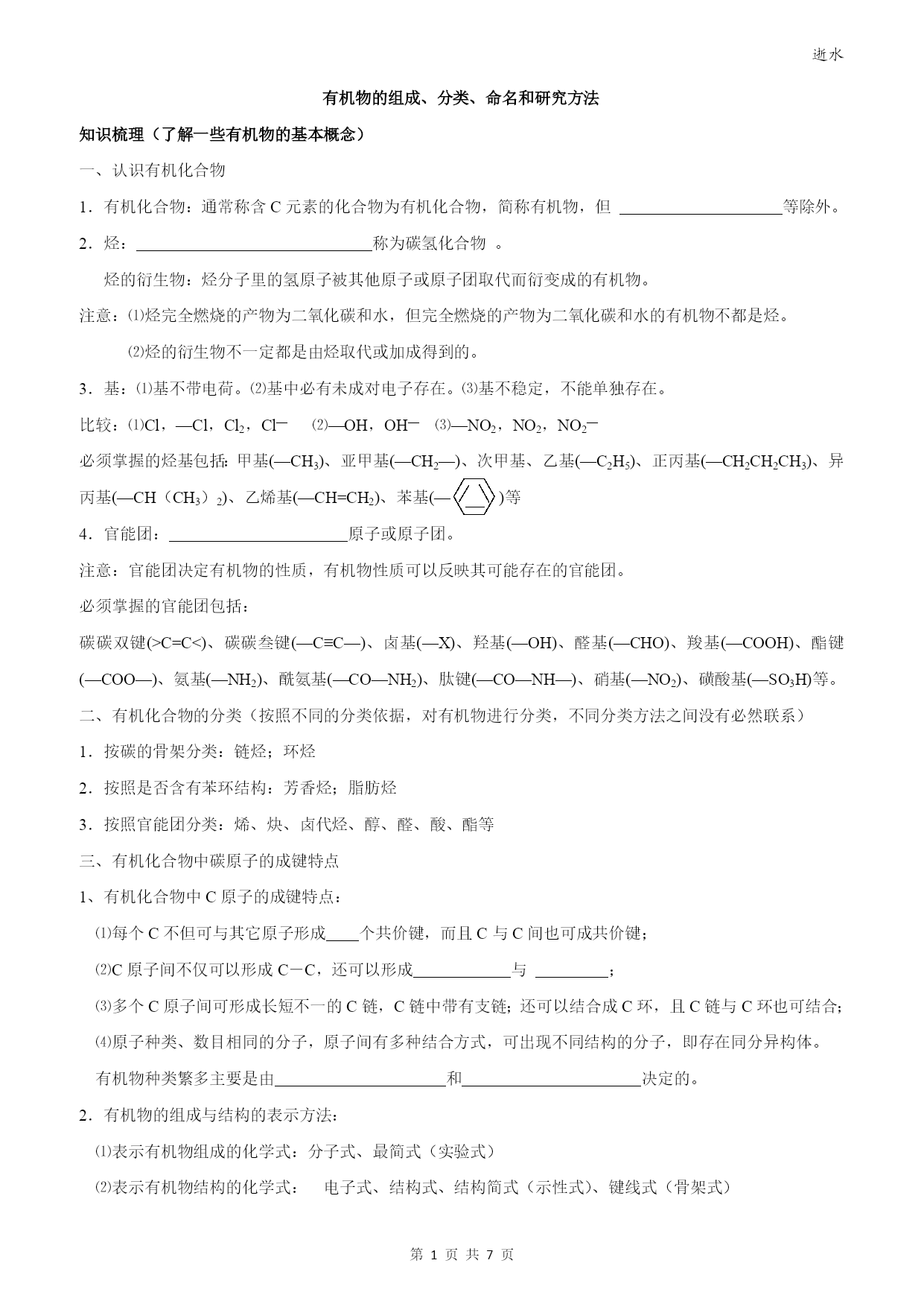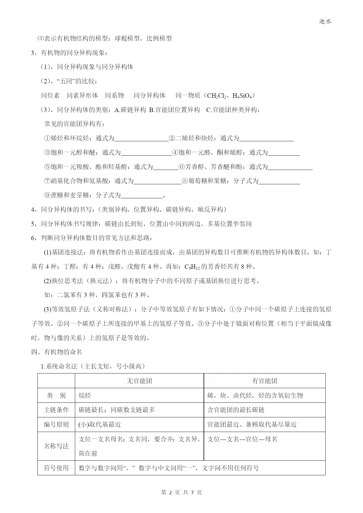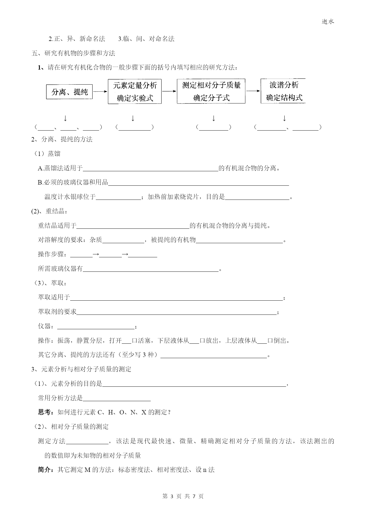 逝水第页共NUMPAGES7页有机物的组成、分类、命名和研究方法知识梳理(了解一些有机物的基本概念)一、认识有机化合物1.有机化合物:通常称含C元素的化合物为有机化合物,简称有机物,但等除外。2.烃:称为碳氢化合物。烃的衍生物:烃分子里的氢原子被其他原子或原子团取代而衍变成的有机物。注意:⑴烃完全燃烧的产物为二氧化碳和水,但完全燃烧的产物为二氧化碳和水的有机物不都是烃。⑵烃的衍生物不一定都是由烃取代或加成得到的。3.基:⑴基不带电荷。⑵基中必有未成对电子存在。⑶基不稳定,不能单独存在。比较:⑴Cl,—Cl,Cl2,Cl—⑵—OH,OH—⑶—NO2,NO2,NO2—必须掌握的烃基包括:甲基(—CH3)、亚甲基(—CH2—)、次甲基、乙基(—C2H5)、正丙基(—CH2CH2CH3)、异丙基(—CH(CH3)2)、乙烯基(—CH=CH2)、苯基(—)等4.官能团:原子或原子团。注意:官能团决定有机物的性质,有机物性质可以反映其可能存在的官能团。必须掌握的官能团包括:碳碳双键(>C=C<)、碳碳叁键(—C≡C—)、卤基(—X)、羟基(—OH)、醛基(—CHO)、羧基(—COOH)、酯键(—COO—)、氨基(—NH2)、酰氨基(—CO—NH2)、肽键(—CO—NH—)、硝基(—NO2)、磺酸基(—SO3H)等。二、有机化合物的分类(按照不同的分类依据,对有机物进行分类,不同分类方法之间没有必然联系)1.按碳的骨架分类:链烃;环烃2.按照是否含有苯环结构:芳香烃;脂肪烃3.按照官能团分类:烯、炔、卤代烃、醇、醛、酸、酯等三、有机化合物中碳原子的成键特点1、有机化合物中C原子的成键特点:⑴每个C不但可与其它原子形成个共价键,而且C与C间也可成共价键;⑵C原子间不仅可以形成C-C,还可以形成与;⑶多个C原子间可形成长短不一的C链,C链中带有支链;还可以结合成C环,且C链与C环也可结合;⑷原子种类、数目相同的分子,原子间有多种结合方式,可出现不同结构的分子,即存在同分异构体。有机物种类繁多主要是由和决定的。2.有机物的组成与结构的表示方法:⑴表示有机物组成的化学式:分子式、最简式(实验式)⑵表示有机物结构的化学式:电子式、结构式、结构简式(示性式)、键线式(骨架式)⑶表示有机物结构的模型:球棍模型、比例模型3、有机物的同分异构现象:w.w.w.k.s.5.u.c.o.m(1)、同分异构现象与同分异构体(2)、“五同”的比较:同位素同素异形体同系物同分异构体同一物质(CH2Cl2、H4SiO4)(3)、同分异构体的类别:A.碳链异构B.官能团位置异构w.w.w.k.s.5.u.c.o.mC.官能团种类异构:常见的官能团异构有:①烯烃和环烷烃:通式为②二烯烃和炔烃:通式为③饱和一元醇和醚:通式为④饱和一元醛、酮和烯醇:通式为⑤饱和一元羧酸、酯和羟基醛:通式为⑥芳香醇、芳香醚和酚:通式为⑦硝基化合物和氨基酸:通式为⑧葡萄糖和果糖:分子式为⑨蔗糖和麦芽糖:分子式为。4、同分异构体的书写:(类别异构、位置异构、碳链异构、顺反异构)5、同分异构体书写规律:碳链由长到短、位置由中间到两边,多基位置孪邻间6、判断同分异构体数目的常见方法和思路:(1)基团连接法:将有机物看作由基团连接而成,由基团的异构数目可推断有机物的异构体数目。如:丁基有4种;丁醇:有4种;戊醛、戊酸有4种。再如:C9H12的芳香烃共有8种。(2)换位思考法(换元法):将有机物分子中的不同原子或基团换位进行思考。如:二氯苯有3种,四氯苯也有3种。(3)等效氢原子法(又称对称法):分子中等效氢原子有如下情况:①分子中同一个碳原子上连接的氢原子等效。②同一个碳原子上所连接的甲基上的氢原子等效。③分子中处于镜面对称位置(相当于平面镜成像时,物与像的关系)上的氢原子是等效的。四、有机物的命名1.系统命名法(主长支短,号小级高)无官能团有官能团类别烷烃烯、炔、卤代烃、烃的含氧衍生物主链条件碳链最长;同碳数支链最多含官能团的最长碳链编号原则(小)取代基最近官能团最近、兼顾取代基尽量近名称写法支位一支名母名;支名同,要合并;支名异,简在前支位―支名―官位―母名符号使用数字与数字间用“,”数字与中文间用“一”,文字间不用任何符号2.正、异、新命名法3.临、间、对命名法五、研究有机物的步骤和方法1、请在研究有机化合物的一般步骤下面的括号内填写相应的研究方法:↓↓↓↓(、、)()()(、)2、分离、提纯的方法(1)蒸馏A.蒸馏法适用于的有机混合物的分离。B.必须的玻璃仪器和用品温度计水银球位于;加热前加素烧瓷片,目的是。(2)、重结晶:重结晶适用于的有机混合物的分离与提纯。对溶解度的要求:杂质,被提纯的有机物。操作步骤:→→所需玻璃仪器有。(3)、萃取:萃取适用于;萃取剂的要求;仪器:;