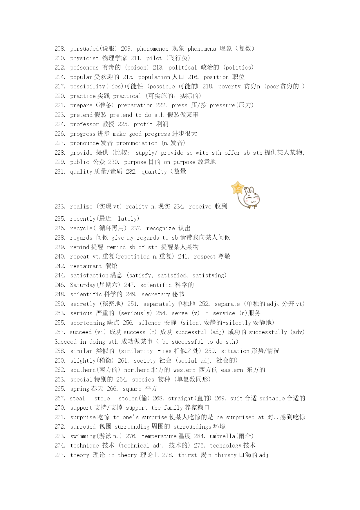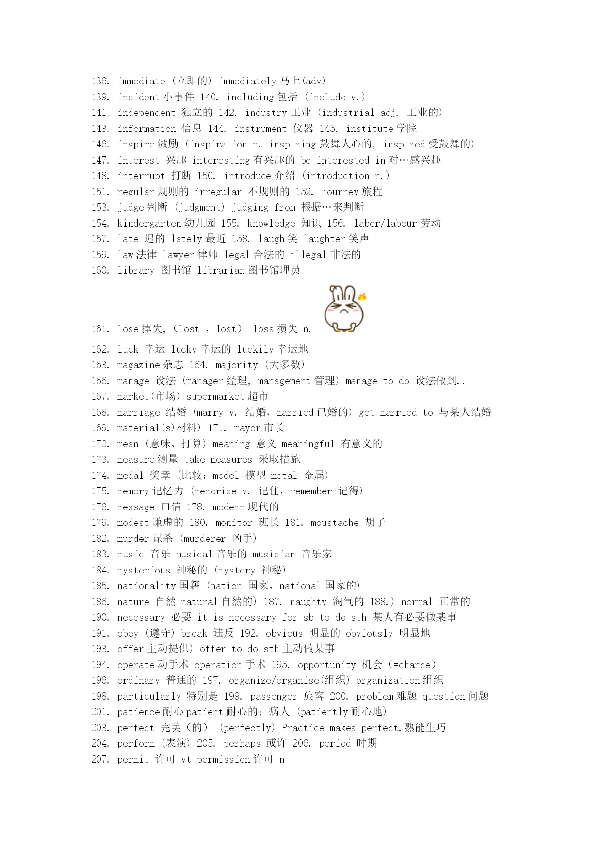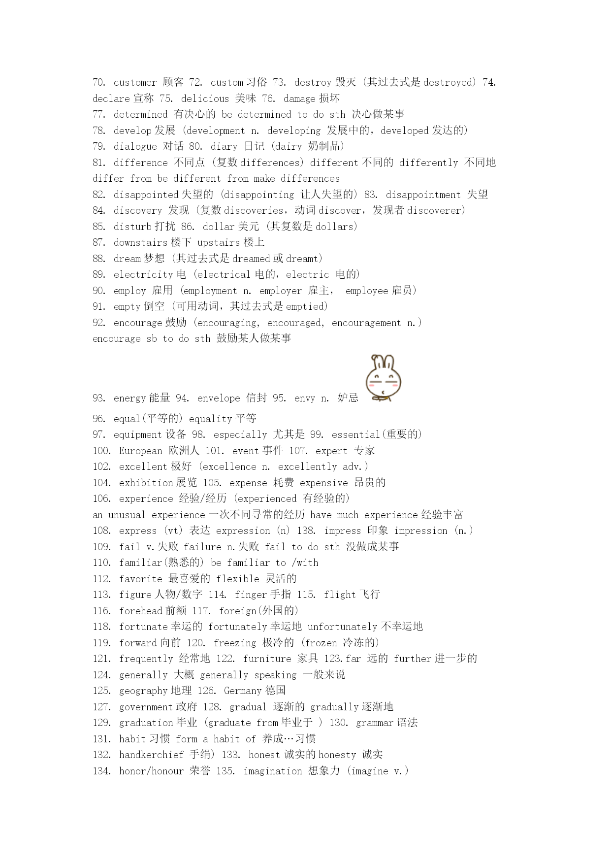 1.abroad国外2.absencen.缺席(absentadj.)3.accept接受)4.accident事故(accidentaladj.偶然的,accidentallyadv.偶然地)5.achievement成就(achievev.获得)6.address地址7.admire钦佩8.admit承认(admitted)9.agreement协议10.agriculture农业(agriculturaladj.农业的)industry工业(industrial工业的)11.altogether总共12.ancient古代的13.announce宣告、通知announcement(n.口头通知)14.anxiety忧虑(anxiousadj.焦急的,anxiouslyadv.焦急地)15.apologizev.道歉(apologyn.道歉)16.appear出现(appearance外貌n.)disappear消失/不见17.appreciate感激/欣赏(感激人用thanksb;谢谢某人做的事用appreciatesth.)18.Asian(亚洲的)19.assistant助手20.astonish吃惊(astonishmentn.吃惊,astonishing令吃惊的,astonished吃惊的)21.astronaut宇航员22.atmosphere气氛23.attempt尝试(n/v)attempttodosth24.attentively专心地25.attention专心payattentiontodoingsth26.attitude态度27.attract吸引(attraction吸引力)28.average平均/平均的onaverage平均30.balance平衡keepthebalanceofnature保持生态平衡31.beauty美(beautiful,beautifully)beautify美化32.believe相信(beliefn.信念,其复数是beliefs)33.beyond超过34.biology生物35.birthday生日36.bravery勇敢brave勇敢的bravely勇敢地37.broad宽阔的38.broadcast广播(broadcast;broadcast;)39.care关心careful小心的carefully小心地40.ceiling天花板41.cinema电影院42.celebrate庆祝43.celebration庆祝n.44.century世纪45.challenge挑战46.character性格47.charge收费bechargeof/takechargeof管理…48.comfortv.&n.安慰comfortable舒适的adj.comfortablyadv.舒适地50.comment评论51.communicate(vt)communication(n)交流52.competition竞赛(competev.竞赛competitor竞赛者)53.composition作文54.concert音乐会55.concludev.conclusionn.结论56.condition情况(conditions条件)57.concern关心(vt)58.congratulations祝贺(congratulatev.)59.constant不断的constantly不断地60.construction(建设)61.continue继续62.contribution贡献(contributev.)makecontributionsto对…做出贡献63.convenient(adj.)方便的conveniently方便地64.conversation谈话65.coughing咳嗽66.cousin表兄弟67.cruel的(adj.cruelly残酷地adv.)68.curious好奇的(curiosityn.好奇)69.culture(cultural文化的adj.)70.customer顾客72.custom习俗73.destroy毁灭(其过去式是destroyed)74.declare宣称75.delicious美味76.damage损坏77.determined有决心的bedeterminedtodosth决心做某事78.develop发展(developmentn.developing发展中的,developed发达的)79.dialogue对话80.diary日记(dairy奶制品)81.difference不同点(复数differences)different不同的differently不同地differfrombedifferentfrommaked