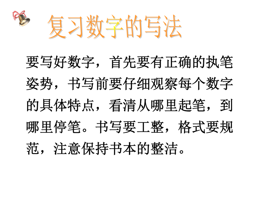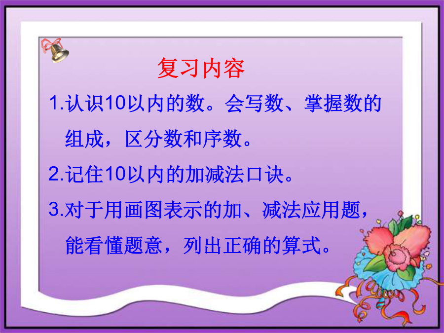 第二章复习内容复习数字的写法序数和数的区别比较数的大小数字的组成点击学一学加法口诀点击学习减法口诀连加要分两步进行计算,先把前两个数相加,记住得数,再用这个得数和第三个数相加。连减就是从一个数里去掉一部分,再去掉一部分,求还剩多少。三个数连减,先把前两个数相减,记住得数,再用这个得数减去第三个数。加减混合算式看图列式计算再见