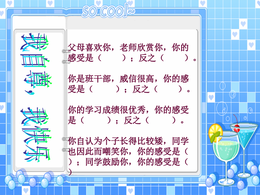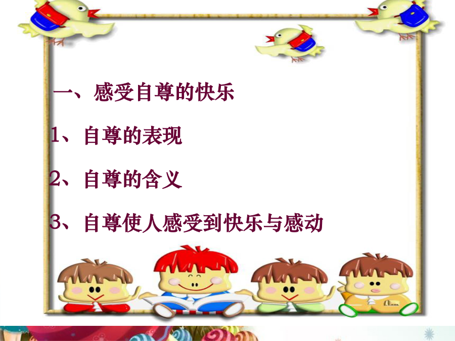 第一框自尊是人人都需要的香港回归香港回家了一、感受自尊的快乐1、自尊的表现2、自尊的含义3、自尊使人感受到快乐与感动我自尊,我快乐二、知耻与自尊1、知耻是自尊的重要表现2、正确的对待自己的缺点我知耻,我自尊品味知耻问:知耻与自尊的关系是什么?悦纳自己,重塑自尊大科学家爱因斯坦小时候在课堂上做手工,老师要求每个学生做一只小板凳。全班学生纷纷把做出来的小板凳交给老师并得到了老师的夸奖,唯有爱因斯坦迟迟才交他的手工活,老师看过之后高高举起,用嘲笑的口气对全班同学说:“谁见过世界上比这更丑的板凳吗?”全班同学哄堂大笑。爱因斯坦站起来大声说:“有,同学们。”他从抽屉里拿出一只更丑的小板凳高高举起:“这就是我第一次做的小板凳。”三、虚荣与自尊1、虚荣的含义2、虚荣的行为表现3、虚荣的危害问:自尊和虚荣的关系是什么?