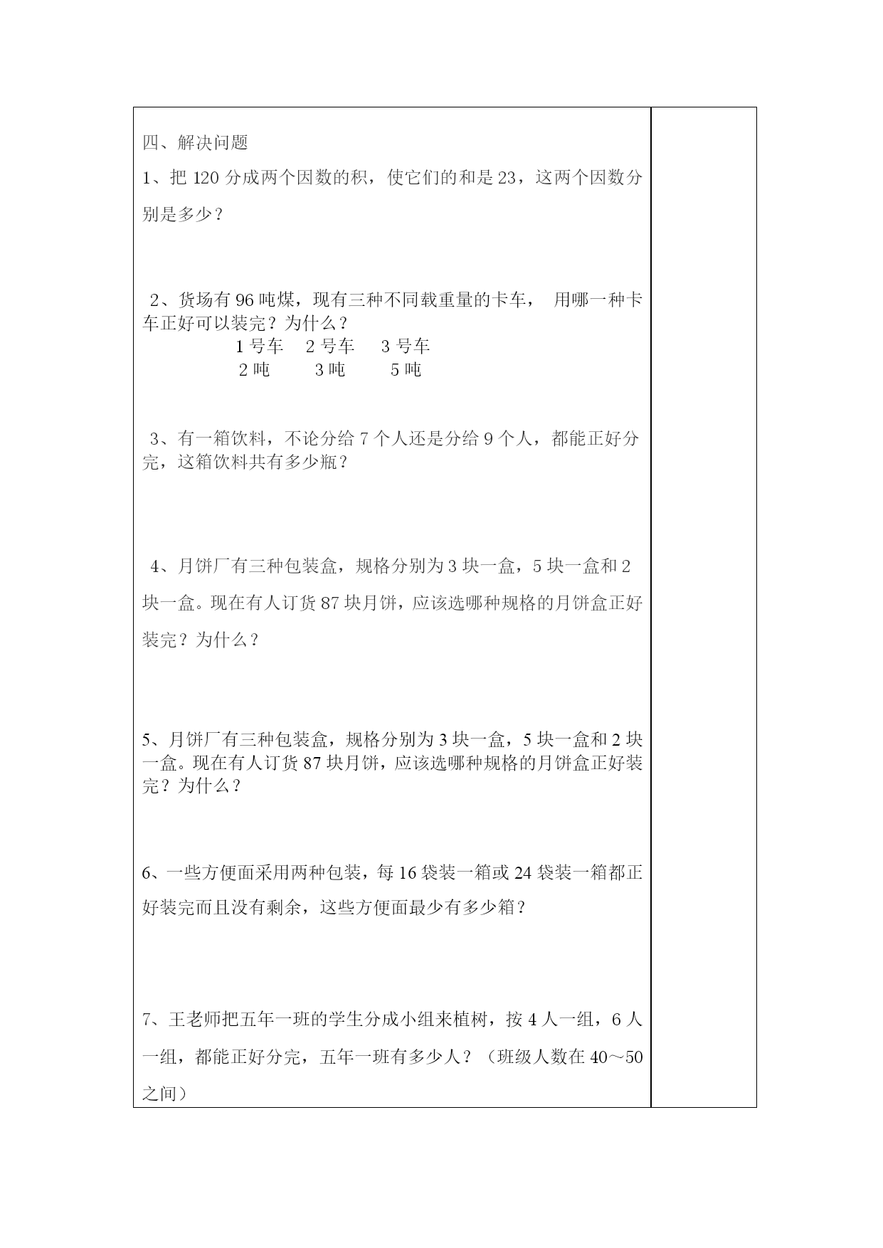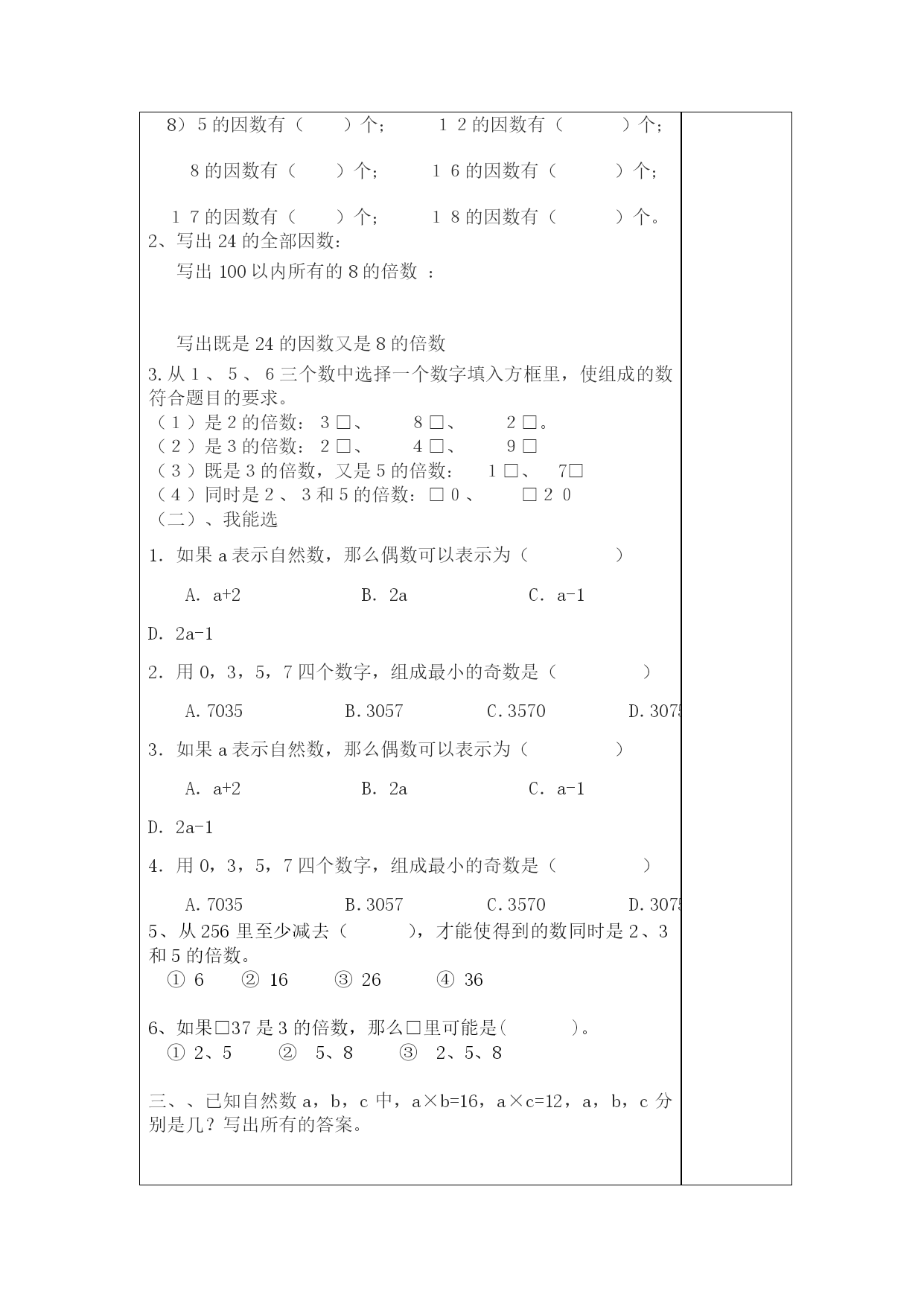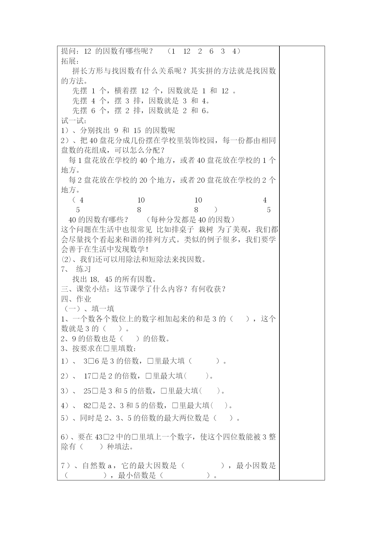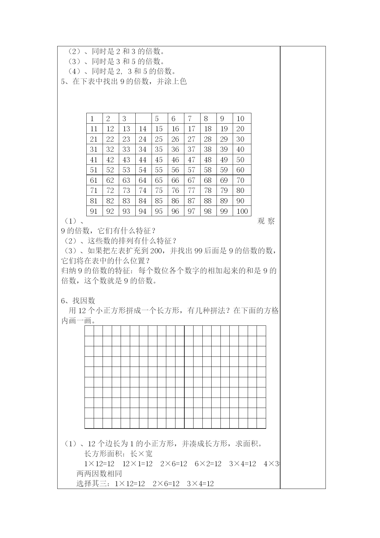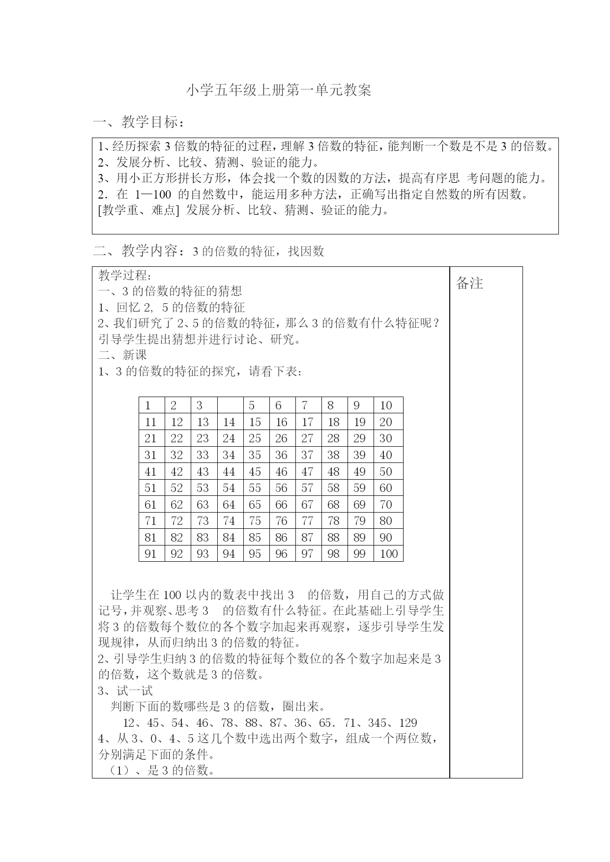 小学五年级上册第一单元教案一、教学目标:1、经历探索3倍数的特征的过程,理解3倍数的特征,能判断一个数是不是3的倍数。2、发展分析、比较、猜测、验证的能力。3、用小正方形拼长方形,体会找一个数的因数的方法,提高有序思考问题的能力。2.在1—100的自然数中,能运用多种方法,正确写出指定自然数的所有因数。[教学重、难点]发展分析、比较、猜测、验证的能力。二、教学内容:3的倍数的特征,找因数教学过程:一、3的倍数的特征的猜想1、回忆2,5的倍数的特征2、我们研究了2、5的倍数的特征,那么3的倍数有什么特征呢?引导学生提出猜想并进行讨论、研究。二、新课1、3的倍数的特征的探究,请看下表:12356789101112131415161718192021222324252627282930313233343536373839404142434445464748495051525354555657585960616263646566676869707172737475767778798081828384858687888990919293949596979899100让学生在100以内的数表中找出3的倍数,用自己的方式做记号,并观察、思考3的倍数有什么特征。在此基础上引导学生将3的倍数每个数位的各个数字加起来再观察,逐步引导学生发现规律,从而归纳出3的倍数的特征。2、引导学生归纳3的倍数的特征:每个数位的各个数字加起来是3的倍数,这个数就是3的倍数。3、试一试判断下面的数哪些是3的倍数,圈出来。12、45、54、46、78、88、87、36、65.71、345、1294、从3、0、4、5这几个数中选出两个数字,组成一个两位数,分别满足下面的条件。(1)、是3的倍数。(2)、同时是2和3的倍数。(3)、同时是3和5的倍数。(4)、同时是2,3和5的倍数。5、在下表中找出9的倍数,并涂上色12356789101112131415161718192021222324252627282930313233343536373839404142434445464748495051525354555657585960616263646566676869707172737475767778798081828384858687888990919293949596979899100(1)、观察9的倍数,它们有什么特征?(2)、这些数的排列有什么特征?(3)、如果把左表扩充到200,并找出99后面是9的倍数的数,它们将在表中的什么位置?归纳9的倍数的特征:每个数位各个数字的相加起来的和是9的倍数,这个数就是9的倍数。6、找因数用12个小正方形拼成一个长方形,有几种拼法?在下面的方格内画一画。(1)、12个边长为1的小正方形,并凑成长方形,求面积。长方形面积:长×宽1×12=1212×1=122×6=126×2=123×4=124×3=12两两因数相同选择其三:1×12=122×6=123×4=12提问:12的因数有哪些呢?(1122634)拓展:拼长方形与找因数有什么关系呢?其实拼的方法就是找因数的方法。先摆1个,横着摆12个,因数就是1和12。先摆4个,摆3排,因数就是3和4。先摆6个,摆2排,因数就是2和6。试一试:1)、分别找出9和15的因数呢2)、把40盘花分成几份摆在学校里装饰校园,每一份都由相同盘数的花组成,可以怎么分配?每1盘花放在学校的40个地方,或者40盘花放在学校的1个地方。每2盘花放在学校的20个地方,或者20盘花放在学校的2个地方。(410104588)540的因数有哪些?(每种分发都是40的因数)这个问题在生活中也很常见比如排桌子栽树为了美观,我们都会尽量找个看起来和谐的排列方式。类似的例子很多,我们要学会善于在生活中发现数学!(2)、我们还可以用除法和短除法来找因数。7、练习找出18,45的所有因数。三、课堂小结:这节课学了什么内容?有何收获?四、作业(一)、填一填1、一个数各个数位上的数字相加起来的和是3的(),这个数就是3的()。2、9的倍数也是()的倍数。3、按要求在□里填数:1)、3□6是3的倍数,□里最大填()。2)、17□是2的倍数,□里最大填()。3)、25□是3和5的倍数,□里最大填()。4)、82□是2、3和5的倍数,□里最大填()。5)、同时是2、3、5的倍数的最大两位数是()。6)、要在43□2中的□里填上一个数字,使这个四位数能被3整除有()种填法。7)、自然数a,它的最大因数是(),最小因数是(),最小倍数是()。8)5的因数有()个;12的因数有()个;8的因数有()个;16的因数有()个;17的因数有()个;18的因数有()个。2、写出24的全部因数:写出100以内所有的8的倍数:写出既是24的因数又是8