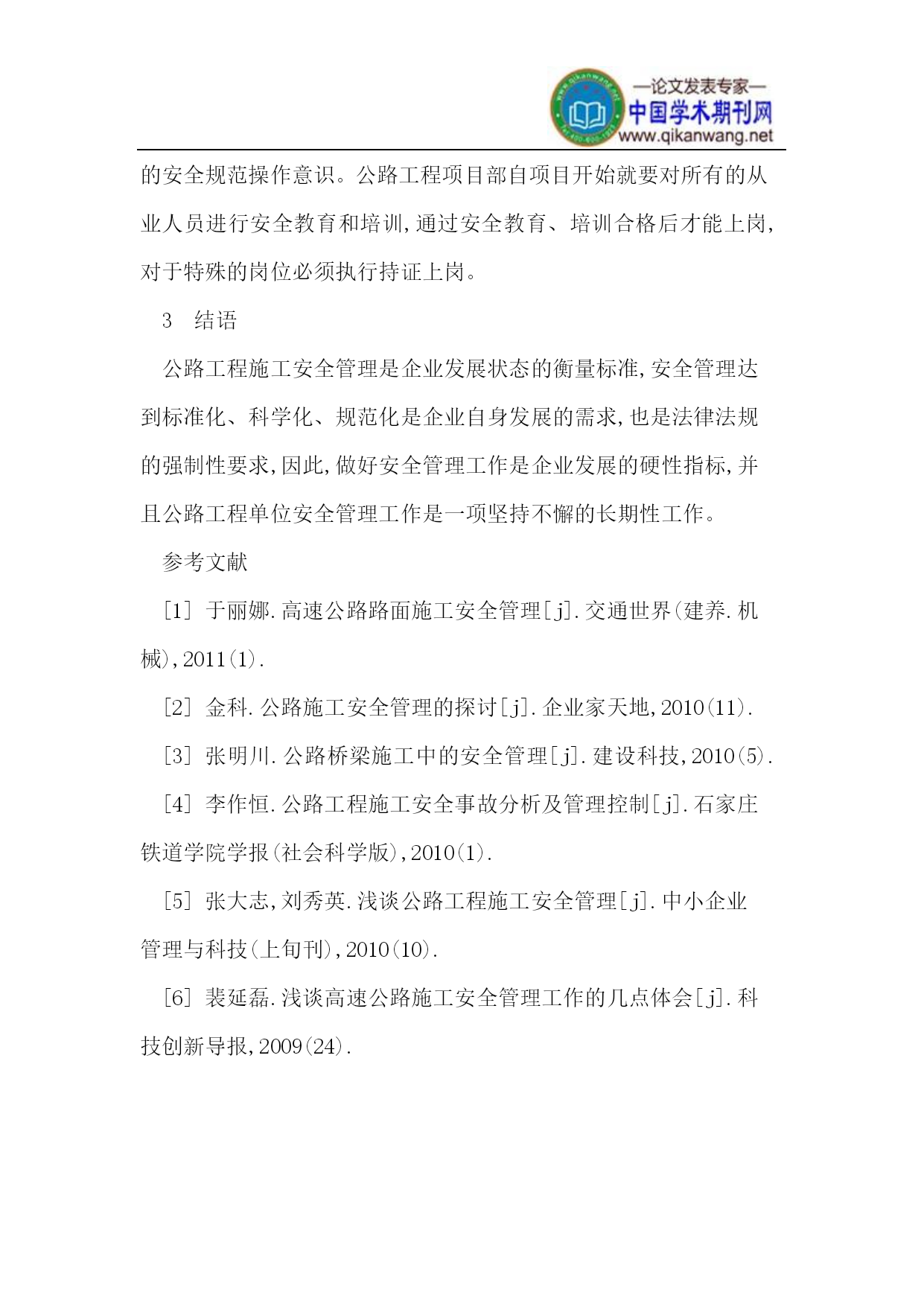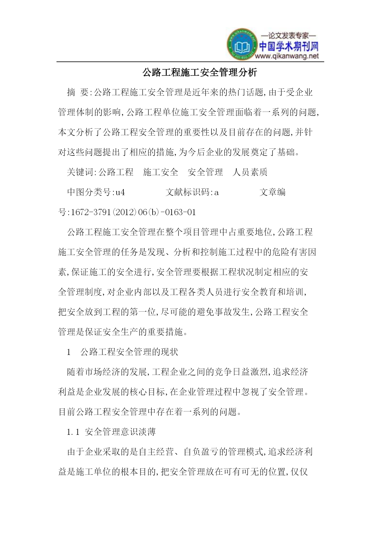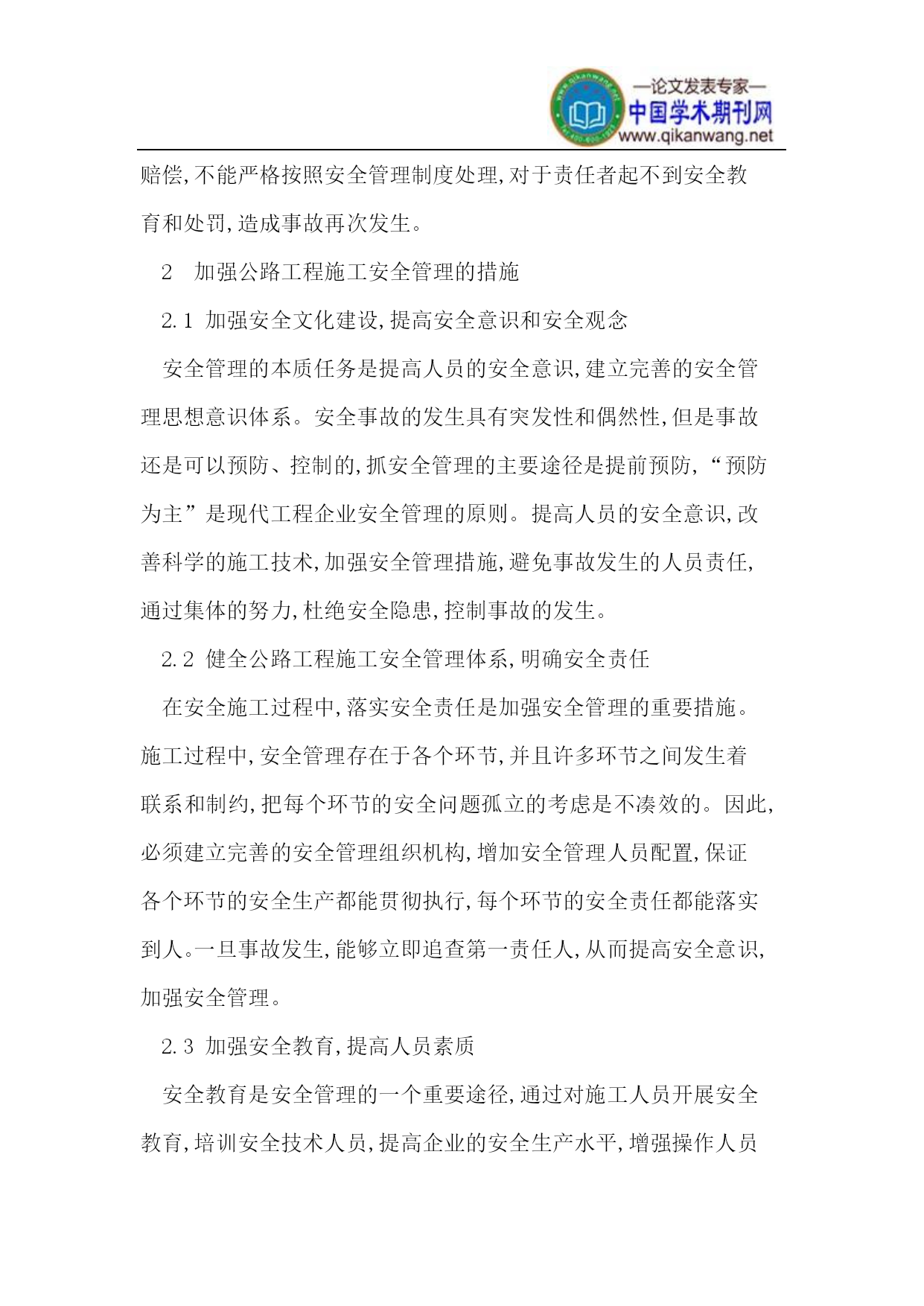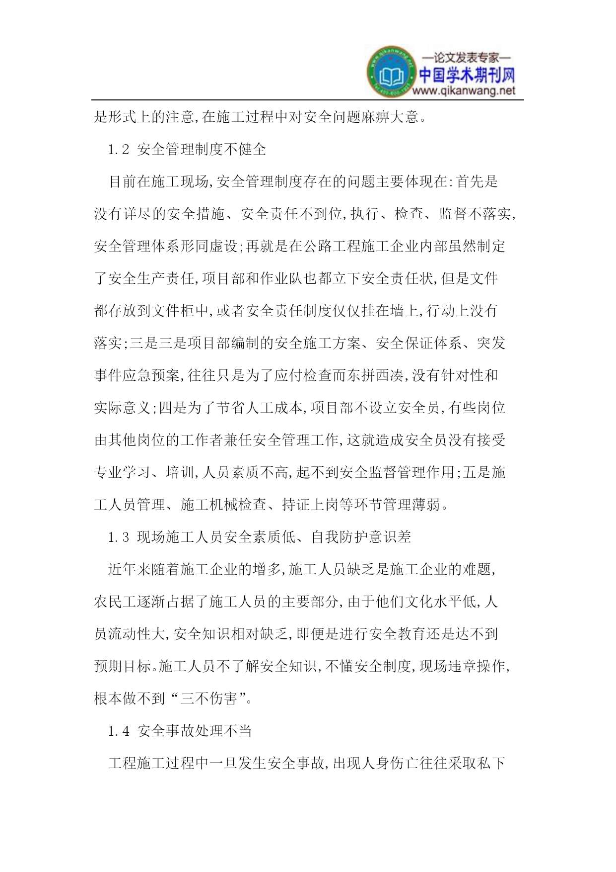 公路工程施工安全管理分析摘要:公路工程施工安全管理是近年来的热门话题,由于受企业管理体制的影响,公路工程单位施工安全管理面临着一系列的问题,本文分析了公路工程安全管理的重要性以及目前存在的问题,并针对这些问题提出了相应的措施,为今后企业的发展奠定了基础。关键词:公路工程施工安全安全管理人员素质中图分类号:u4文献标识码:a文章编号:1672-3791(2012)06(b)-0163-01公路工程施工安全管理在整个项目管理中占重要地位,公路工程施工安全管理的任务是发现、分析和控制施工过程中的危险有害因素,保证施工的安全进行,安全管理要根据工程状况制定相应的安全管理制度,对企业内部以及工程各类人员进行安全教育和培训,把安全放到工程的第一位,尽可能的避免事故发生,公路工程安全管理是保证安全生产的重要措施。1公路工程安全管理的现状随着市场经济的发展,工程企业之间的竞争日益激烈,追求经济利益是企业发展的核心目标,在企业管理过程中忽视了安全管理。目前公路工程安全管理中存在着一系列的问题。1.1安全管理意识淡薄由于企业采取的是自主经营、自负盈亏的管理模式,追求经济利益是施工单位的根本目的,把安全管理放在可有可无的位置,仅仅是形式上的注意,在施工过程中对安全问题麻痹大意。1.2安全管理制度不健全目前在施工现场,安全管理制度存在的问题主要体现在:首先是没有详尽的安全措施、安全责任不到位,执行、检查、监督不落实,安全管理体系形同虚设;再就是在公路工程施工企业内部虽然制定了安全生产责任,项目部和作业队也都立下安全责任状,但是文件都存放到文件柜中,或者安全责任制度仅仅挂在墙上,行动上没有落实;三是三是项目部编制的安全施工方案、安全保证体系、突发事件应急预案,往往只是为了应付检查而东拼西凑,没有针对性和实际意义;四是为了节省人工成本,项目部不设立安全员,有些岗位由其他岗位的工作者兼任安全管理工作,这就造成安全员没有接受专业学习、培训,人员素质不高,起不到安全监督管理作用;五是施工人员管理、施工机械检查、持证上岗等环节管理薄弱。1.3现场施工人员安全素质低、自我防护意识差近年来随着施工企业的增多,施工人员缺乏是施工企业的难题,农民工逐渐占据了施工人员的主要部分,由于他们文化水平低,人员流动性大,安全知识相对缺乏,即便是进行安全教育还是达不到预期目标。施工人员不了解安全知识,不懂安全制度,现场违章操作,根本做不到“三不伤害”。1.4安全事故处理不当工程施工过程中一旦发生安全事故,出现人身伤亡往往采取私下赔偿,不能严格按照安全管理制度处理,对于责任者起不到安全教育和处罚,造成事故再次发生。2加强公路工程施工安全管理的措施2.1加强安全文化建设,提高安全意识和安全观念安全管理的本质任务是提高人员的安全意识,建立完善的安全管理思想意识体系。安全事故的发生具有突发性和偶然性,但是事故还是可以预防、控制的,抓安全管理的主要途径是提前预防,“预防为主”是现代工程企业安全管理的原则。提高人员的安全意识,改善科学的施工技术,加强安全管理措施,避免事故发生的人员责任,通过集体的努力,杜绝安全隐患,控制事故的发生。2.2健全公路工程施工安全管理体系,明确安全责任在安全施工过程中,落实安全责任是加强安全管理的重要措施。施工过程中,安全管理存在于各个环节,并且许多环节之间发生着联系和制约,把每个环节的安全问题孤立的考虑是不凑效的。因此,必须建立完善的安全管理组织机构,增加安全管理人员配置,保证各个环节的安全生产都能贯彻执行,每个环节的安全责任都能落实到人。一旦事故发生,能够立即追查第一责任人,从而提高安全意识,加强安全管理。2.3加强安全教育,提高人员素质安全教育是安全管理的一个重要途径,通过对施工人员开展安全教育,培训安全技术人员,提高企业的安全生产水平,增强操作人员的安全规范操作意识。公路工程项目部自项目开始就要对所有的从业人员进行安全教育和培训,通过安全教育、培训合格后才能上岗,对于特殊的岗位必须执行持证上岗。3结语公路工程施工安全管理是企业发展状态的衡量标准,安全管理达到标准化、科学化、规范化是企业自身发展的需求,也是法律法规的强制性要求,因此,做好安全管理工作是企业发展的硬性指标,并且公路工程单位安全管理工作是一项坚持不懈的长期性工作。参考文献[1]于丽娜.高速公路路面施工安全管理[j].交通世界(建养.机械),2011(1).[2]金科.公路施工安全管理的探讨[j].企业家天地,2010(11).[3]张明川.公路桥梁施工中的安全管理[j].建设科技,2010(5).[4]李作恒.公路工程施工安全事故分析及管理控制[j].石家庄铁道学院学报(社会科学版),2010(1).[5]张大志,刘秀英.浅谈公路工程施工安全管理[j].中小企业管理与科技(上旬刊),2010(10