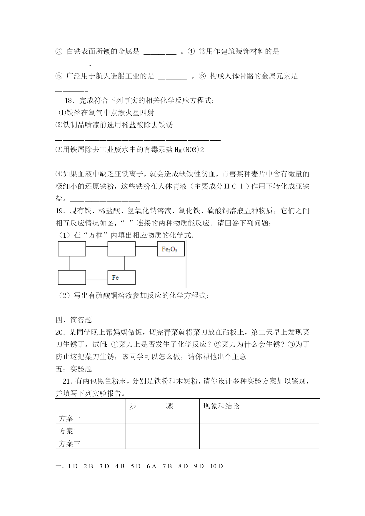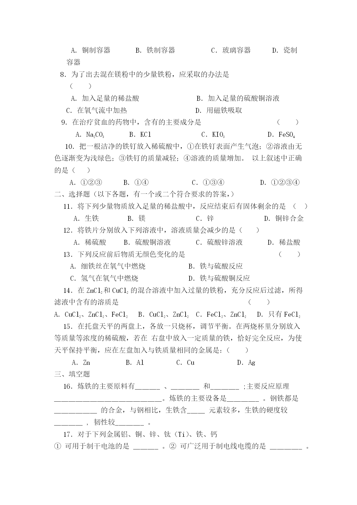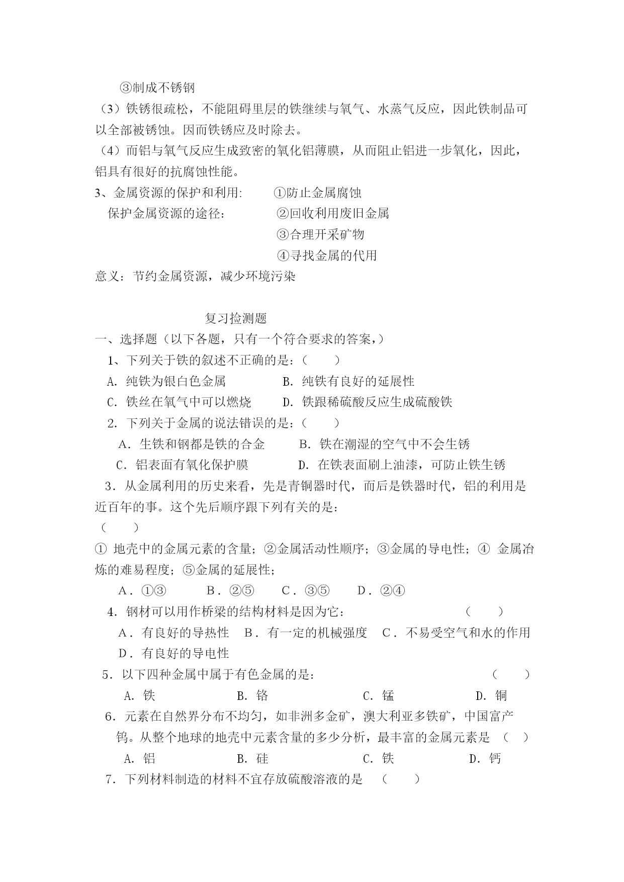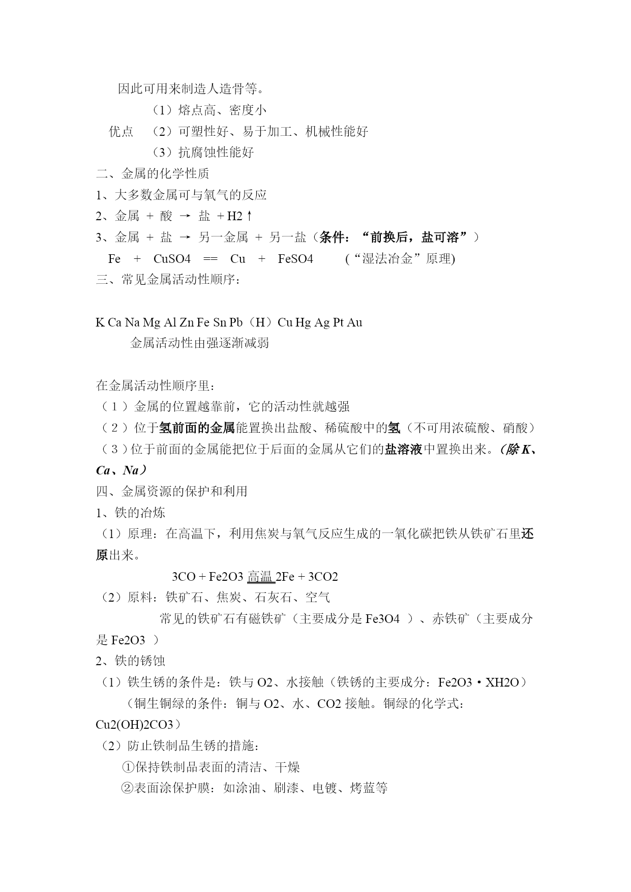 第八单元知识点第八单元知识点一、金属材料1、金属材料纯金属(90多种)合金(几千种)2、金属的物理性质:(1)常温下一般为固态(汞为液态),有金属光泽。(2)大多数呈银白色(铜为紫红色,金为黄色)(3)有良好的导热性、导电性、延展性3、金属之最:(1)铝:地壳中含量最多的金属元素(2)钙:人体中含量最多的金属元素(3)铁:目前世界年产量最多的金属(铁>铝>铜)(4)银:导电、导热性最好的金属(银>铜>金>铝)(5)铬:硬度最高的金属(6)钨:熔点最高的金属(7)汞:熔点最低的金属(8)锇:密度最大的金属(9)锂:密度最小的金属4、金属分类:黑色金属:通常指铁、锰、铬及它们的合金。重金属:如铜、锌、铅等有色金属轻金属:如钠、镁、铝等;有色金属:通常是指除黑色金属以外的其他金属。5、合金:由一种金属跟其他一种或几种金属(或金属与非金属)一起熔合而成的具有金属特性的物质。★:一般说来,合金的熔点比各成分低,硬度比各成分大,抗腐蚀性能更好合金铁的合金铜合金焊锡钛和钛合金形状记忆金属生铁钢黄铜青铜:成分含碳量2%~4.3%含碳量0.03%~2%铜锌合金铜锡合金铅锡合金钛镍合金备注不锈钢:含铬、镍的钢具有抗腐蚀性能紫铜为纯铜熔点低注:钛和钛合金:被认为是21世纪的重要金属材料,钛合金与人体有很好的“相容性”,因此可用来制造人造骨等。(1)熔点高、密度小优点(2)可塑性好、易于加工、机械性能好(3)抗腐蚀性能好二、金属的化学性质1、大多数金属可与氧气的反应2、金属+酸→盐+H2↑3、金属+盐→另一金属+另一盐(条件:“前换后,盐可溶”)Fe+CuSO4==Cu+FeSO4(“湿法冶金”原理)三、常见金属活动性顺序:KCaNaMgAlZnFeSnPb(H)CuHgAgPtAu金属活动性由强逐渐减弱在金属活动性顺序里:(1)金属的位置越靠前,它的活动性就越强(2)位于氢前面的金属能置换出盐酸、稀硫酸中的氢(不可用浓硫酸、硝酸)(3)位于前面的金属能把位于后面的金属从它们的盐溶液中置换出来。(除K、Ca、Na)四、金属资源的保护和利用1、铁的冶炼(1)原理:在高温下,利用焦炭与氧气反应生成的一氧化碳把铁从铁矿石里还原出来。3CO+Fe2O3高温2Fe+3CO2(2)原料:铁矿石、焦炭、石灰石、空气常见的铁矿石有磁铁矿(主要成分是Fe3O4)、赤铁矿(主要成分是Fe2O3)2、铁的锈蚀(1)铁生锈的条件是:铁与O2、水接触(铁锈的主要成分:Fe2O3·XH2O)(铜生铜绿的条件:铜与O2、水、CO2接触。铜绿的化学式:Cu2(OH)2CO3)(2)防止铁制品生锈的措施:①保持铁制品表面的清洁、干燥②表面涂保护膜:如涂油、刷漆、电镀、烤蓝等③制成不锈钢(3)铁锈很疏松,不能阻碍里层的铁继续与氧气、水蒸气反应,因此铁制品可以全部被锈蚀。因而铁锈应及时除去。(4)而铝与氧气反应生成致密的氧化铝薄膜,从而阻止铝进一步氧化,因此,铝具有很好的抗腐蚀性能。3、金属资源的保护和利用:①防止金属腐蚀保护金属资源的途径:②回收利用废旧金属③合理开采矿物④寻找金属的代用意义:节约金属资源,减少环境污染复习捡测题一、选择题(以下各题,只有一个符合要求的答案,)1、下列关于铁的叙述不正确的是:()A.纯铁为银白色金属B.纯铁有良好的延展性C.铁丝在氧气中可以燃烧D.铁跟稀硫酸反应生成硫酸铁2.下列关于金属的说法错误的是:()A.生铁和钢都是铁的合金B.铁在潮湿的空气中不会生锈C.铝表面有氧化保护膜D.在铁表面刷上油漆,可防止铁生锈3.从金属利用的历史来看,先是青铜器时代,而后是铁器时代,铝的利用是近百年的事。这个先后顺序跟下列有关的是:()=1\*GB3①地壳中的金属元素的含量;=2\*GB3②金属活动性顺序;=3\*GB3③金属的导电性;=4\*GB3④金属冶炼的难易程度;=5\*GB3⑤金属的延展性;A.=1\*GB3①=3\*GB3③B.=2\*GB3②=5\*GB3⑤C.=3\*GB3③=5\*GB3⑤D.=2\*GB3②=4\*GB3④4.钢材可以用作桥梁的结构材料是因为它:()A.有良好的导热性B.有一定的机械强度C.不易受空气和水的作用D.有良好的导电性5.以下四种金属中属于有色金属的是:()A.铁B.铬C.锰D.铜6.元素在自然界分布不均匀,如非洲多金矿,澳大利亚多铁矿,中国富产钨。从整个地球的地壳中元素含量的多少分析,最丰富的金属元素是()A.铝B.硅C.铁D.钙7.下列材料制造的材料不宜存放硫酸溶液的是()A.铜制容器B.铁制容器C.玻璃容器D.瓷制容器8.为了出去混在镁粉中的少量铁粉,应采取的办法是()A.加入足量的稀盐酸B.加入足量的硫酸铜溶液C.在氧气流中加热D.用磁铁