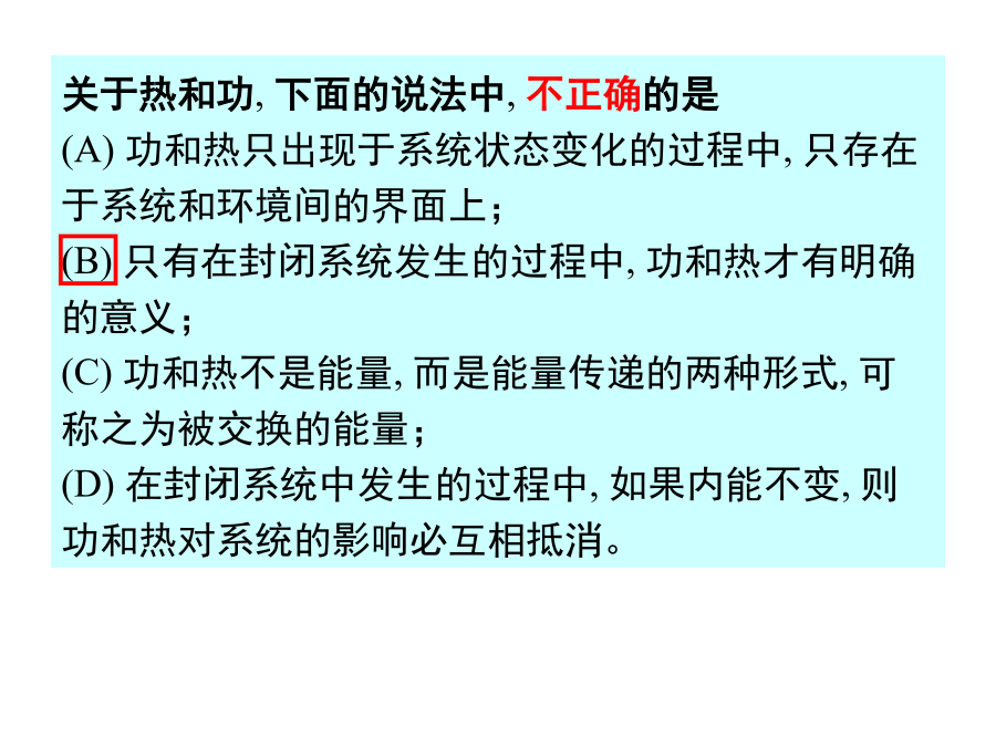 物理化学(上)为什么第一定律数学表示式dU=Q+W中内能前面用微分号d,而热和功的前面用δ符号?关于热和功,下面的说法中,不正确的是(A)功和热只出现于系统状态变化的过程中,只存在于系统和环境间的界面上;(B)只有在封闭系统发生的过程中,功和热才有明确的意义;(C)功和热不是能量,而是能量传递的两种形式,可称之为被交换的能量;(D)在封闭系统中发生的过程中,如果内能不变,则功和热对系统的影响必互相抵消。“功、热与内能均是能量,所以它们的性质相同”这句话正确否?不正确。虽然功、热与内能都有能量的量纲,但在性质上不同,内能是体系的本身性质,是状态函数。而热与功是体系与环境间交换的能量,是与热力学过程相联系的过程量。功与热是被“交换”或“传递”中的能量,不是体系本身的性质,不是状态函数,与内能性质不同。热与功也有区别,热是微粒无序运动而传递的能量,功是微粒有序运动而传递的能量。在一个循环过程中,系统经历了i步变化,则(A)∑Qi=0(B)∑Qi-∑Wi=0(C)∑Wi=0(D)∑Qi+∑Wi=0封闭体系,当状态从Ⅰ到Ⅱ发生变化时经历二条任意的不同途径,则()一体系由A态到B态,沿途径Ⅰ放热100J,对体系作功50J。问:(1)由A态沿途径Ⅱ到B态体系作功80J,其Q值为多少?(2)如体系由B态沿途径Ⅲ回到A态得50J功,Q为多少?体系吸热还是放热?的使用条件为:解:W1=-pe(V2-V1)=0(效率为0,完全不可逆)对于任何宏观物质,其焓H一定_______内能U,因为;若发生一状态变化后,有ΔH=ΔU+Δ(pV),此时ΔHΔU,因为;对于等温理想气体反应,分子数增多的ΔH一定______ΔU,因为。为什么无非体积功的等压过程的热,只决定于体系的始、终态?凡在孤立体系中进行的变化,其DU和DH的值一定是:(A)DU>0,DH>0(B)DU=0,DH=0(C)DU<0,DH<0(D)DU=0,DH大于、小于或等于零不能确定。dU=CvdT及dUm=Cv,mdT适用的条件完整地说应是(A)等容过程;(B)无化学反应和相变的等容过程;(C)组成不变的均相系统的等容过程;(D)无化学反应和相变且不做非体积功的任何等容过程及无反应和相变而且系统内能只与温度有关的非等容过程。对于理想气体,下列关系中哪个是不正确的:对理想气体,U=f(T),内能仅是温度的函数,从始态出发,不论经什么过程,达到不同的终态,只要始终态温度分别相同,ΔU就一定相同。所以该公式并不受定容条件的限制。在绝热过程中,系统与环境间无热的交换,但可以有功的交换。根据热力学第一定律:若系统对外作功,热力学能下降,系统温度必然降低,反之,则系统温度升高。因此绝热压缩,使系统温度升高,而绝热膨胀,可获得低温。将置于室内的一电冰箱的箱门打开,使其致冷机运转,能否降低全室温度?理想气体的焦耳-汤姆逊系数等于零,为什么?能否用作冰箱的工作介质?(p95)反应A(g)+2B(g)→C(g)的ΔrHm(298.2K)>0,则此反应进行时必定吸热,是否正确?为什么?Hess定律包含了两个重要问题,即(A)热力学第一定律和热力学第三定律(B)热力学第一定律及热的基本性质(C)热力学第三定律及热的基本性质(D)热力学第一定律及状态函数的基本特征25℃100KPa下液态氮的标准摩尔生成热为零吗?当某化学反应ΔrCp,m<0,则该过程的随温度升高而(A)下降(B)升高(C)不变(D)无规律在绝热条件下,迅速推动活塞压缩气筒内空气,此过程的熵变(A)大于零(B)小于零(C)等于零(D)无法确定理想气体卡诺循环的图为下列四种情况中的哪些?等温过程中熵的变化等温过程中熵的变化例2:求下述过程熵变例3:在273K时,将一个的盒子用隔板一分为二,例3:在273K时,将一个的盒子用隔板一分为二,例5在298K和p下,反应,H2(g)+1/2O2(g)→H2O(l)放热285.83kJ/mol,若反应在可逆电池中进行,则放热48.65kJ/mol。求△S体,△S热和△S总。例6.1molHe(设为理想气体)从始态22.4dm3,273K经由一任意变化到终态为p2=2×105Pa,T2=303K,试计算此过程体系的△S。例7.试求p下,-5℃的1mol过冷液体苯变为固体苯的S,并用克劳修斯不等式判断此凝固过程是否可能发生。已知苯的正常凝固点为5℃,其熔化热为H关于熵的说法正确的是(A)每单位温度的改变所交换的热为熵(B)可逆过程熵变为零(C)不可逆过程熵将增加(D)熵与系统的微观状态数有关解:解:Maxwell关系式的应用