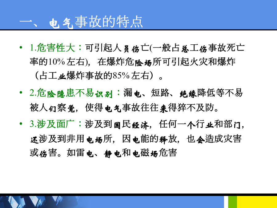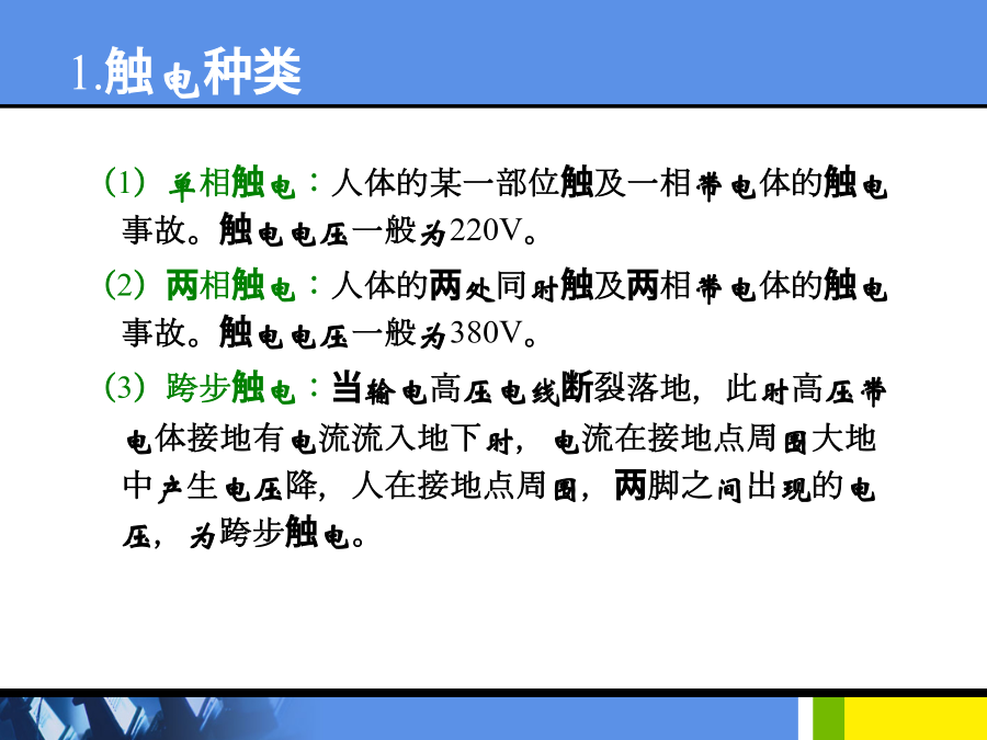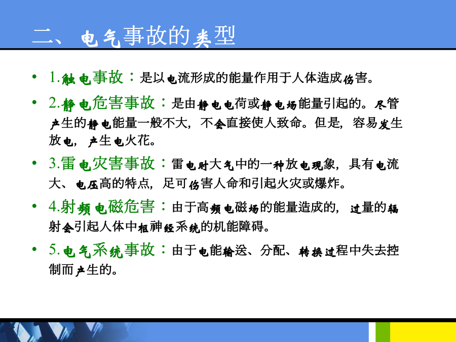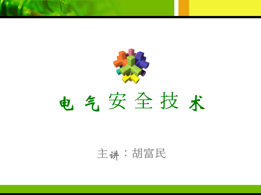 电气安全技术一、电气事故的特点二、电气事故的类型L3相线1.触电种类2.触电原因(2)安装不符合要求:①厂内电气设备安装在户外,电气设备受潮、进水、绝缘性能降低,②接地措施没有或者不可靠,③没有安装漏电保护器,④防爆电气设备没有按防爆规范施工,合格率仅为15%左右,火灾和爆炸事故多。(3)日常缺乏保养、维修:如漏电保护器应每个月检查一次(4)无视安全规范:无电工操作证上岗、临时用电不执行安全规定3.触电电流对人体伤害决定因素4.触电后现场急救5.触电防护技术(2)间接触电防护技术:①漏电保护装置:当漏电电流超过规定值时,能自动切断电源的装置。为防止触电漏电保护装置应采用高灵敏快速型,其动作电流和动作时间的乘积不应大于30mA.S②保护接地和保护接零:接地系统可以达到:a.防止人身触电事故;b.保证电力系统正常工作;c.防止静电、雷电危害;d.防止电气引起火灾和爆炸。按规范规定:电气接地电阻<4Ω,雷电接地电阻<10Ω,静电接地电阻<30Ω,仪表接地电阻<1Ω。(3)临时用电线路规定:临时用电:①要经过审批,②使用时要有专人负责,③需要定期检查,④用毕后立即拆除,⑤使用期限不应超过三个月。(4)手持电动工具规定:①应用安全电压使用,②Ⅱ类手持电动工具的绝缘电阻应>7MΩ③要可靠接地,④要安装漏电保护器,⑤要用三芯保护套铜芯软线连接(其中接地线是绿/黄双色)6.电磁辐射防护技术7.静电防护技术8.雷电防护技术