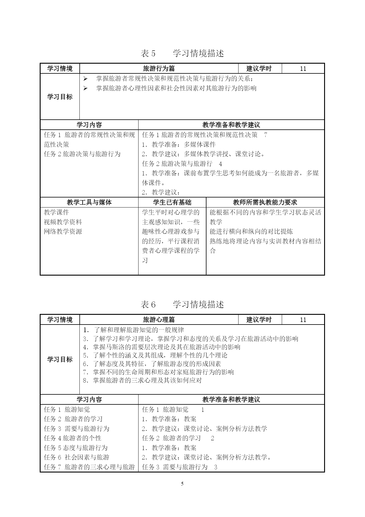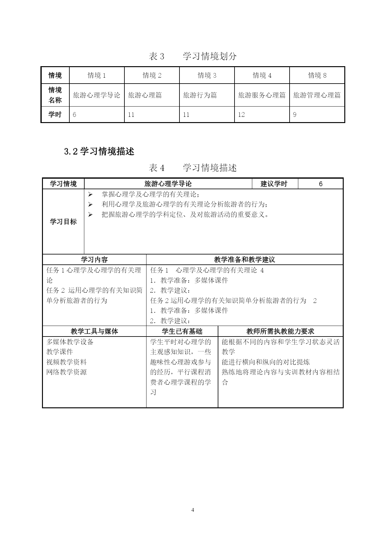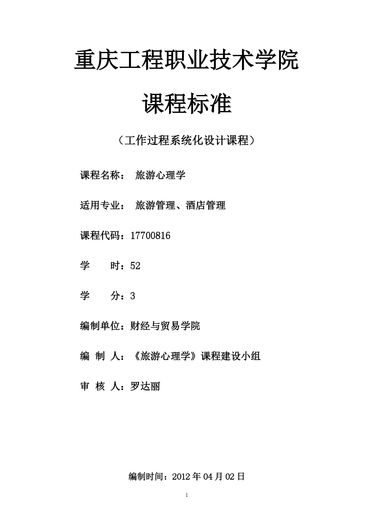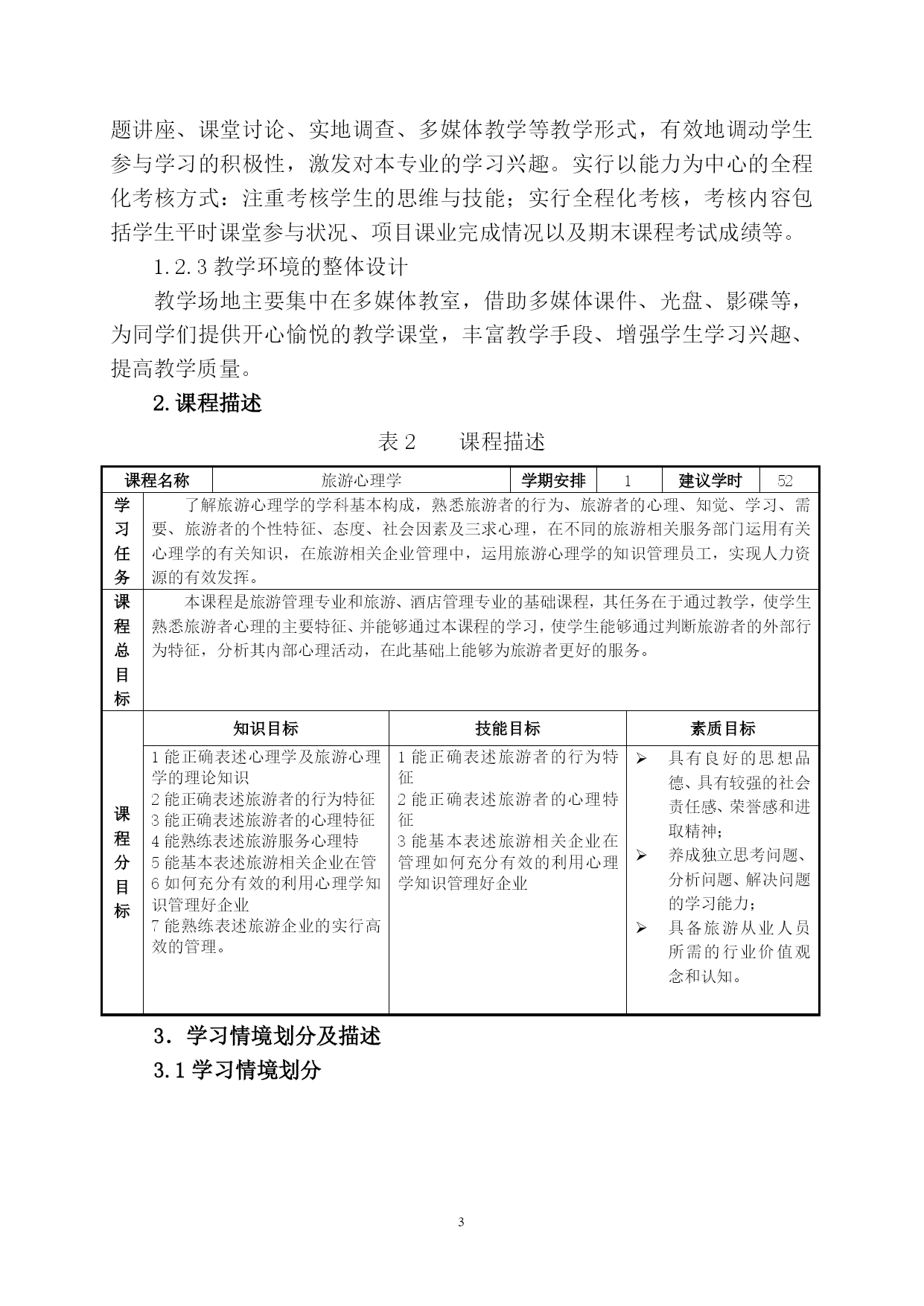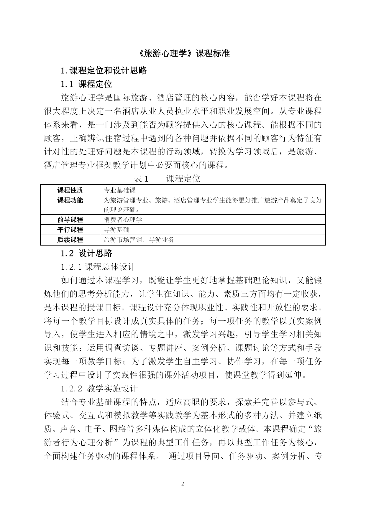 重庆工程职业技术学院课程标准(工作过程系统化设计课程)课程名称:旅游心理学适用专业:旅游管理、酒店管理课程代码:17700816学时:52学分:3编制单位:财经与贸易学院编制人:《旅游心理学》课程建设小组审核人:罗达丽编制时间:2012年04月02日《旅游心理学》课程标准1.课程定位和设计思路1.1课程定位旅游心理学是国际旅游、酒店管理的核心内容,能否学好本课程将在很大程度上决定一名酒店从业人员执业水平和职业发展空间。从专业课程体系来看,是一门涉及到能否为顾客提供入心的核心课程。能根据不同的顾客,正确辨识住宿过程中遇到的各种问题并依据不同的顾客行为特征有针对性的处理好问题是本课程的行动领域,转换为学习领域后,是旅游、酒店管理专业框架教学计划中必要而核心的课程。表1课程定位课程性质专业基础课课程功能为旅游管理专业、旅游、酒店管理专业学生能够更好推广旅游产品奠定了良好的理论基础。前导课程消费者心理学平行课程导游基础后续课程旅游市场营销、导游业务1.2设计思路1.2.1课程总体设计如何通过本课程学习,既能让学生更好地掌握基础理论知识,又能锻炼他们的思考分析能力,让学生在知识、能力、素质三方面均有一定收获,是本课程的授课目标。课程设计充分体现职业性、实践性和开放性的要求。将每一个教学目标设计成真实具体的任务;每一项任务的教学以真实案例导入,使学生进入相应的情境之中,激发学习兴趣,引导学生学习相关知识和技能;运用调查访谈、专题讲座、案例分析、课题讨论等方式和手段实现每一项教学目标;为了激发学生自主学习、协作学习,在每一项任务学习过程中设计了实践性很强的课外活动项目,使课堂教学得到延伸。1.2.2教学实施设计结合专业基础课程的特点,适应高职的要求,探索并完善以参与式、体验式、交互式和模拟教学等实践教学为基本形式的多种方法。并建立纸质、声音、电子、网络等多种媒体构成的立体化教学载体。本课程确定“旅游者行为心理分析”为课程的典型工作任务,再以典型工作任务为核心,全面构建任务驱动的课程体系。通过项目导向、任务驱动、案例分析、专题讲座、课堂讨论、实地调查、多媒体教学等教学形式,有效地调动学生参与学习的积极性,激发对本专业的学习兴趣。实行以能力为中心的全程化考核方式:注重考核学生的思维与技能;实行全程化考核,考核内容包括学生平时课堂参与状况、项目课业完成情况以及期末课程考试成绩等。1.2.3教学环境的整体设计教学场地主要集中在多媒体教室,借助多媒体课件、光盘、影碟等,为同学们提供开心愉悦的教学课堂,丰富教学手段、增强学生学习兴趣、提高教学质量。2.课程描述表2课程描述课程名称旅游心理学学期安排1建议学时52学习任务了解旅游心理学的学科基本构成,熟悉旅游者的行为、旅游者的心理、知觉、学习、需要、旅游者的个性特征、态度、社会因素及三求心理,在不同的旅游相关服务部门运用有关心理学的有关知识,在旅游相关企业管理中,运用旅游心理学的知识管理员工,实现人力资源的有效发挥。课程总目标本课程是旅游管理专业和旅游、酒店管理专业的基础课程,其任务在于通过教学,使学生熟悉旅游者心理的主要特征、并能够通过本课程的学习,使学生能够通过判断旅游者的外部行为特征,分析其内部心理活动,在此基础上能够为旅游者更好的服务。课程分目标知识目标技能目标素质目标1能正确表述心理学及旅游心理学的理论知识2能正确表述旅游者的行为特征3能正确表述旅游者的心理特征4能熟练表述旅游服务心理特5能基本表述旅游相关企业在管6如何充分有效的利用心理学知识管理好企业7能熟练表述旅游企业的实行高效的管理。1能正确表述旅游者的行为特征2能正确表述旅游者的心理特征3能基本表述旅游相关企业在管理如何充分有效的利用心理学知识管理好企业具有良好的思想品德、具有较强的社会责任感、荣誉感和进取精神;养成独立思考问题、分析问题、解决问题的学习能力;具备旅游从业人员所需的行业价值观念和认知。3.学习情境划分及描述3.1学习情境划分表3学习情境划分情境情境1情境2情境3情境4情境8情境名称旅游心理学导论旅游心理篇旅游行为篇旅游服务心理篇旅游管理心理篇学时611111293.2学习情境描述表4学习情境描述学习情境旅游心理学导论建议学时6学习目标掌握心理学及心理学的有关理论;利用心理学及旅游心理学的有关理论分析旅游者的行为;把握旅游心理学的学科定位、及对旅游活动的重要意义。学习内容教学准备和教学建议任务1心理学及心理学的有关理论任务2运用心理学的有关知识简单分析旅游者的行为任务1心理学及心理学的有关理论41.教学准备:多媒体课件2.教学建议:任务2运用心理学的有关知识简单分析旅游者的行为21.教学准备:多媒体课件2.教学建议:教学工具与媒体学生已有基础教师所需执教能力要求多媒体教学设备教学课件视频教学资