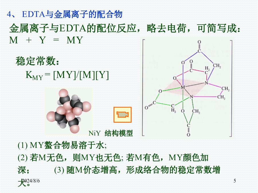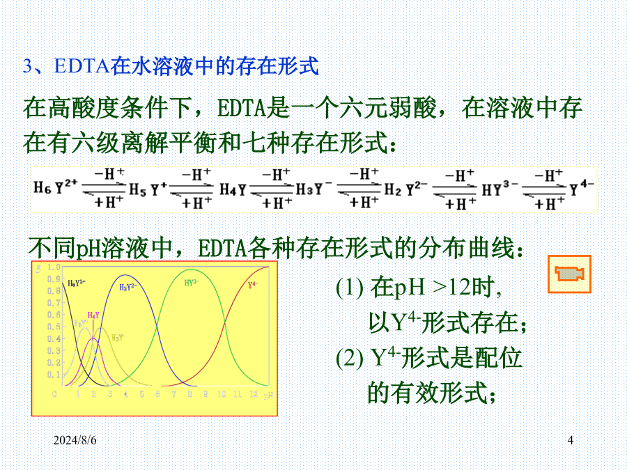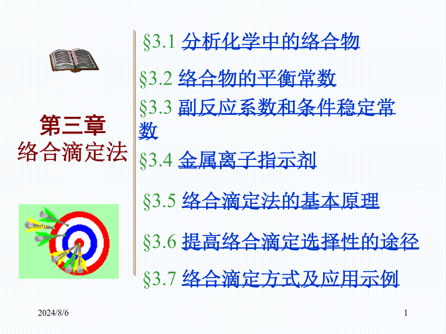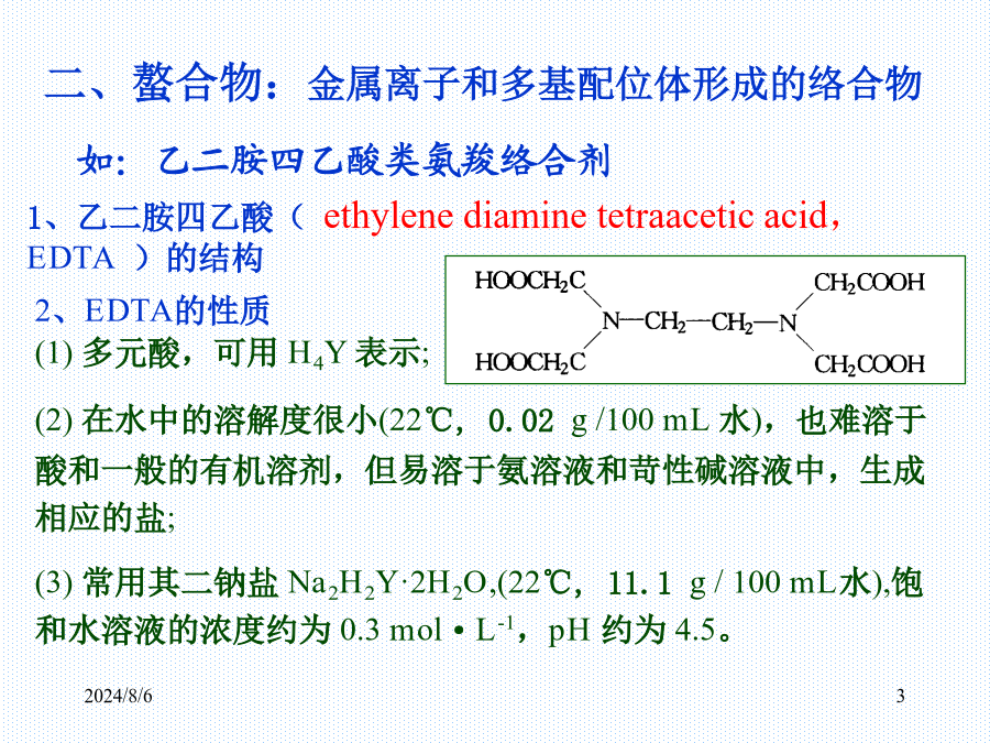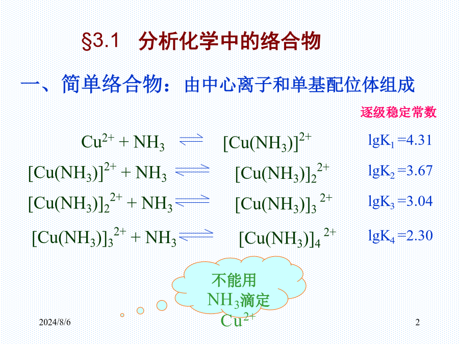 §3.1分析化学中的络合物二、螯合物:金属离子和多基配位体形成的络合物3、EDTA在水溶液中的存在形式4、EDTA与金属离子的配合物EDTA与一些常见金属离子配合物的稳定常数(溶液离子强度I=0.1mol·L-1,温度293K)§3.2络合物的平衡常数二、溶液中各级络合物的分布:例2使100mL0.010mol·L-1Zn2+降至10-9mol·L-1,问应加入多少固体KCN?例3pH=9.70的氨性缓冲溶液中,含有0.0050mol·L-1Ag+,当平均配位数是1.5时,求溶液中NH3和NH4+的平衡浓度。已知Ag-NH3络合物的β1=103.2,β2=107.0。讨论:例5某样品含有2.0×10-3mol·L-1Zn2+2.0×10-2mol·L-1Mg2+,0.20mol·L-1NH3·H2O,0.20mol·L-1NH4Cl缓冲溶液,求用2.0×10-3mol·L-1EGTA滴定Zn2+至化学计量点时,lgK’MY。已知EGTApKa1=2.08,pKa2=2.73,pKa3=8.93,pKa4=9.54,lgKEGTA-Mg=5.21,lgKEGTA-Zn=12.7。§3.4金属离子指示剂3、滴定过程中发生置换反应二、金属离子指示剂应具备的条件㈡金属离子和指示剂均发生副反应五、常用的金属指示剂2.钙指示剂4.PAN指示剂2024/8/6例9pH=12.0时,用0.01000mol·L-1EDTA滴定同浓度的Ca2+,当EDTA的量由19.98mL到20.02mL时,pM变化一个单位,求lgKMY。㈡最低酸度(水解酸度)Cu2+、Zn2+、Pb2+例15分析合金中Cu、Zn、Mg的含量,称取试样0.5000g溶于100mL水中,吸取25.00mL试液,调pH=6.0,以PAN为指示剂,用0.05000mol·L-1EDTA滴定至终点时,用去37.30mL;另取25.00mL试液,调pH=10.0,加KCN,EBT,用同浓度EDTA滴定,用去4.10mL,然后加甲醛,再用EDTA滴定至终点,用去13.40mL,求各组成的含量。3、置换滴定㈣氧化还原掩蔽法§3.7络合滴定方式及其应用示例二、络合滴定方式㈡返滴定㈢置换滴定2.置换出EDTA㈣间接滴定三、方案设计及应用示例2024/8/6