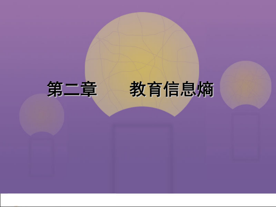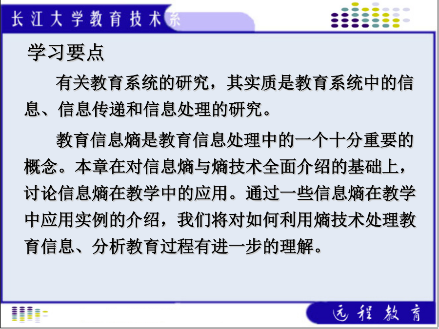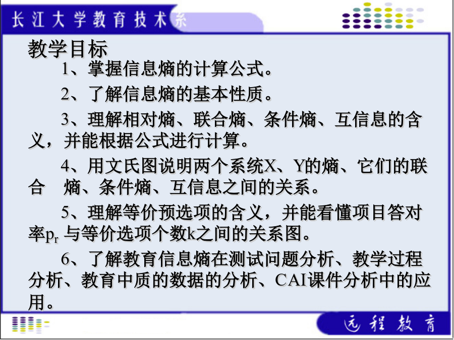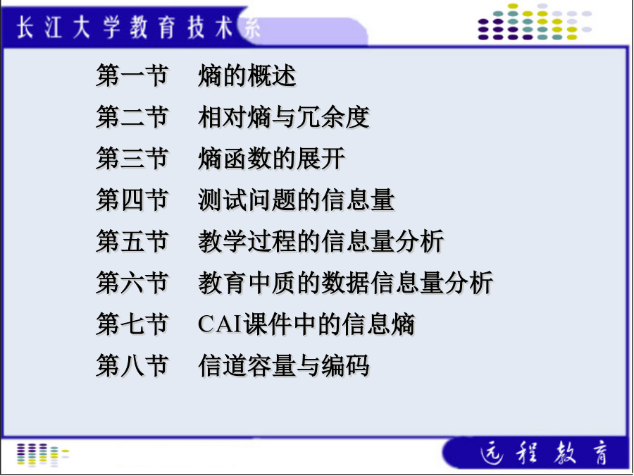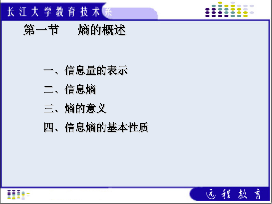 第二章教育信息熵学习要点教学目标第一节熵的概述第二节相对熵与冗余度第三节熵函数的展开第四节测试问题的信息量第五节教学过程的信息量分析第六节教育中质的数据信息量分析第七节CAI课件中的信息熵第八节信道容量与编码第一节熵的概述一、信息量的表示从n个概率相等的事件中选择其中一个的系统的信息量,其表示方式为H=log2n。信源输出的消息可以看作是随机事件,它的不确定度可根据其出现的概率来衡量:概率大,出现机会多,不确定程度小概率小,出现机会少,不确定程度大一、信息量的表示不确定度应满足可加性要求。可加性:N个不确定事件记为:x1,x2,•••,xn相应的概率P(xi)为:P1,P2,•••,Pn若这些事件彼此独立,则总的不确定性等于各分量不确定性的和,这就是不确定性的可加性。I(xj)=I(x)+I(j)设某一事件产生的概率为p,则信息量可定义为:H=loga(1/P)=-logaP其中,a>1a可以取2(单位为bit),e(单位为nat),10(单位为dit)信息熵在熵的数学表达式中,常用的有:以2为底——单位为比特(bit)——以2为底的对数记为logx;以e(≈2.718)为底——单位为奈特(nat)——以e为底的对数记为lnx两者间的换算关系为:1比特=0.693奈特1奈特=1.443比特