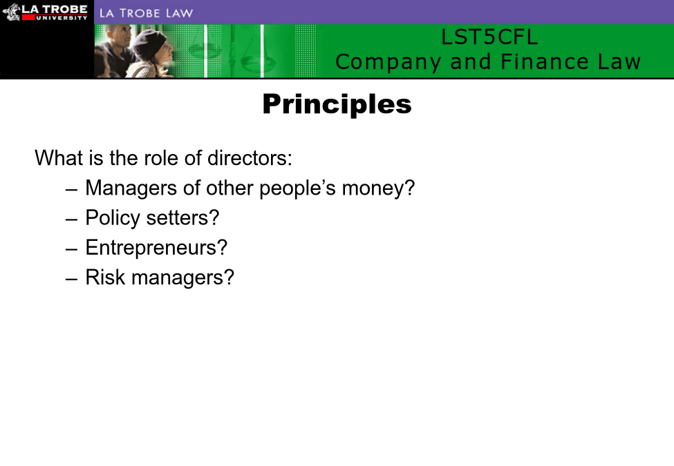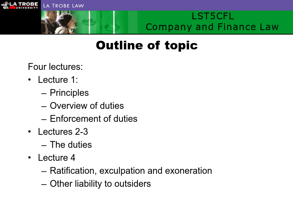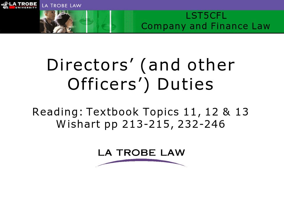 Directors’(andotherOfficers’)DutiesReading:TextbookTopics11,12&13Wishartpp213-215,232-246OutlineoftopicPrinciplesPrinciplesctd.SourcesofdutiesOverviewofcorporationslawdutiesGenerallawdutiesStatutorydutiesIssuesaboutenforcementWhoowestheduties?Whoowestheduties?Ctd.Towhomarethedutiesowed?Towhomarethedutiesowed?Towhomarethedutiesowed?Towhomarethedutiesowed?Ctd.Towhomarethedutiesowed?Ctd.Whathappenswhenadutyisbreached?Whathappenswhenadutyisbreached?Ctd.Whathappenswhenadutyisbreached?Ctd.Dutyofcare,skillanddiligenceRequirementsofthedutyRequirementsofthedutyRequirementsofthedutyRequirementsofthedutyIssue1:thebusinessjudgmentruleThebusinessjudgmentrulectdIssue2:DifferingStandardsIssues:DelegationIssue3:Reliance:s189ReliancectdDutytopreventinsolventtradingDutytopreventinsolventtradingctdDutytoactbonafideforthebenefitofthecompanyasawholeDutytoactbonafideforthebenefitofthecompanyasawholeDutytoactbonafideforthebenefitofthecompanyasawholeDutytoactbonafideforthebenefitofthecompanyasawholeCorporategroupsDutytoactbonafideforthebenefitofthecompanyasawholeDutytoactbonafideforthebenefitofthecompanyasawholeDutytoExercisePowersforaProperPurposeDutytoExercisePowersforaProperPurposeSection181(1)DutytoDiscloseConflictsofInterestDutytoDiscloseConflictsofInterestDutytoDiscloseConflictsofInterestDutytoDiscloseConflictsofInterestDutytoDiscloseConflictsofInterestDutytoDiscloseConflictsofInterestDutytoDiscloseConflictsofInterestDutytoDiscloseConflictsofInterestDutytoDiscloseConflictsofInterestDutytoDiscloseConflictsofInterestDutytoDiscloseConflictsofInterestDutytoDiscloseConflictsofInterestDutytoDiscloseConflictsofInterestDutytoDiscloseConflictsofInterestRatification,Exculpationand/orExonerationRatification,Exculpation,Exonerationand/orIndemnificationInsiderTradingInsiderTradingctdInsiderTradingctdOtherLiabilitytoOutsiders