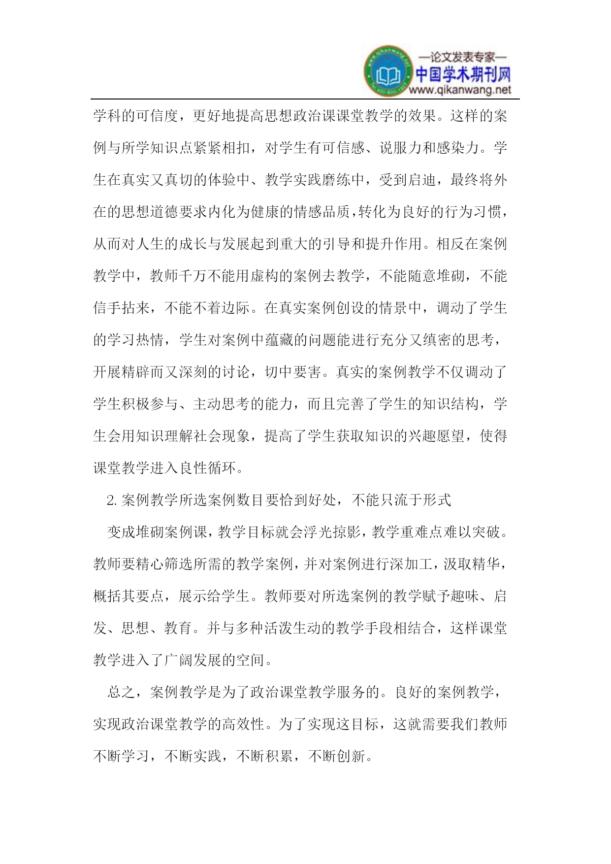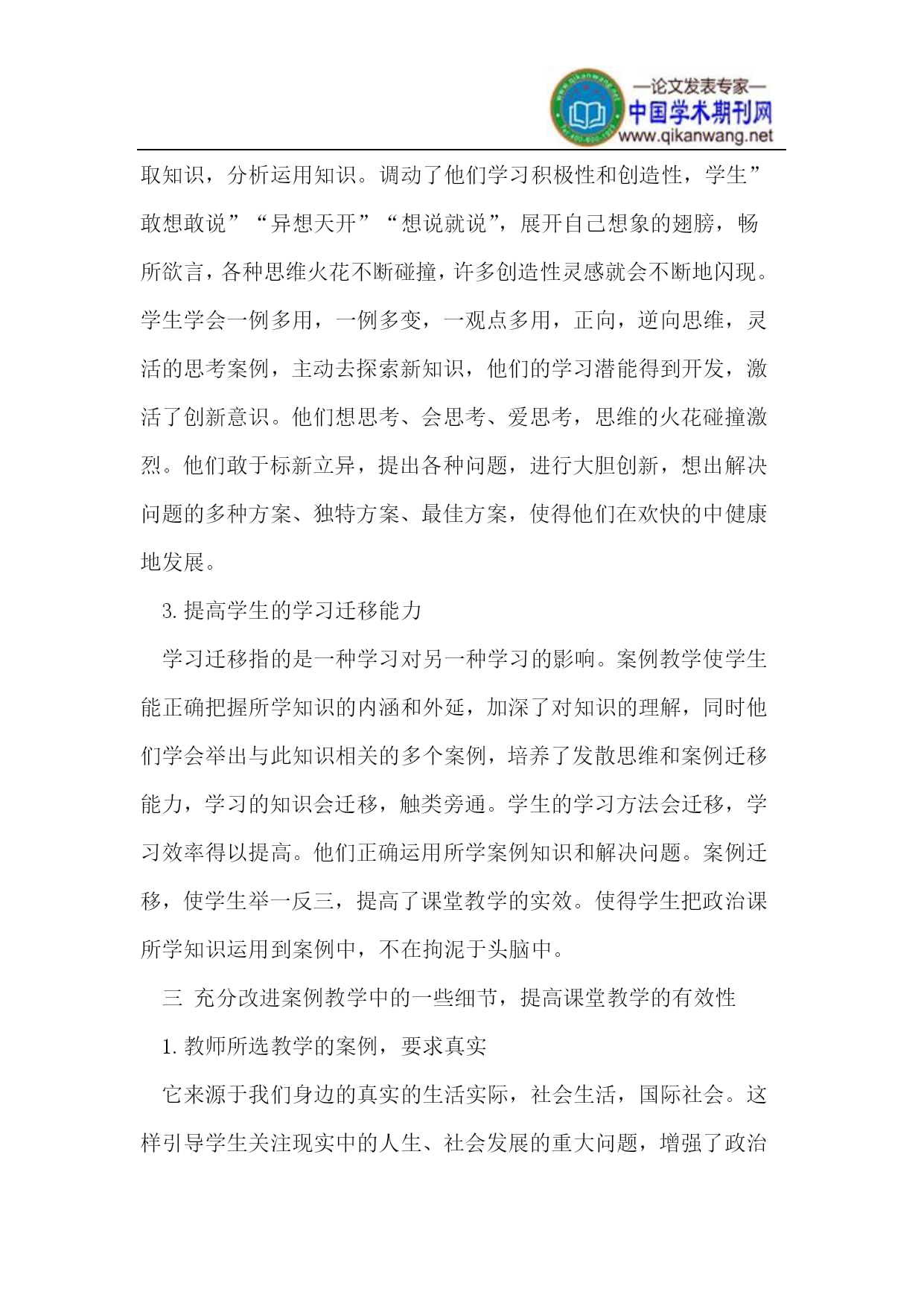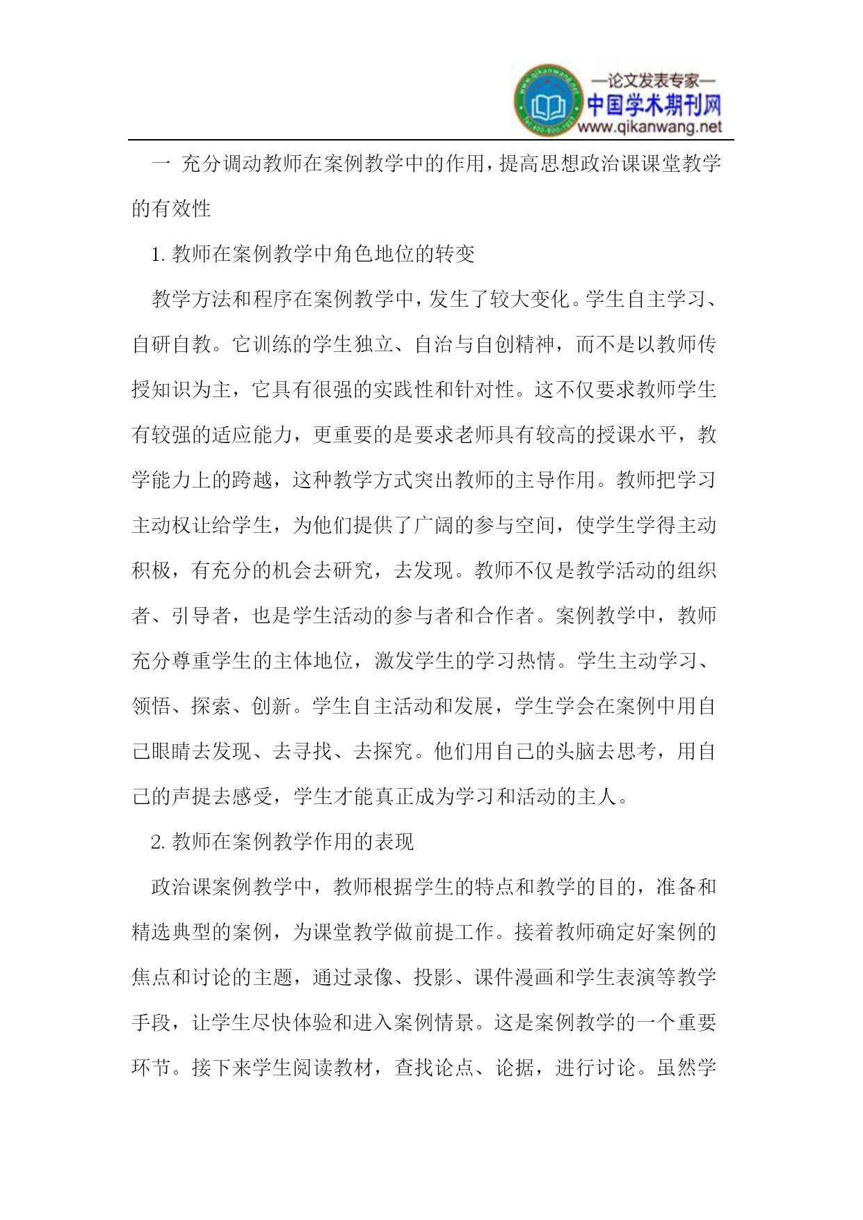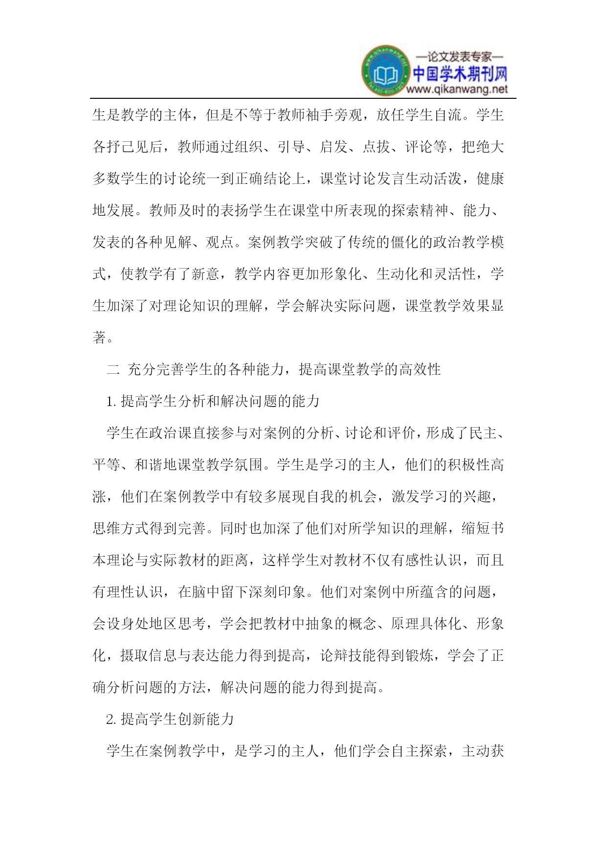 以案例教学提高思想政治课教学的有效性摘要:思想政治课教学中渗透案例教学,贴近教育教学的实践,有效地激发教师的教和学生的学。在案例教学中,教师注意教学细节的改进,体现思想政治课教学的真实性、目标性、内容的实效性。教师转换角色,推动了教学的发展。同时,学生分析问题和解决问题的能力,学习创新能力,学习的迁移能力,都得以提高。课堂教学效果显著,教育教学进入良性循环。关键词:转变;表现;分析;解决问题;创新能力;学习迁移能力;真实性;实效性;目标性思想政治课中进行案例教学,适应了新课改发展的和学生成长的需要。何谓案例教学?它是基于情景学习论,认知弹性论,以学生为主体,凭借具有多元表征的潜在价值的“案例”,引导学习者进入科学探索和反思的学习过程。案例教学通过对一些典型案例的判定、分析和研究,阐明某一学科的一般规律,某一问题的具体认识,从而使学生了解掌握所学知识的一种教学方法。在思想政治课教学中,案例教学的运用,可以弥补课堂教学的,加强实践环节。,促进学生自主、和谐地发展,全面提高了学生的素质。案例教学对于坚持和贯彻理论联系实际的教学原则,突出思想政治课教学的实践特色,提高学生分析和解决问题的能力,推动思想政治课教学方法的深化改革具有重要意义。笔者在案例教学中进行了反思,将一些心得体会总结如下:一充分调动教师在案例教学中的作用,提高思想政治课课堂教学的有效性1.教师在案例教学中角色地位的转变教学方法和程序在案例教学中,发生了较大变化。学生自主学习、自研自教。它训练的学生独立、自治与自创精神,而不是以教师传授知识为主,它具有很强的实践性和针对性。这不仅要求教师学生有较强的适应能力,更重要的是要求老师具有较高的授课水平,教学能力上的跨越,这种教学方式突出教师的主导作用。教师把学习主动权让给学生,为他们提供了广阔的参与空间,使学生学得主动积极,有充分的机会去研究,去发现。教师不仅是教学活动的组织者、引导者,也是学生活动的参与者和合作者。案例教学中,教师充分尊重学生的主体地位,激发学生的学习热情。学生主动学习、领悟、探索、创新。学生自主活动和发展,学生学会在案例中用自己眼睛去发现、去寻找、去探究。他们用自己的头脑去思考,用自己的声提去感受,学生才能真正成为学习和活动的主人。2.教师在案例教学作用的表现政治课案例教学中,教师根据学生的特点和教学的目的,准备和精选典型的案例,为课堂教学做前提工作。接着教师确定好案例的焦点和讨论的主题,通过录像、投影、课件漫画和学生表演等教学手段,让学生尽快体验和进入案例情景。这是案例教学的一个重要环节。接下来学生阅读教材,查找论点、论据,进行讨论。虽然学生是教学的主体,但是不等于教师袖手旁观,放任学生自流。学生各抒己见后,教师通过组织、引导、启发、点拔、评论等,把绝大多数学生的讨论统一到正确结论上,课堂讨论发言生动活泼,健康地发展。教师及时的表扬学生在课堂中所表现的探索精神、能力、发表的各种见解、观点。案例教学突破了传统的僵化的政治教学模式,使教学有了新意,教学内容更加形象化、生动化和灵活性,学生加深了对理论知识的理解,学会解决实际问题,课堂教学效果显著。二充分完善学生的各种能力,提高课堂教学的高效性1.提高学生分析和解决问题的能力学生在政治课直接参与对案例的分析、讨论和评价,形成了民主、平等、和谐地课堂教学氛围。学生是学习的主人,他们的积极性高涨,他们在案例教学中有较多展现自我的机会,激发学习的兴趣,思维方式得到完善。同时也加深了他们对所学知识的理解,缩短书本理论与实际教材的距离,这样学生对教材不仅有感性认识,而且有理性认识,在脑中留下深刻印象。他们对案例中所蕴含的问题,会设身处地区思考,学会把教材中抽象的概念、原理具体化、形象化,摄取信息与表达能力得到提高,论辩技能得到锻炼,学会了正确分析问题的方法,解决问题的能力得到提高。2.提高学生创新能力学生在案例教学中,是学习的主人,他们学会自主探索,主动获取知识,分析运用知识。调动了他们学习积极性和创造性,学生”敢想敢说”“异想天开”“想说就说”,展开自己想象的翅膀,畅所欲言,各种思维火花不断碰撞,许多创造性灵感就会不断地闪现。学生学会一例多用,一例多变,一观点多用,正向,逆向思维,灵活的思考案例,主动去探索新知识,他们的学习潜能得到开发,激活了创新意识。他们想思考、会思考、爱思考,思维的火花碰撞激烈。他们敢于标新立异,提出各种问题,进行大胆创新,想出解决问题的多种方案、独特方案、最佳方案,使得他们在欢快的中健康地发展。3.提高学生的学习迁移能力学习迁移指的是一种学习对另一种学习的影响。案例教学使学生能正确把握所学知识的内涵和外延,加深了对知识的理解,同时他们学会举出与此知识相关的多个案例,培养了发散思维和案例迁移能力,学习的知识会迁移,触类旁通。学生的学习方法会迁移,学