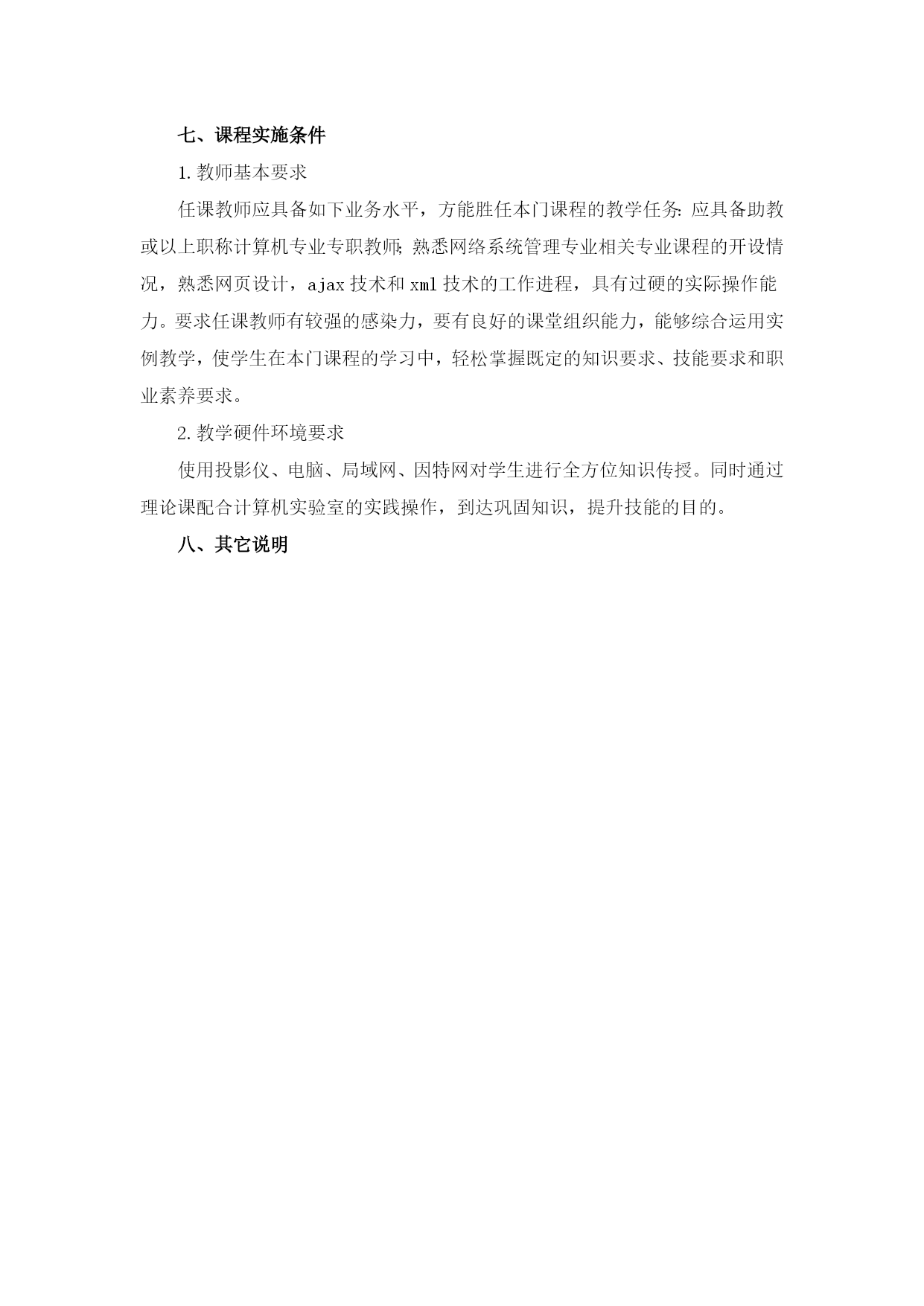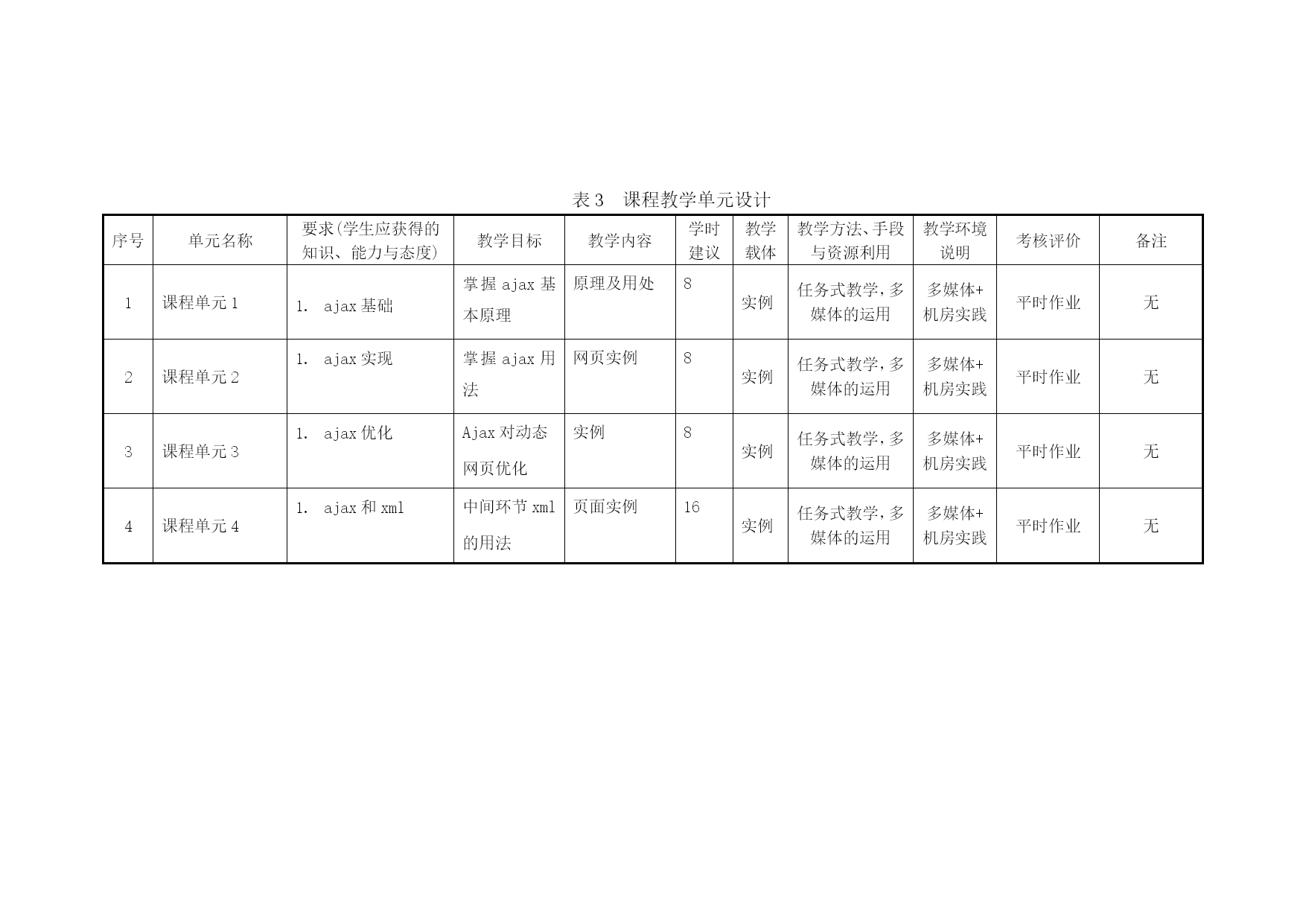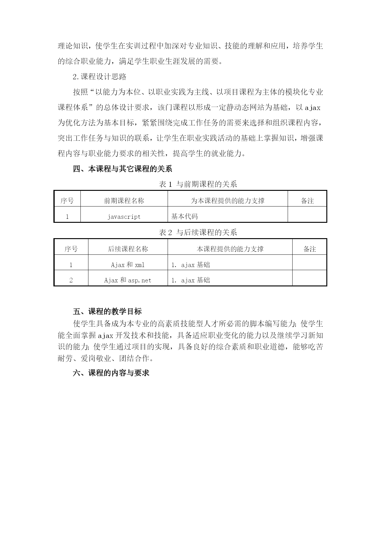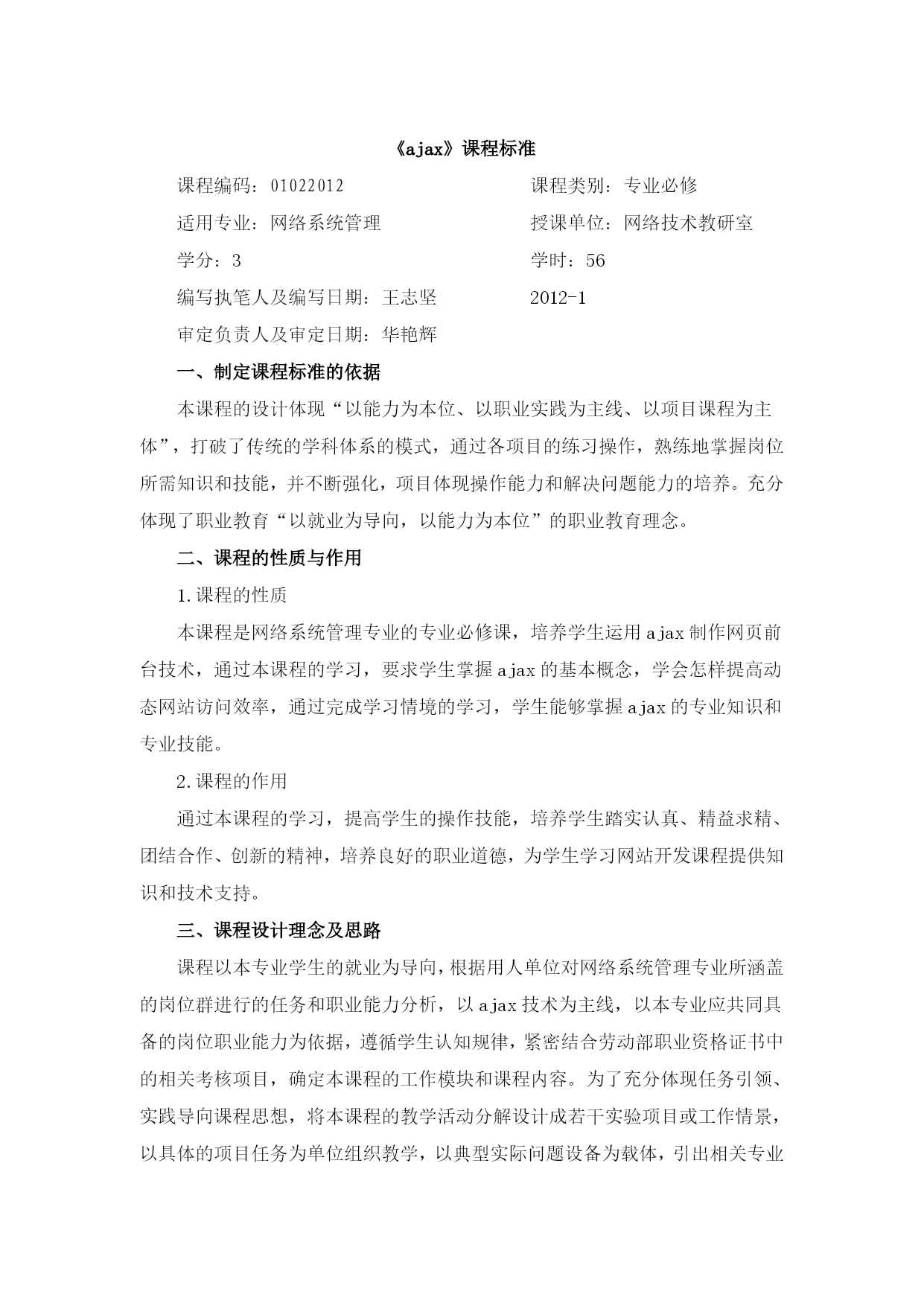 《ajax》课程标准课程编码:01022012课程类别:专业必修适用专业:网络系统管理授课单位:网络技术教研室学分:3学时:56编写执笔人及编写日期:王志坚2012-1审定负责人及审定日期:华艳辉一、制定课程标准的依据本课程的设计体现“以能力为本位、以职业实践为主线、以项目课程为主体”,打破了传统的学科体系的模式,通过各项目的练习操作,熟练地掌握岗位所需知识和技能,并不断强化,项目体现操作能力和解决问题能力的培养。充分体现了职业教育“以就业为导向,以能力为本位”的职业教育理念。二、课程的性质与作用1.课程的性质本课程是网络系统管理专业的专业必修课,培养学生运用ajax制作网页前台技术,通过本课程的学习,要求学生掌握ajax的基本概念,学会怎样提高动态网站访问效率,通过完成学习情境的学习,学生能够掌握ajax的专业知识和专业技能。2.课程的作用通过本课程的学习,提高学生的操作技能,培养学生踏实认真、精益求精、团结合作、创新的精神,培养良好的职业道德,为学生学习网站开发课程提供知识和技术支持。三、课程设计理念及思路课程以本专业学生的就业为导向,根据用人单位对网络系统管理专业所涵盖的岗位群进行的任务和职业能力分析,以ajax技术为主线,以本专业应共同具备的岗位职业能力为依据,遵循学生认知规律,紧密结合劳动部职业资格证书中的相关考核项目,确定本课程的工作模块和课程内容。为了充分体现任务引领、实践导向课程思想,将本课程的教学活动分解设计成若干实验项目或工作情景,以具体的项目任务为单位组织教学,以典型实际问题设备为载体,引出相关专业理论知识,使学生在实训过程中加深对专业知识、技能的理解和应用,培养学生的综合职业能力,满足学生职业生涯发展的需要。2.课程设计思路按照“以能力为本位、以职业实践为主线、以项目课程为主体的模块化专业课程体系”的总体设计要求,该门课程以形成一定静动态网站为基础,以ajax为优化方法为基本目标,紧紧围绕完成工作任务的需要来选择和组织课程内容,突出工作任务与知识的联系,让学生在职业实践活动的基础上掌握知识,增强课程内容与职业能力要求的相关性,提高学生的就业能力。四、本课程与其它课程的关系表1与前期课程的关系序号前期课程名称为本课程提供的能力支撑备注1javascript基本代码表2与后续课程的关系序号后续课程名称本课程提供的能力支撑备注1Ajax和xml1.ajax基础2Ajax和asp.net1.ajax基础五、课程的教学目标使学生具备成为本专业的高素质技能型人才所必需的脚本编写能力;使学生能全面掌握ajax开发技术和技能,具备适应职业变化的能力以及继续学习新知识的能力;使学生通过项目的实现,具备良好的综合素质和职业道德,能够吃苦耐劳、爱岗敬业、团结合作。六、课程的内容与要求表3课程教学单元设计序号单元名称要求(学生应获得的知识、能力与态度)教学目标教学内容学时建议教学载体教学方法、手段与资源利用教学环境说明考核评价备注1课程单元1ajax基础掌握ajax基本原理原理及用处8实例任务式教学,多媒体的运用多媒体+机房实践平时作业无2课程单元2ajax实现掌握ajax用法网页实例8实例任务式教学,多媒体的运用多媒体+机房实践平时作业无3课程单元3ajax优化Ajax对动态网页优化实例8实例任务式教学,多媒体的运用多媒体+机房实践平时作业无4课程单元4ajax和xml中间环节xml的用法页面实例16实例任务式教学,多媒体的运用多媒体+机房实践平时作业无七、课程实施条件1.教师基本要求任课教师应具备如下业务水平,方能胜任本门课程的教学任务:应具备助教或以上职称计算机专业专职教师;熟悉网络系统管理专业相关专业课程的开设情况,熟悉网页设计,ajax技术和xml技术的工作进程,具有过硬的实际操作能力。要求任课教师有较强的感染力,要有良好的课堂组织能力,能够综合运用实例教学,使学生在本门课程的学习中,轻松掌握既定的知识要求、技能要求和职业素养要求。2.教学硬件环境要求使用投影仪、电脑、局域网、因特网对学生进行全方位知识传授。同时通过理论课配合计算机实验室的实践操作,到达巩固知识,提升技能的目的。八、其它说明