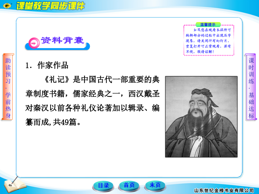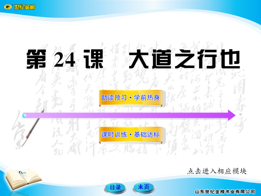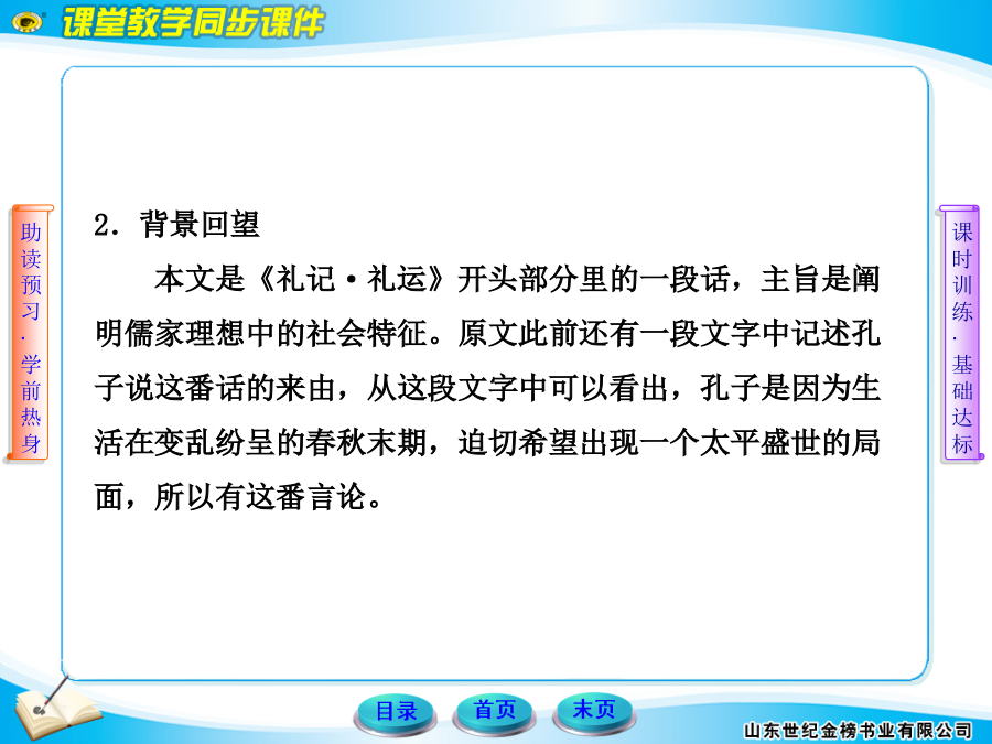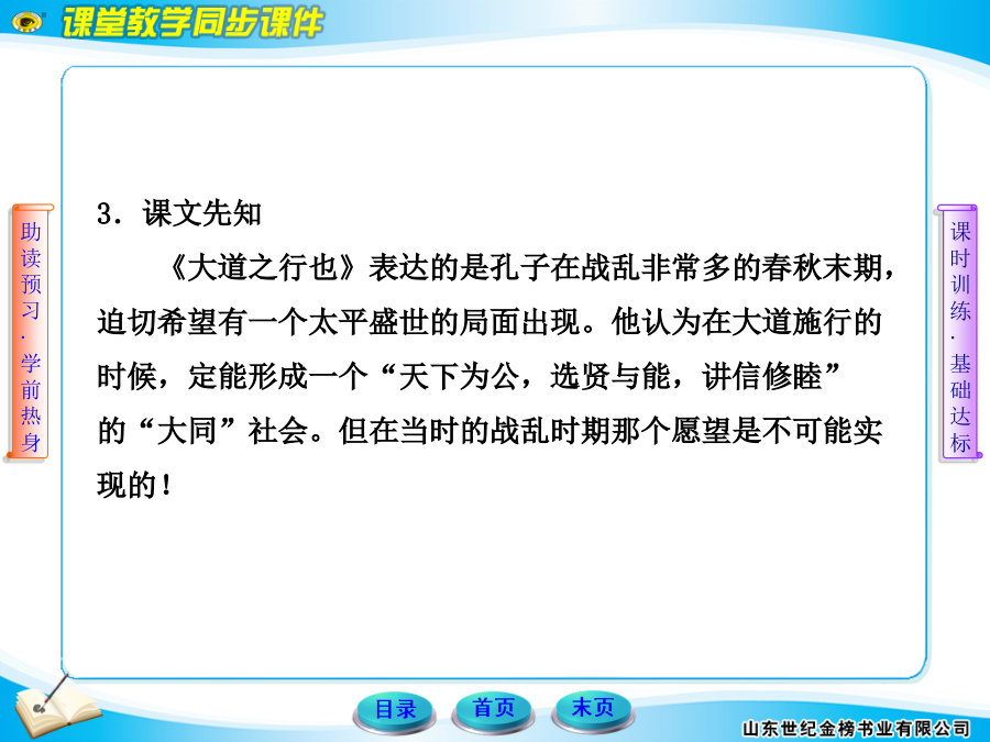 1.作家作品《礼记》是中国古代一部重要的典章制度书籍,儒家经典之一,西汉戴圣对秦汉以前各种礼仪论著加以辑录、编纂而成,共49篇。2.背景回望本文是《礼记·礼运》开头部分里的一段话,主旨是阐明儒家理想中的社会特征。原文此前还有一段文字中记述孔子说这番话的来由,从这段文字中可以看出,孔子是因为生活在变乱纷呈的春秋末期,迫切希望出现一个太平盛世的局面,所以有这番言论。3.课文先知《大道之行也》表达的是孔子在战乱非常多的春秋末期,迫切希望有一个太平盛世的局面出现。他认为在大道施行的时候,定能形成一个“天下为公,选贤与能,讲信修睦”的“大同”社会。但在当时的战乱时期那个愿望是不可能实现的!5.个性思考我们应该如何理解和认识课文中所提到的“大道”和“大同”?【解答】“大道”和“大同”都是当时人们头脑中的理想境界,两个词中带有明显的理想色彩,寄托着人们对未来生活的美好向往。一、积累运用——试一试1.解释下列句中加点的字。(1)女有归()(2)谋闭而不兴()(3)盗窃乱贼而不作()(4)故外户而不闭()答案:(1)女子出嫁(2)发生(3)兴起(4)用门闩插门2.翻译下列句子。(1)选贤与能,讲信修睦。译文:____________________________________________(2)是故谋闭而不兴,盗窃乱贼而不作。译文:____________________________________________(3)使老有所终,壮有所用,幼有所长。译文:____________________________________________(4)男有分,女有归。译文:____________________________________________答案:(1)把品德高尚的人、能干的人选拔出来,(人人)讲求诚信,培养和睦(气氛)。(2)因此,奸邪之谋不会发生,盗窃、造反和害人的事情不发生。(3)使老年人能终其天年,中年人能为社会效力,幼童能顺利地成长。(4)男子有职务,女子有归宿。3.《大道之行也》是一篇名文,有两个成语出自其中,它们分别是________________、___________________。答案:鳏寡孤独夜不闭户4.认真阅读课文,回答下列问题。(1)总领全文的句子是什么?答:_____________________________________________(2)“大道”的内涵是什么?答:_____________________________________________答案:(1)大道之行也,天下为公。(2)天下为公、选贤与能、讲信修睦。二、精彩段落——品一品(2009·铜仁中考)阅读《大道之行也》,回答5~8题。5.下列句子中,加点字的读音有误的一项是()A.选贤与能(jǔ)B.矜、寡、孤、独、废疾者(ɡuān)C.男有分,女有归(fēn)D.是故谋闭而不兴(xīnɡ)【解析】选C。“分”应读fèn。6.下列句子中,加点字的解释有误的一项是()A.大道之行也,天下为公。(古代指政治上的最高理想)B.选贤与能,讲信修睦。(培养)C.是故谋闭而不兴。(因此)D.故外户而不闭,是谓大同。(大家一样)【解析】选D。“大同”应指“理想社会”。7.将下列句子翻译成现代汉语。(1)故人不独亲其亲,不独子其子。译文:____________________________________________(2)货恶其弃于地也,不必藏于己。译文:____________________________________________答案:(1)因此人们不仅以自己的亲人为亲人,不仅以自己的子女为子女。(2)对于财货,人们憎恨把它扔在地上的行为,却不一定要自己私藏。8.“大同”社会有哪些特征?答:______________________________________________________________________________________________答案:(1)人人都能得到全社会的关爱。(2)人人都能安居乐业。(3)货尽其用,人尽其力。9.下列加点的字与“大道之行也”的“之”字用法相同的一项是()A.重法以禁之B.上哂之C.民之所以为盗者D.自是数年之后【解析】选C。两个“之”都是取消句子的独立性,无实在意义。10.翻译下列句子。(1)或请重法以禁之。译文:___________________________________________(2)去奢省费,轻徭薄赋。译文:___________________________________________答案:(1)有人请求使用严厉的刑法来制止。(2)去掉奢侈,节省开支,减轻徭役,少收赋税。11.对止盗的问题,“上”的看法是什么