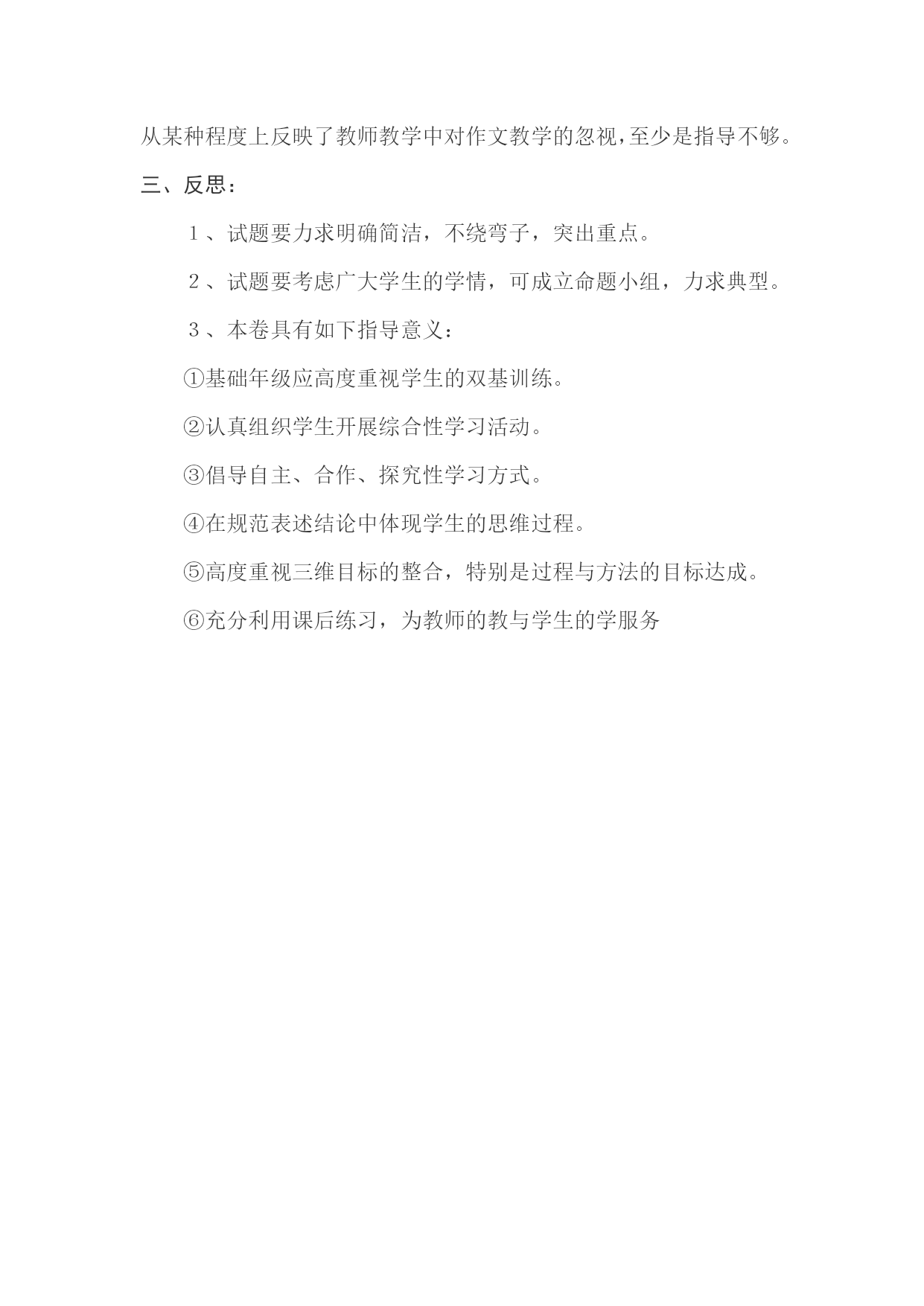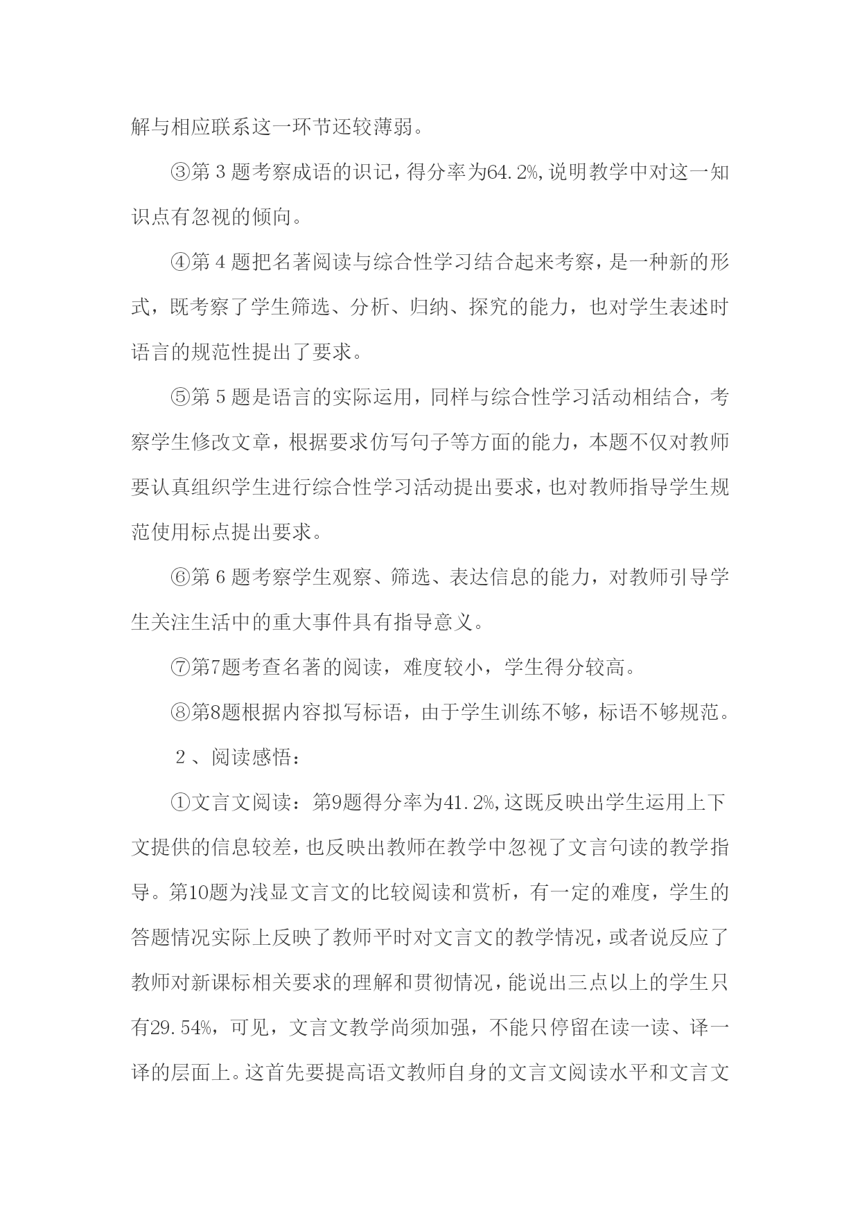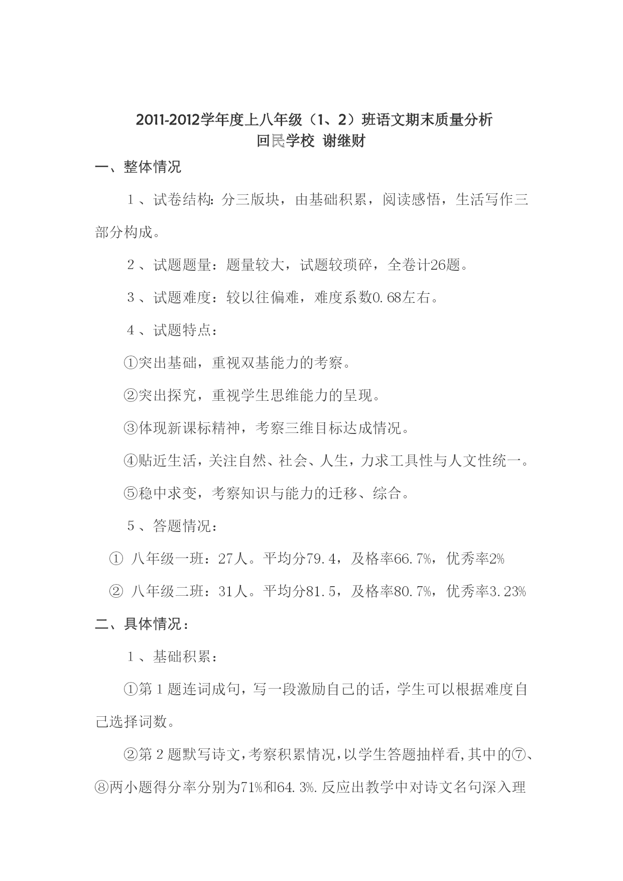 2011-2012学年度上八年级(1、2)班语文期末质量分析回民学校谢继财一、整体情况1、试卷结构:分三版块,由基础积累,阅读感悟,生活写作三部分构成。2、试题题量:题量较大,试题较琐碎,全卷计26题。3、试题难度:较以往偏难,难度系数0.68左右。4、试题特点:①突出基础,重视双基能力的考察。②突出探究,重视学生思维能力的呈现。③体现新课标精神,考察三维目标达成情况。④贴近生活,关注自然、社会、人生,力求工具性与人文性统一。⑤稳中求变,考察知识与能力的迁移、综合。5、答题情况:①八年级一班:27人。平均分79.4,及格率66.7%,优秀率2%②八年级二班:31人。平均分81.5,及格率80.7%,优秀率3.23%二、具体情况:1、基础积累:①第1题连词成句,写一段激励自己的话,学生可以根据难度自己选择词数。②第2题默写诗文,考察积累情况,以学生答题抽样看,其中的⑦、⑧两小题得分率分别为71%和64.3%.反应出教学中对诗文名句深入理解与相应联系这一环节还较薄弱。③第3题考察成语的识记,得分率为64.2%,说明教学中对这一知识点有忽视的倾向。④第4题把名著阅读与综合性学习结合起来考察,是一种新的形式,既考察了学生筛选、分析、归纳、探究的能力,也对学生表述时语言的规范性提出了要求。⑤第5题是语言的实际运用,同样与综合性学习活动相结合,考察学生修改文章,根据要求仿写句子等方面的能力,本题不仅对教师要认真组织学生进行综合性学习活动提出要求,也对教师指导学生规范使用标点提出要求。⑥第6题考察学生观察、筛选、表达信息的能力,对教师引导学生关注生活中的重大事件具有指导意义。⑦第7题考查名著的阅读,难度较小,学生得分较高。⑧第8题根据内容拟写标语,由于学生训练不够,标语不够规范。2、阅读感悟:①文言文阅读:第9题得分率为41.2%,这既反映出学生运用上下文提供的信息较差,也反映出教师在教学中忽视了文言句读的教学指导。第10题为浅显文言文的比较阅读和赏析,有一定的难度,学生的答题情况实际上反映了教师平时对文言文的教学情况,或者说反应了教师对新课标相关要求的理解和贯彻情况,能说出三点以上的学生只有29.54%,可见,文言文教学尚须加强,不能只停留在读一读、译一译的层面上。这首先要提高语文教师自身的文言文阅读水平和文言文教学能力。②课内现代文阅读:《‘文化快餐’不宜多吃》本题的5个试题设计,都出自不同课文后的练习题型,有的是在课后练习题基础上的略微变化,目的是考察学生运用巳知解决问题的能力。其中13题在分析课文时,教师应必讲的内容,但得分率也只有64.95%;第15题为链接题,这样的练习课后习题中频繁出现,但令人惊诧的是得满分的只有5.1%,得2分只有13.06%。得零分的竞有37%,这说明教师在教学中不重视课后练习的利用,忽视了课后练习对教师的教与学生的学的指导价值。《乌蓬摇梦到春江》第20题考察了词语的运用,第21题考察了整体感知,特别是对文章主题的多角度理解,18题是句子的赏析,22题是修辞的表达作用,23题是难活题,这些题目的设计也都是以课文文本后的练习为基础,进行拓展延伸。其中16题与18题分别有32.9%和27.3%的学生得分为零,可见,在词语的运用和句子的理解方面还需进一步加强指导训练。3、生活写作:①此次作文为命题作文《这里风景独好》②从选题的价值取向上看,引导学生关注生活、关注家庭、关注亲情、关注家乡,与新课标联系紧密,注重人文性。③从学生写作情况看,选材老、陈、旧的多,编造、捏造的有,对事件的描写不细腻,缺乏细节描写,有些文章内容空洞,言之无物,情感不真,缺乏生活体验,不会从生活细节中挖掘有价值的东西。这从某种程度上反映了教师教学中对作文教学的忽视,至少是指导不够。三、反思:1、试题要力求明确简洁,不绕弯子,突出重点。2、试题要考虑广大学生的学情,可成立命题小组,力求典型。3、本卷具有如下指导意义:①基础年级应高度重视学生的双基训练。②认真组织学生开展综合性学习活动。③倡导自主、合作、探究性学习方式。④在规范表述结论中体现学生的思维过程。⑤高度重视三维目标的整合,特别是过程与方法的目标达成。⑥充分利用课后练习,为教师的教与学生的学服务